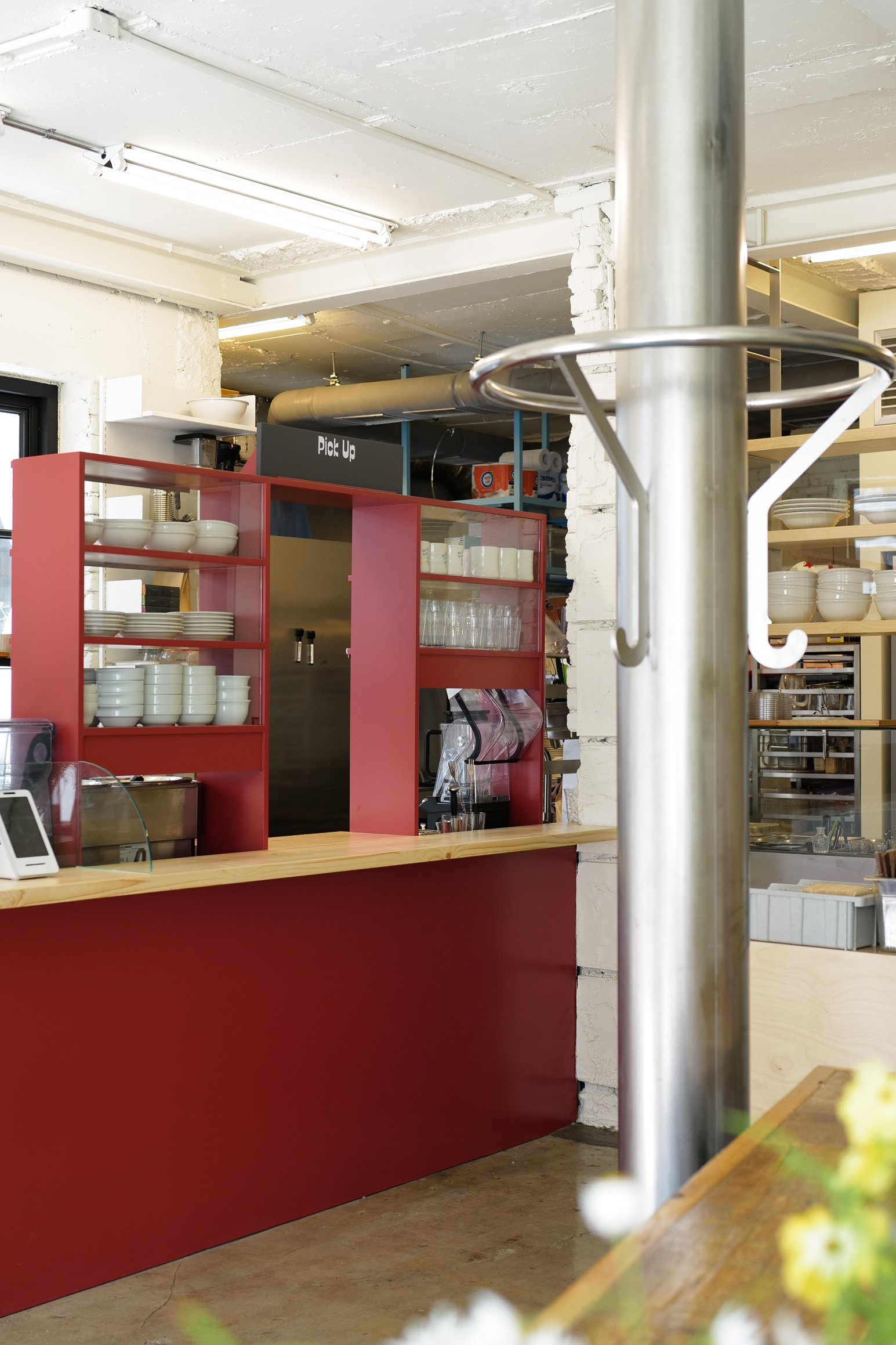 하얀색벽과 오래된 고재나무를 활용한 기존의 매장의 분위기를 사랑하는 손님들이 많았기에 1층은 첫 매장에서 직접 만든 큰 테이블을 그대로 유지하고 짙은 다홍색과 , 레몬색 밝은 색감과 자작나무 가구, 하늘색 바닥 컬러를 추가해 낯설지 않게 경쾌한 느낌을 더했다.