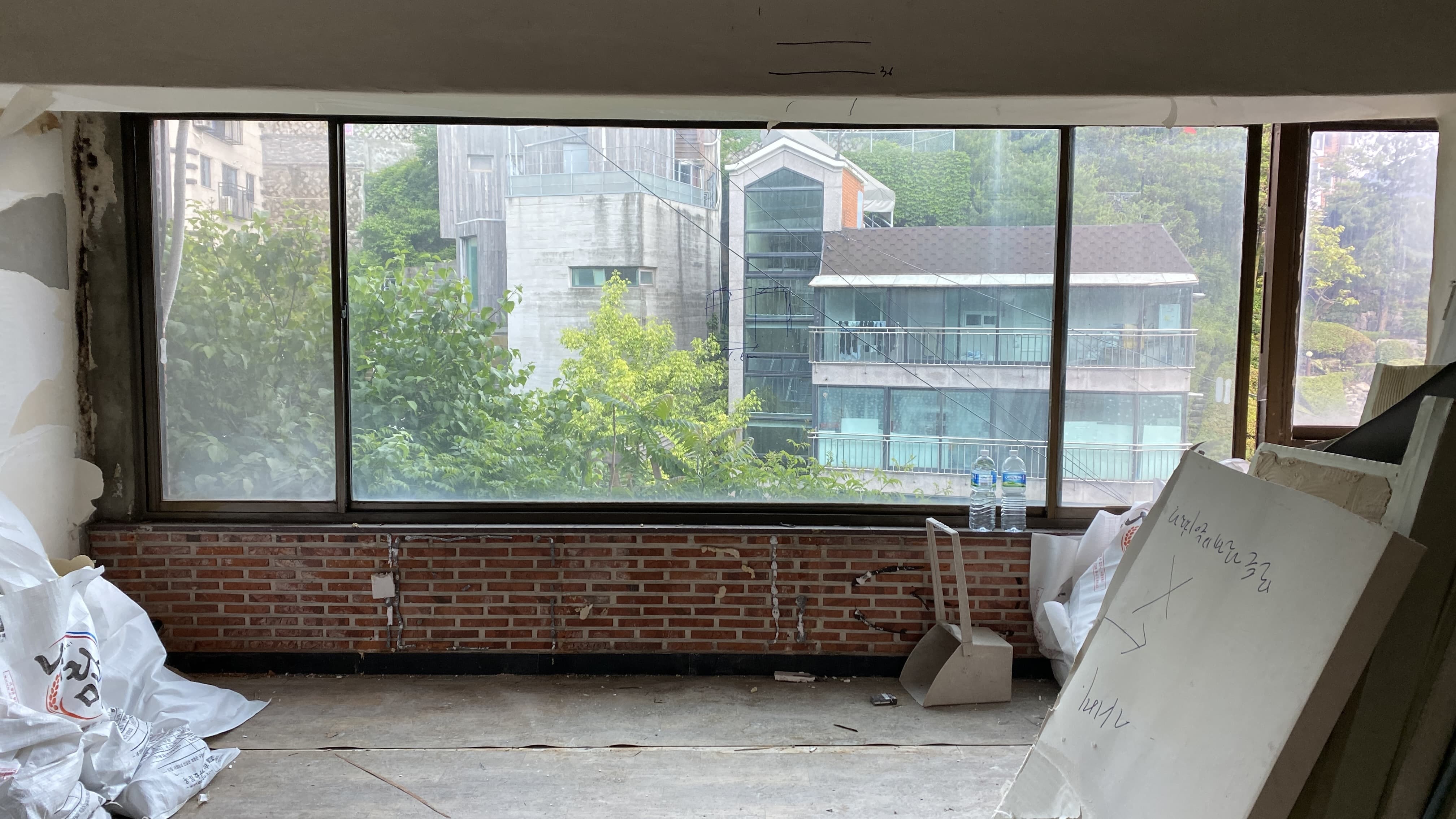 처음 집에 들어섰을때 서향으로 깊게 들어오는 빛과 단열때문에 이전에 살던사람이 인왕산 방향의 창을 합판과 단열재로 어설프게 막아 둔 상태였는데 뜯어보니 가까이 인왕산이 멋지게 보였다. 안에서만 보기에 아까운 풍경이라 그방의 창을 조금 들여서 설치하고 외부 테라스를 만들었다.