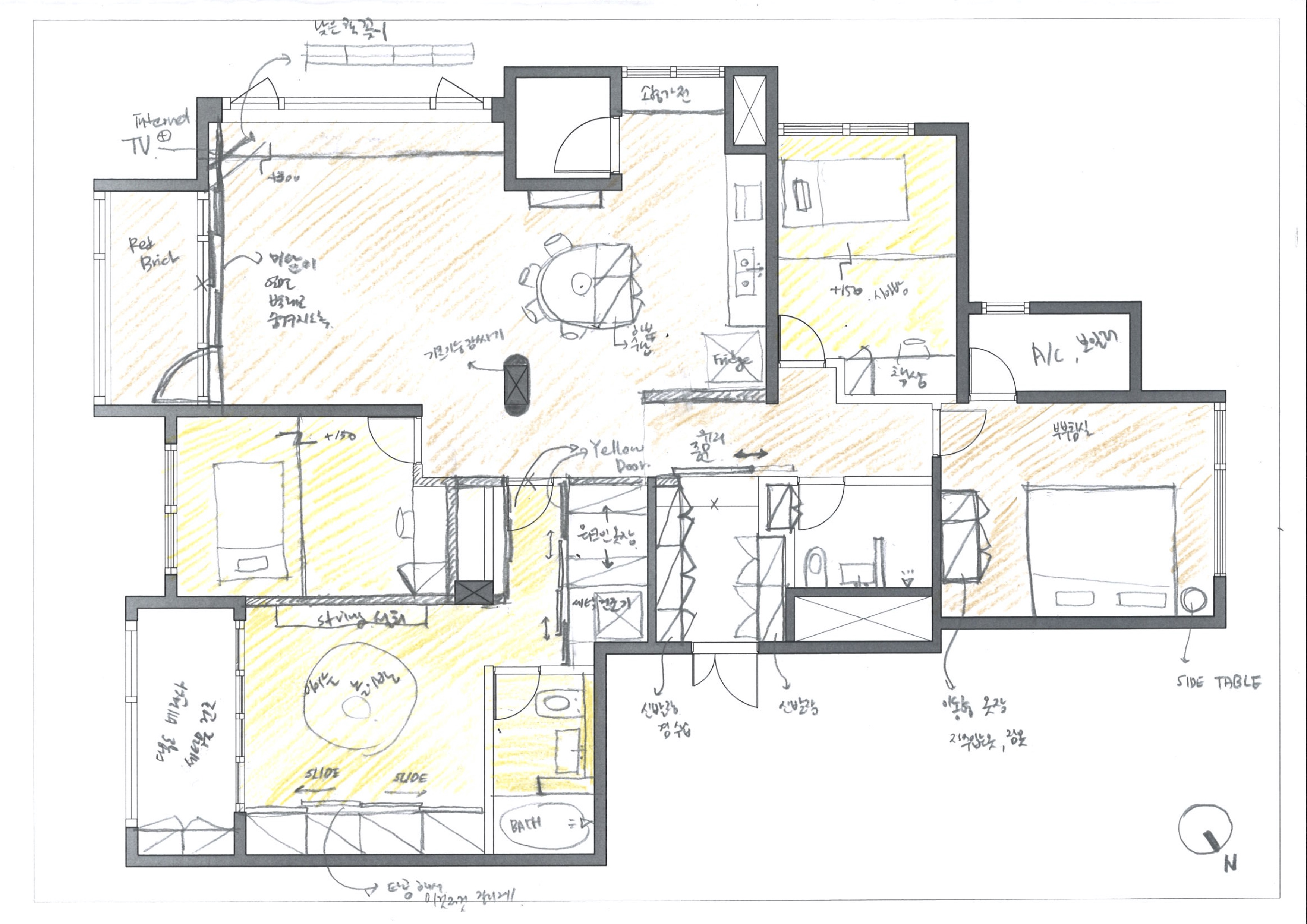두가지의 대비되는 톤의 공간으로 집 전체적으로 티크원목마루, 붉은빛 라왕 합판 가구와 검은 기둥이 묵직하게 공간을 잡아주고 아이들 공간은 메이플 수종의 마루와 자작나무를 사용한 가구, 기분좋은 노란색을 활용해 밝고 발랄한 색감으로 채웠다.