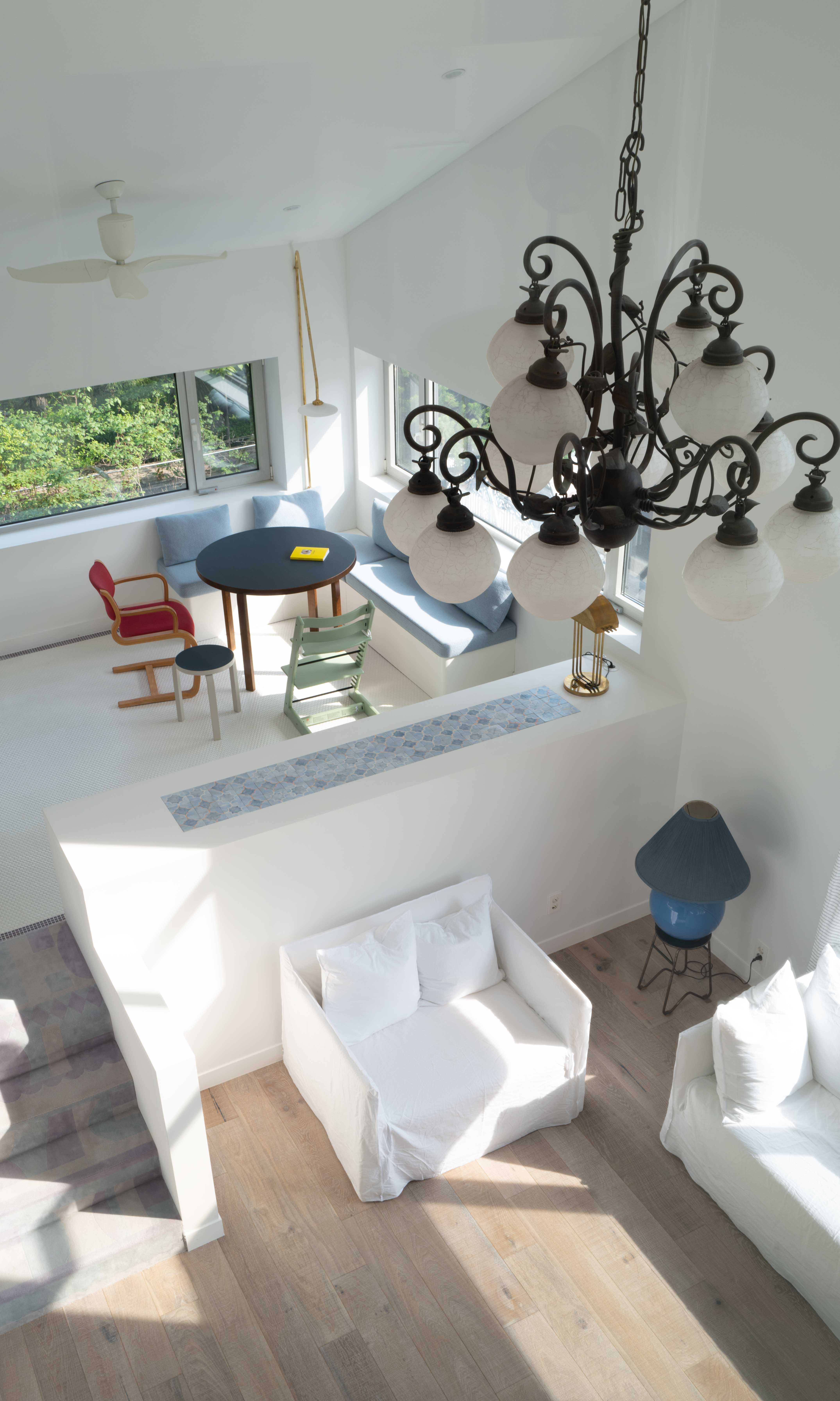 3개층으로 이루어진 주택은 마당과 이어진 1층 작업실과 서재 , 2층의 거실과 다이닝, 3층의 부부 침실과 어린 딸의 방으로 구성된다.
