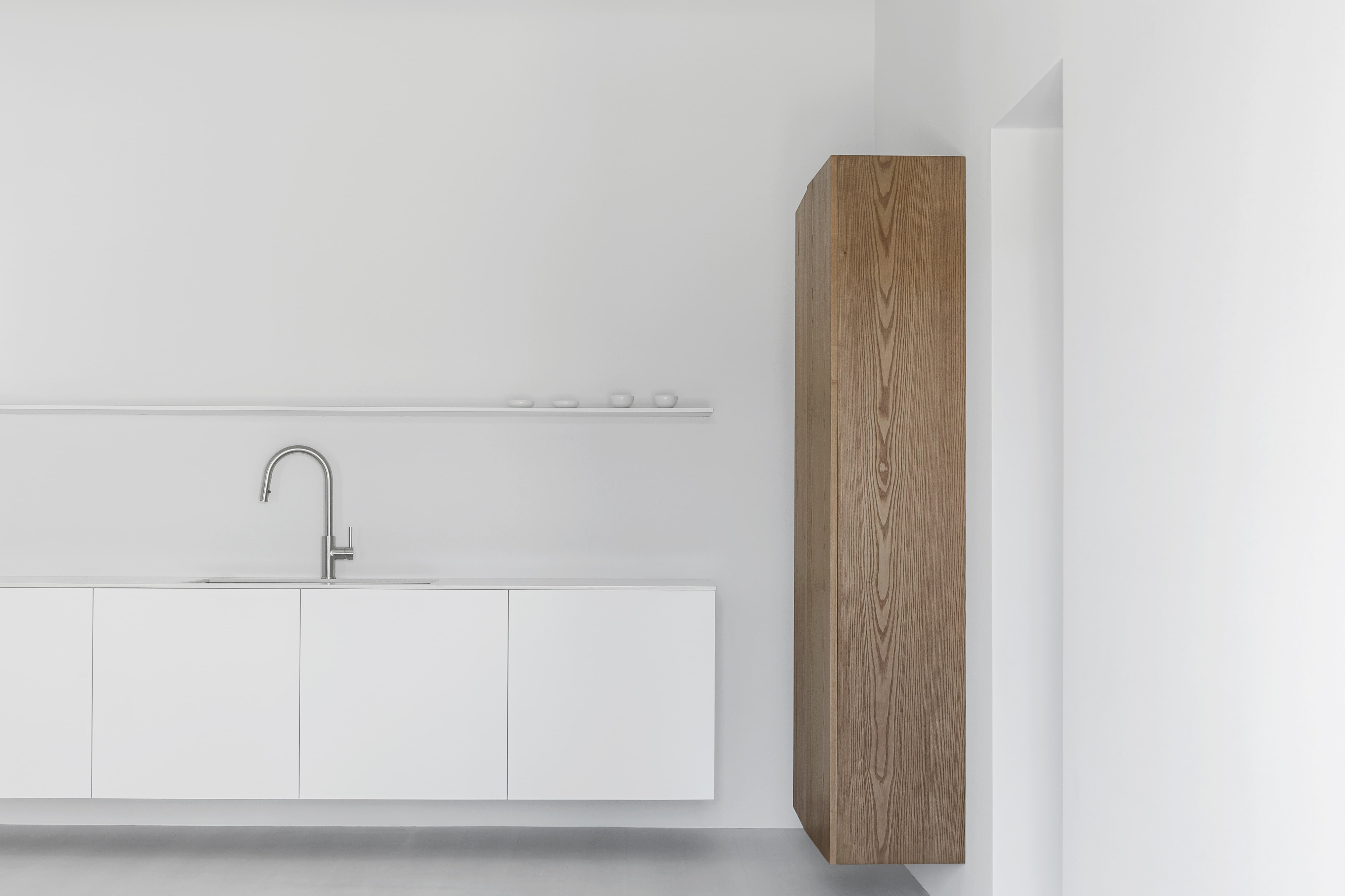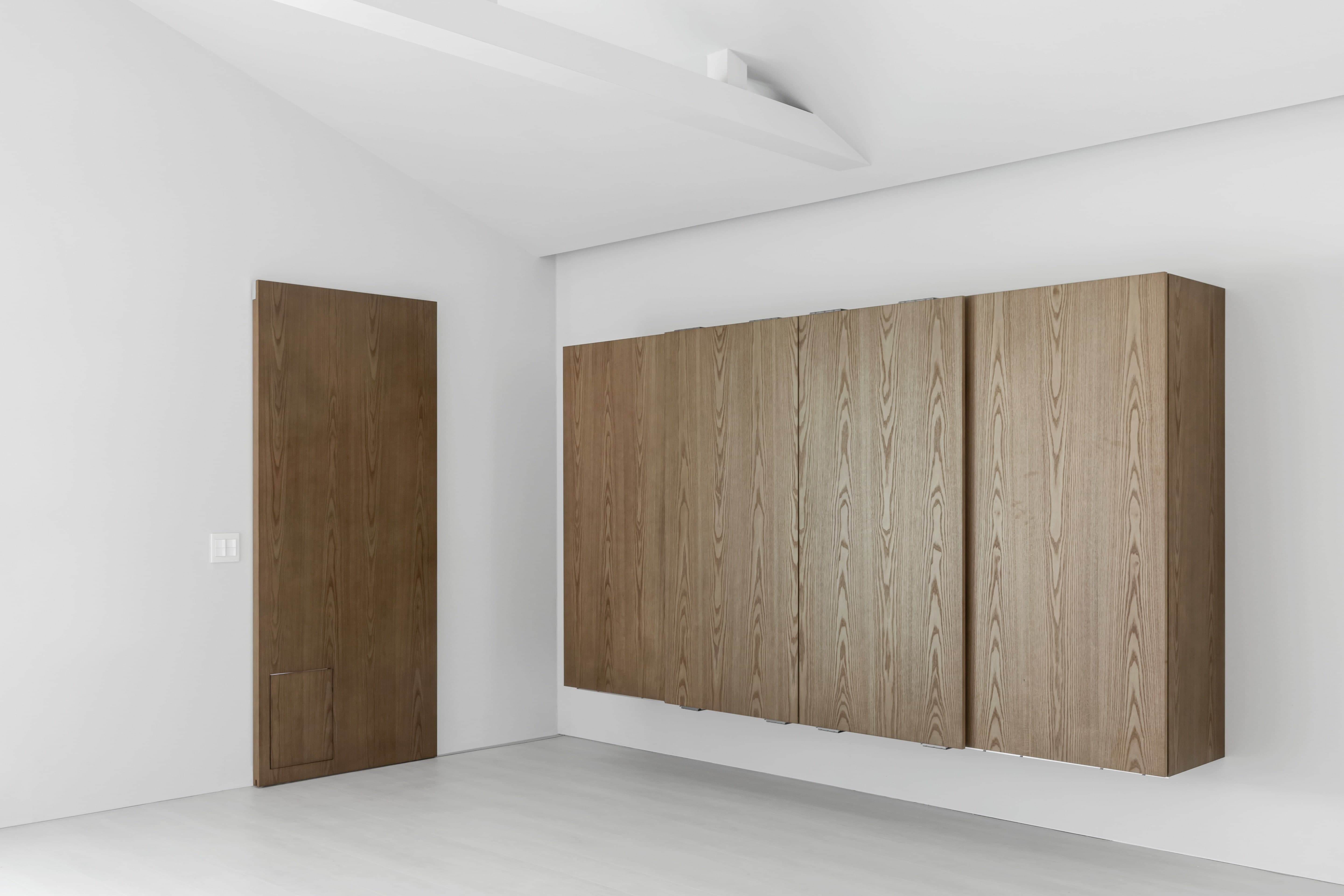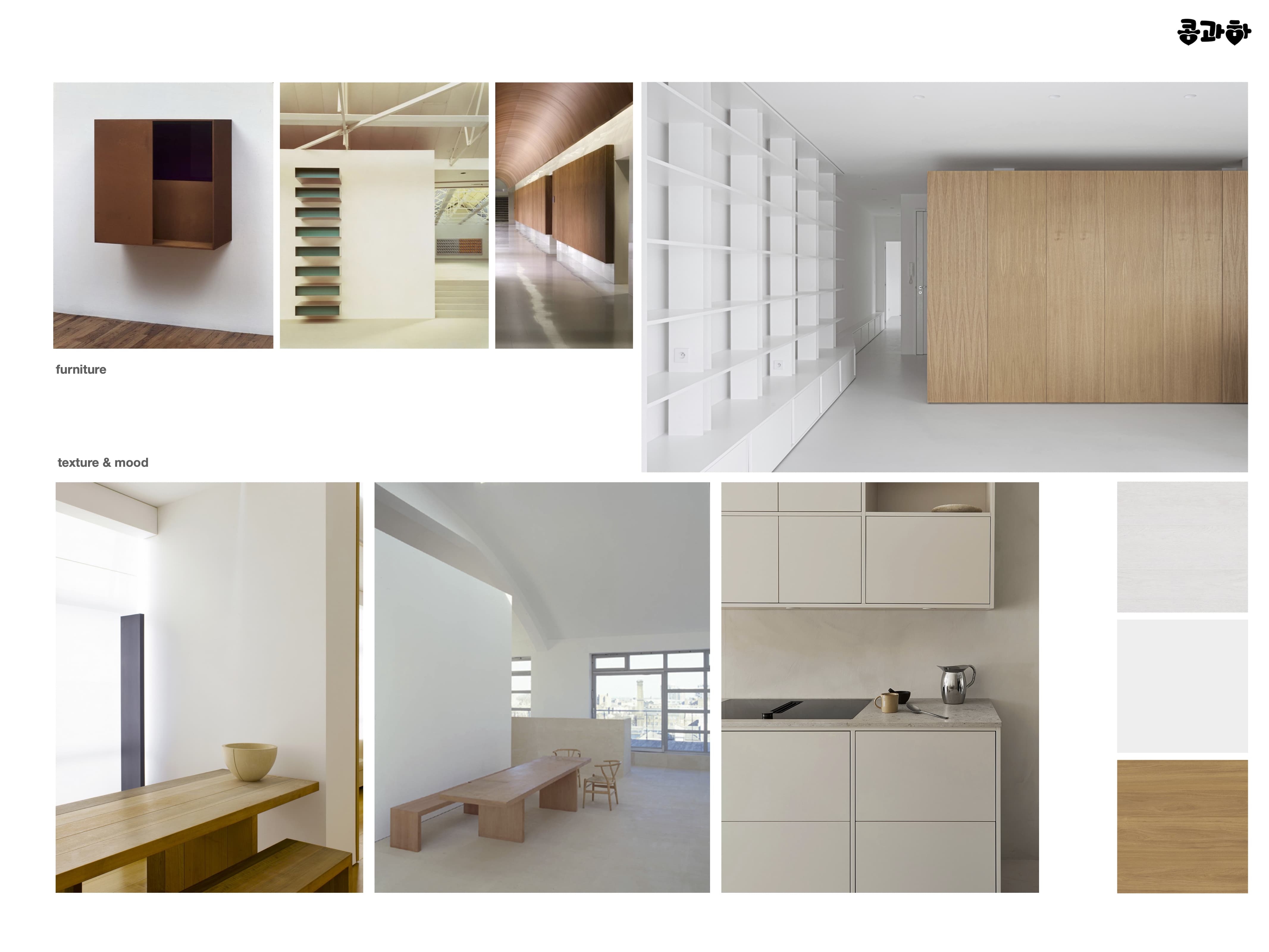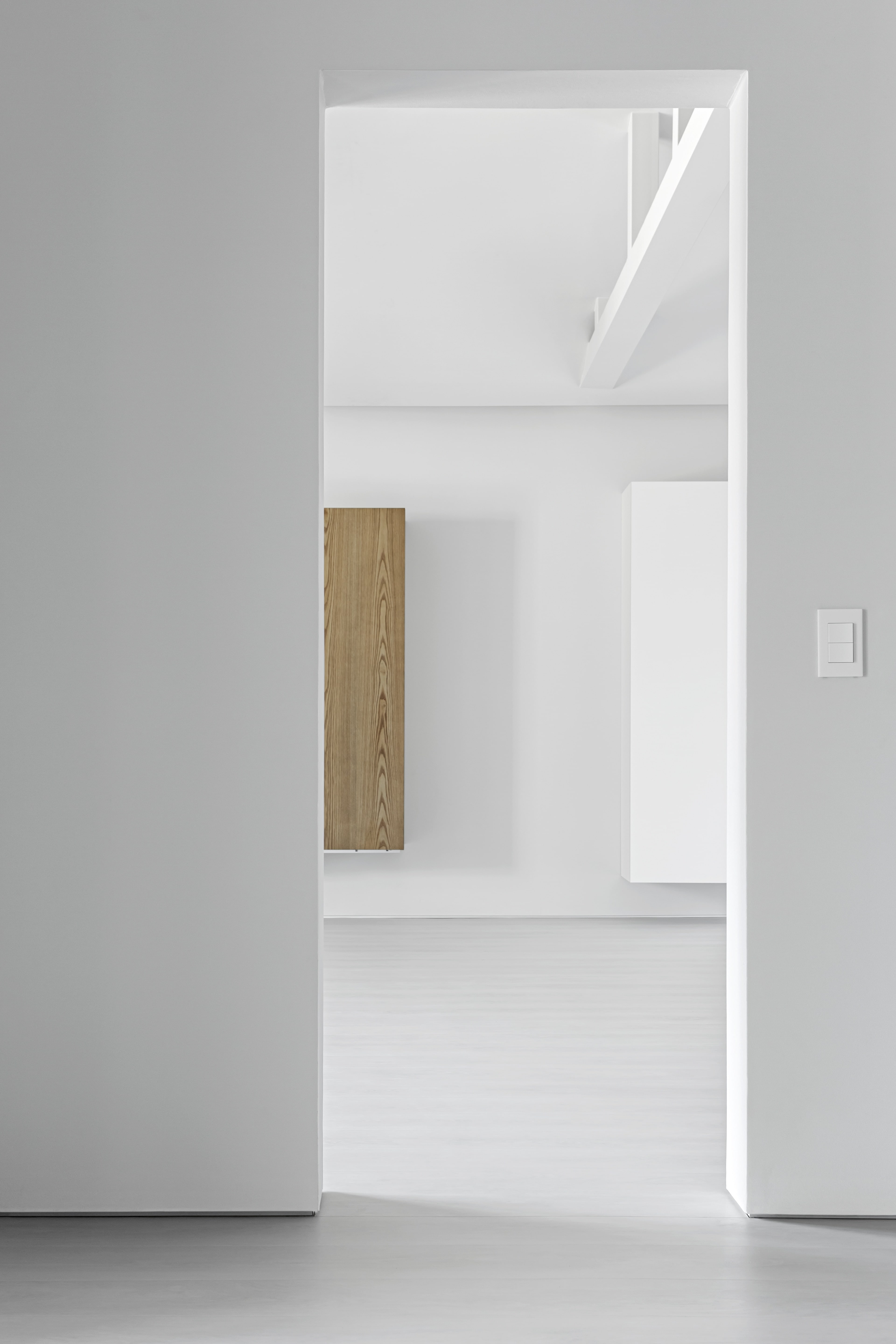 백색과 나무, 두가지 소재가 교차하며 단순한 비례의 가구들로 공간을 채우고 공중에 떠오르도록 설치해 형태가 주는 무게감을 덜어냈다.