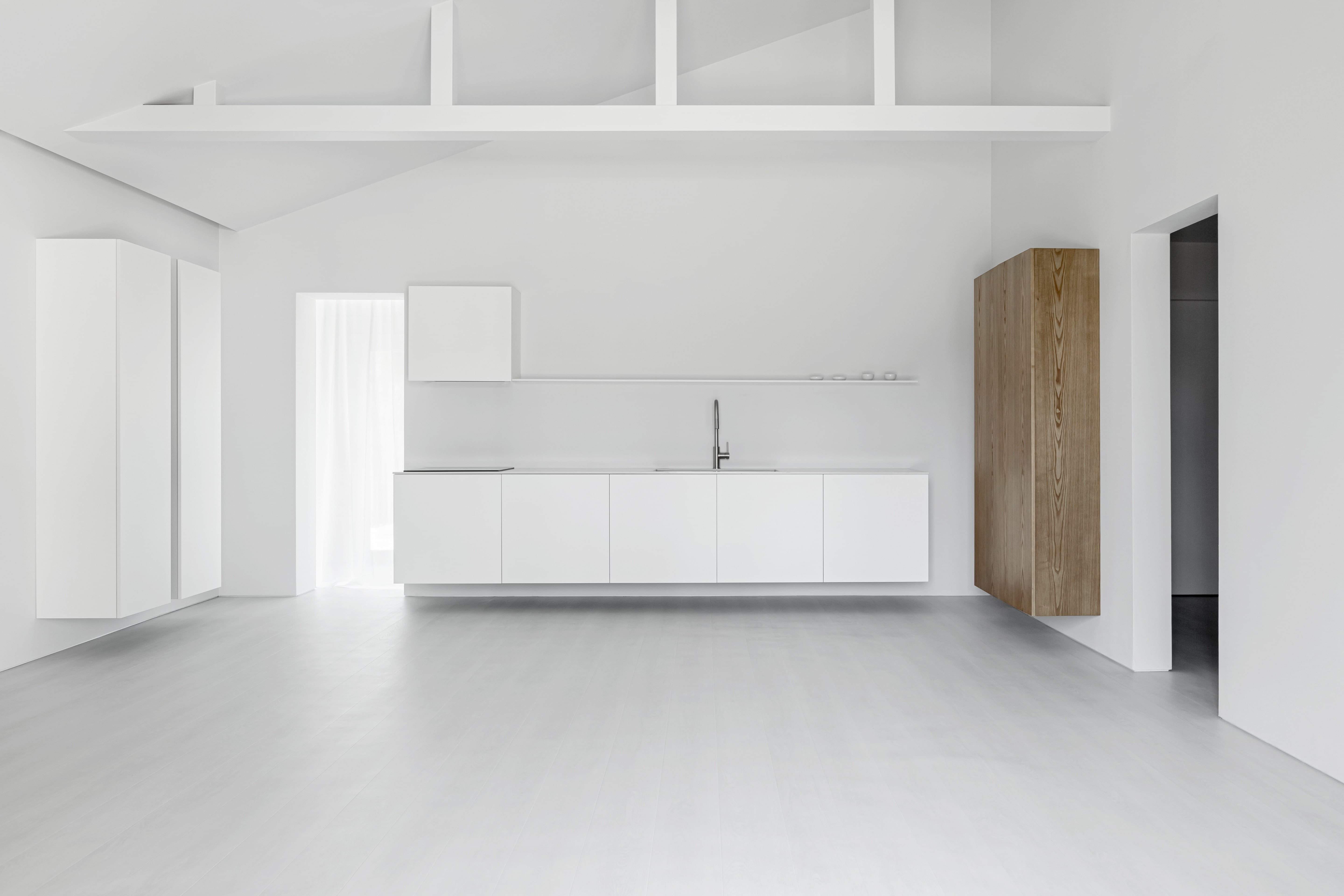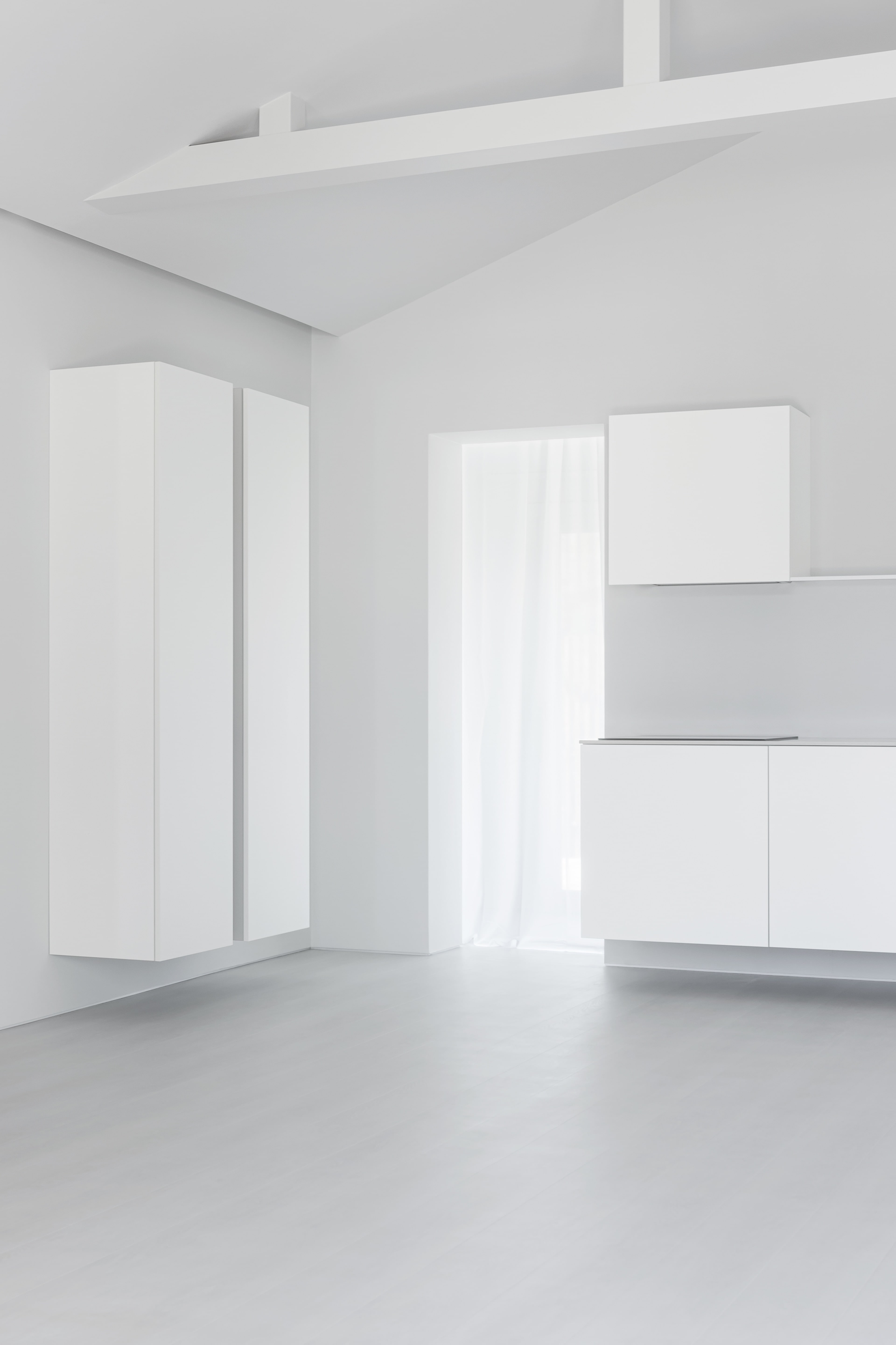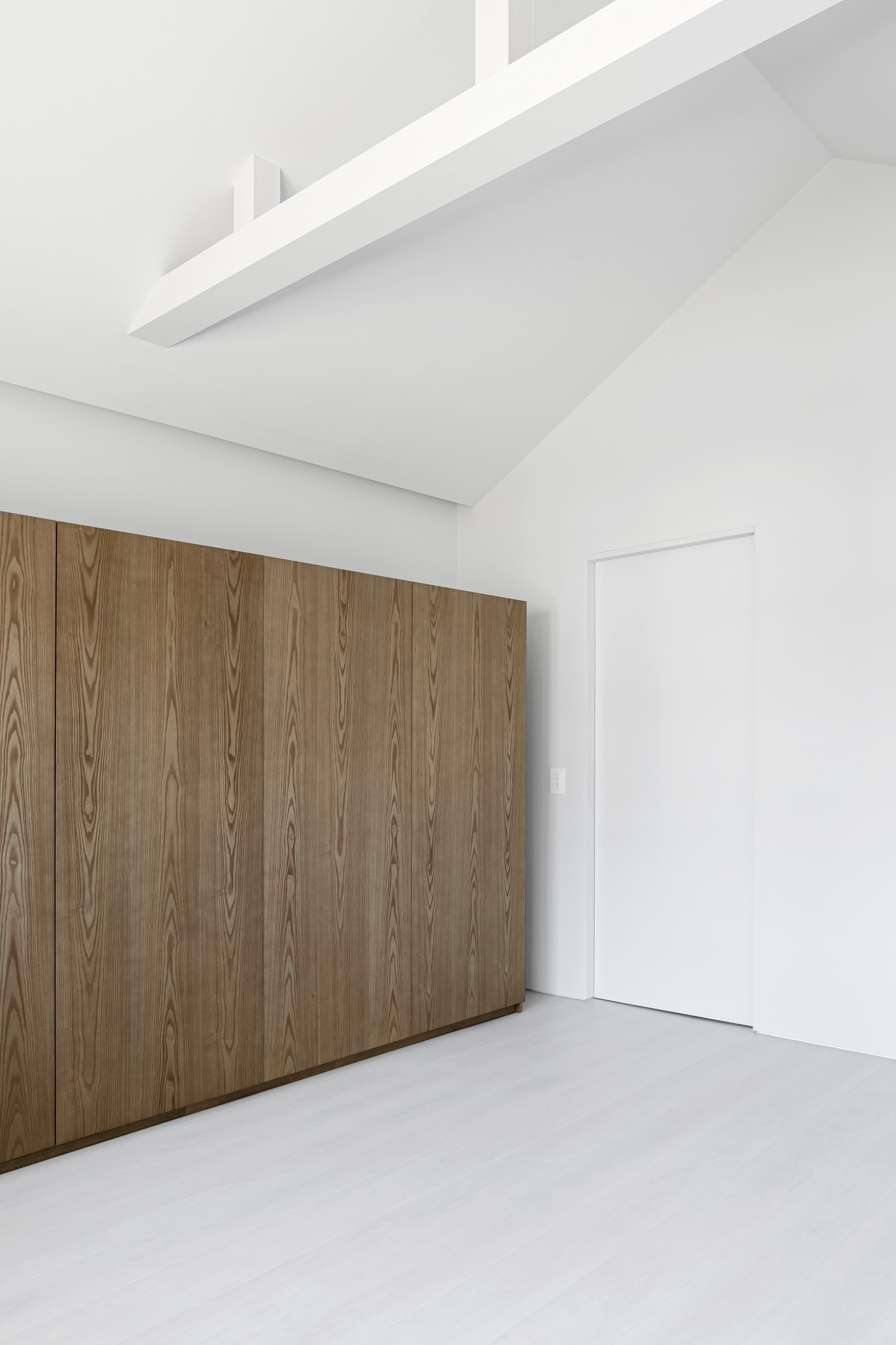 백색과 나무, 두가지 소재가 교차하며 단순한 비례의 가구들로 공간을 채우고 공중에 떠오르도록 설치해 형태가 주는 무게감을 덜어냈다.