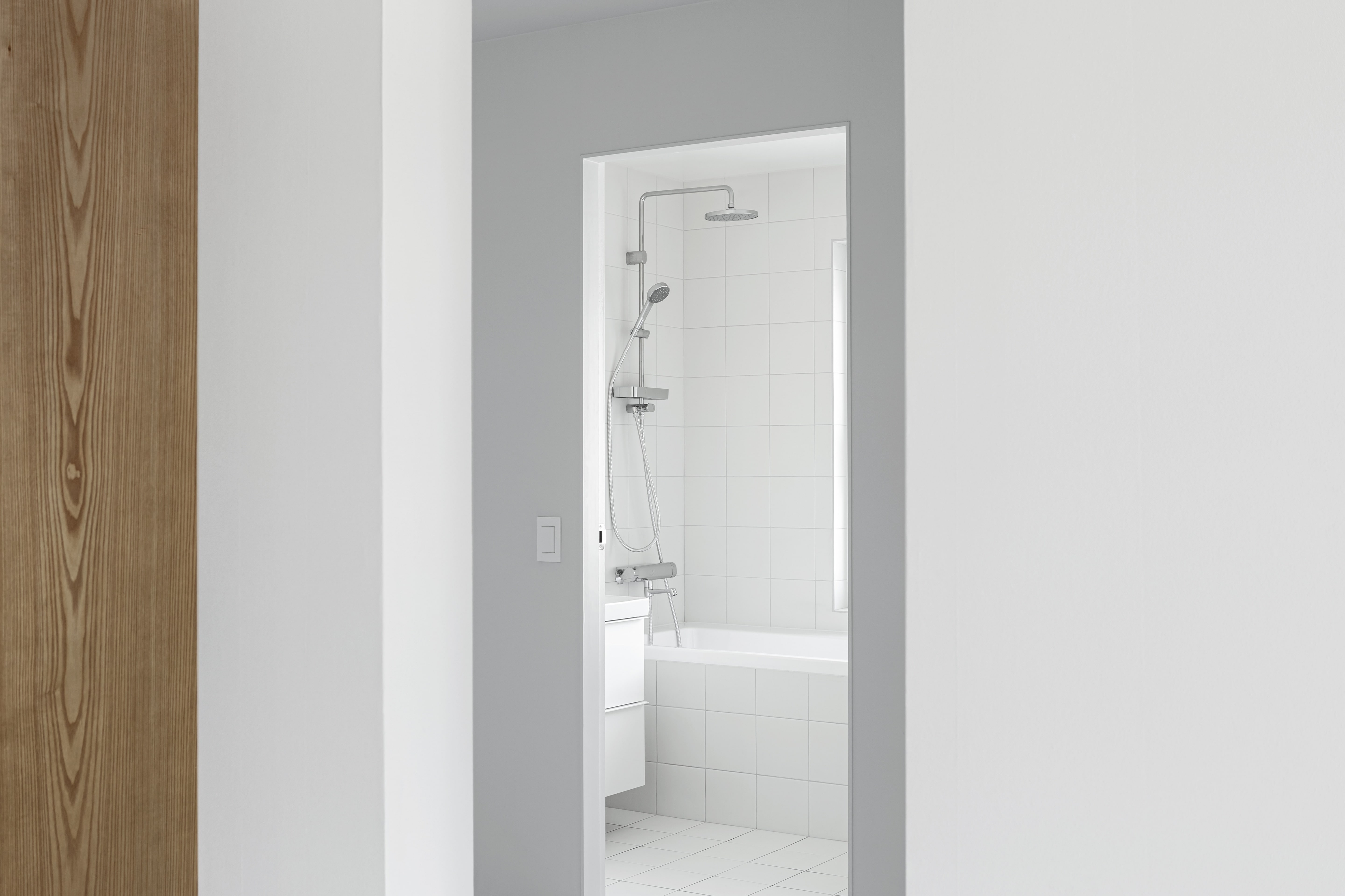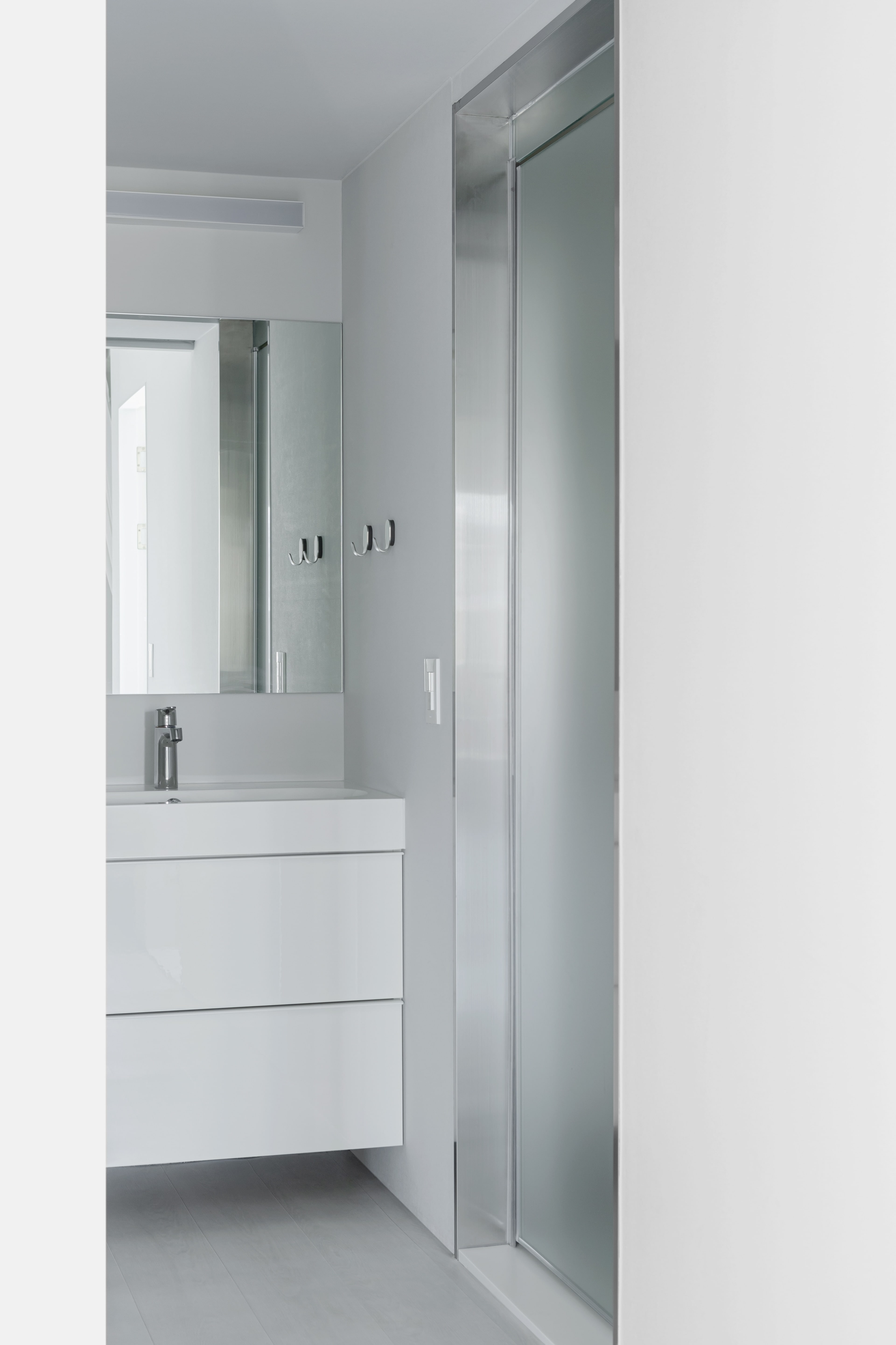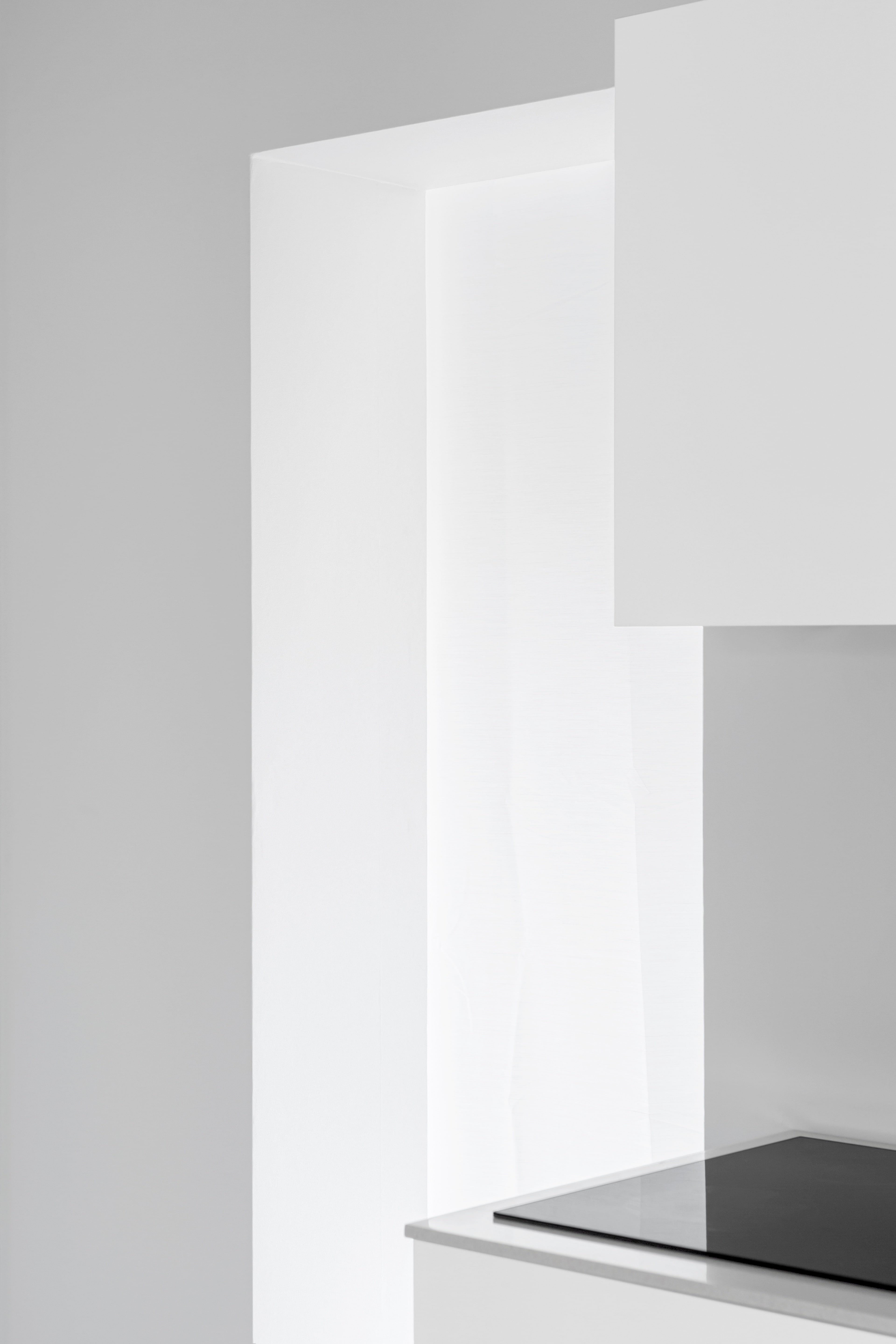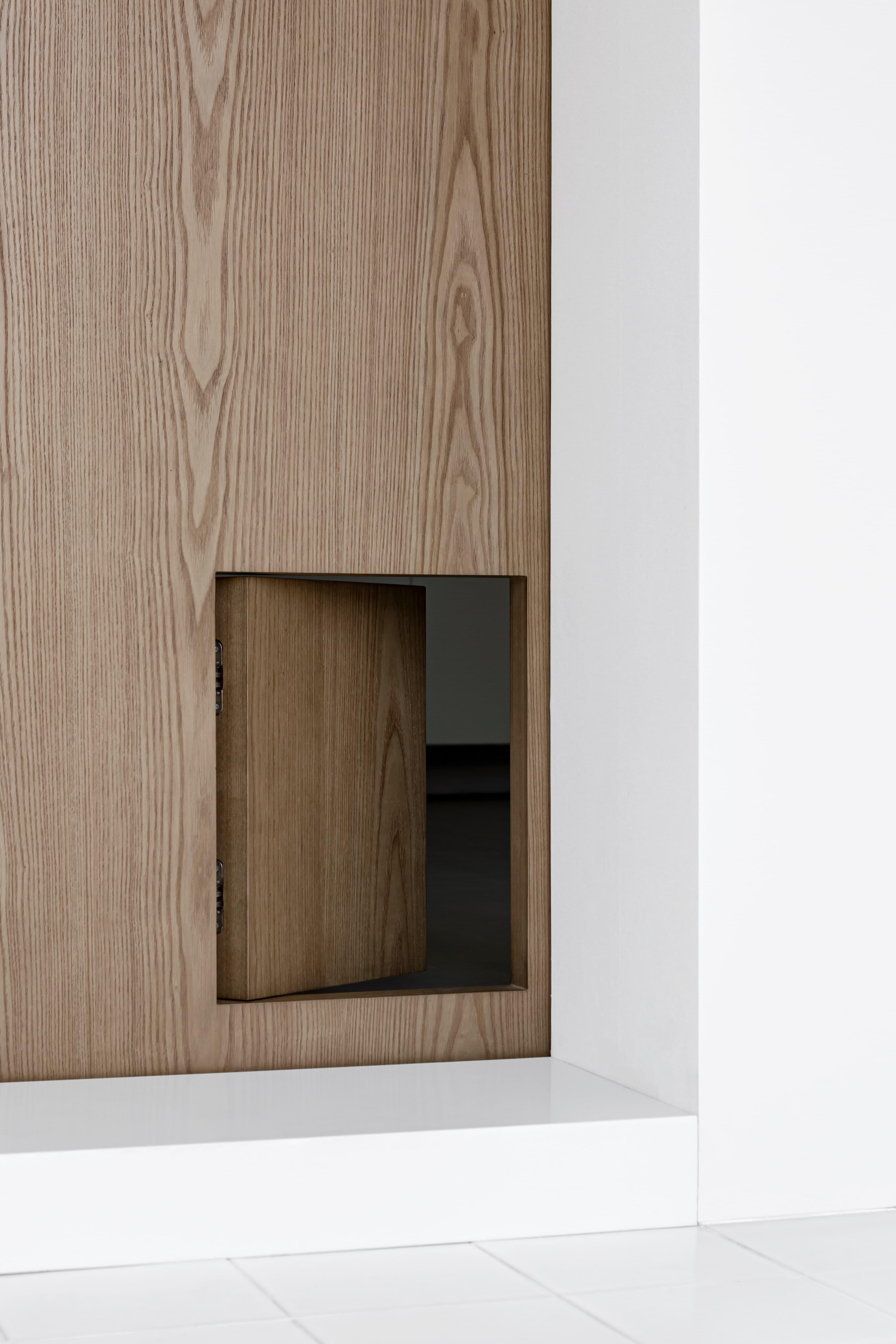 백색과 나무, 두가지 소재가 교차하며 단순한 비례의 가구들로 공간을 채우고 공중에 떠오르도록 설치해 형태가 주는 무게감을 덜어냈다.