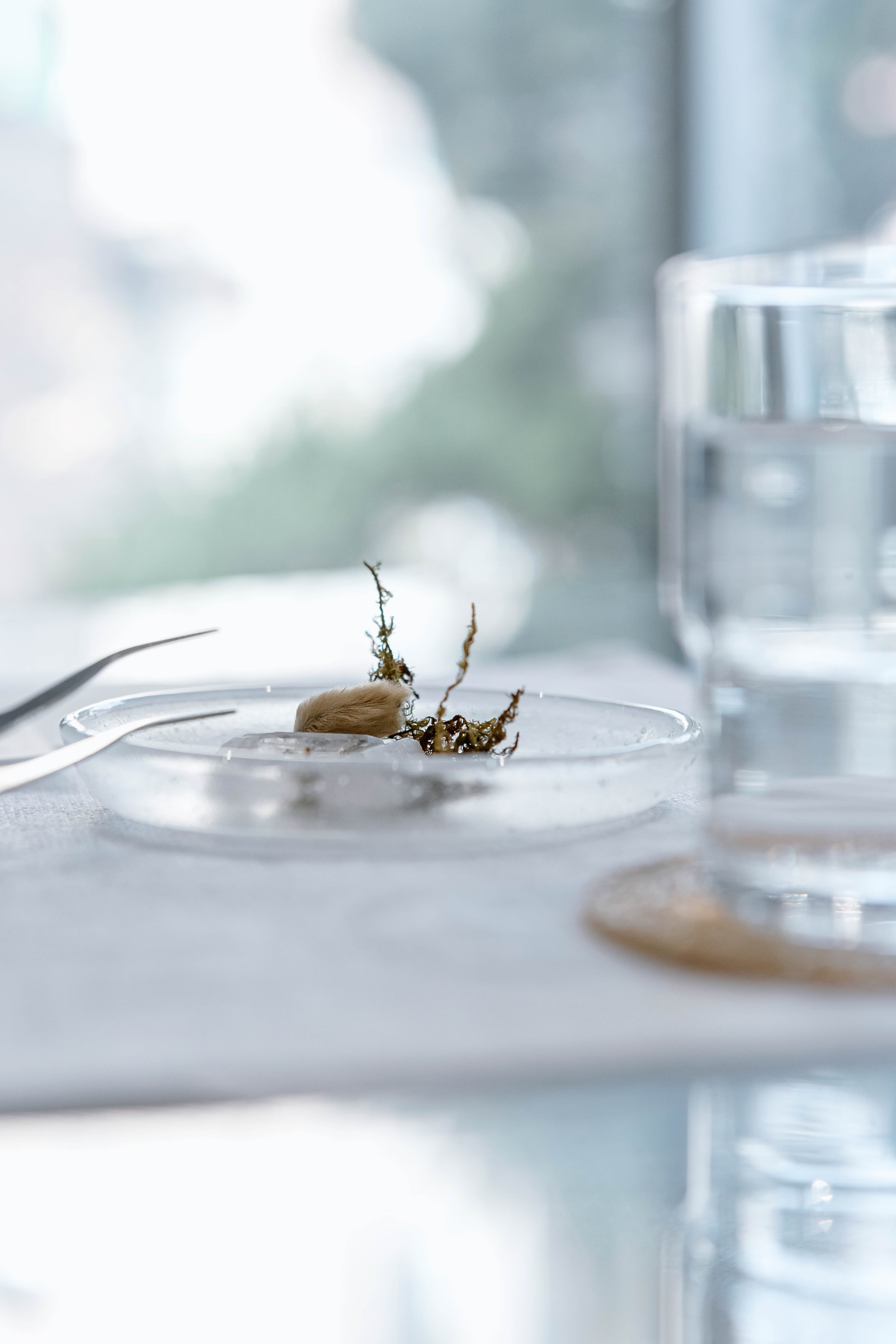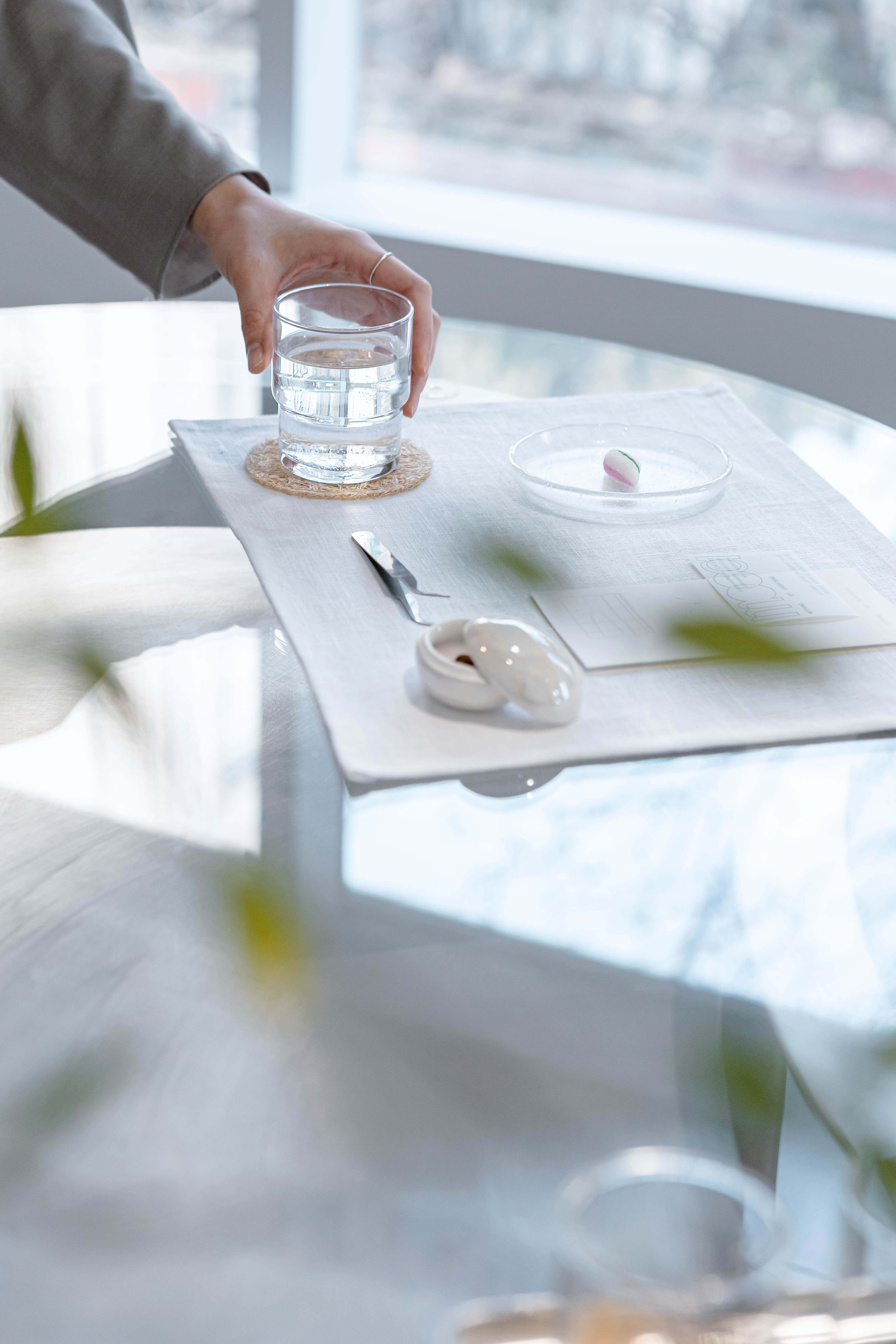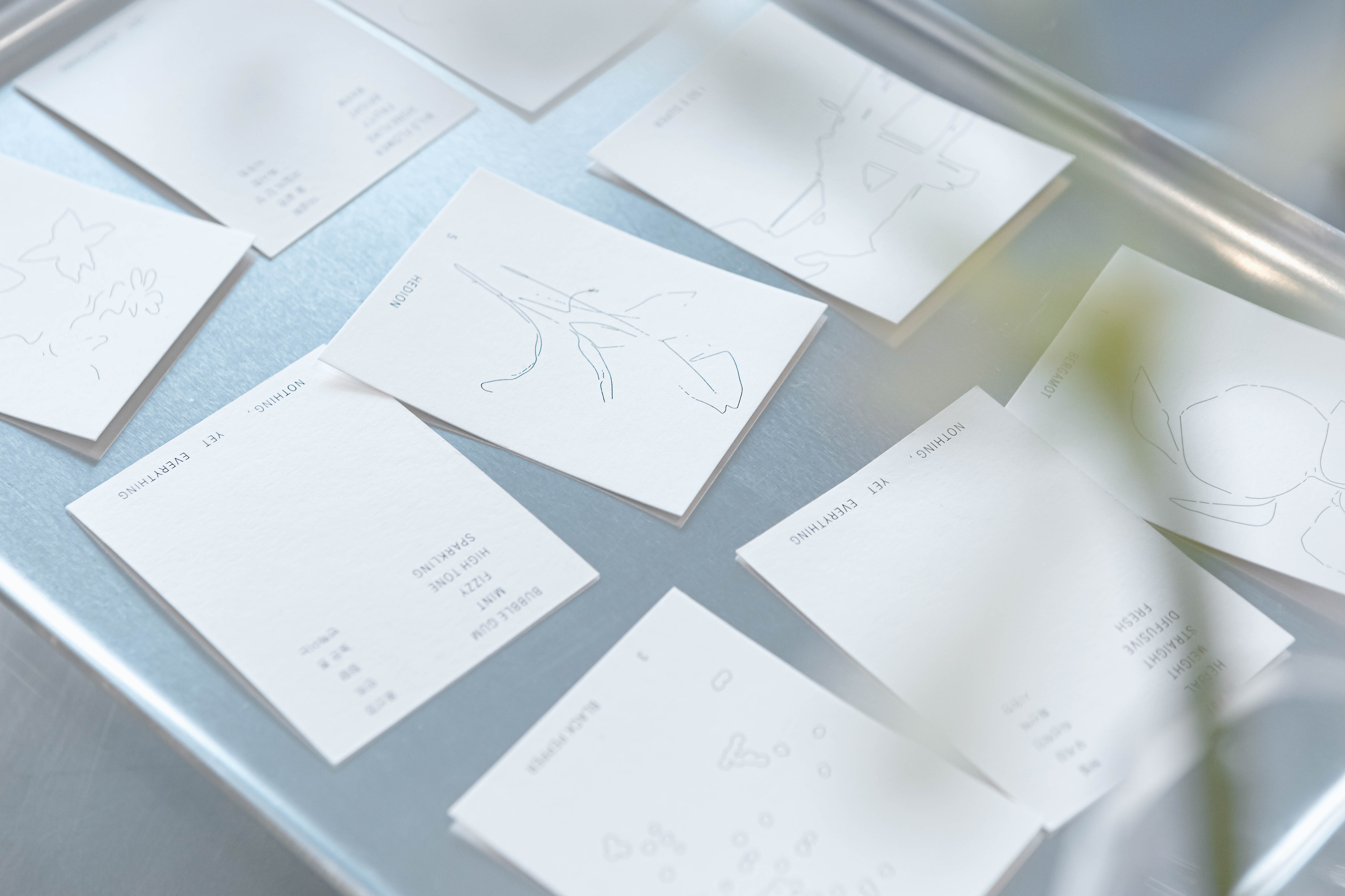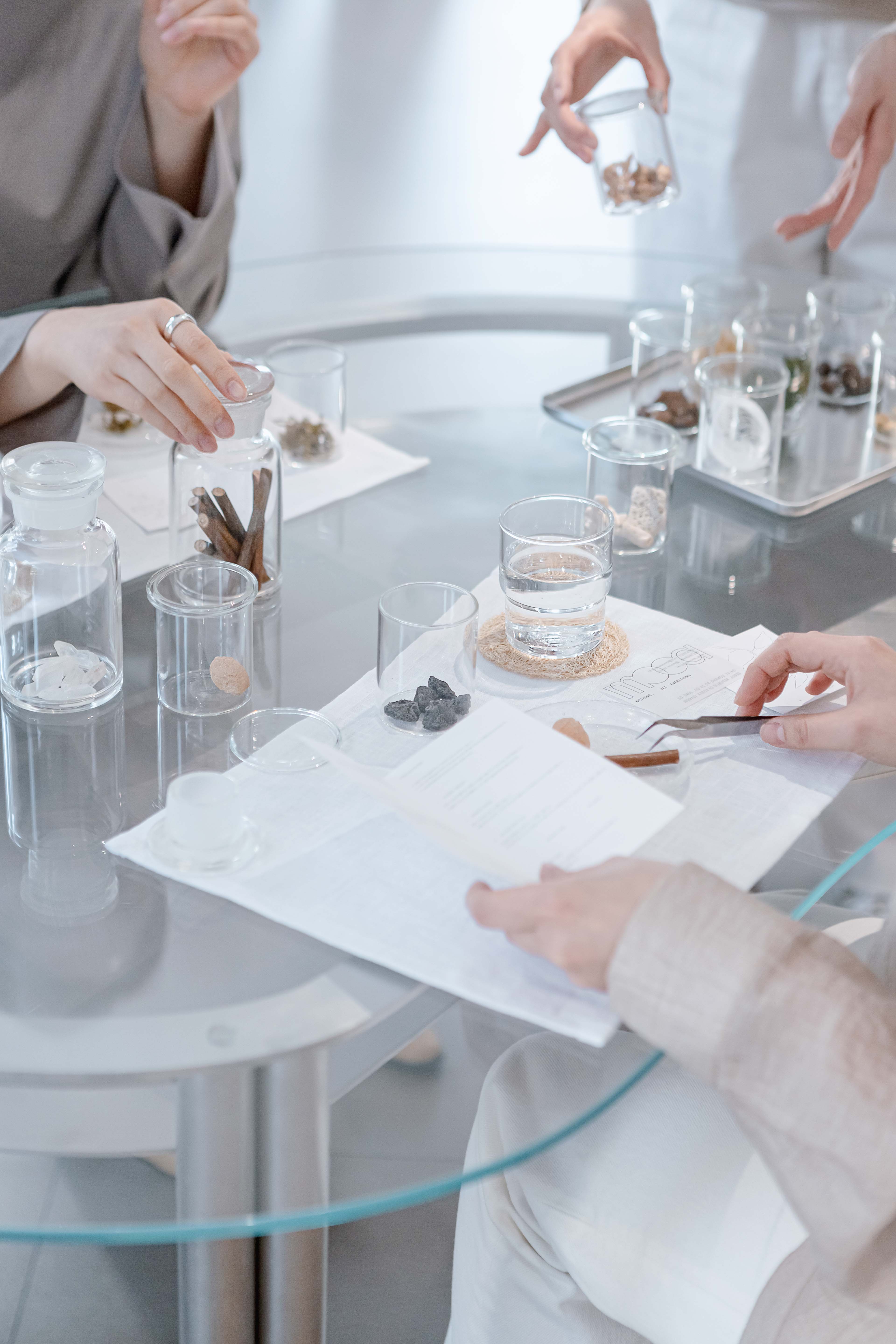 똑 똑 떨어지는 물방울을 닮은 투명한 테이블에서 조향 워크샵이 이뤄진다. 다양한 오브제를 활용해 보이지 않는 향의 형태를 상상해보고 시각, 청각을 모두 사용해 향에 집중하는 시간을 가져본다.