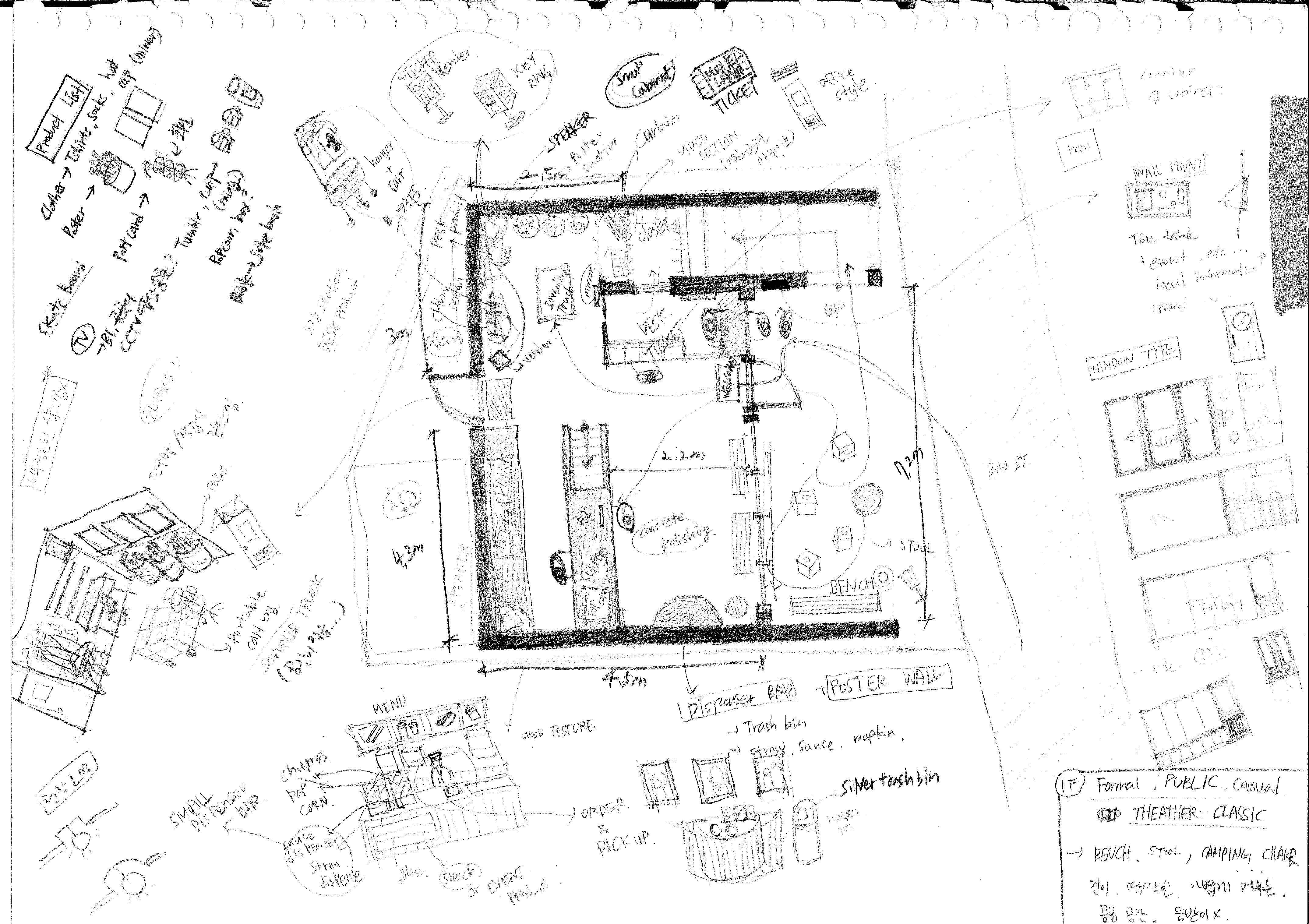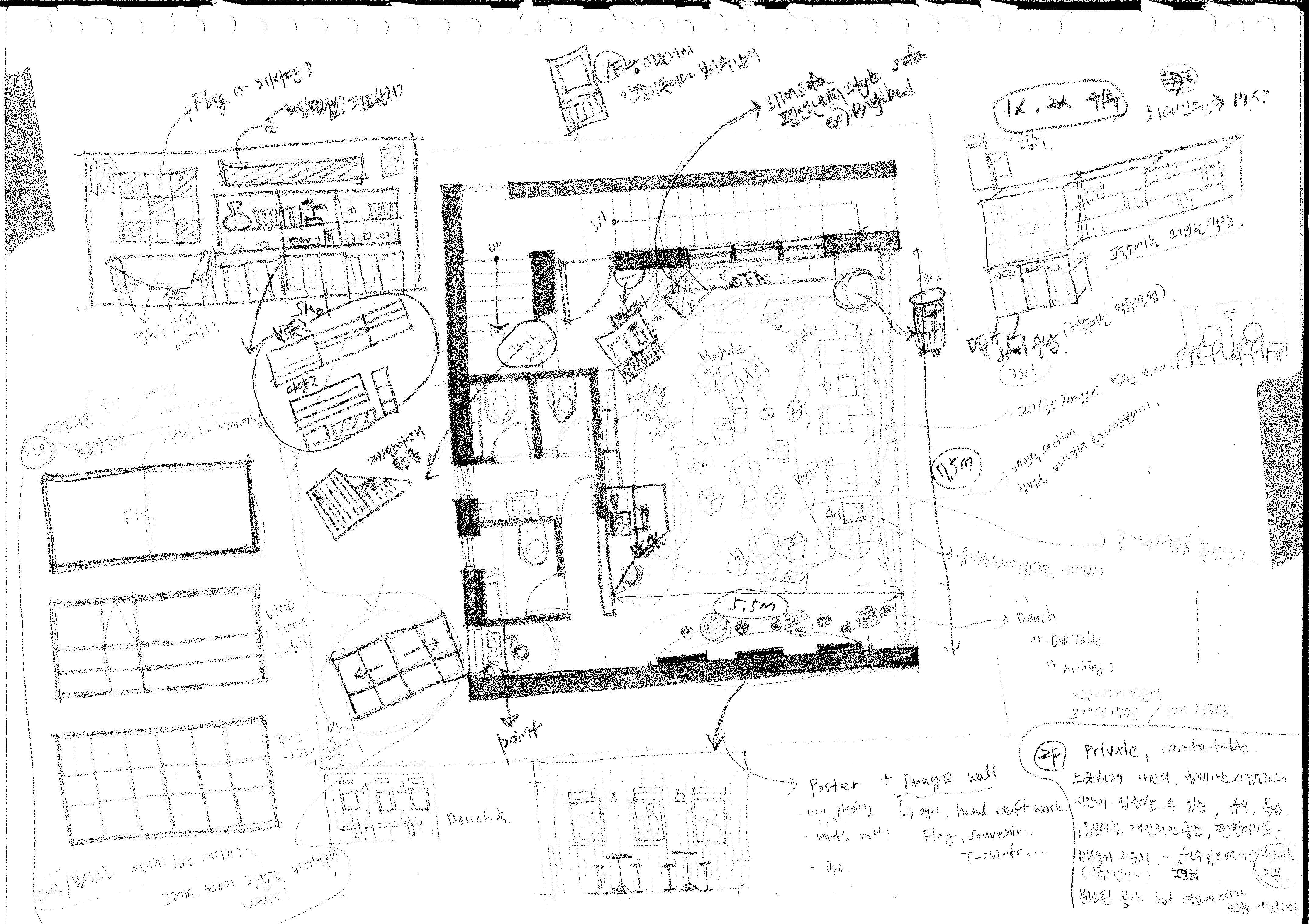 전체 레이아웃 및 가구, 전면 파사드에 대한 고민이 담겨있다.