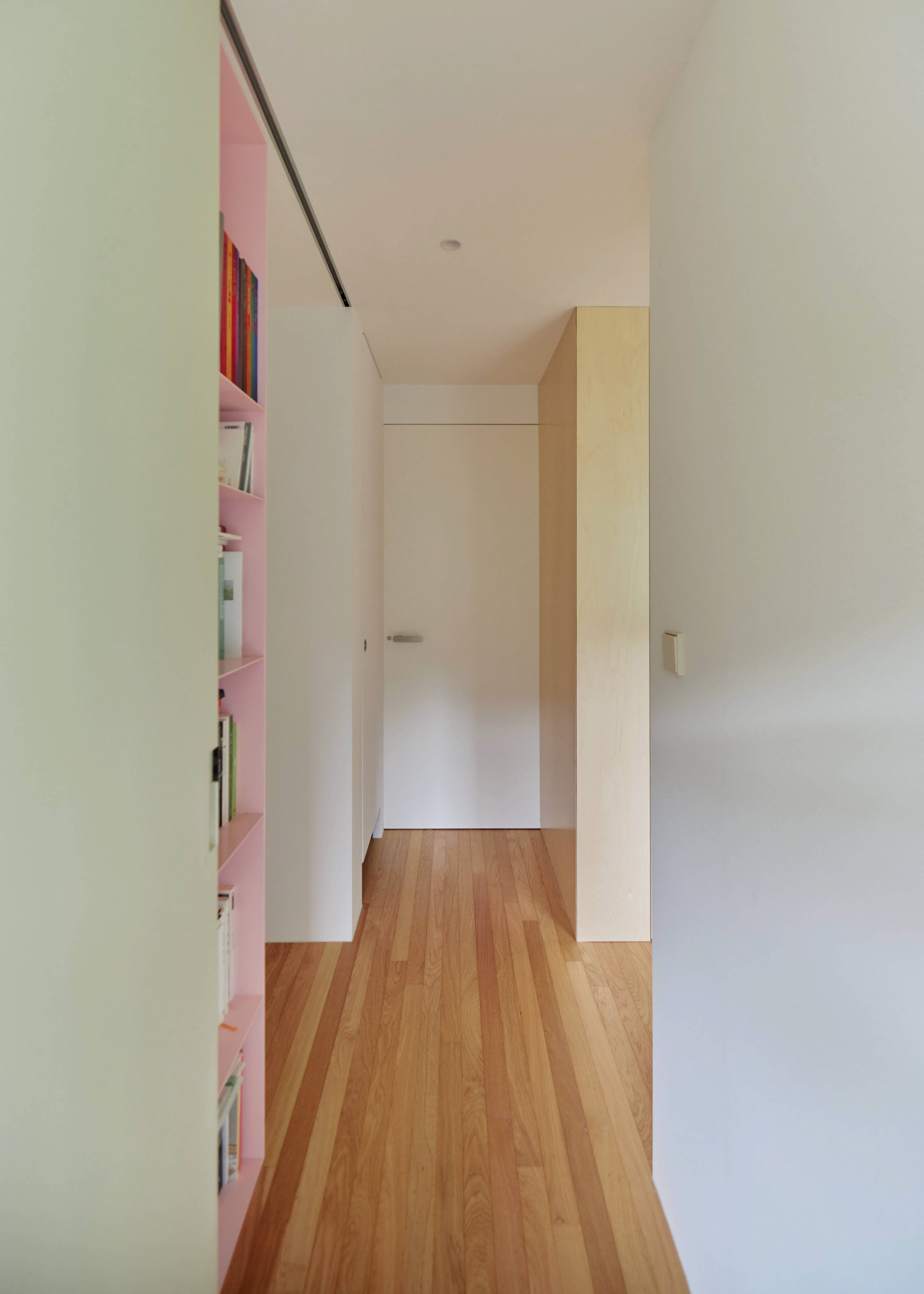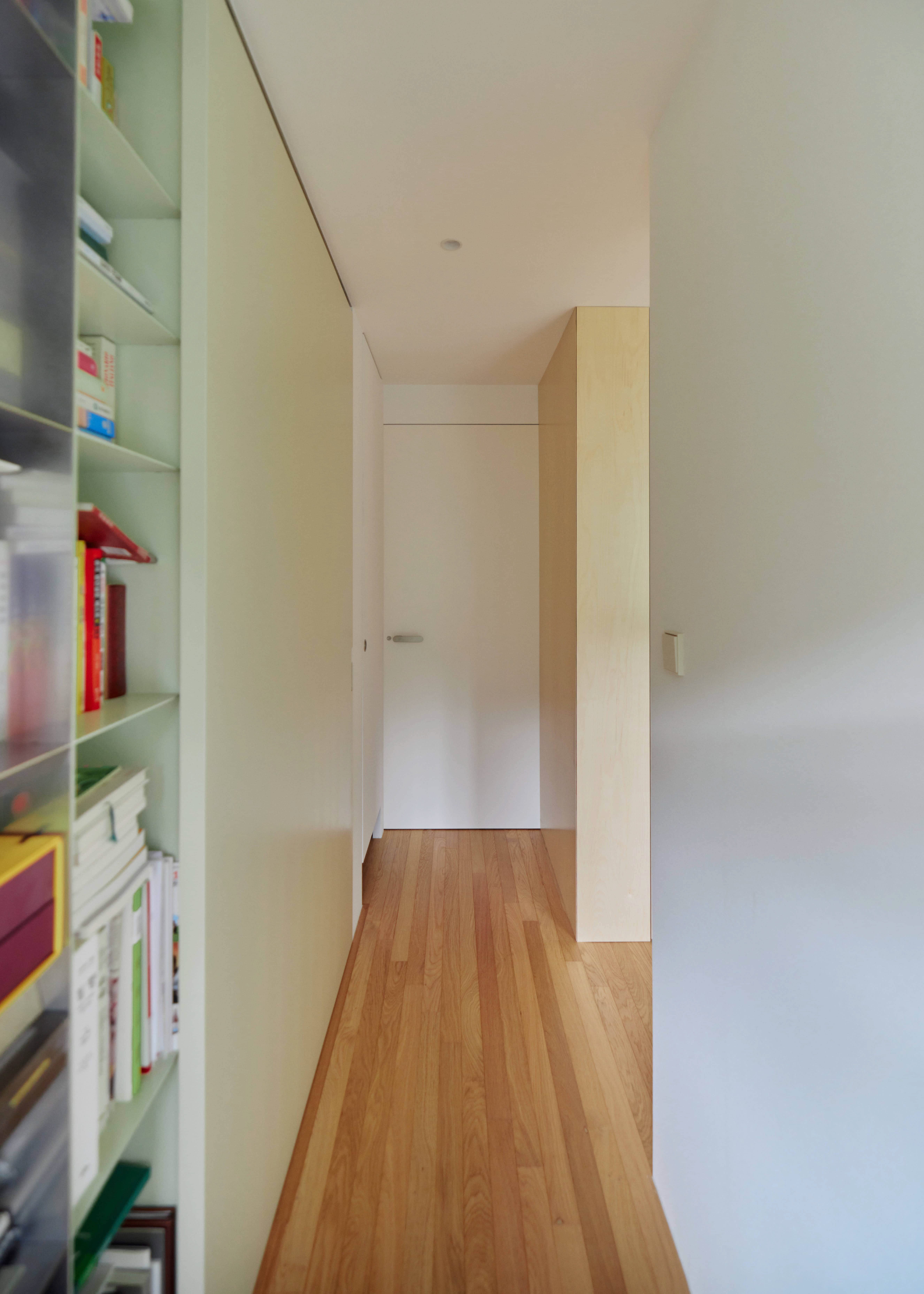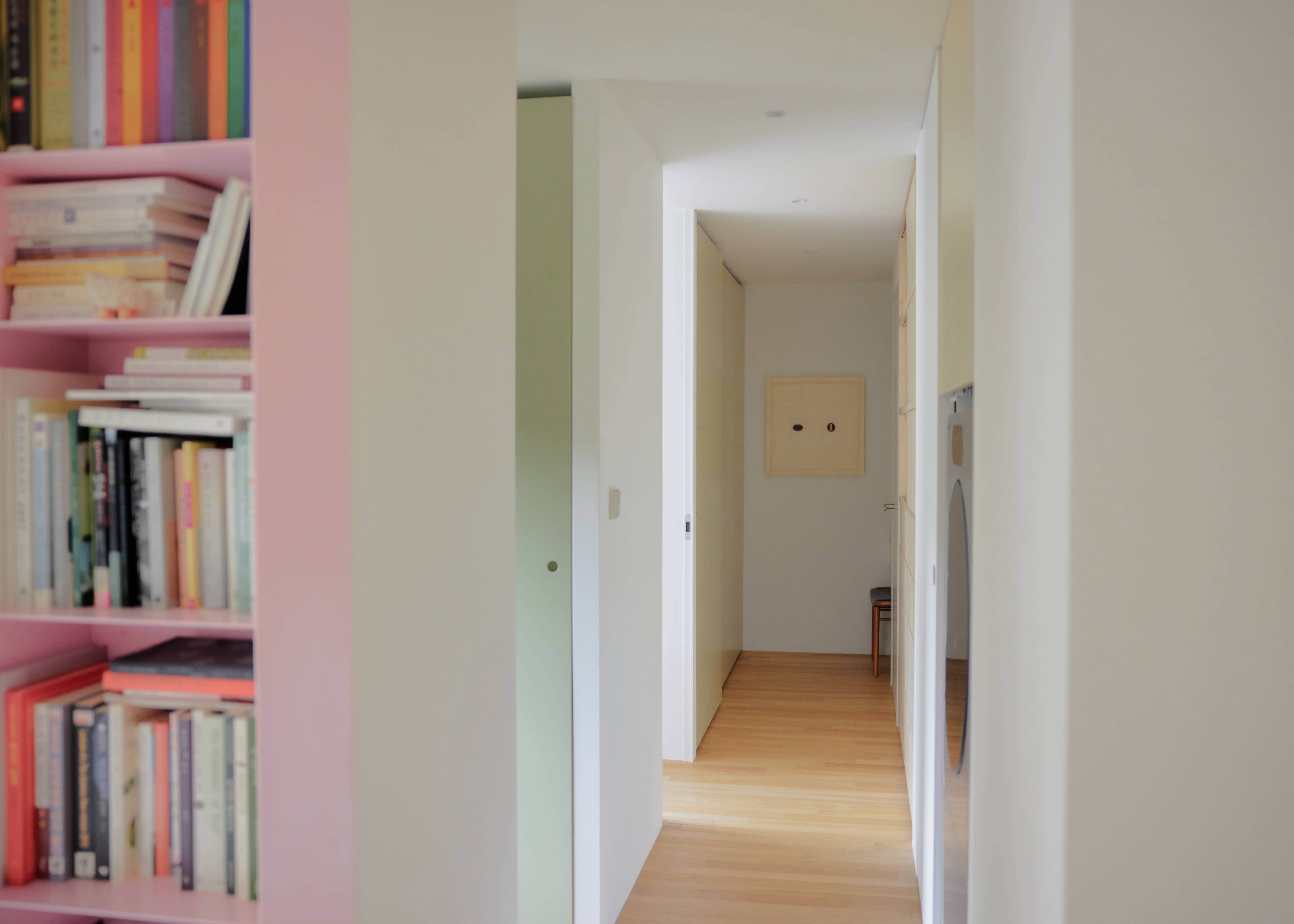 복도는 통로인 동시에 벽을 이용해 다양하게 활용할 수 있도록 구성했다. 벽이 얕은 부분에는 책꽂이를, 깊은 부분에는 옷장을 매입했다. 통로였던 공간의 문을 닫으면 드레스룸이나 서재로 변모한다.
