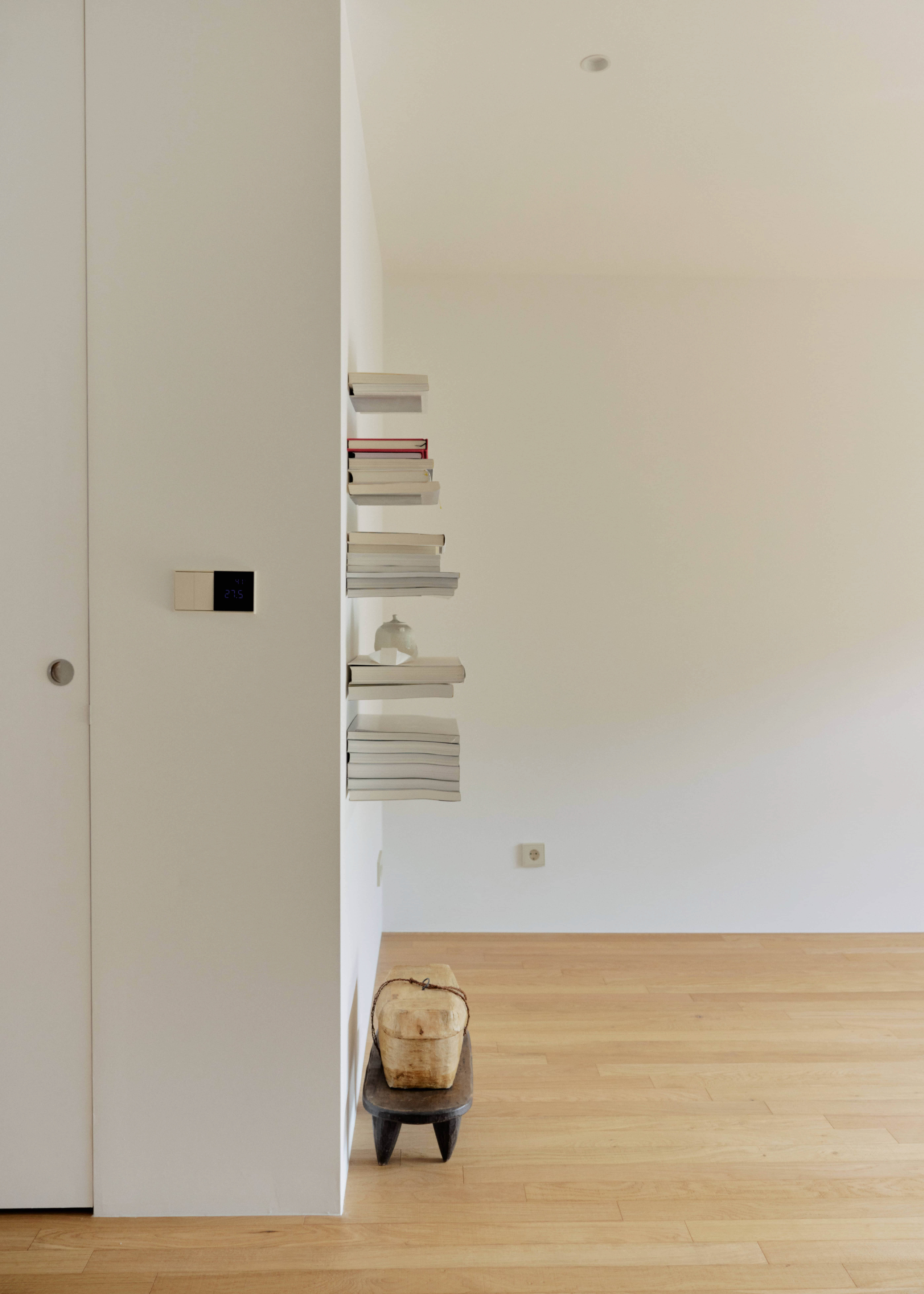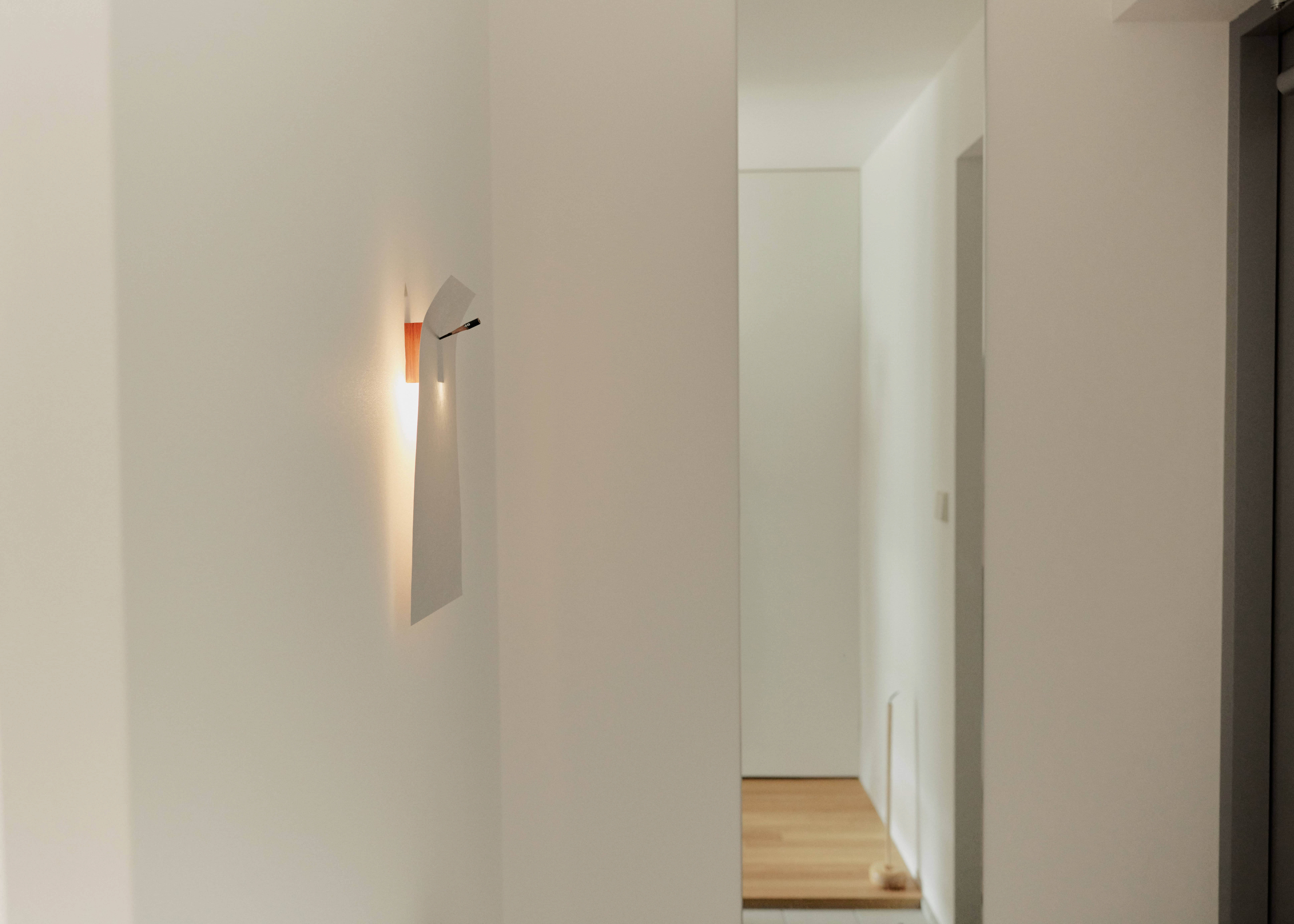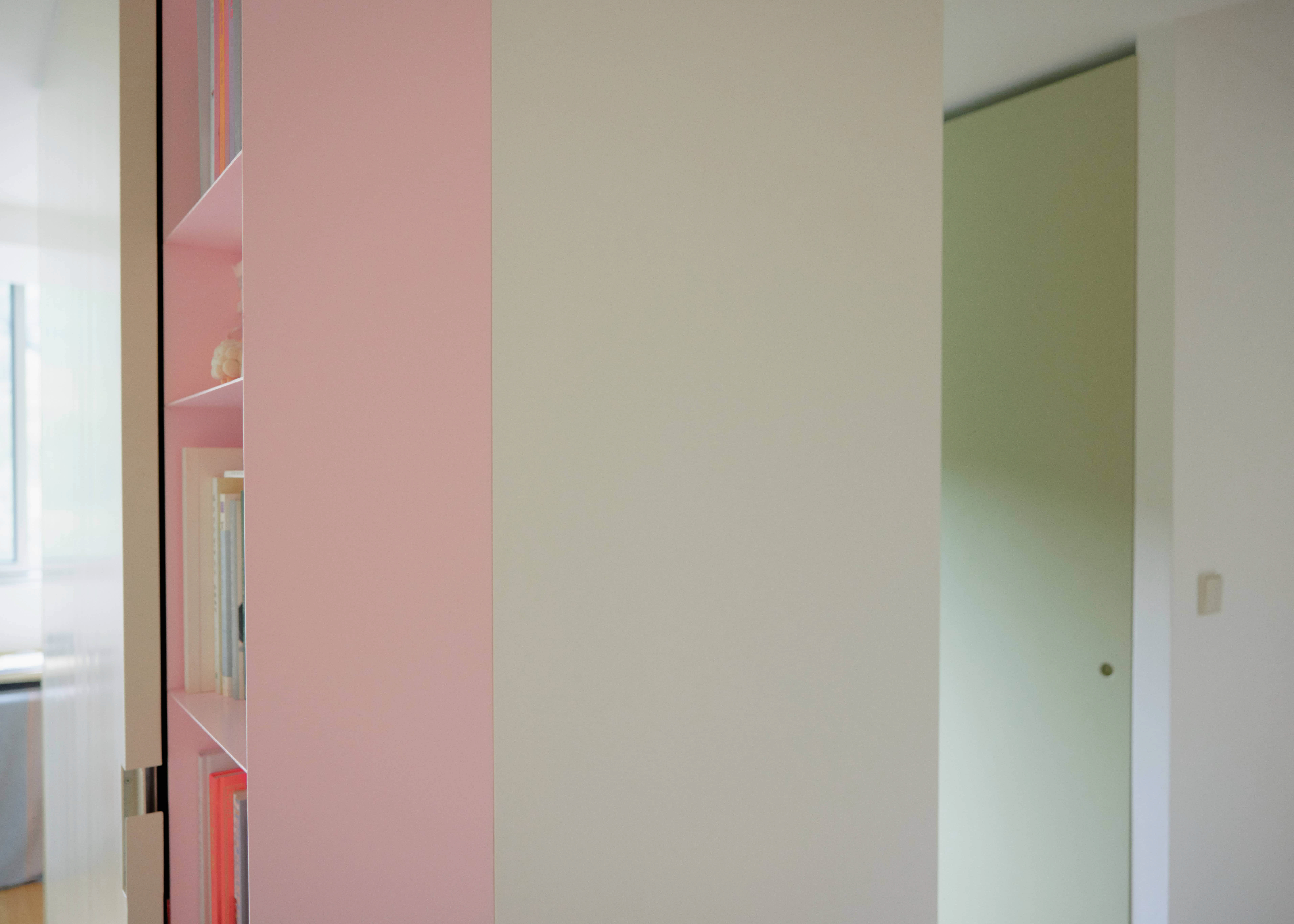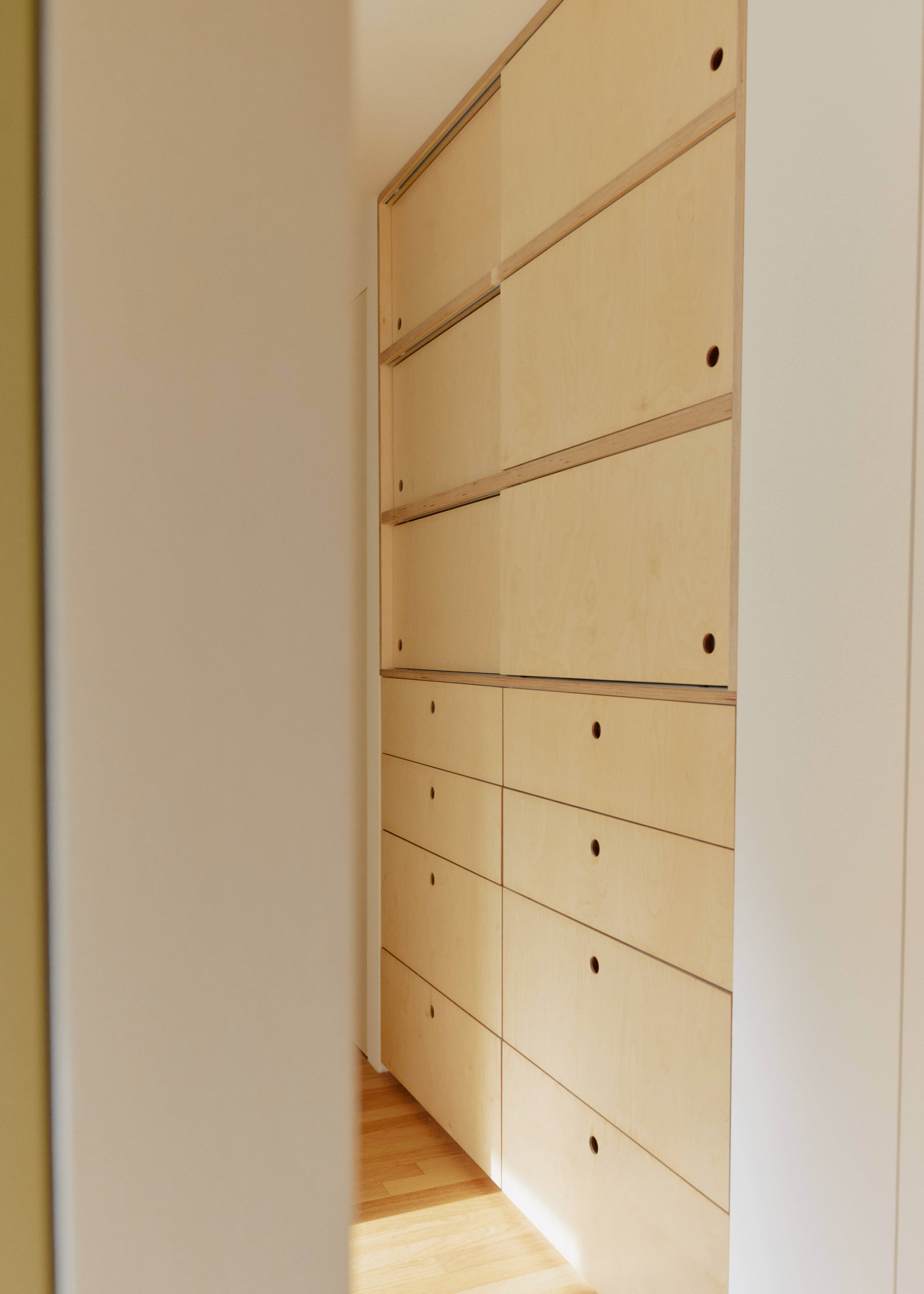 복도는 통로인 동시에 벽을 이용해 다양하게 활용할 수 있도록 구성했다. 벽이 얕은 부분에는 책꽂이를, 깊은 부분에는 옷장을 매입했다. 통로였던 공간의 문을 닫으면 드레스룸이나 서재로 변모한다.