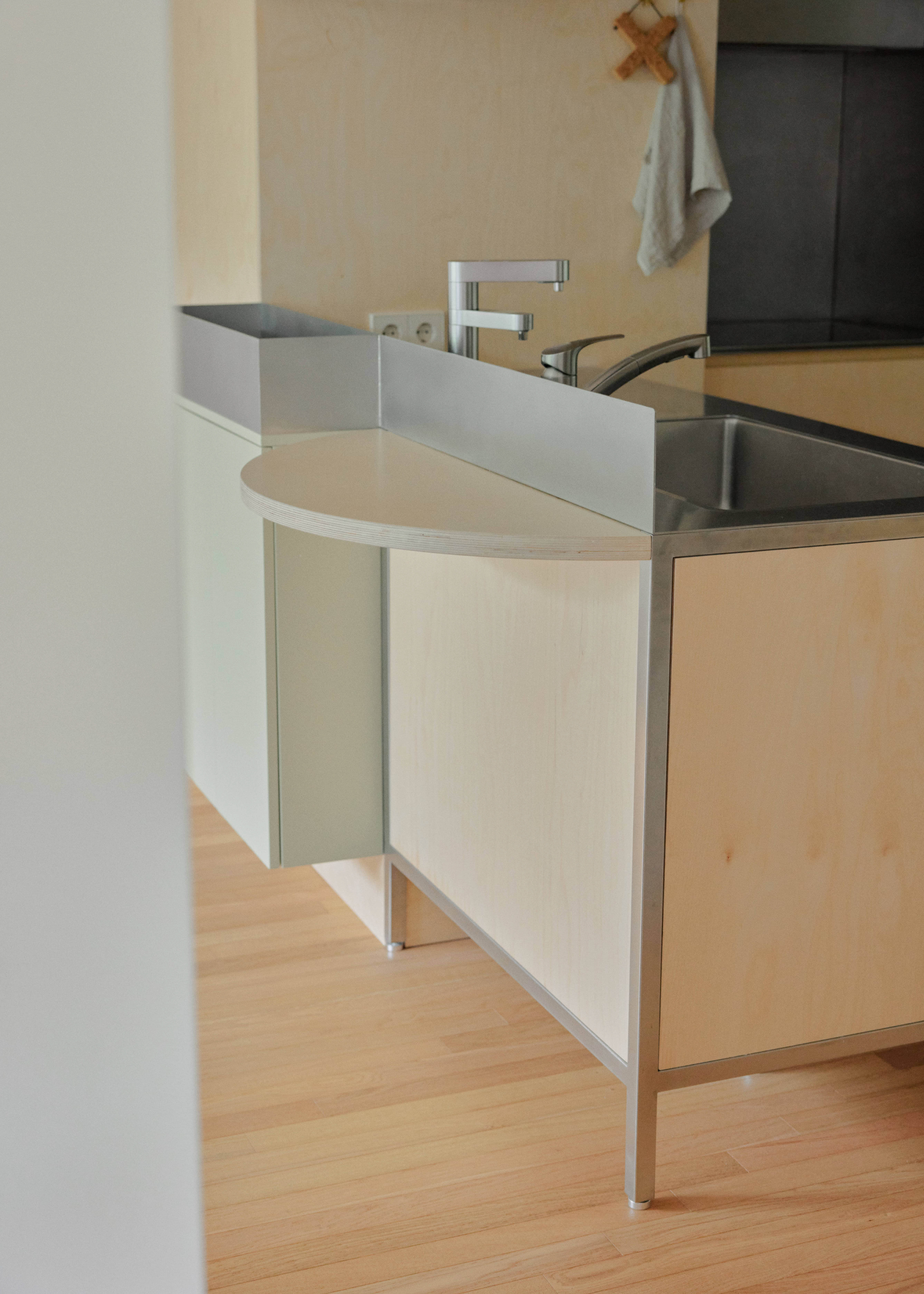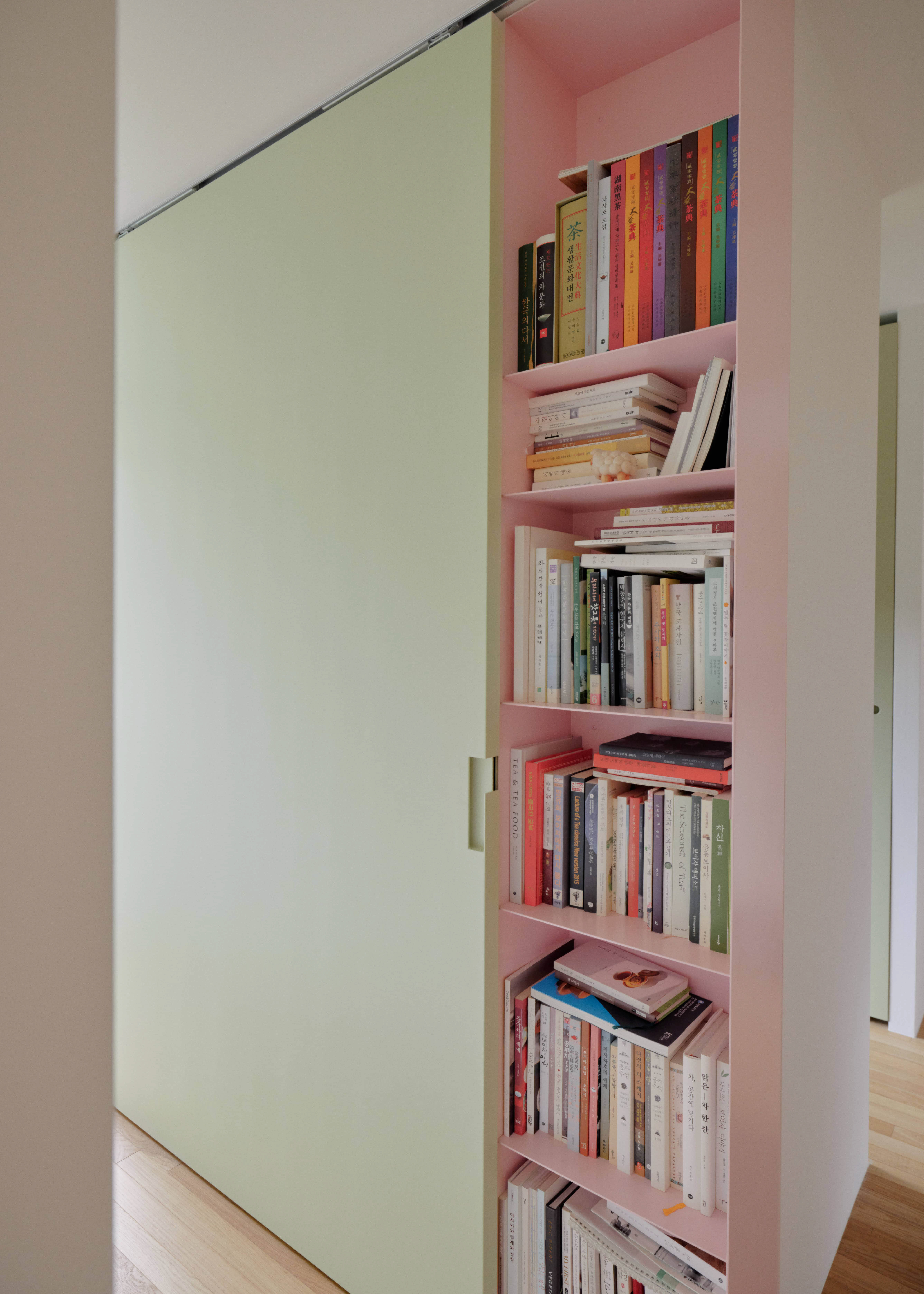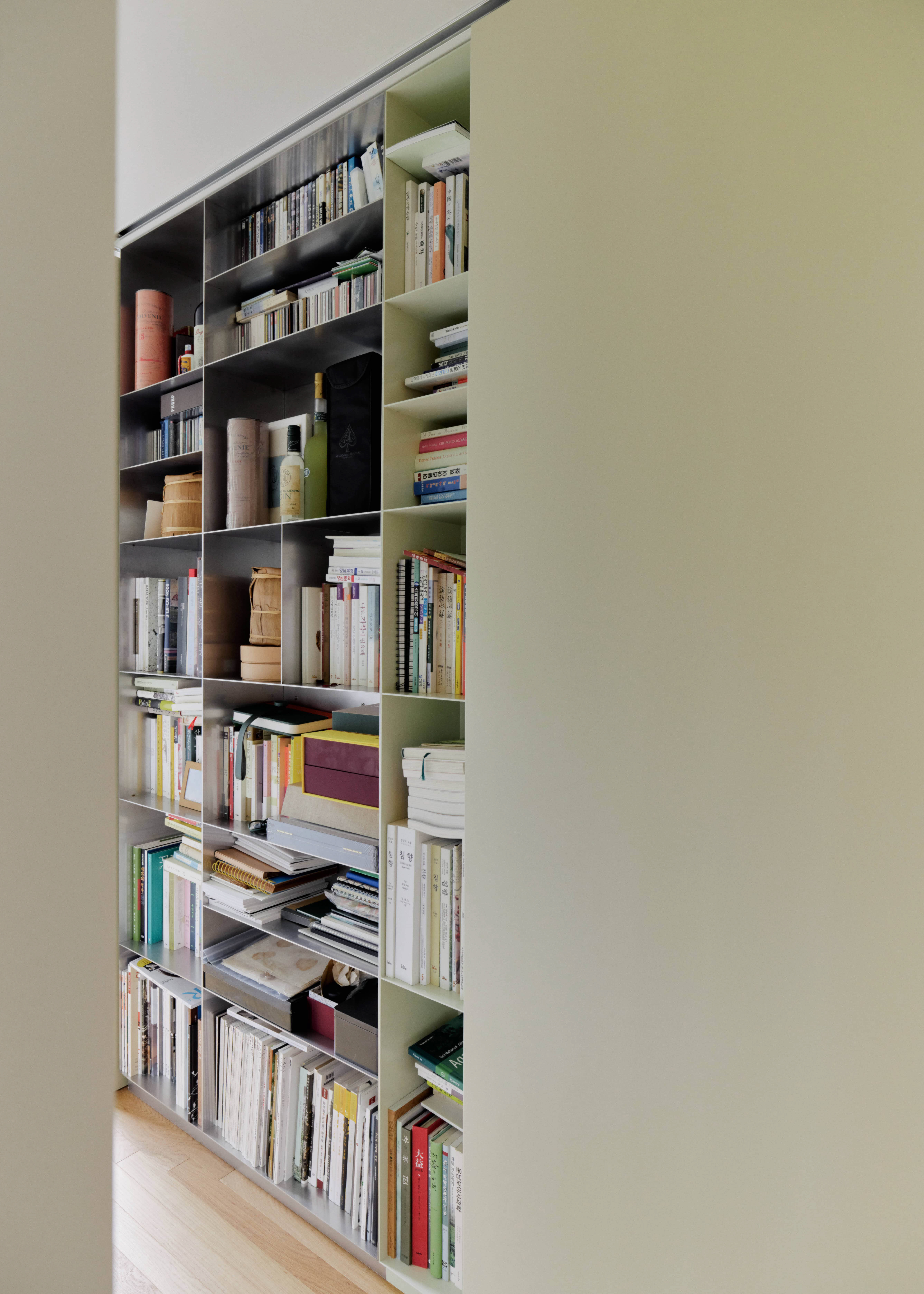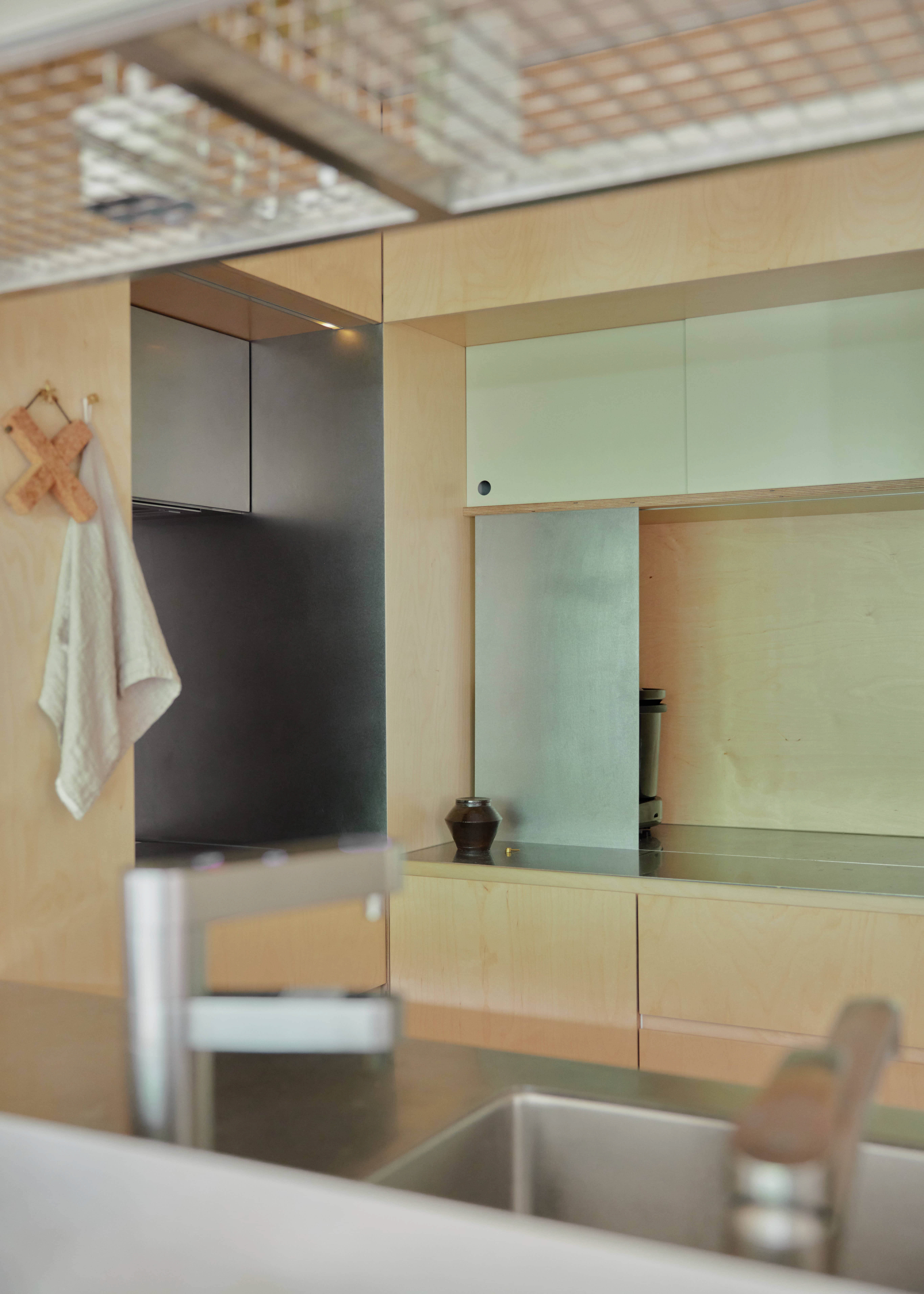 전반적인 공간의 색감과 소재는 클라이언트의 요청에 따라 따스하고 밝은 분위기로 함께 골랐다. 밝은 자작나무 합판과 스테인리스로 만든 주방 가구, 금속 책장, 공간을 분할해 주는 슬라이딩 벽체 등 곳곳에 은은한 찻물을 닮은 색감을 담았다.