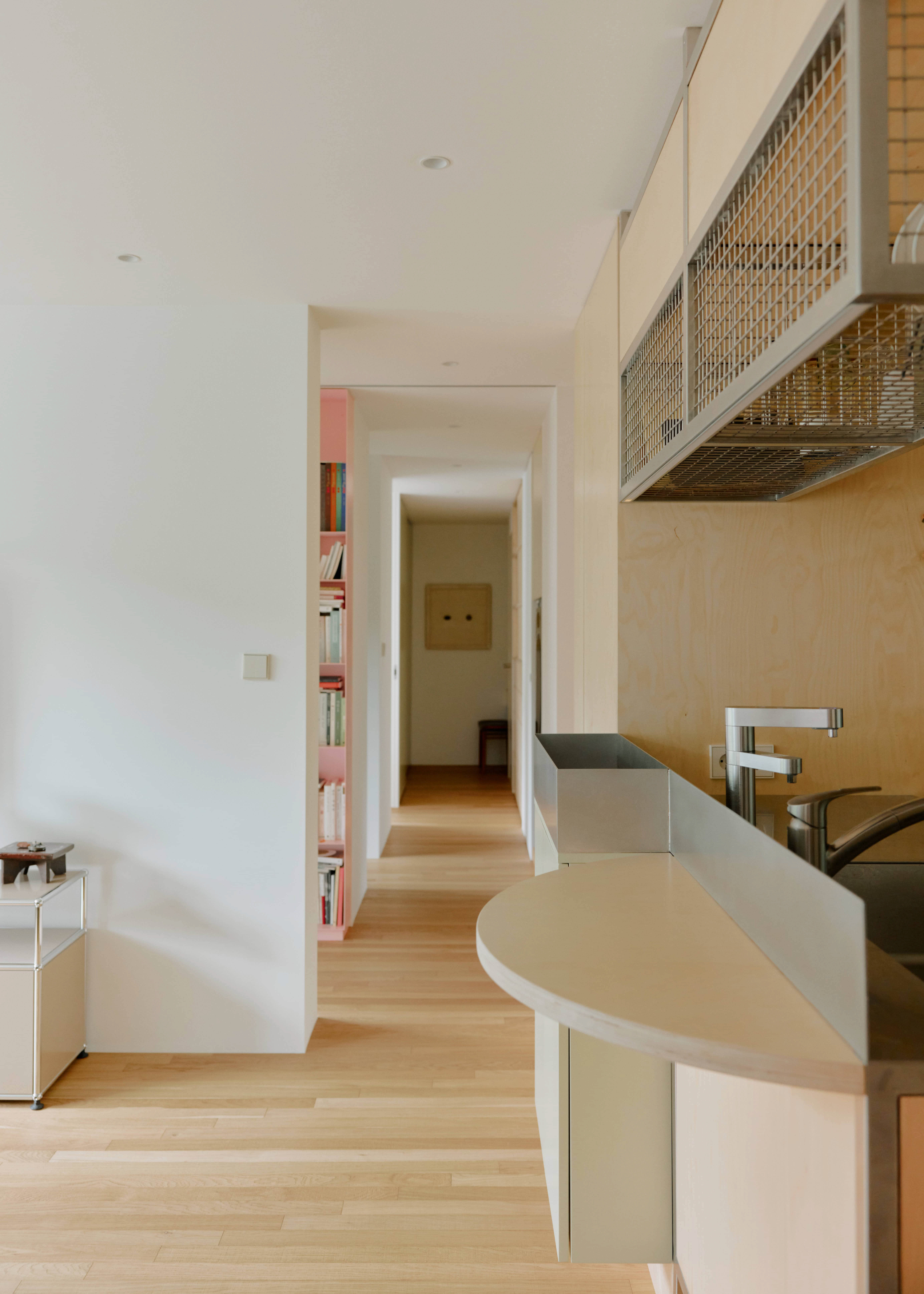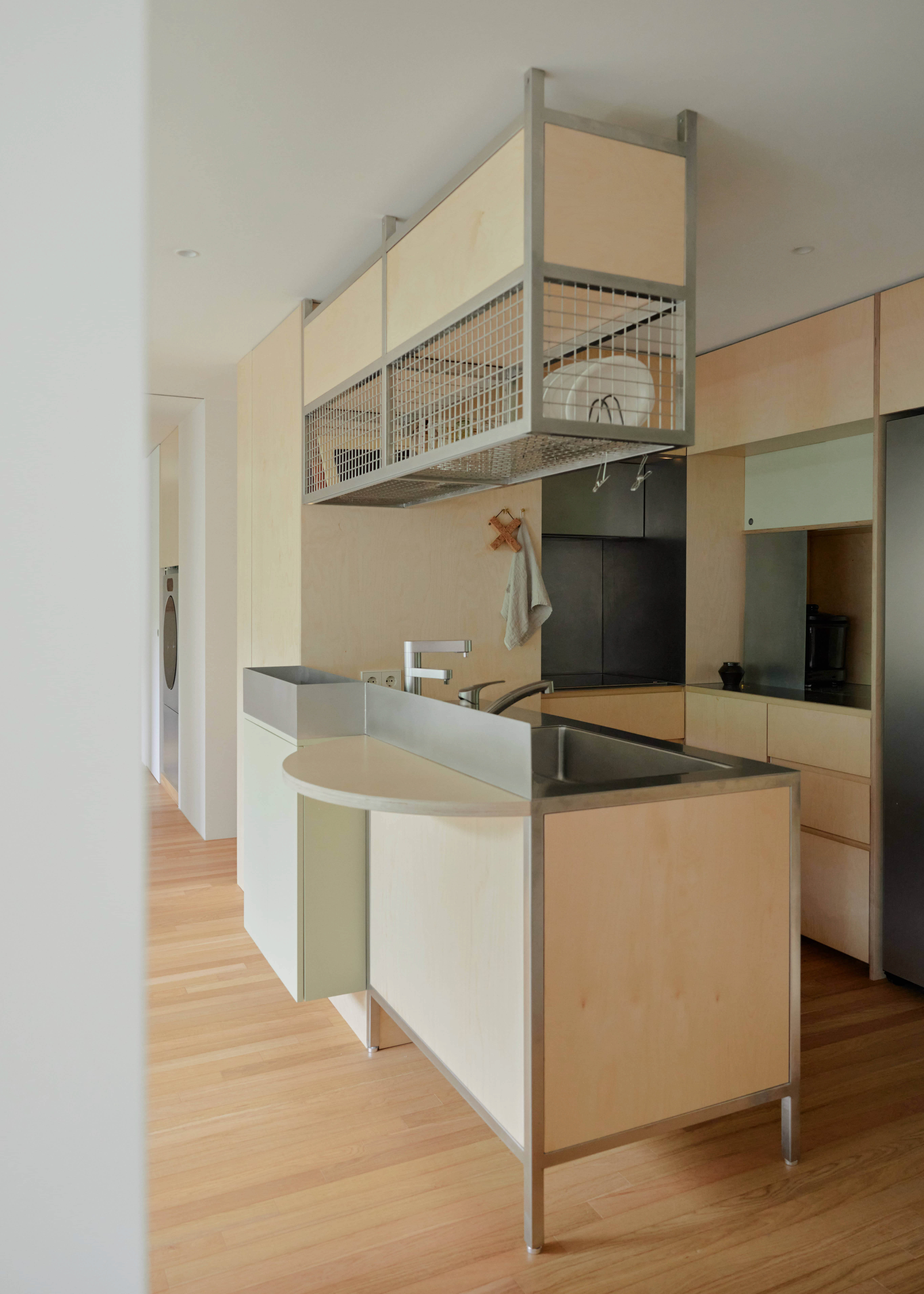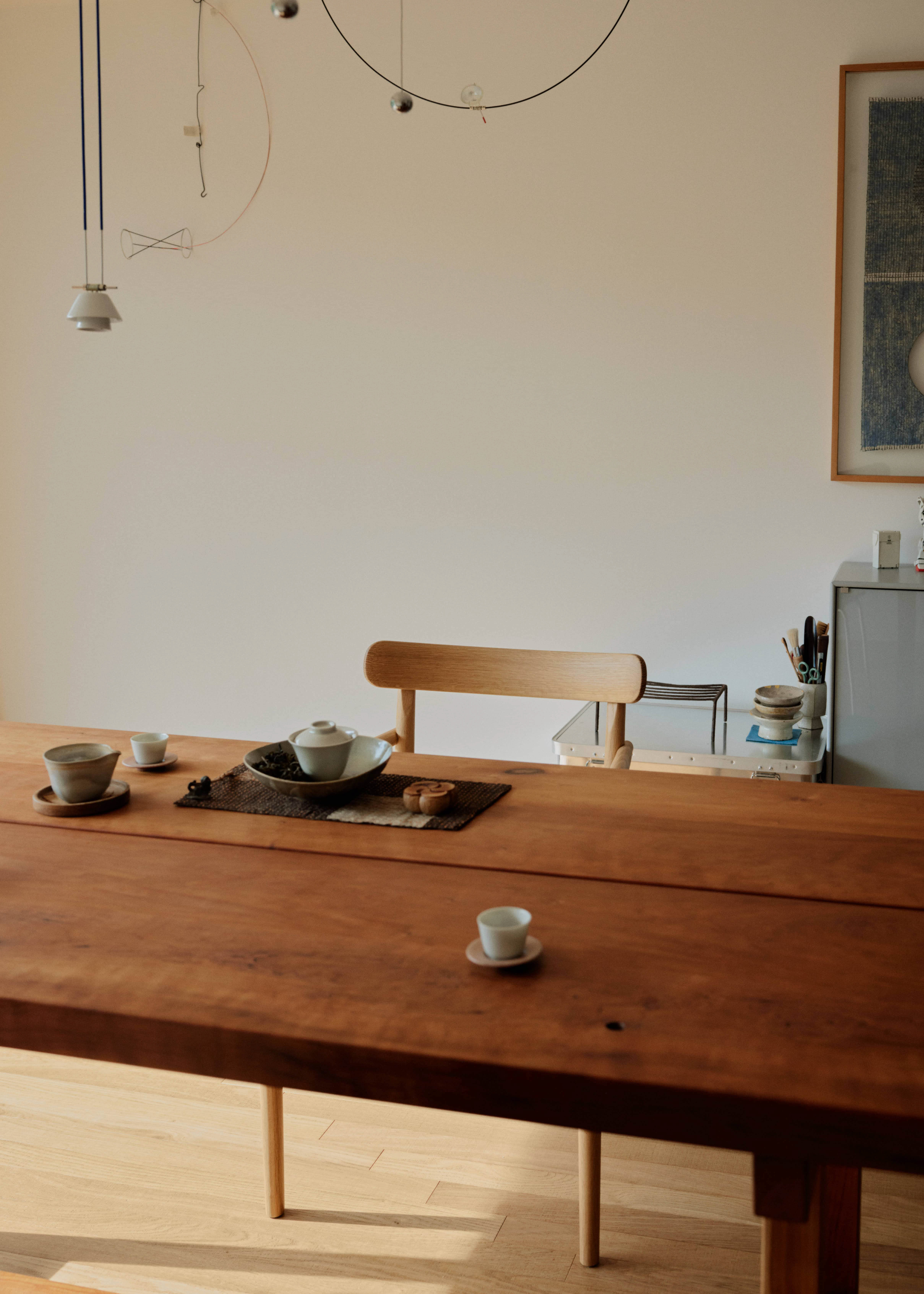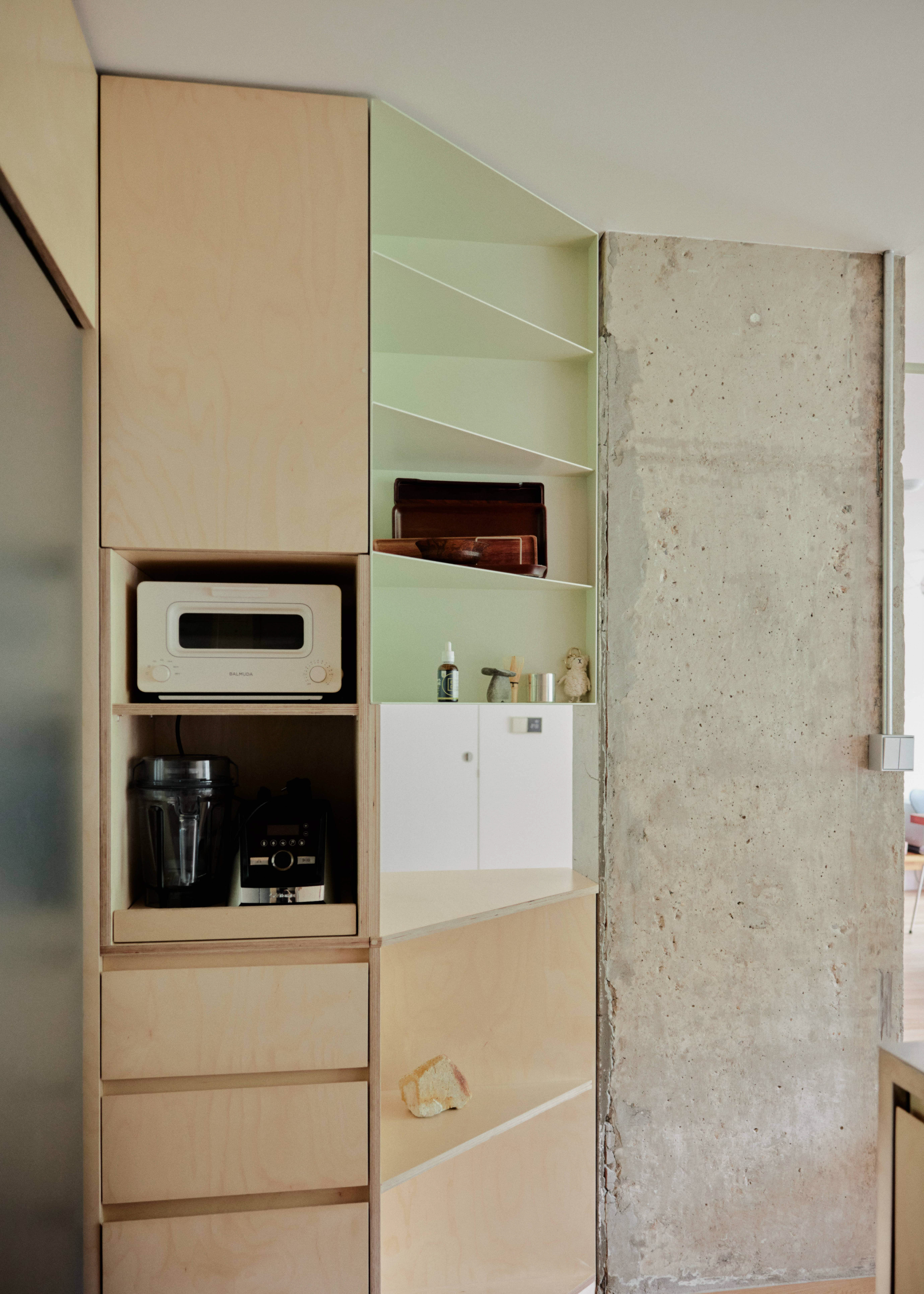 전반적인 공간의 색감과 소재는 클라이언트의 요청에 따라 따스하고 밝은 분위기로 함께 골랐다. 밝은 자작나무 합판과 스테인리스로 만든 주방 가구, 금속 책장, 공간을 분할해 주는 슬라이딩 벽체 등 곳곳에 은은한 찻물을 닮은 색감을 담았다.