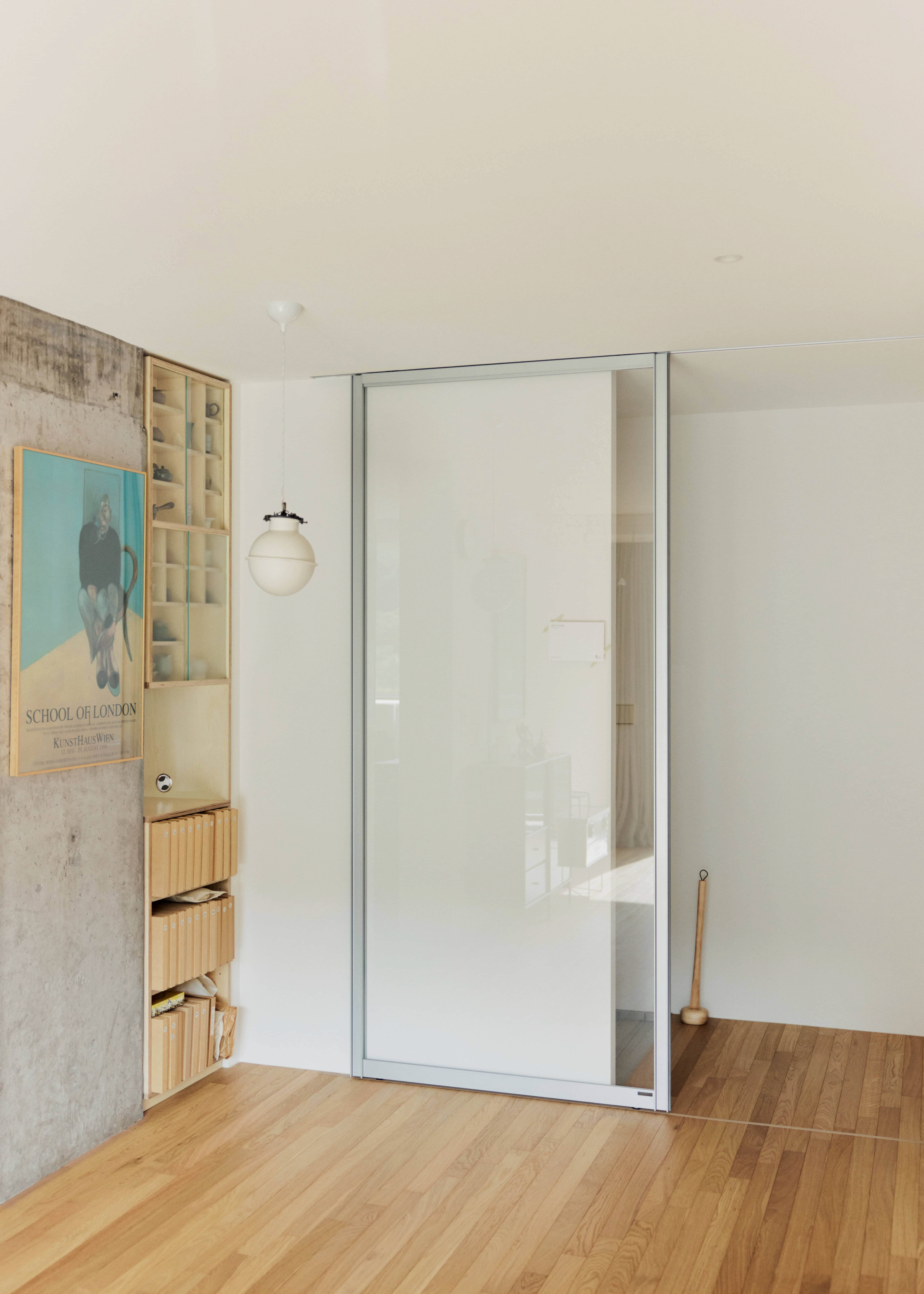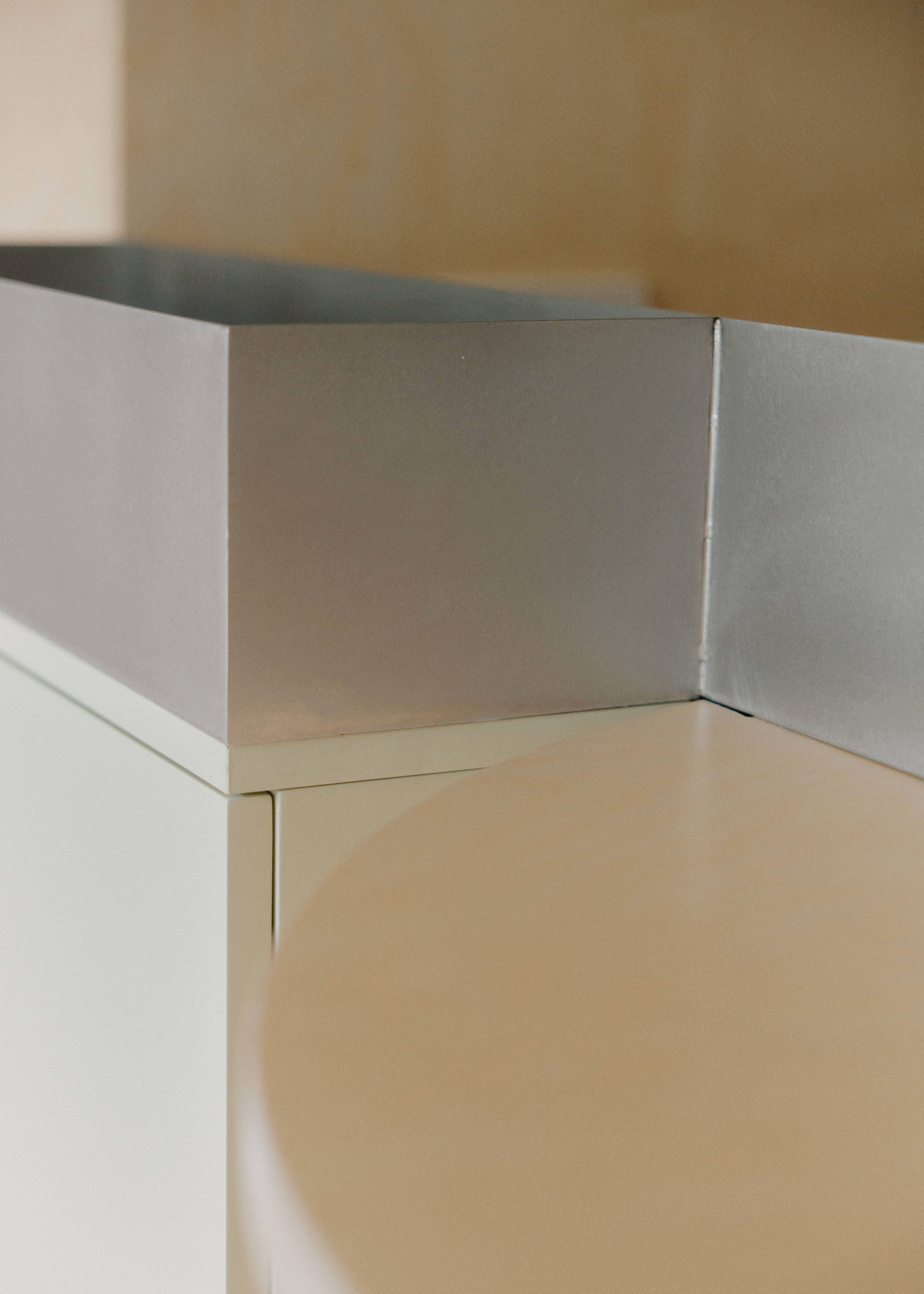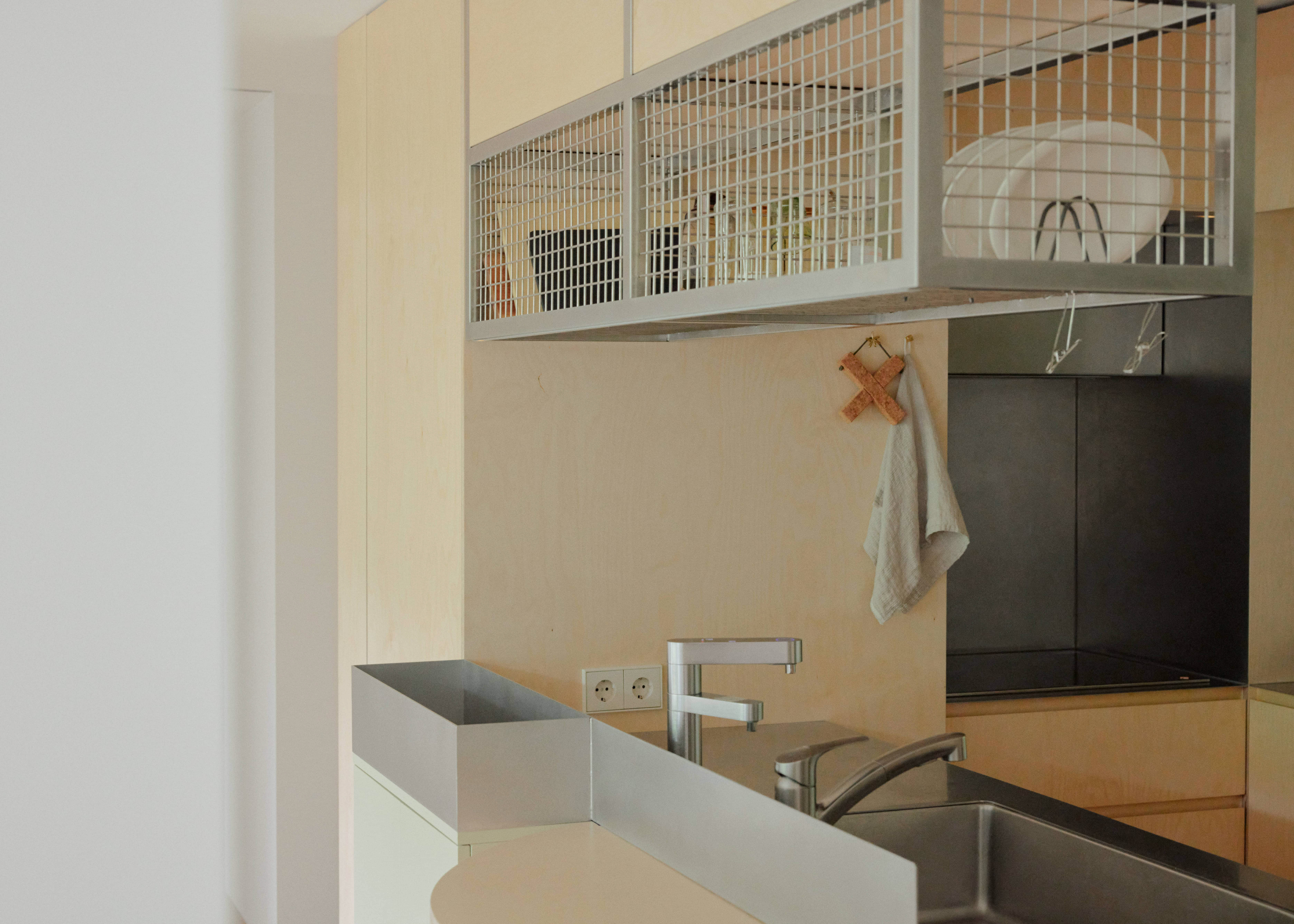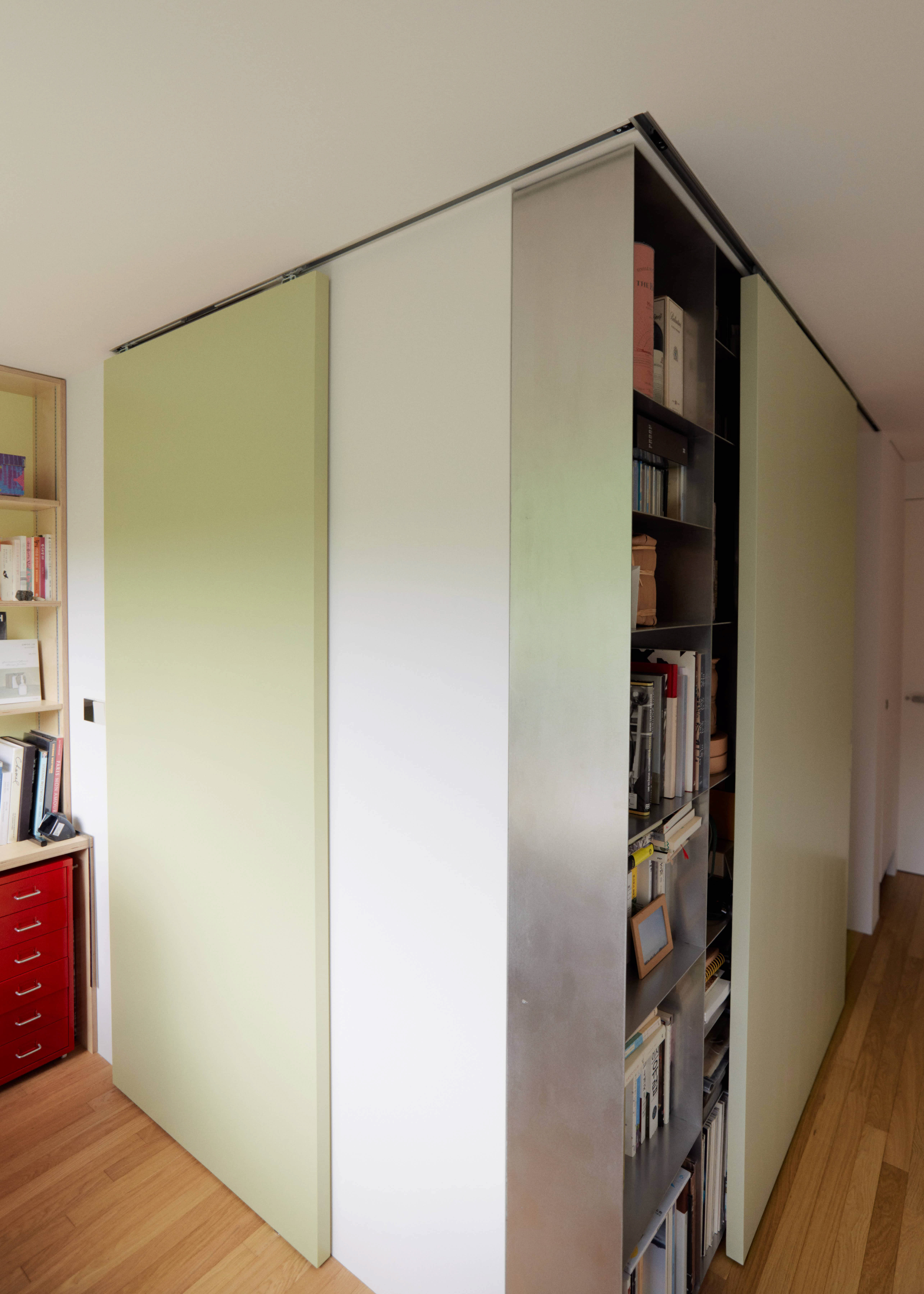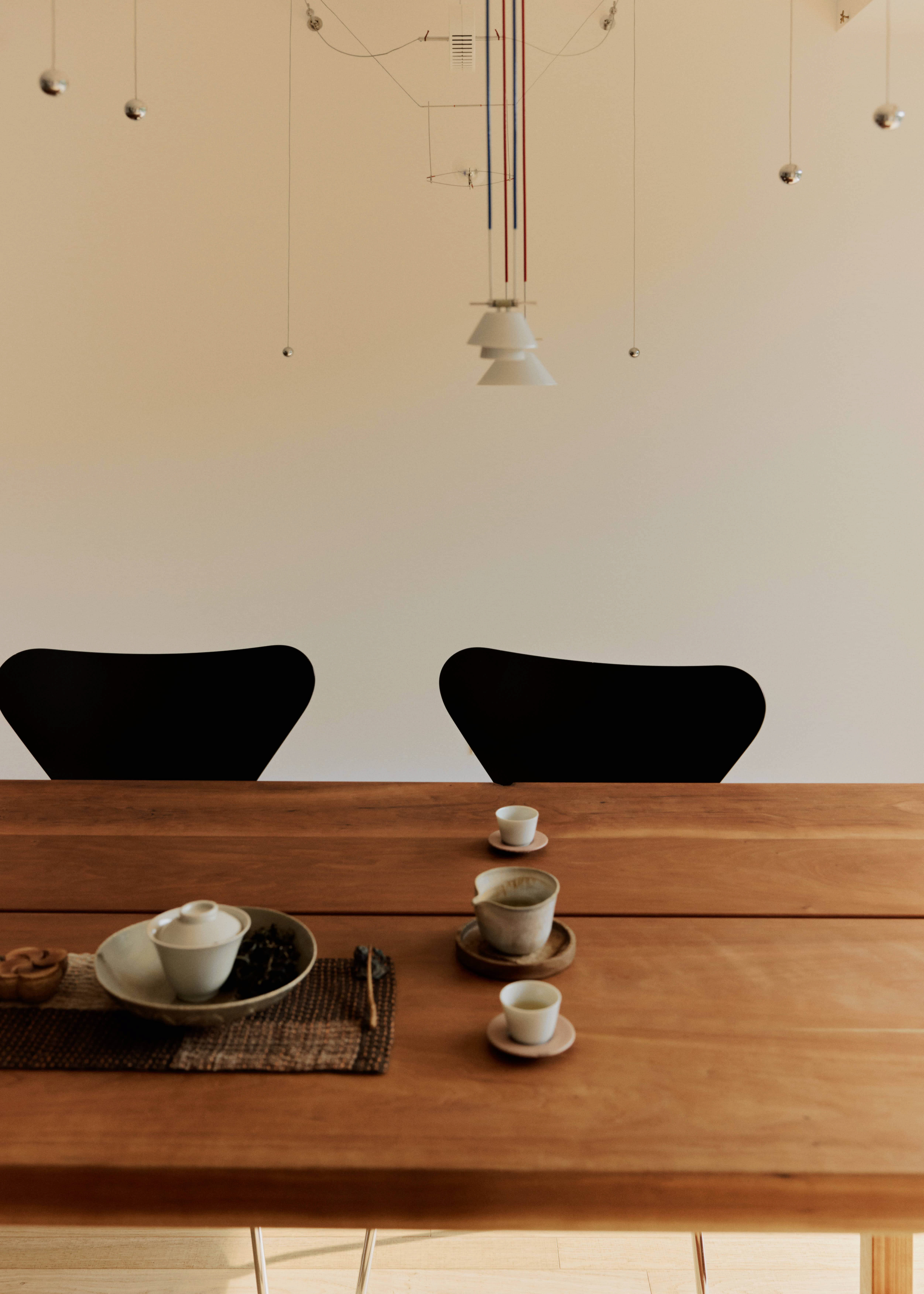전반적인 공간의 색감과 소재는 클라이언트의 요청에 따라 따스하고 밝은 분위기로 함께 골랐다. 밝은 자작나무 합판과 스테인리스로 만든 주방 가구, 금속 책장, 공간을 분할해 주는 슬라이딩 벽체 등 곳곳에 은은한 찻물을 닮은 색감을 담았다.