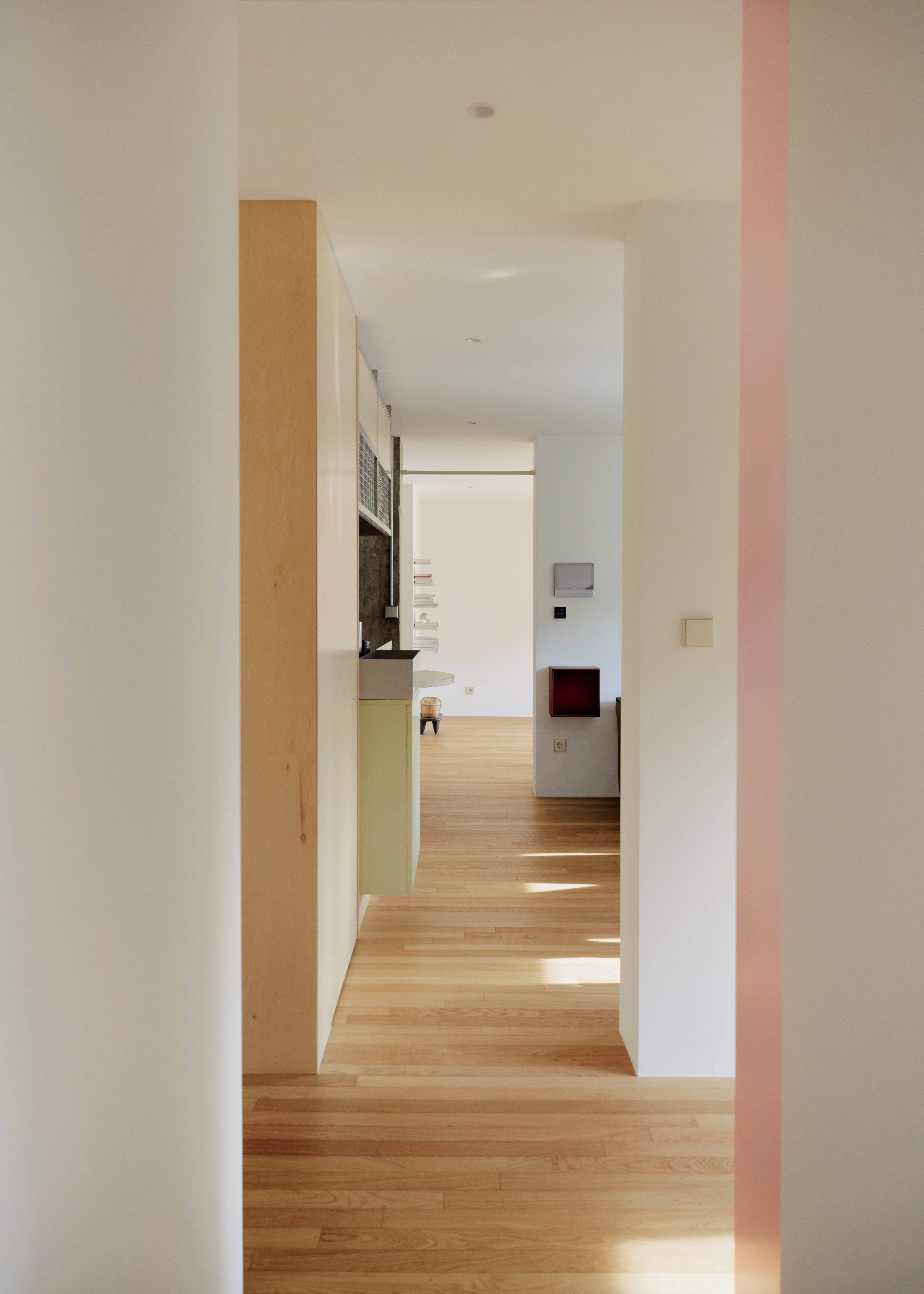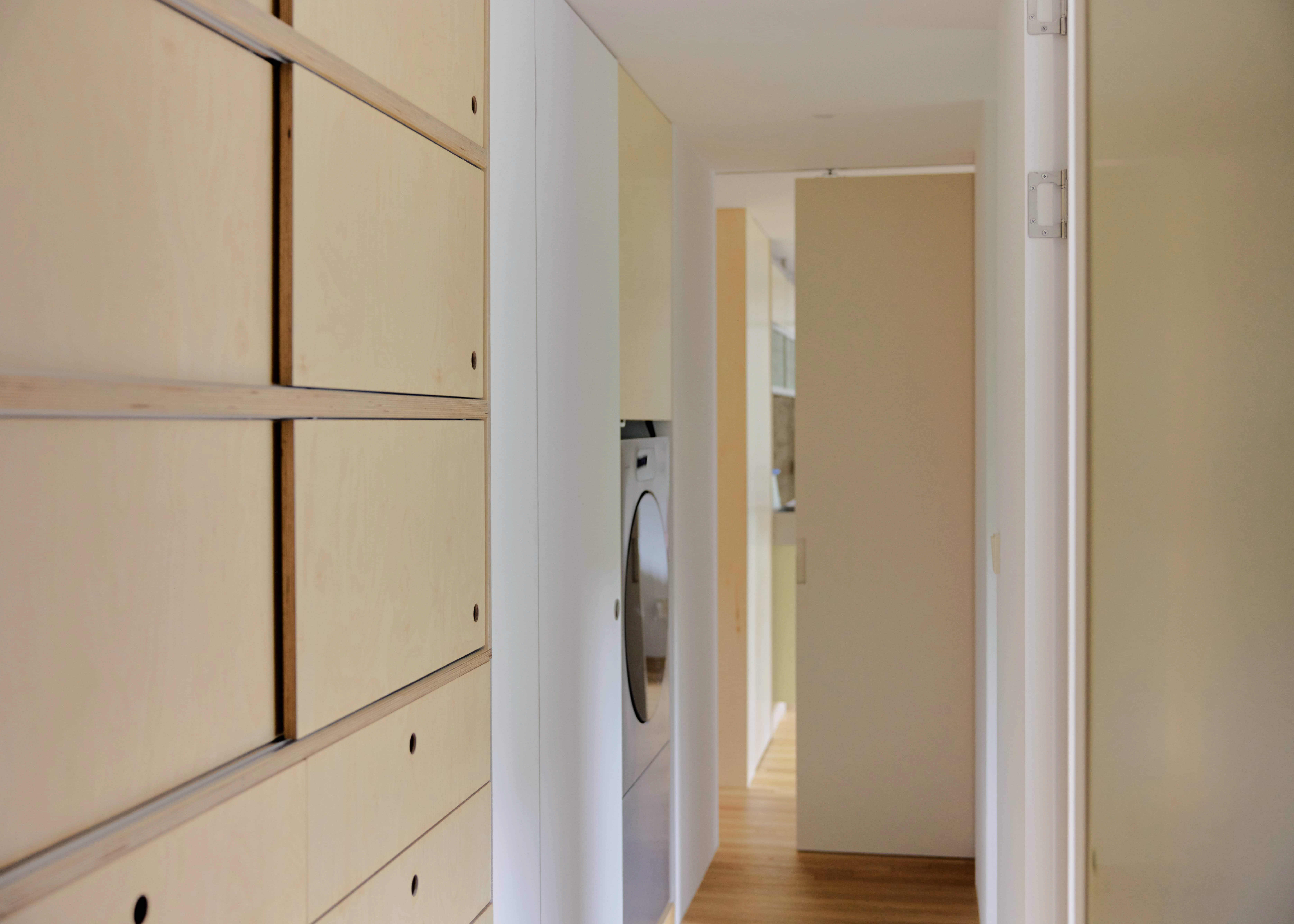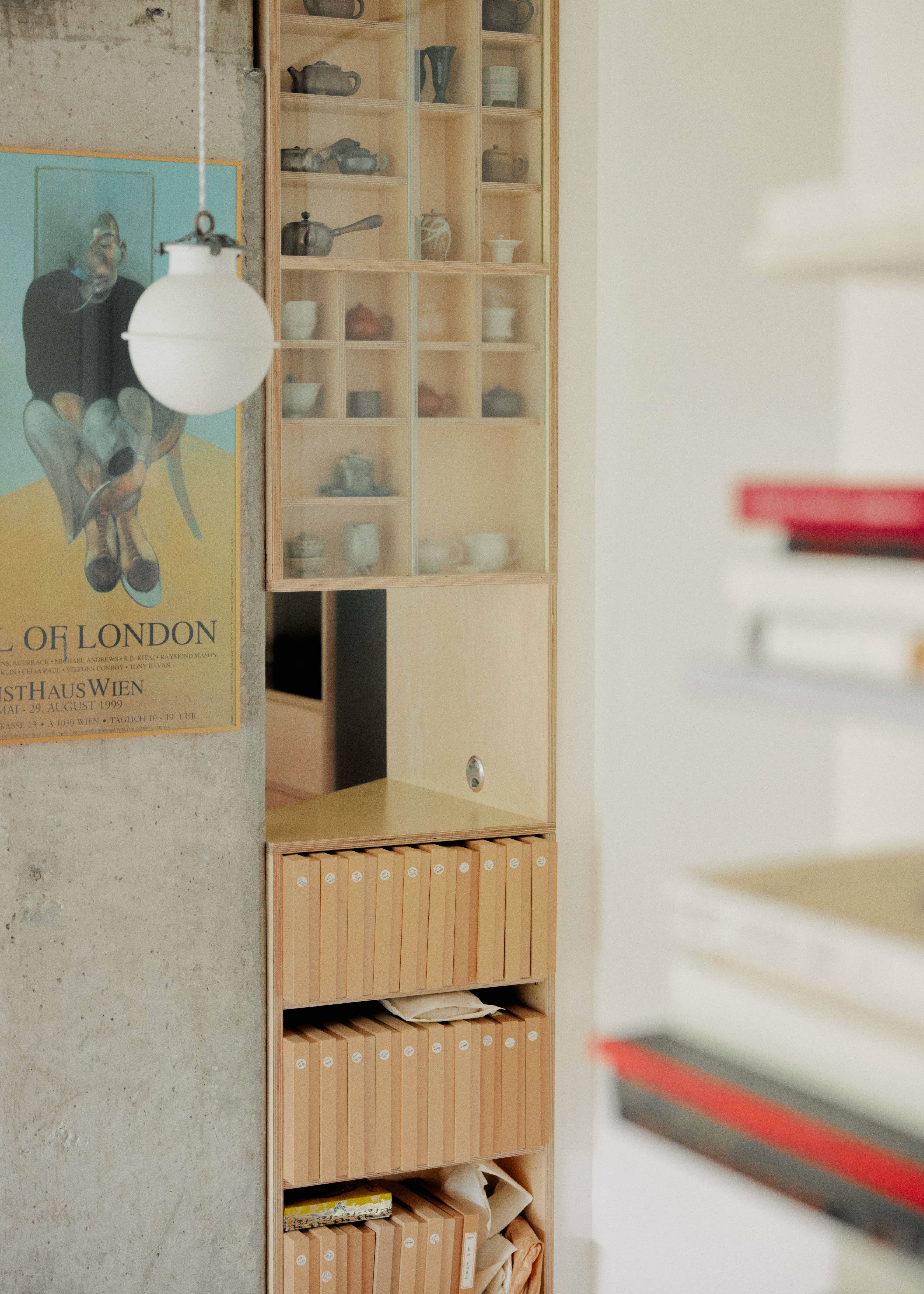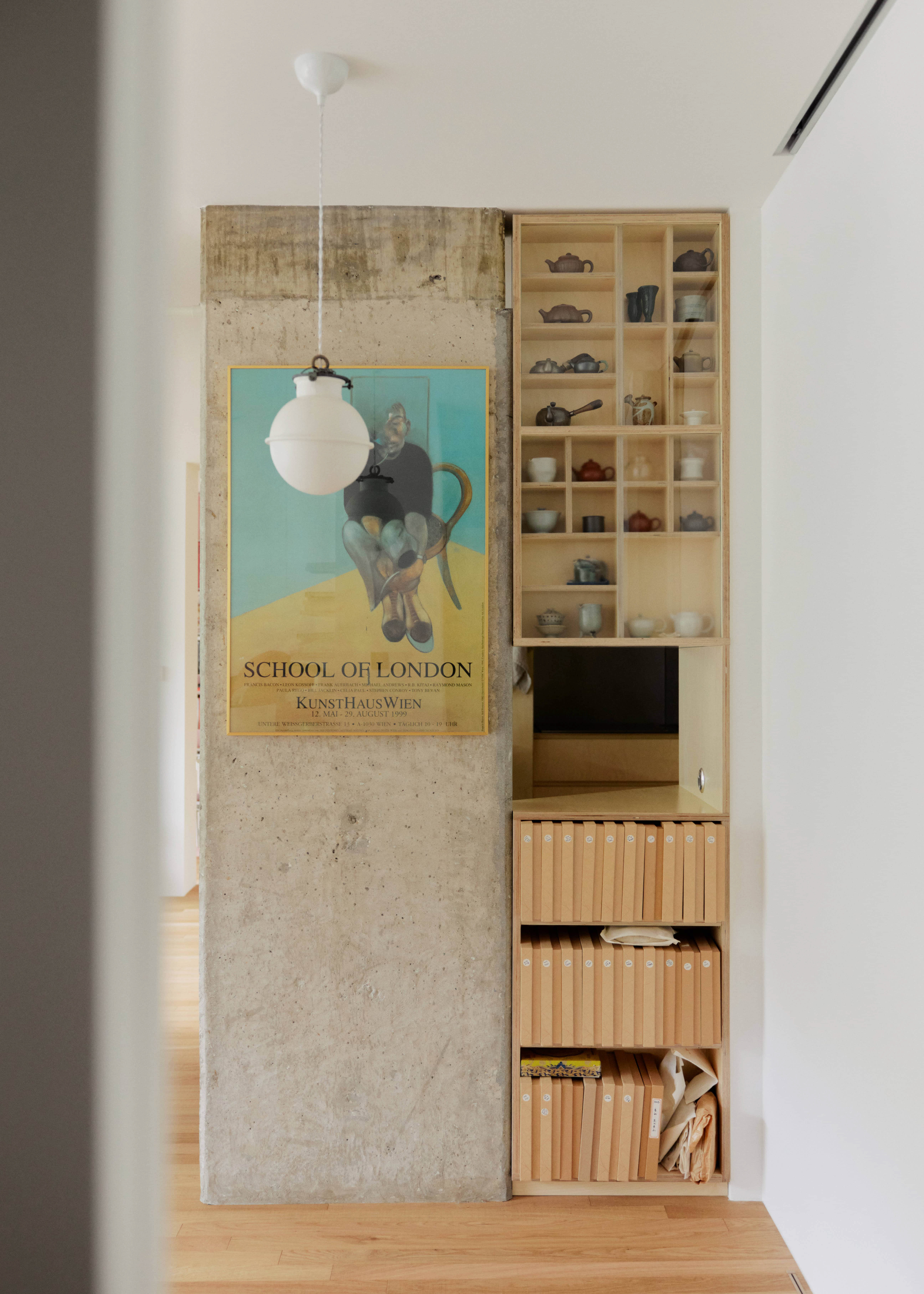 전반적인 공간의 색감과 소재는 클라이언트의 요청에 따라 따스하고 밝은 분위기로 함께 골랐다. 밝은 자작나무 합판과 스테인리스로 만든 주방 가구, 금속 책장, 공간을 분할해 주는 슬라이딩 벽체 등 곳곳에 은은한 찻물을 닮은 색감을 담았다.