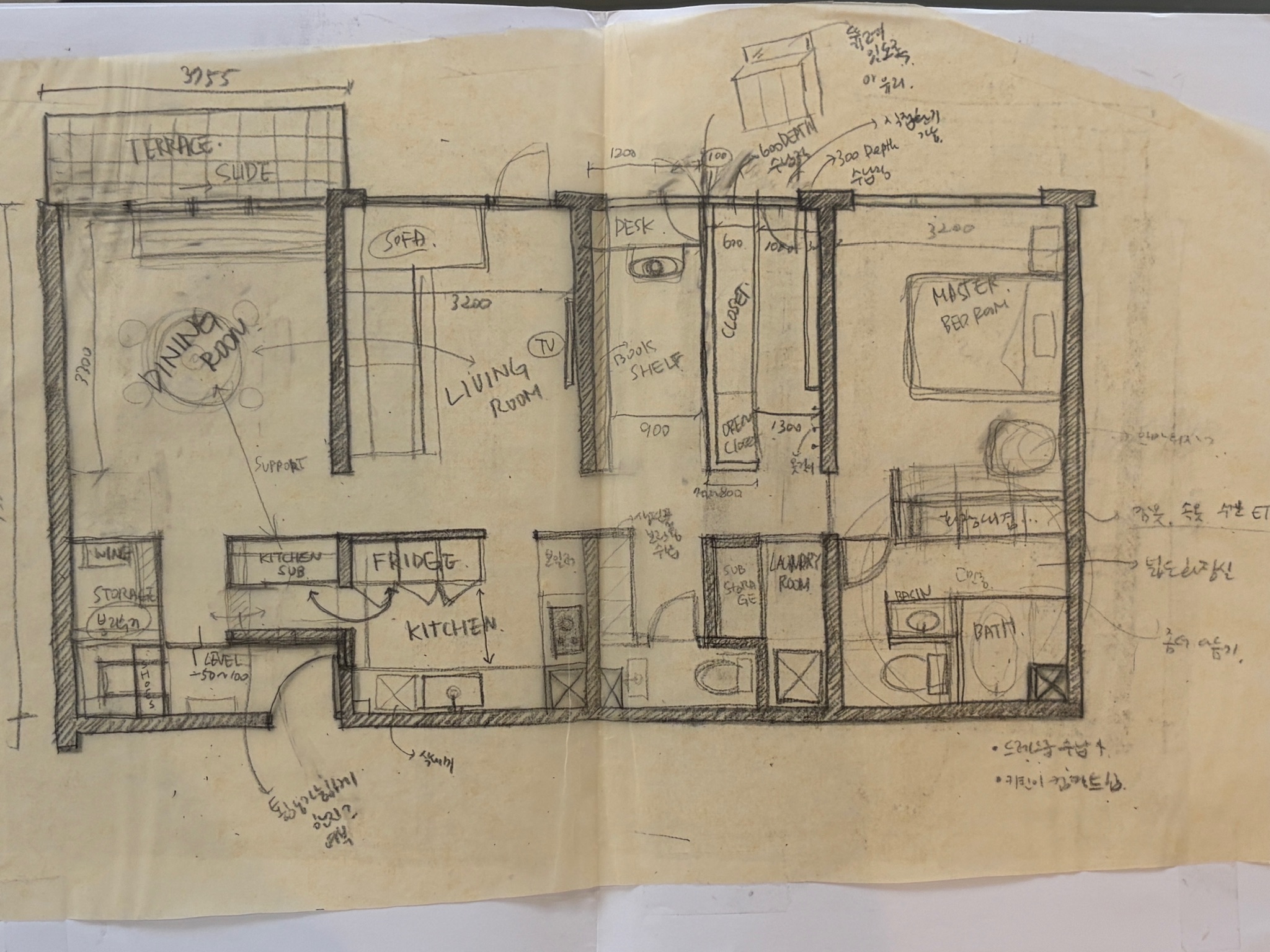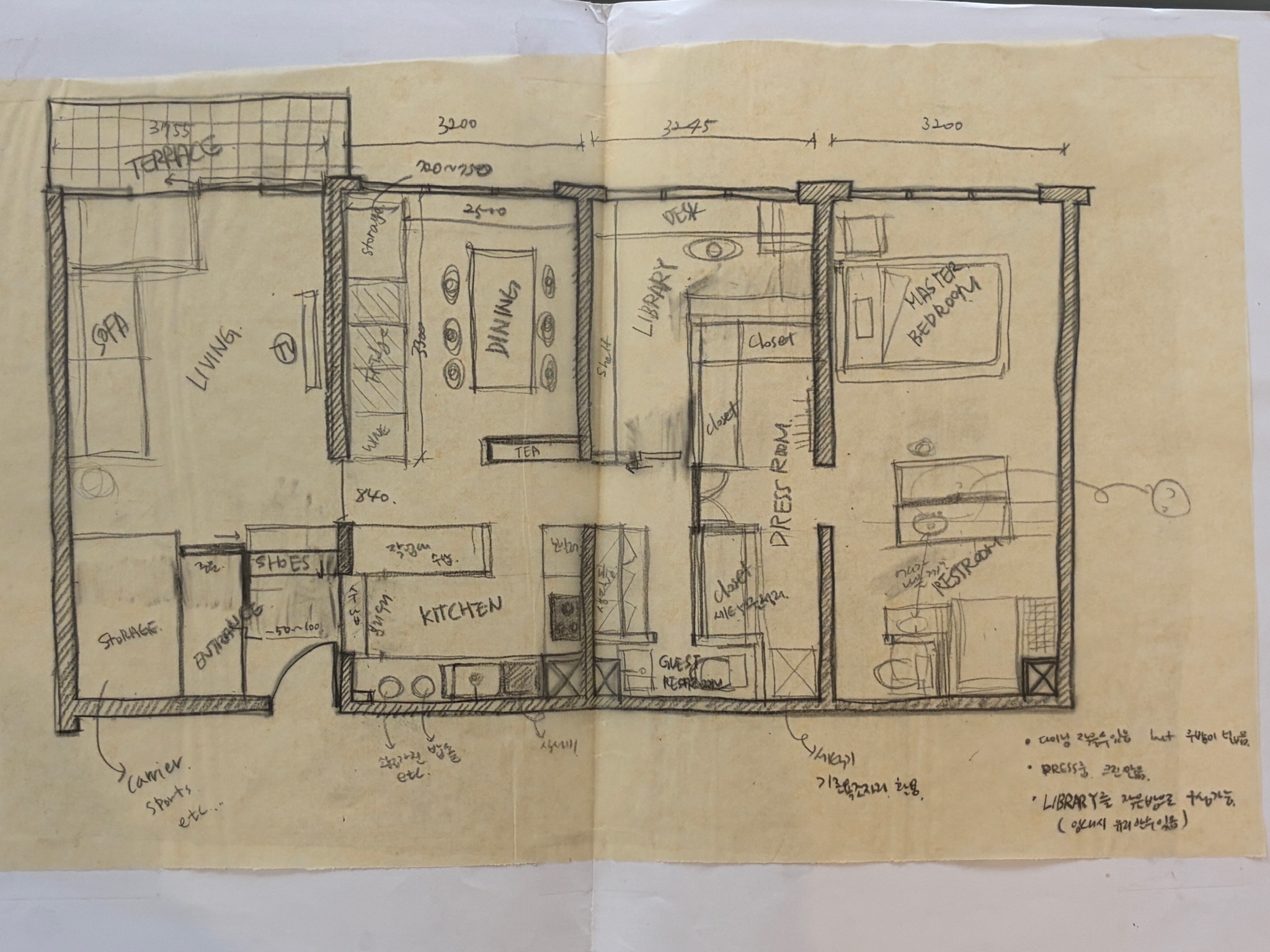 현관 - 다이닝 - 주방과 거실 - 서재와 드레스룸 - 침실 복도를 따라 들어갈수록 개인적인 공간을 배치하여 조금 더 아늑하고 편안하게 생활할 수 있도록 공간을 구성하였다.