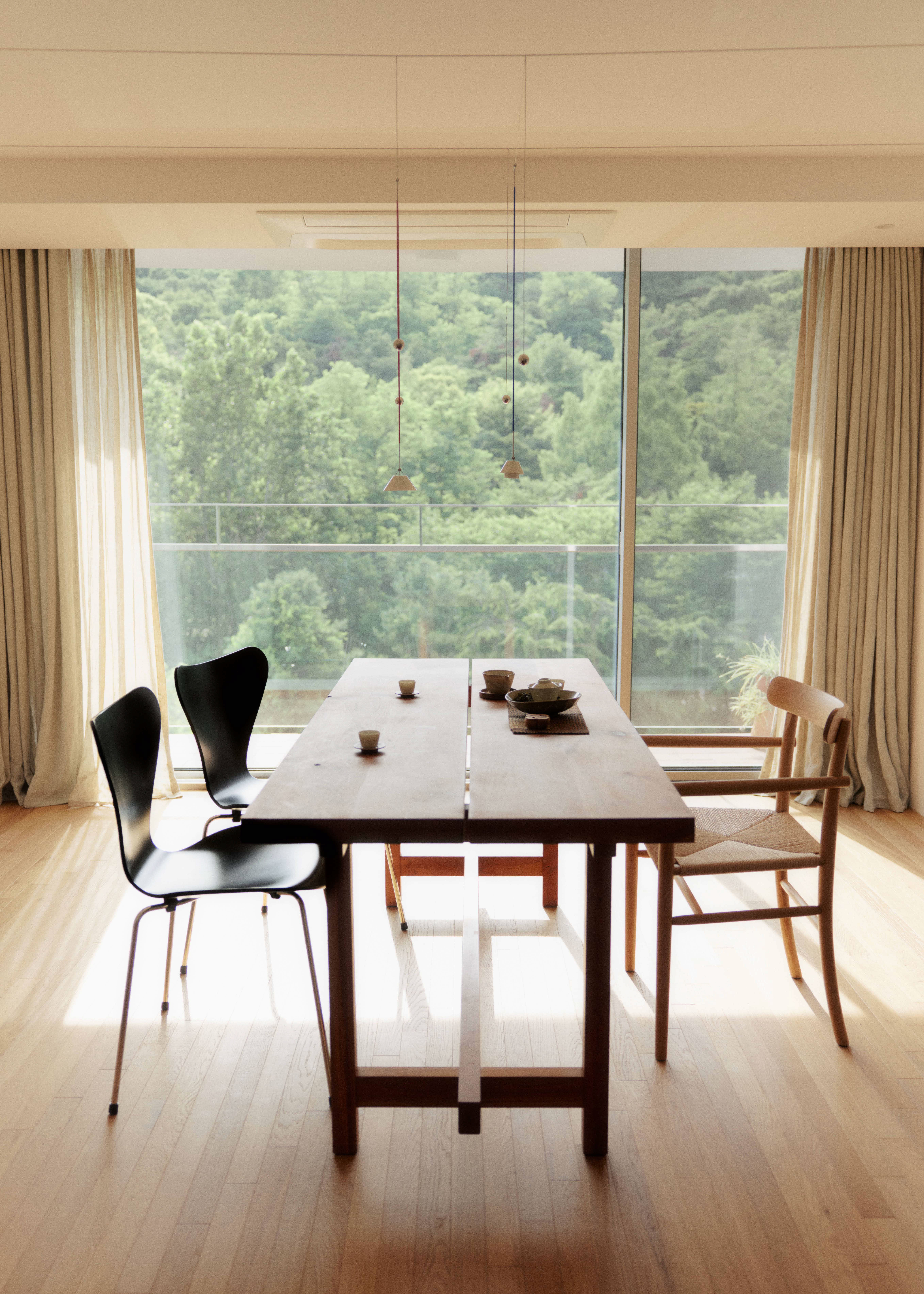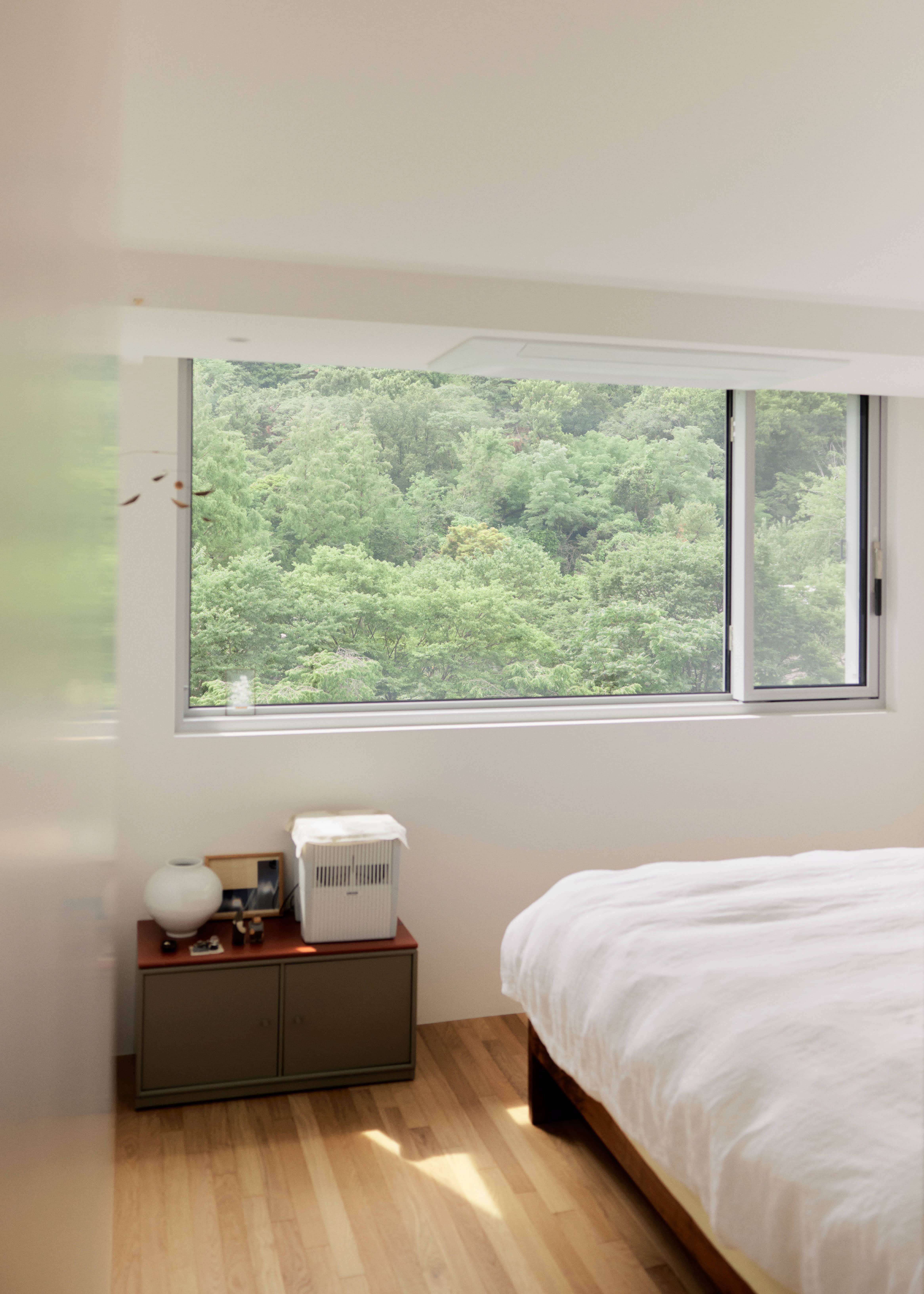 우리는 공간의 레이아웃을 재구성하고, 생활을 위해 꼭 필요한 기능적인 공간을 창 반대편인 복도 쪽으로 배치해 다이닝, 거실, 서재, 침실 모든 곳에서 이 아름다운 풍경을 충분히 누릴 수 있도록 했다.