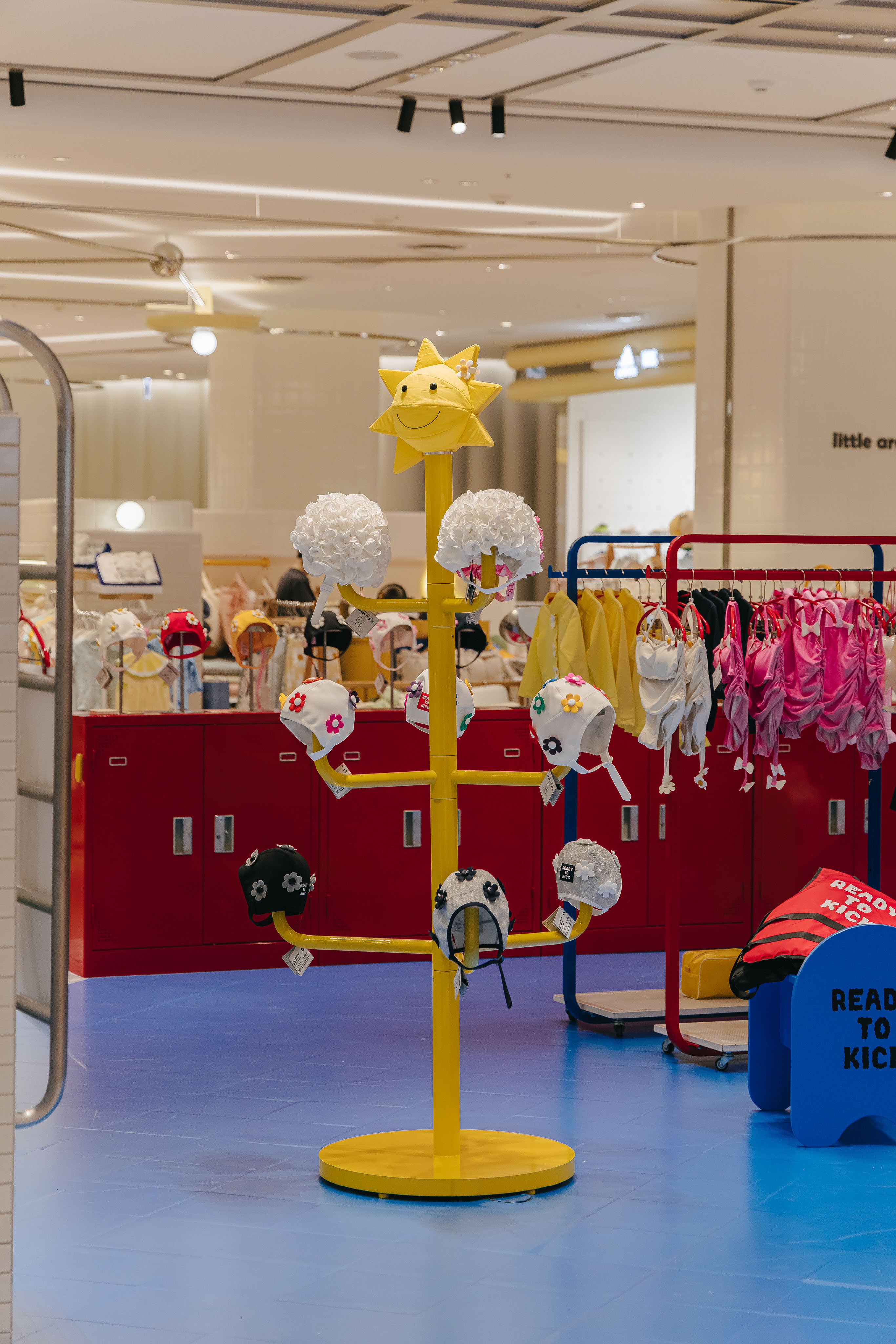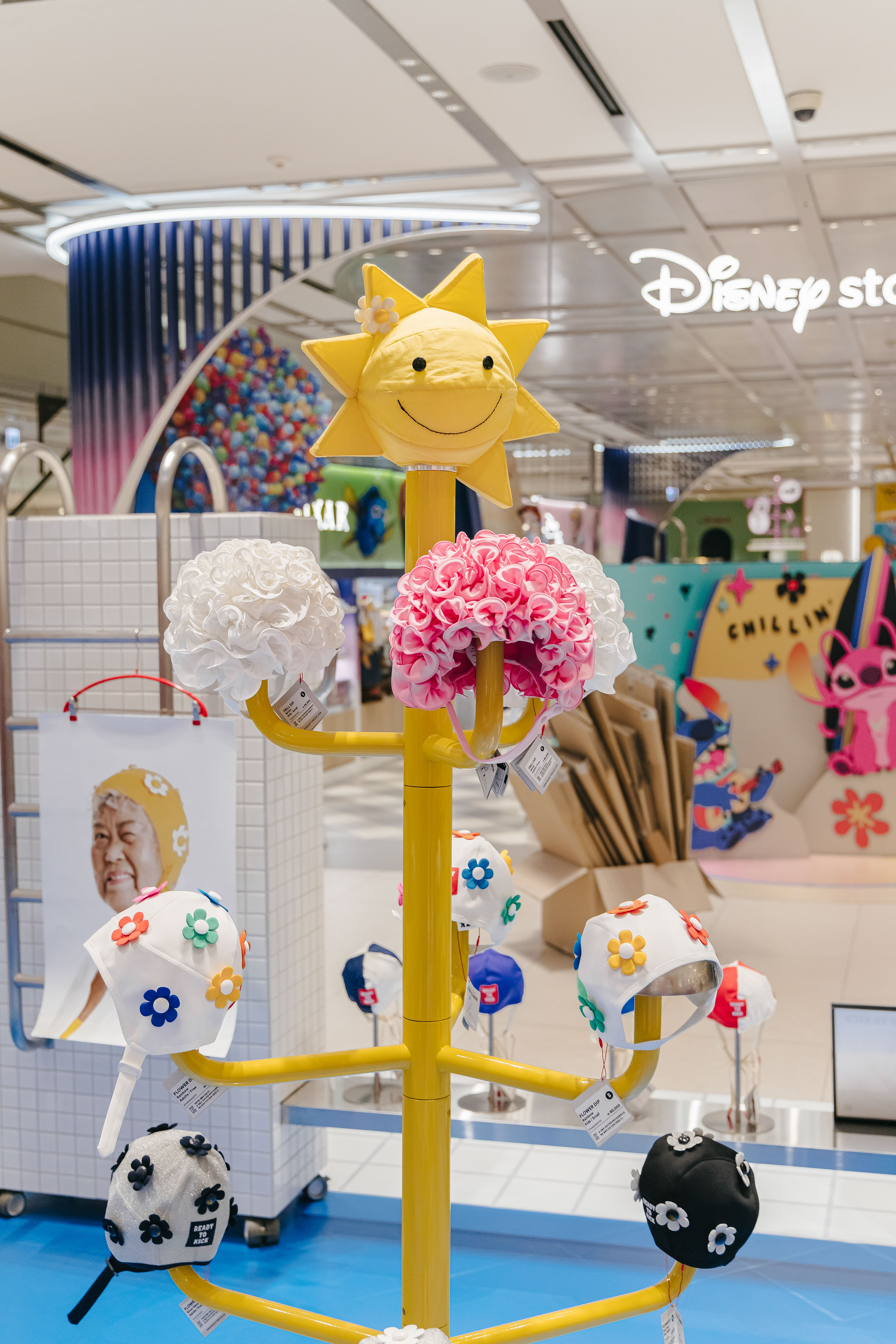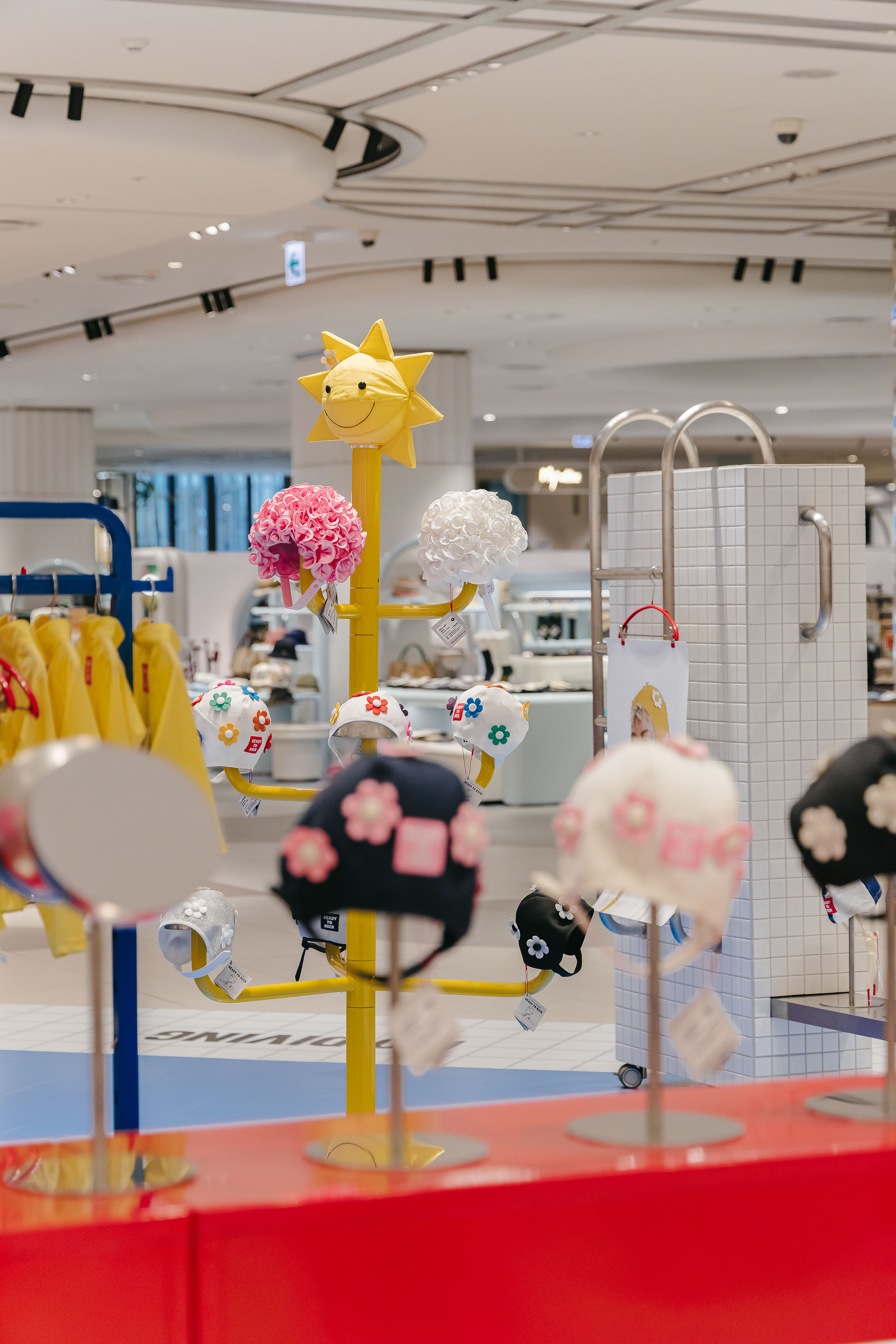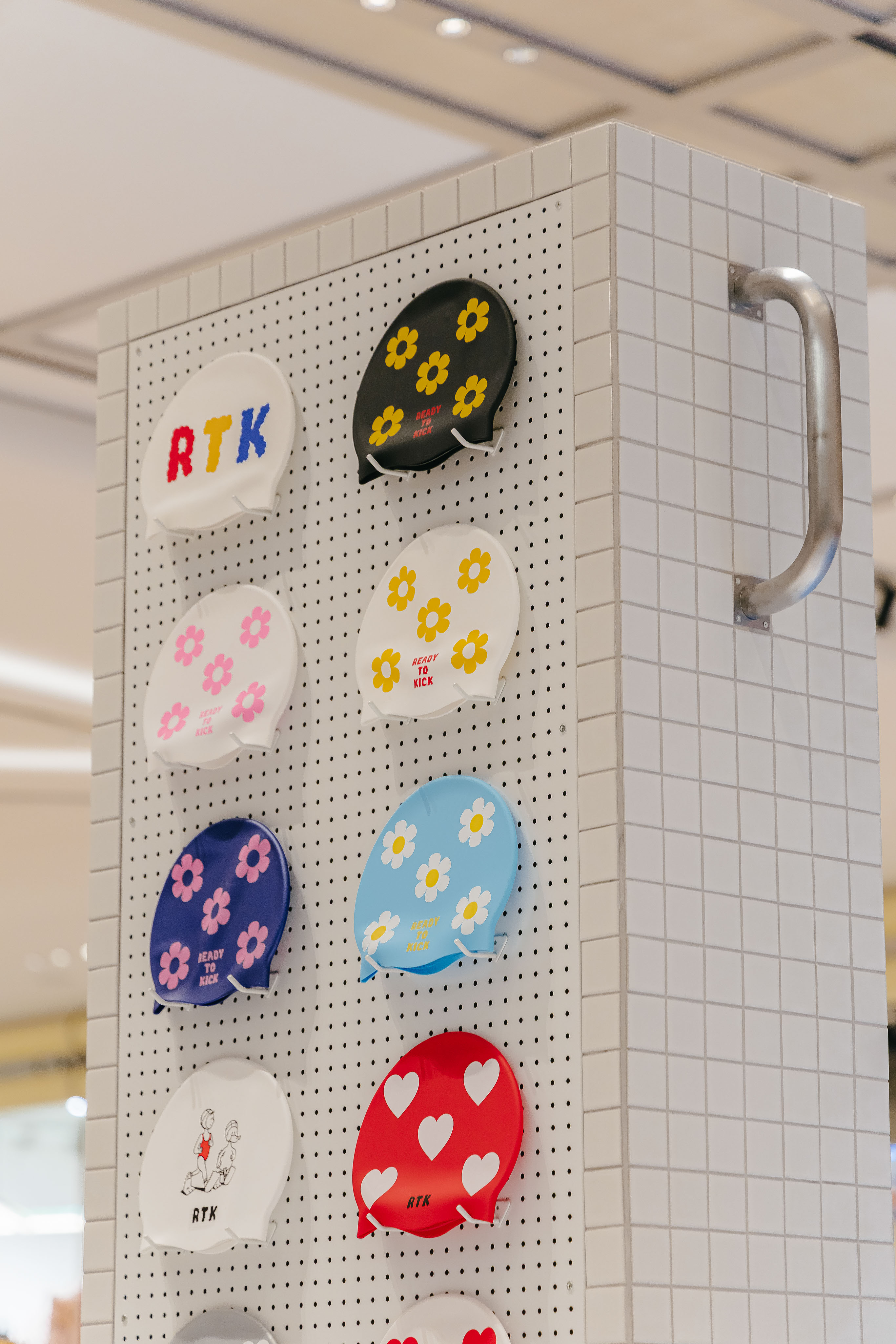 레디투킥의 핵심 아이템인 꽃 수모를 멋지게 보여주기 위해 늘 미소를 띄고 빙글빙글 팔을 돌리며 우리를 바라다봐 줄 것같은 햇님 행거, 그리고 수영장에서 모티브를 얻어 타일로 마감한 디스플레이 가구를 제작했다.