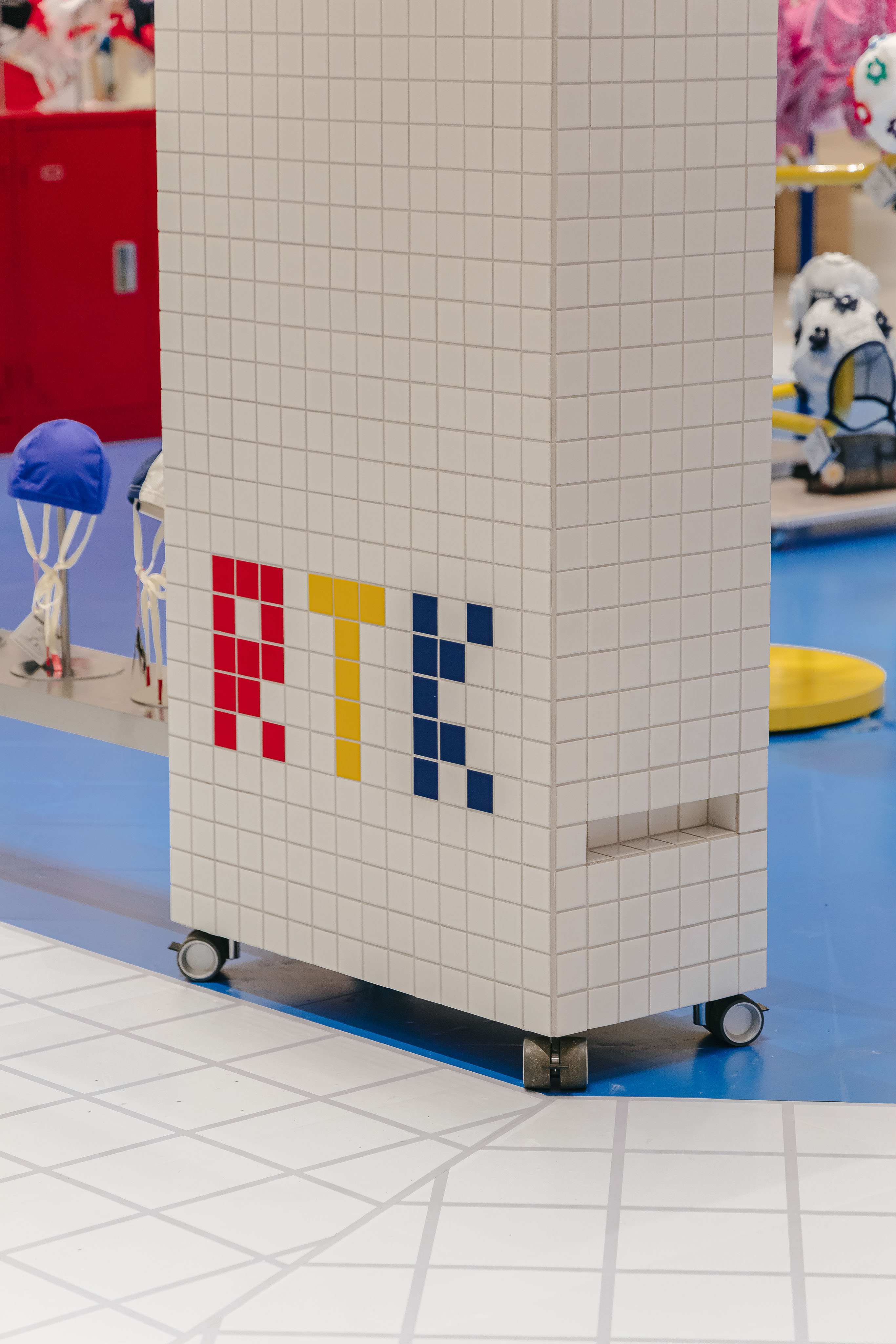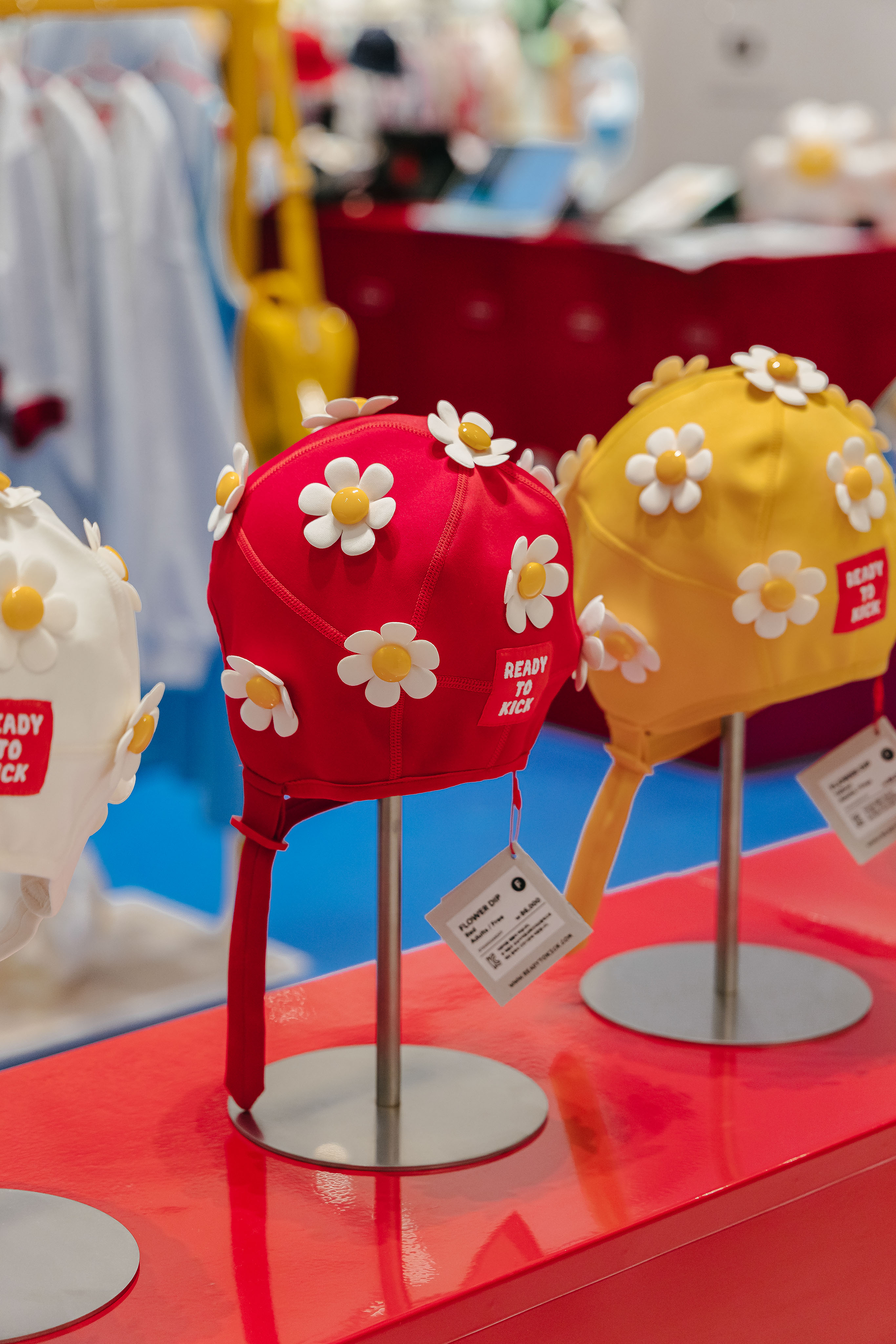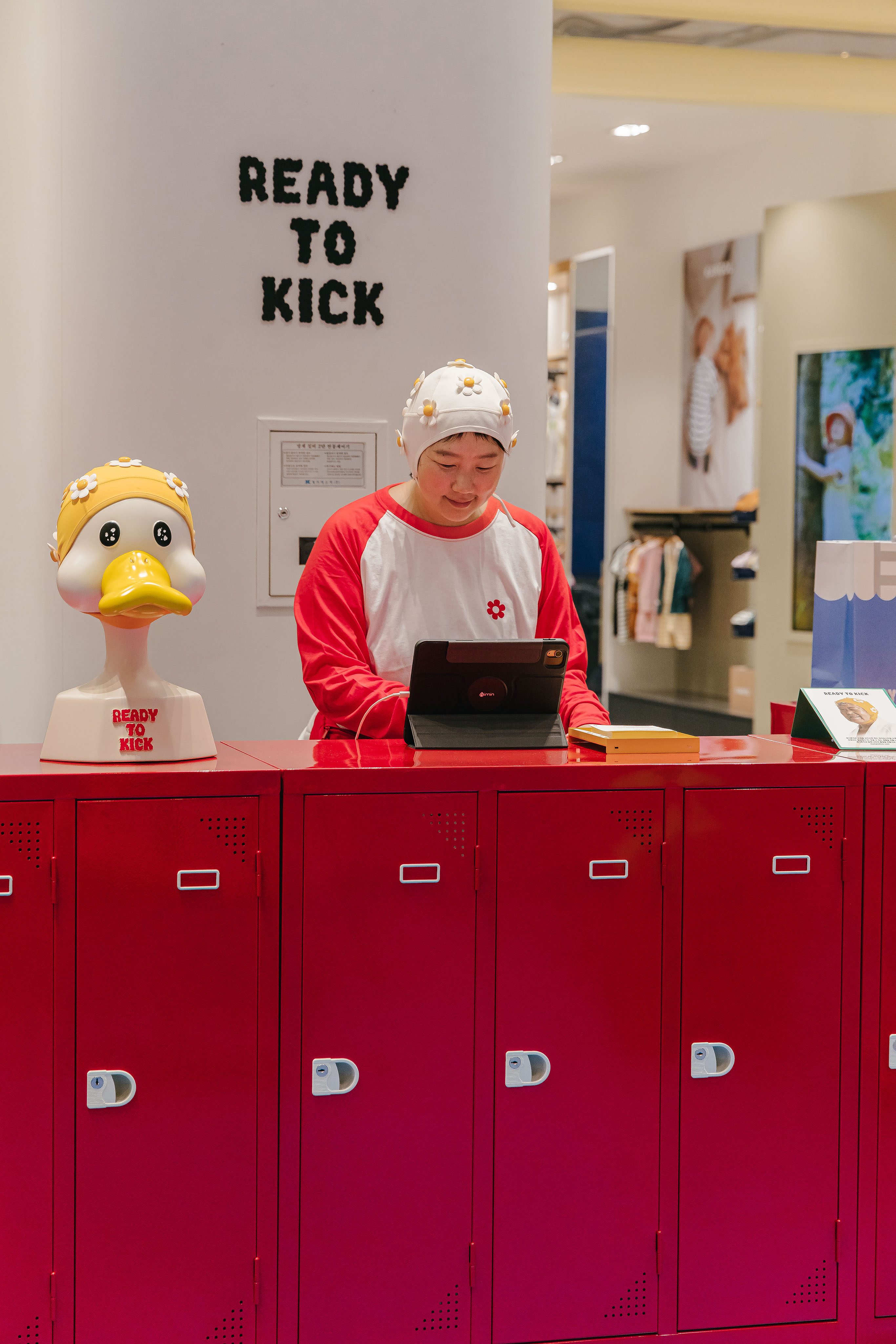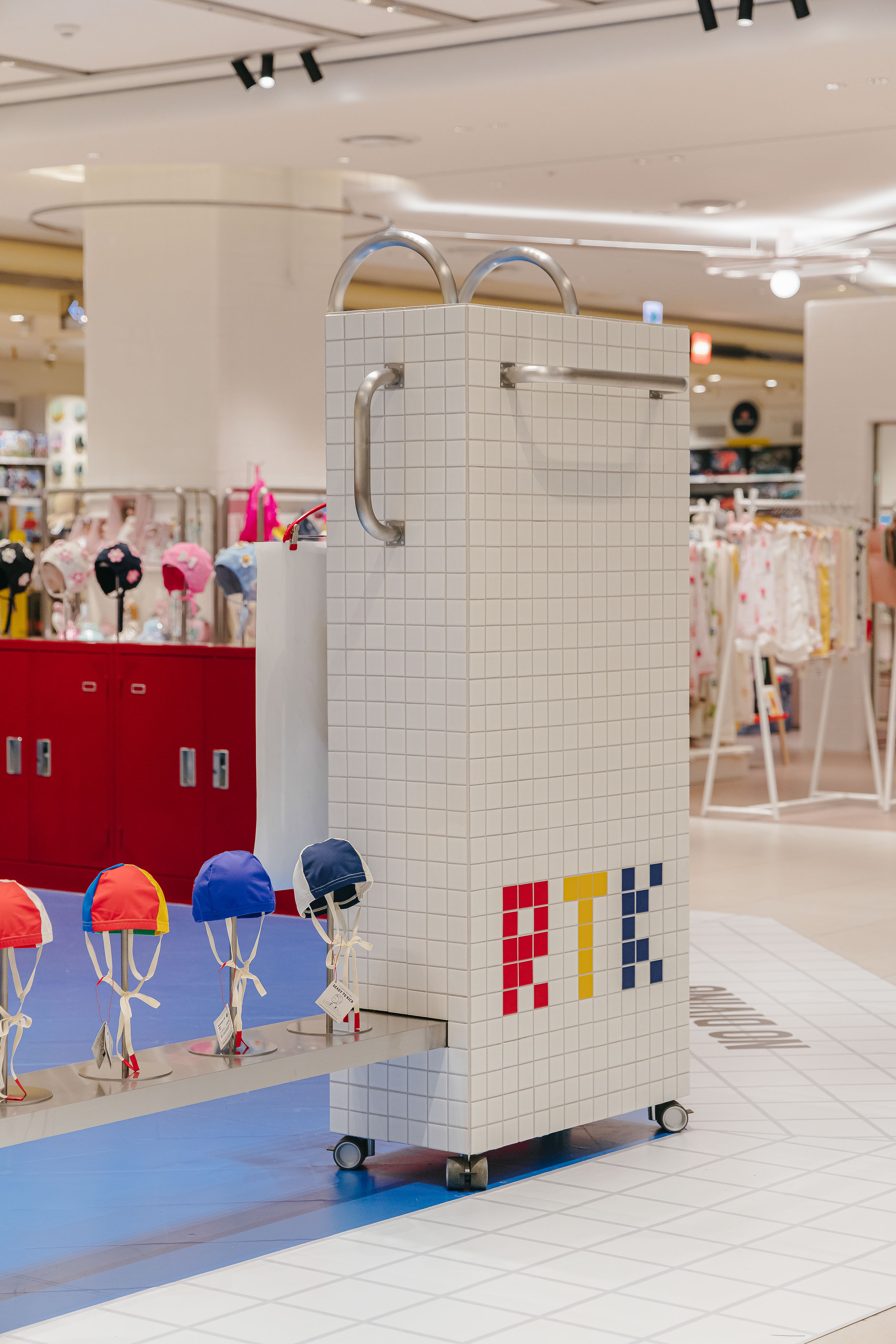 레디투킥의 핵심 아이템인 꽃 수모를 멋지게 보여주기 위해 늘 미소를 띄고 빙글빙글 팔을 돌리며 우리를 바라다봐 줄 것같은 햇님 행거, 그리고 수영장에서 모티브를 얻어 타일로 마감한 디스플레이 가구를 제작했다.