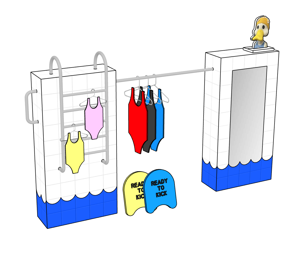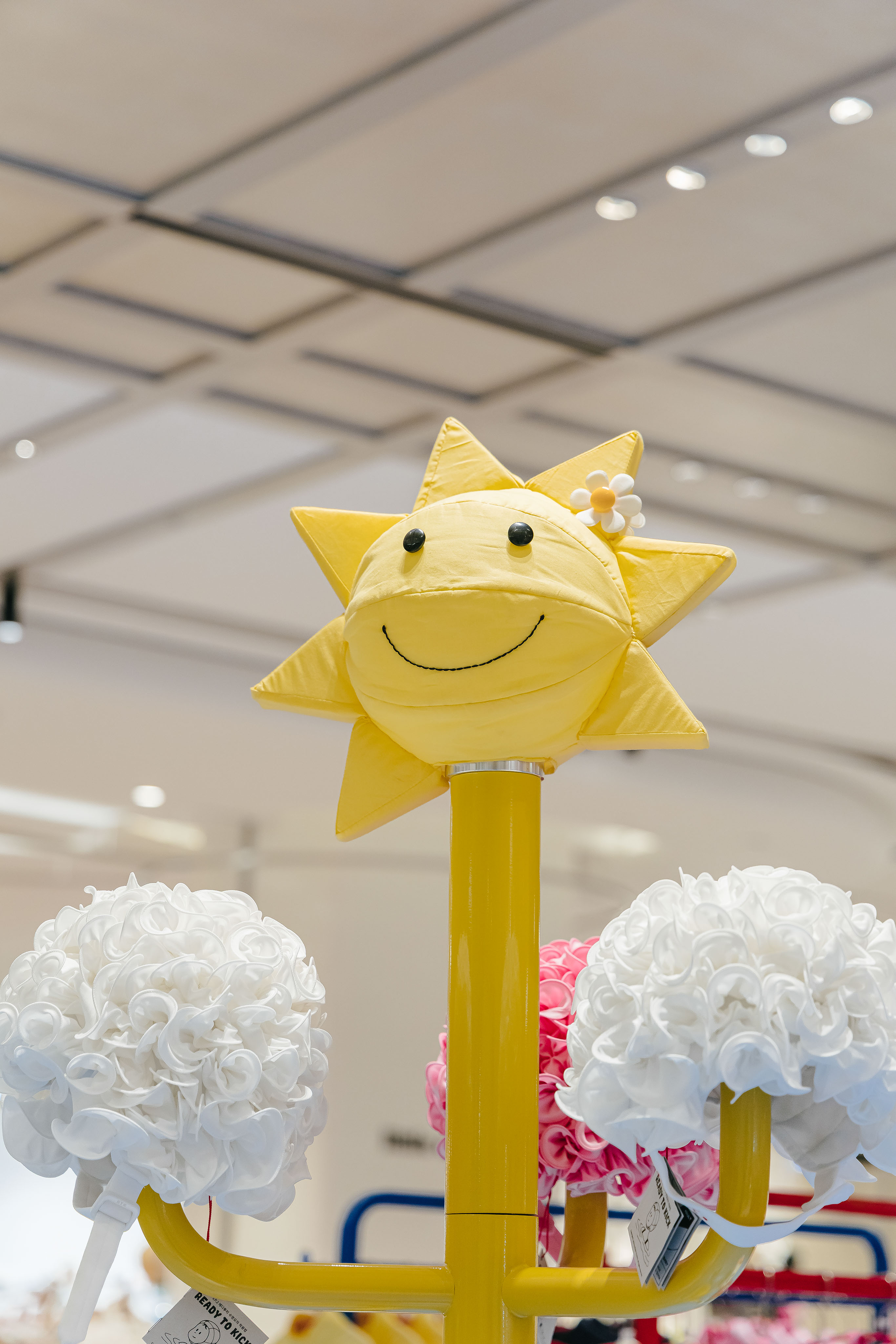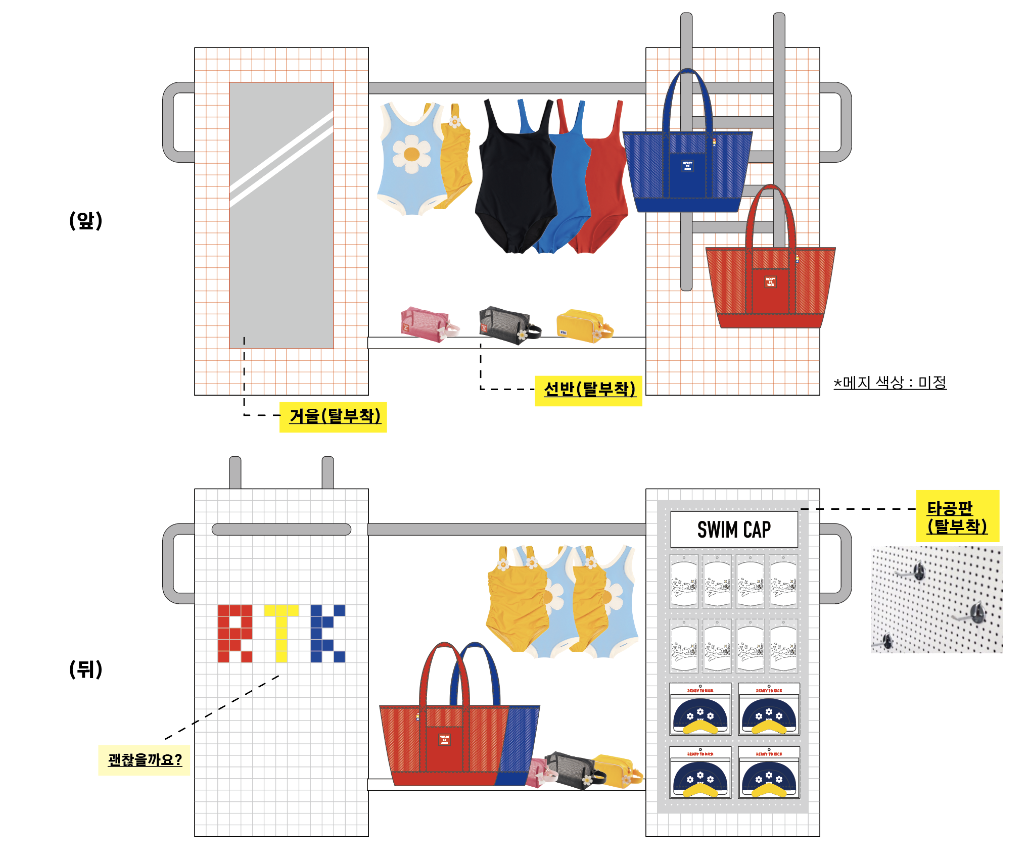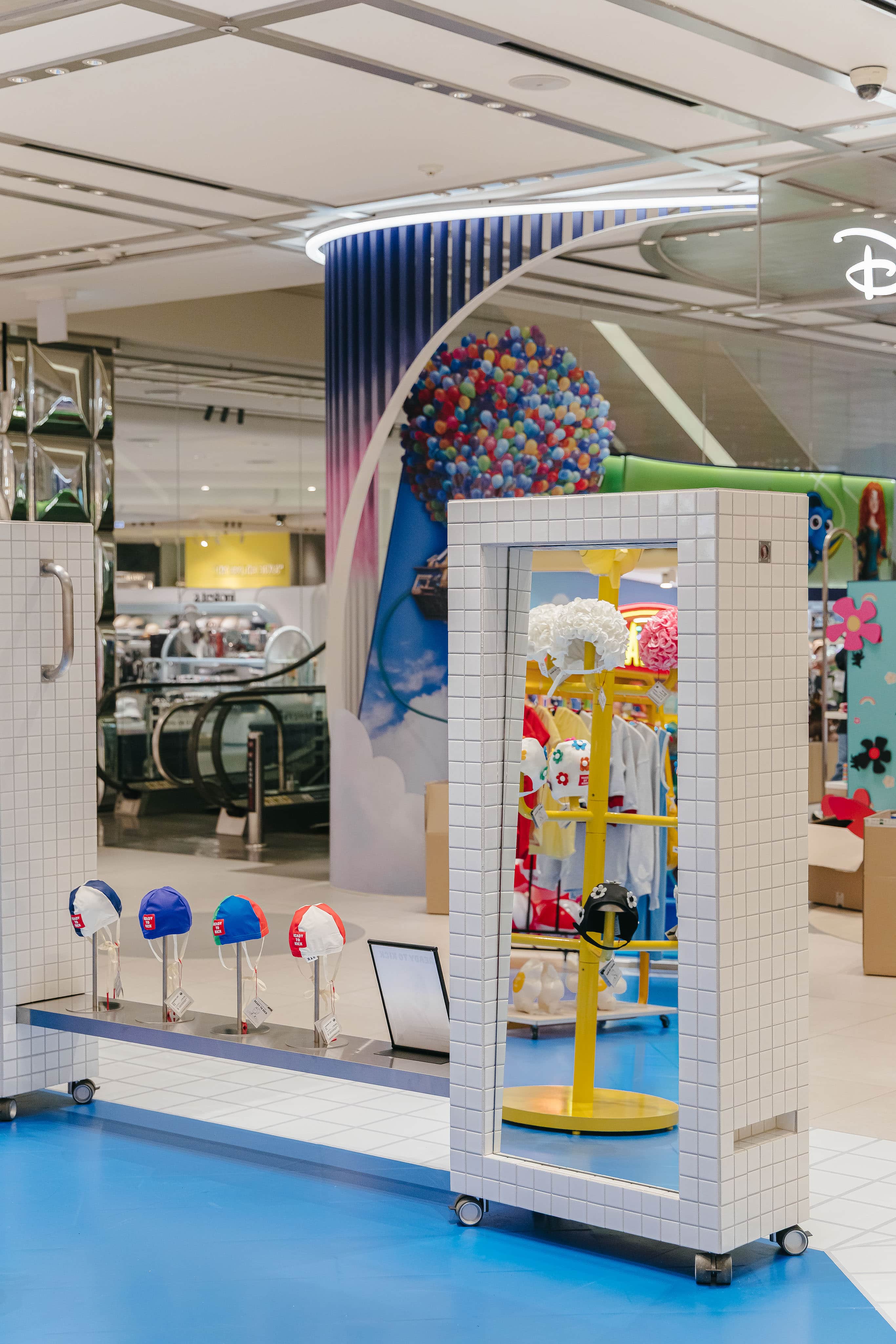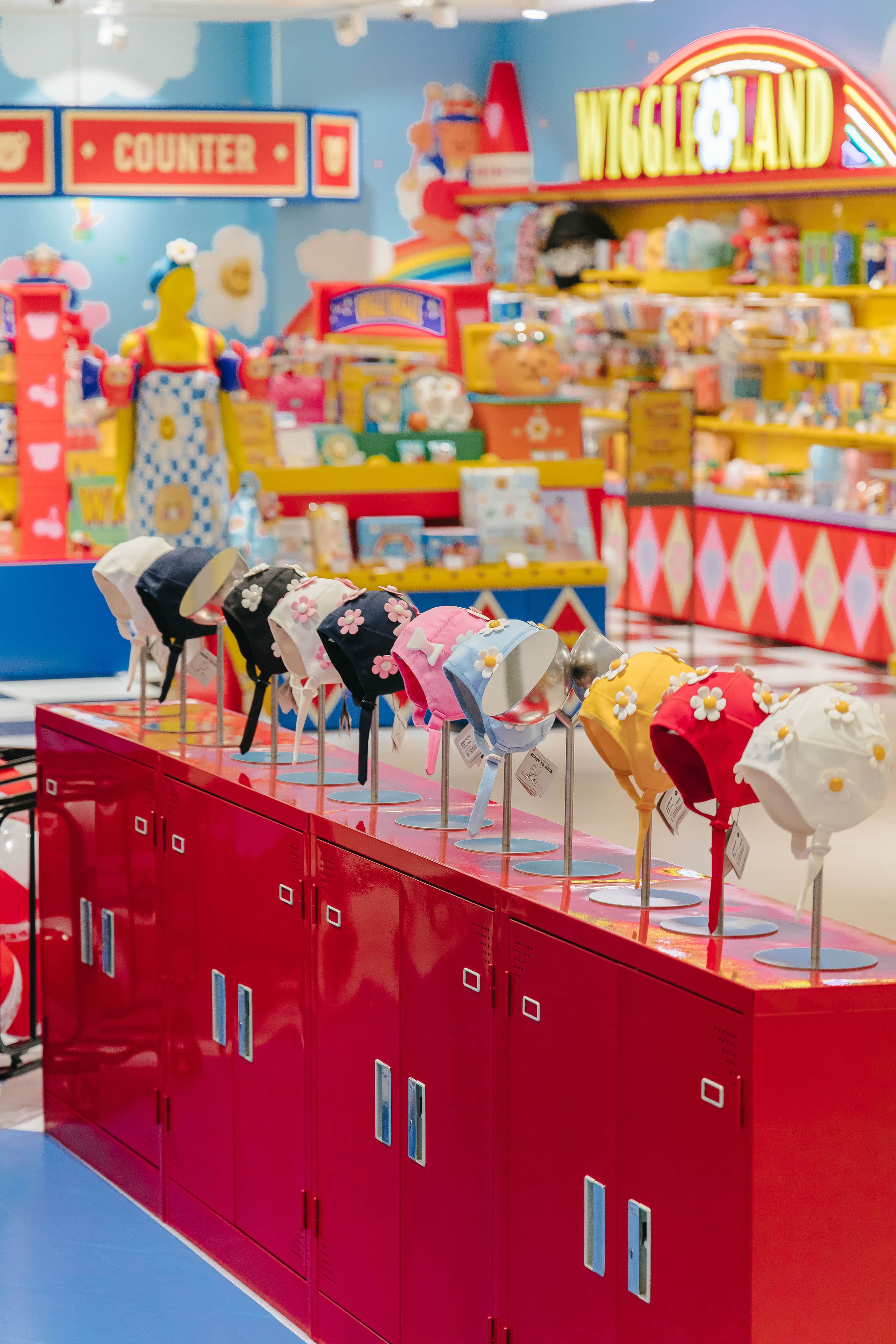 레디투킥의 핵심 아이템인 꽃 수모를 멋지게 보여주기 위해 늘 미소를 띄고 빙글빙글 팔을 돌리며 우리를 바라다봐 줄 것같은 햇님 행거, 그리고 수영장에서 모티브를 얻어 타일로 마감한 디스플레이 가구를 제작했다.