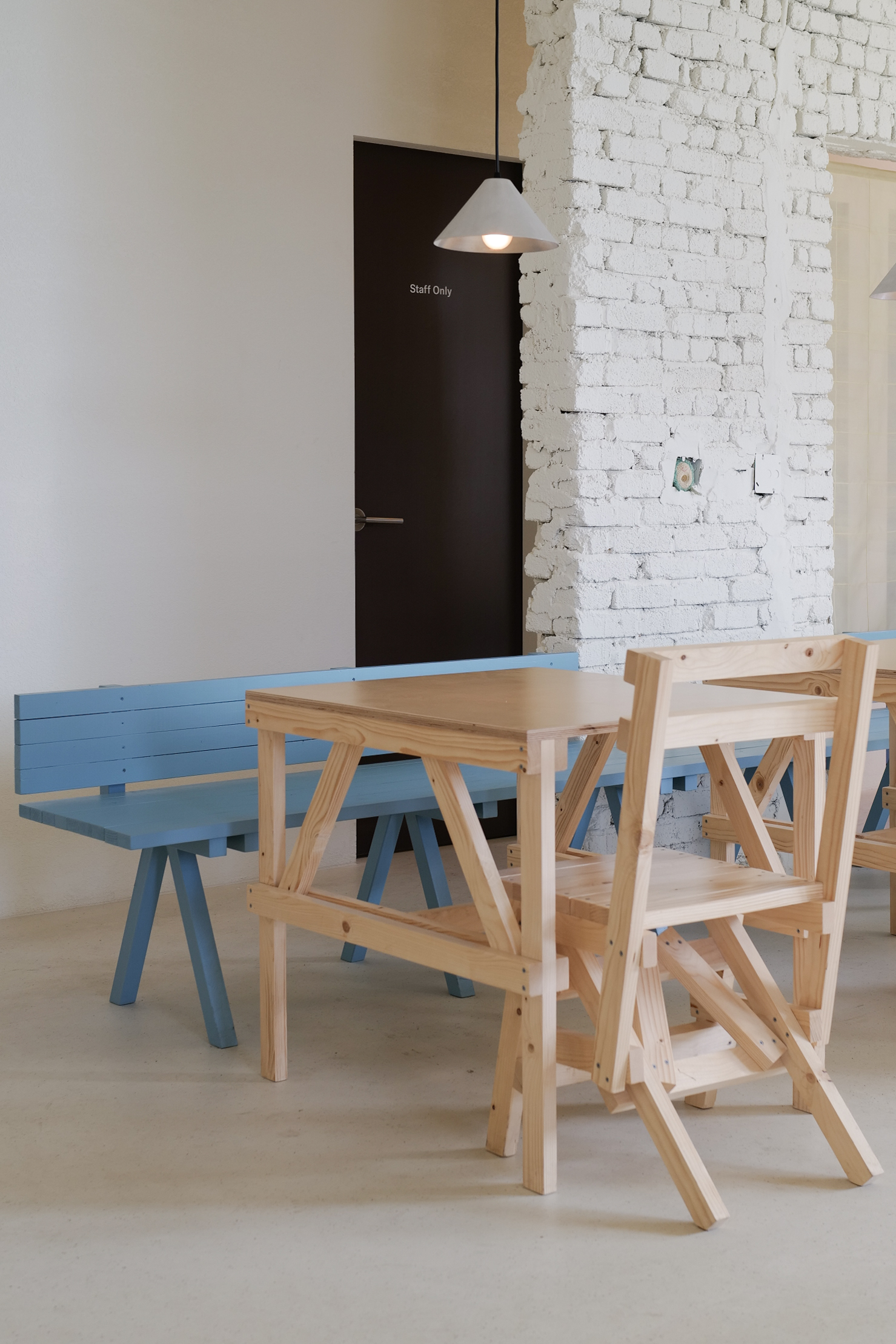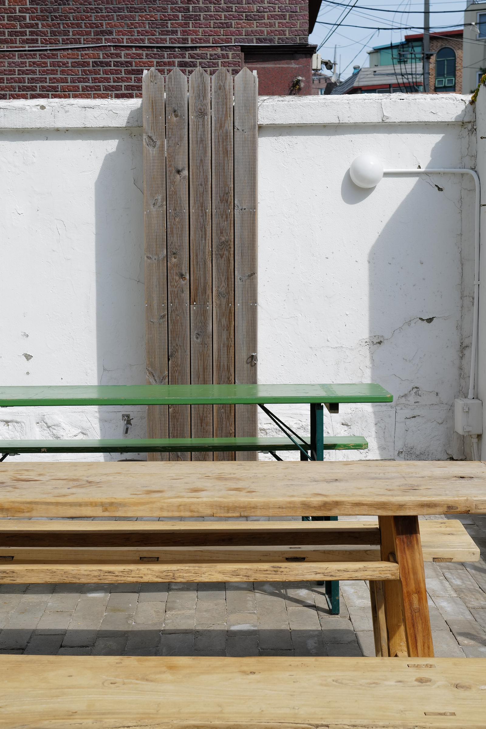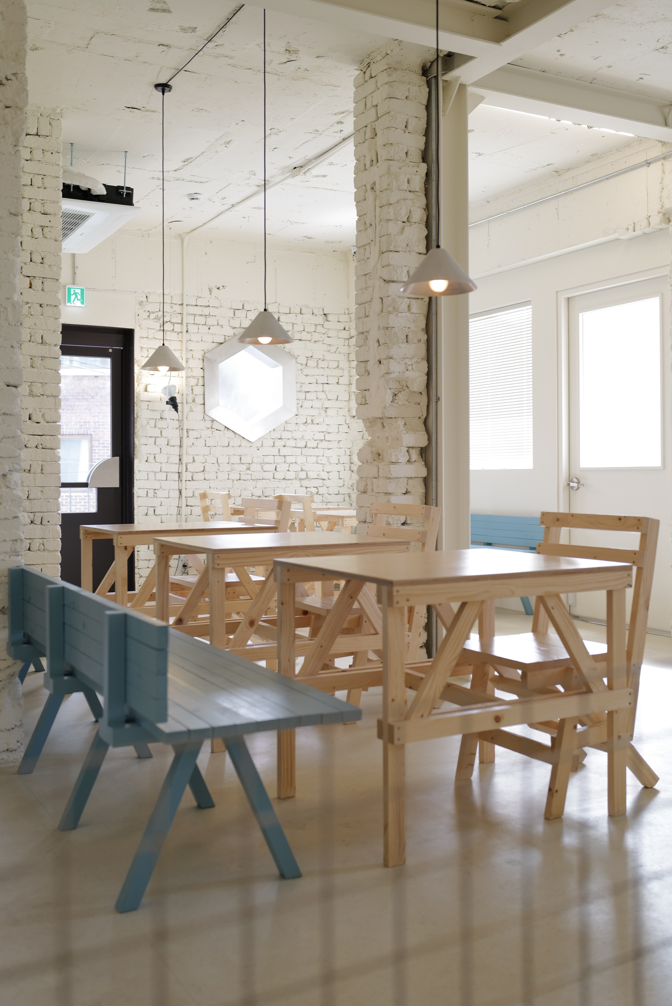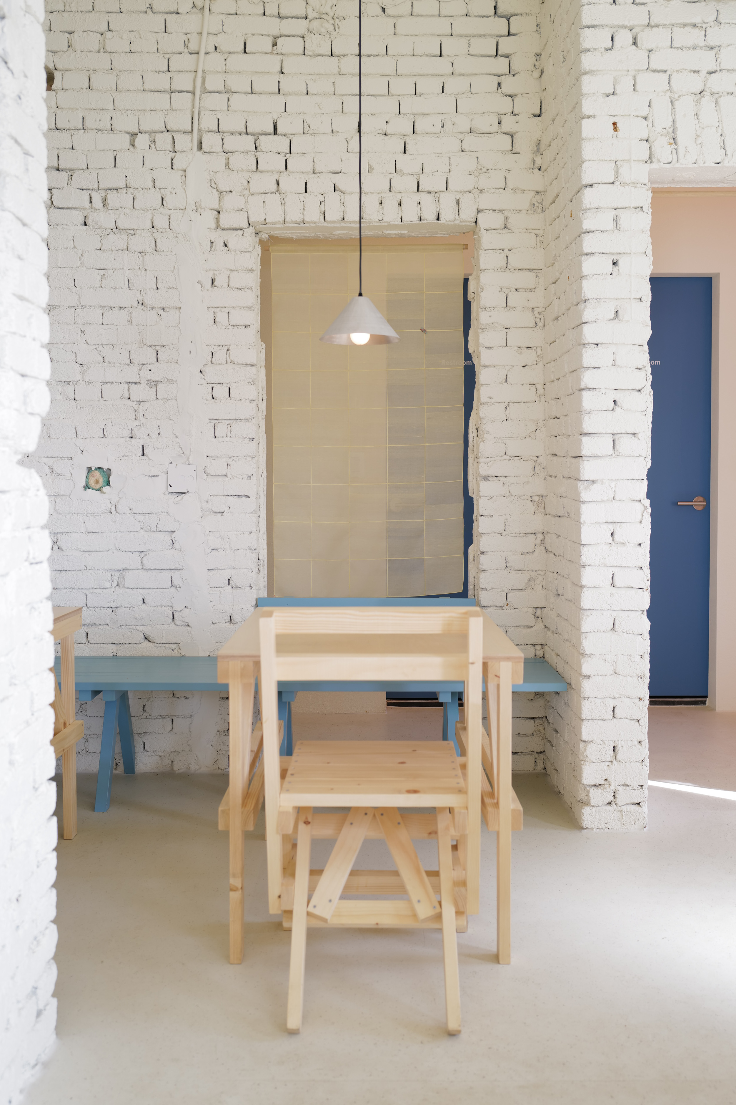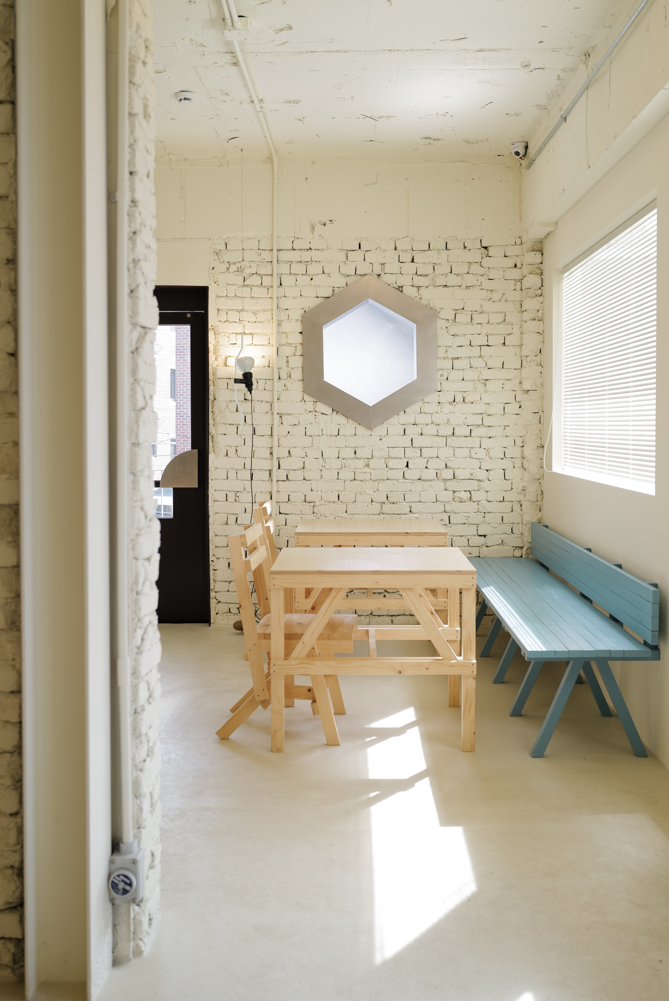 하얀색벽과 오래된 고재나무를 활용한 기존의 매장의 분위기를 사랑하는 손님들이 많았기에 1층은 첫 매장에서 직접 만든 큰 테이블을 그대로 유지하고 짙은 다홍색과 , 레몬색 밝은 색감과 자작나무 가구, 하늘색 바닥 컬러를 추가해 낯설지 않게 경쾌한 느낌을 더했다.