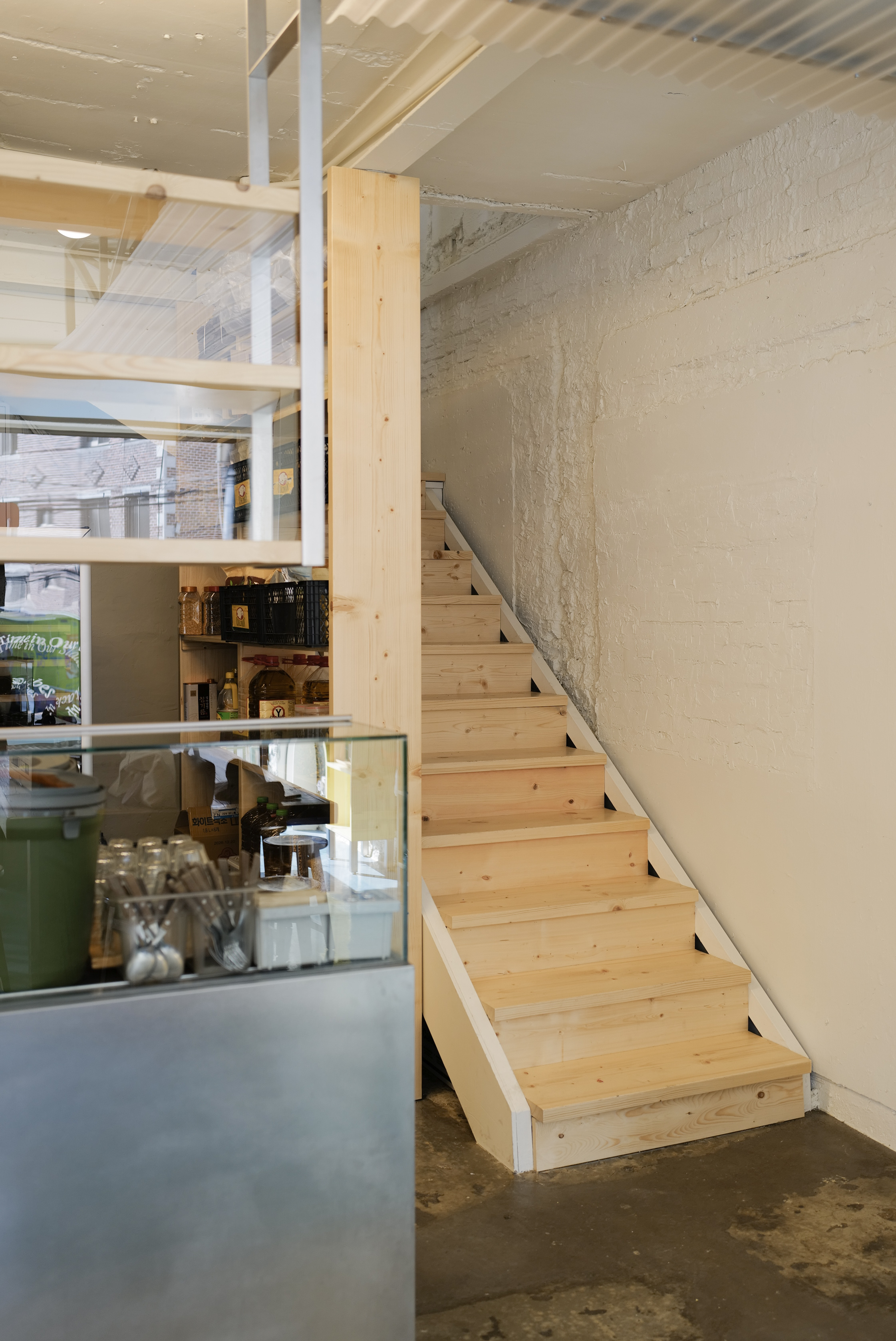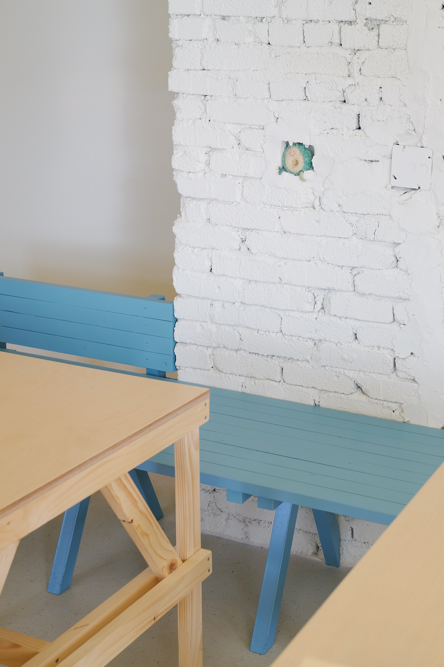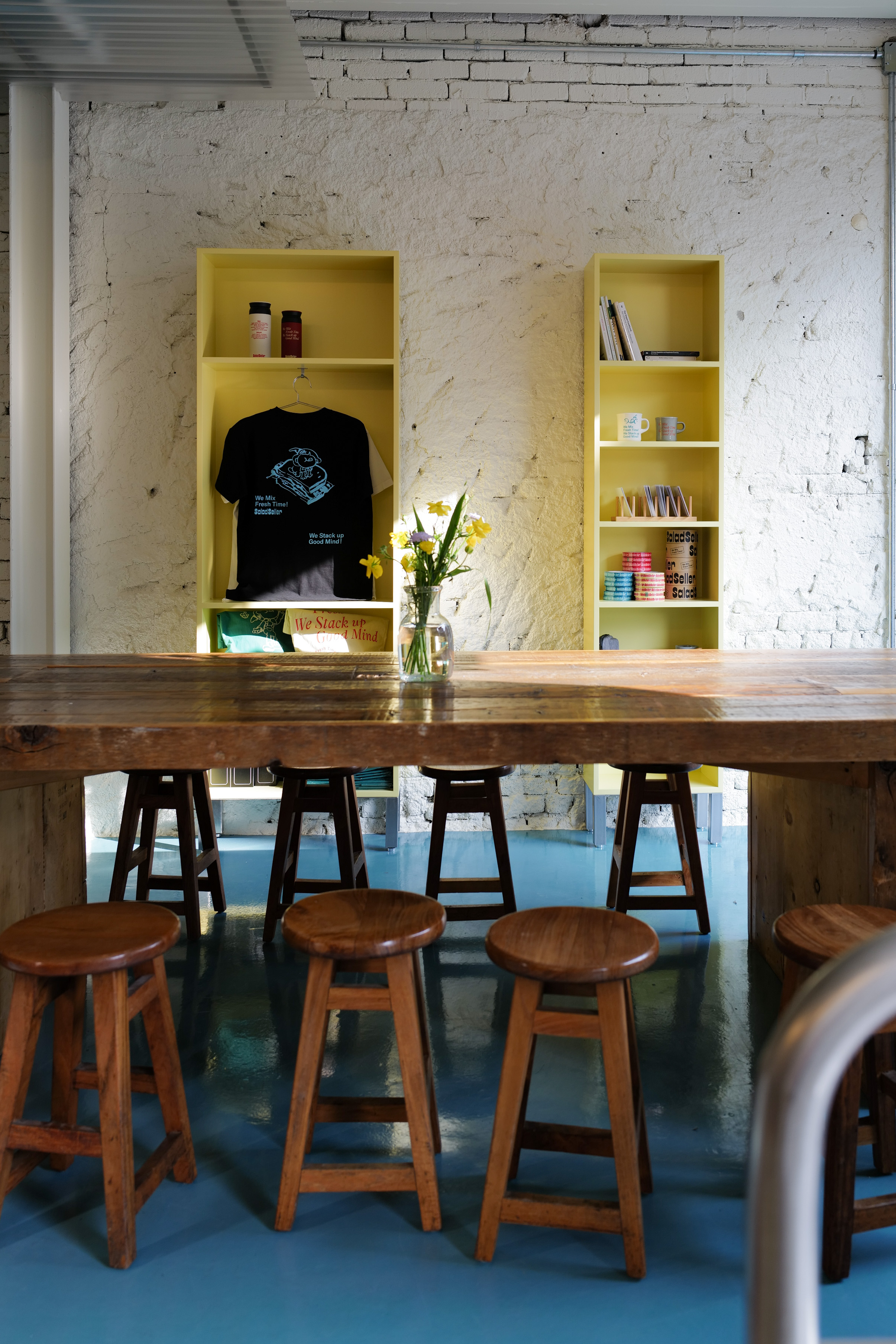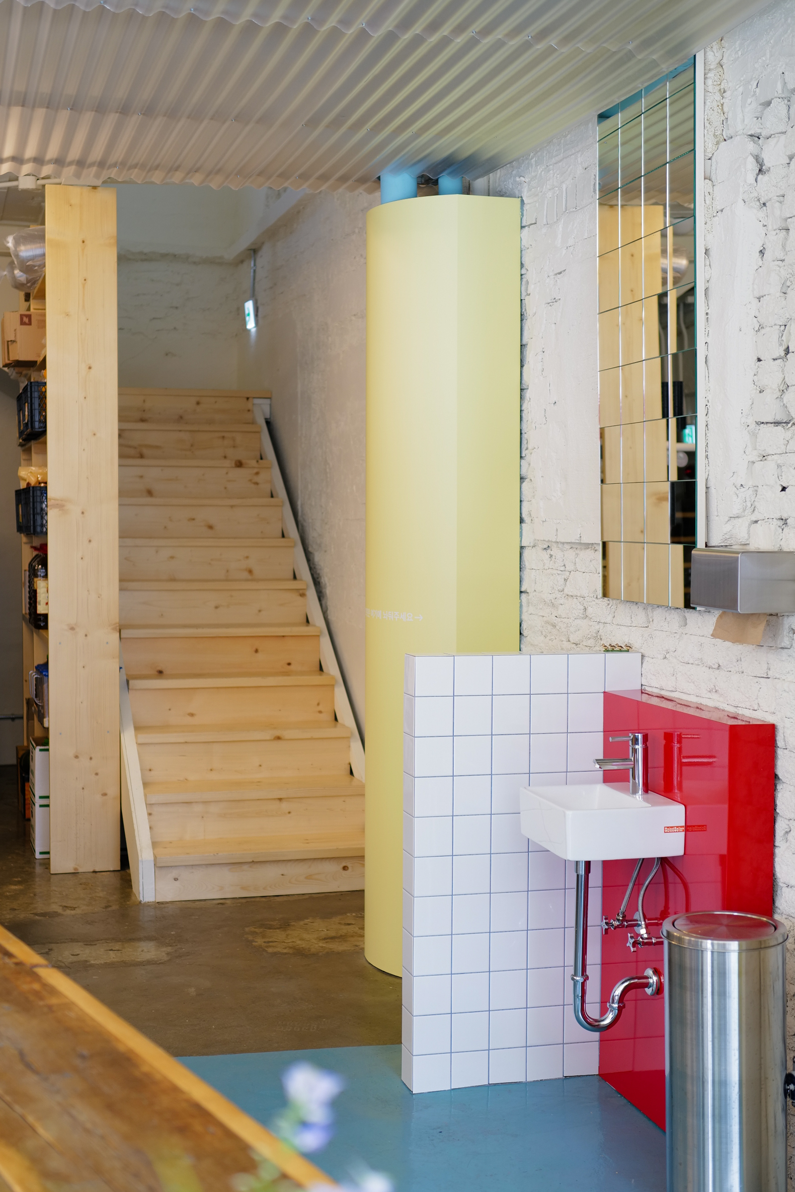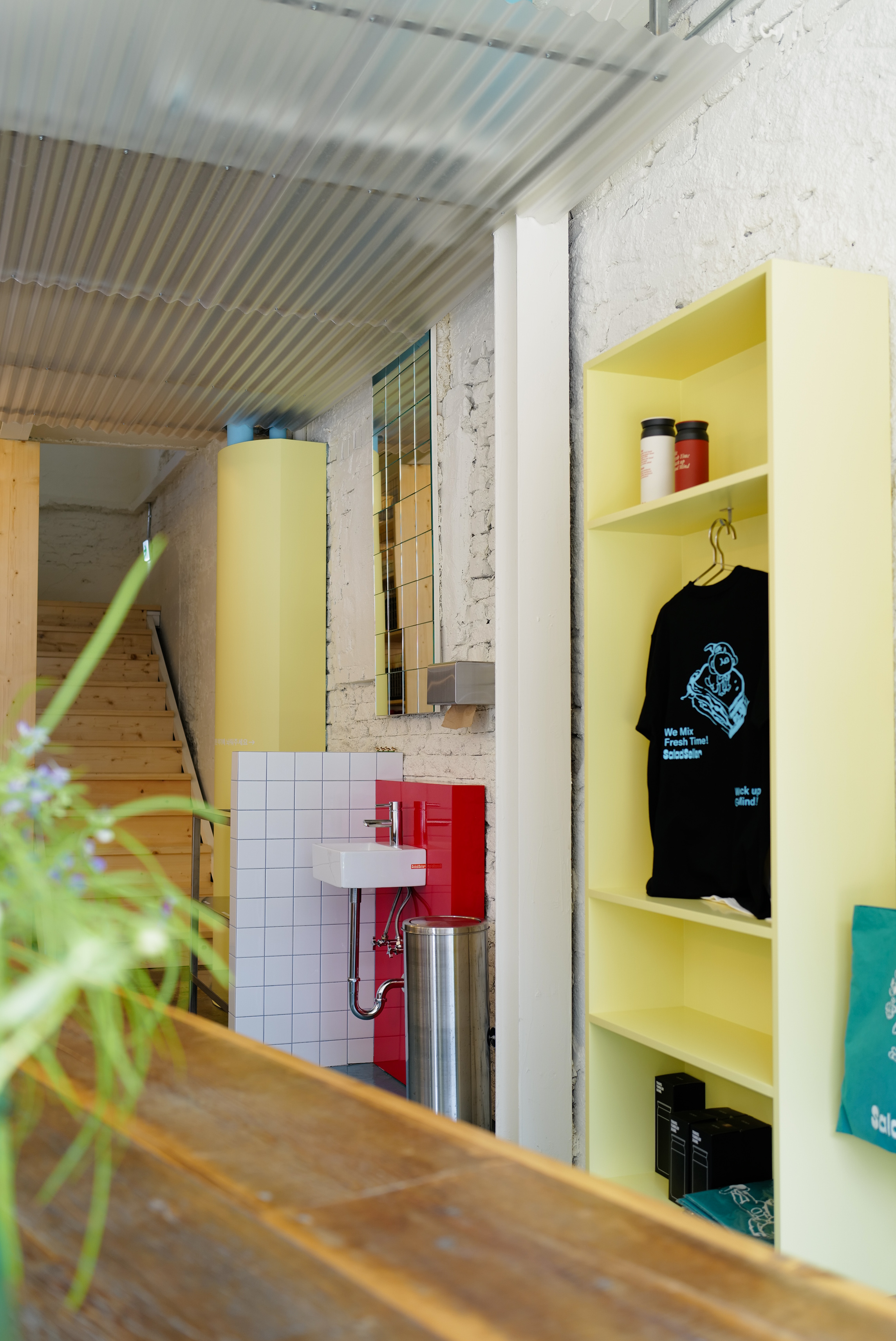 하얀색벽과 오래된 고재나무를 활용한 기존의 매장의 분위기를 사랑하는 손님들이 많았기에 1층은 첫 매장에서 직접 만든 큰 테이블을 그대로 유지하고 짙은 다홍색과 , 레몬색 밝은 색감과 자작나무 가구, 하늘색 바닥 컬러를 추가해 낯설지 않게 경쾌한 느낌을 더했다.