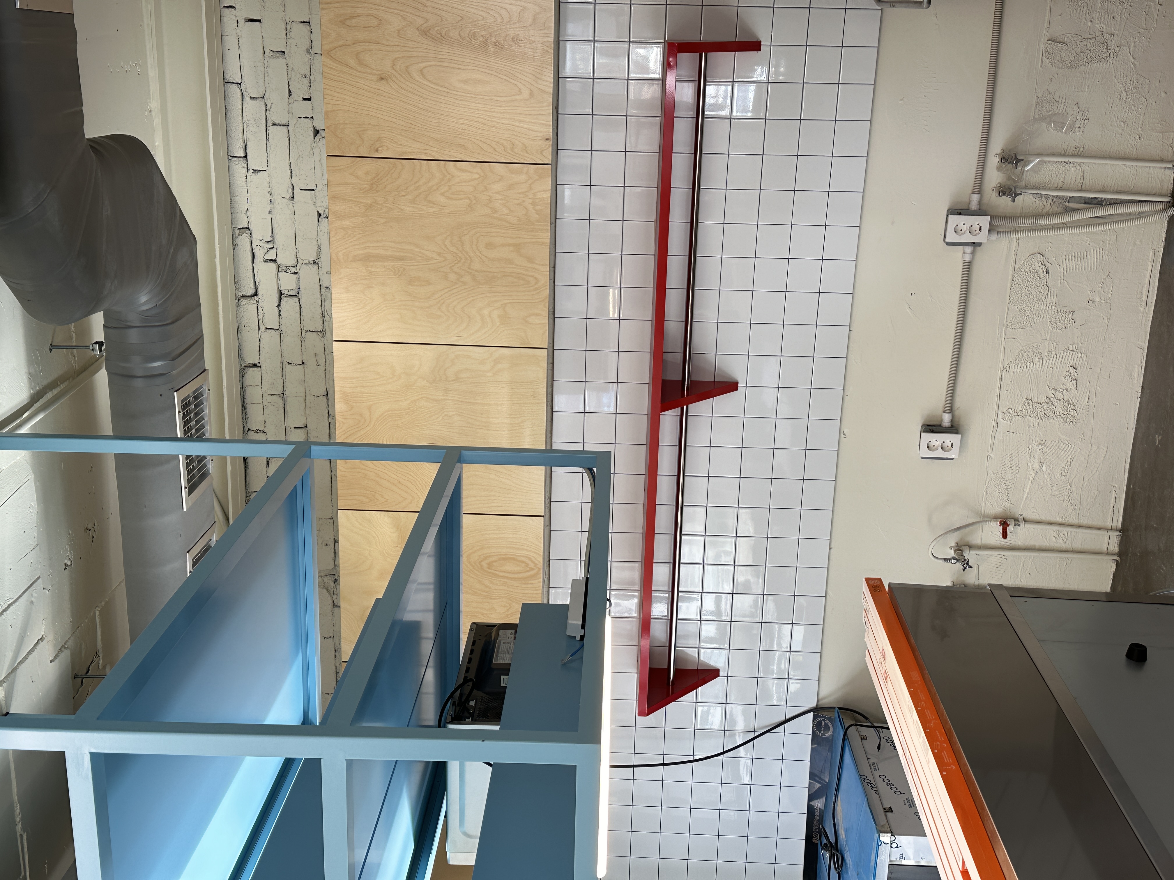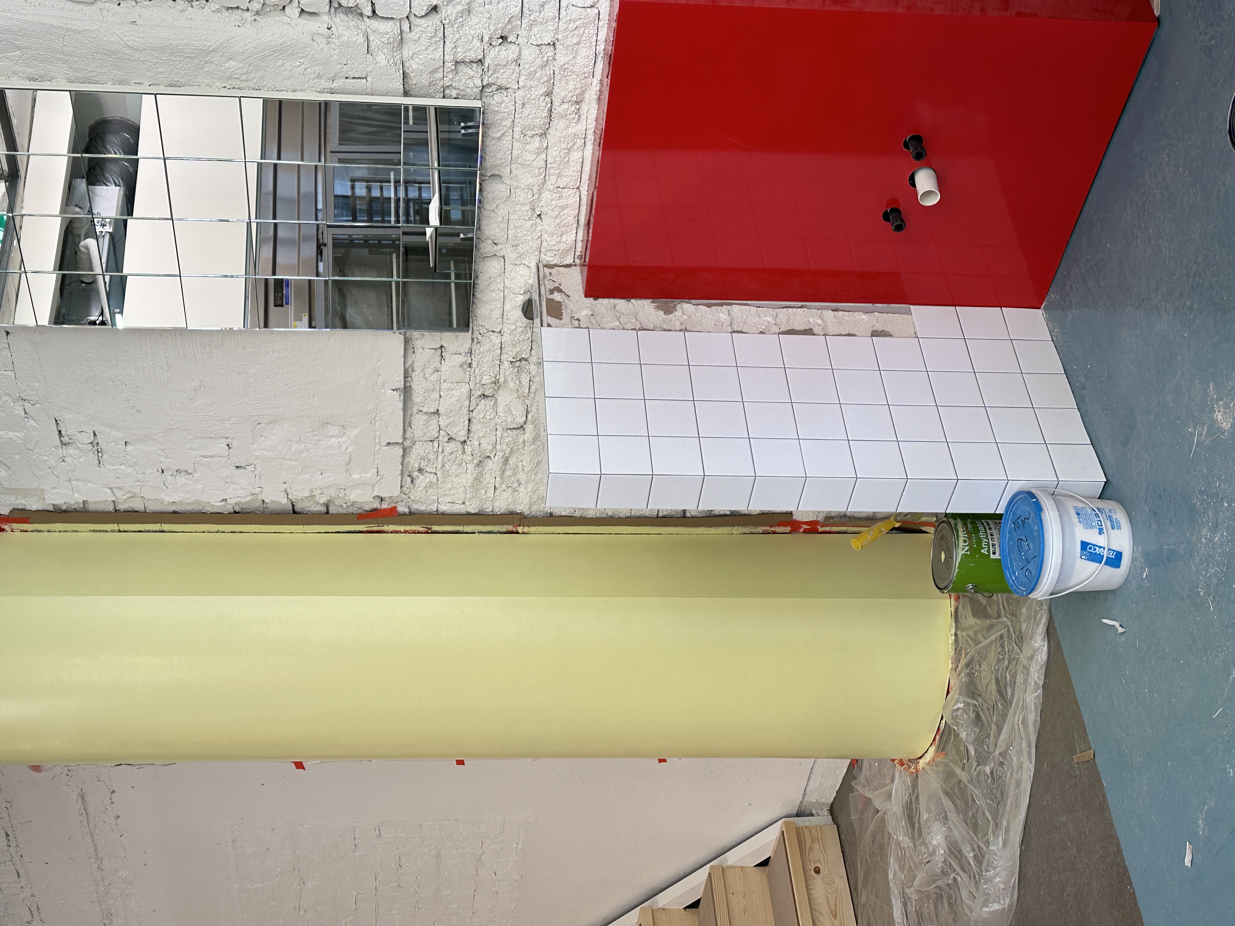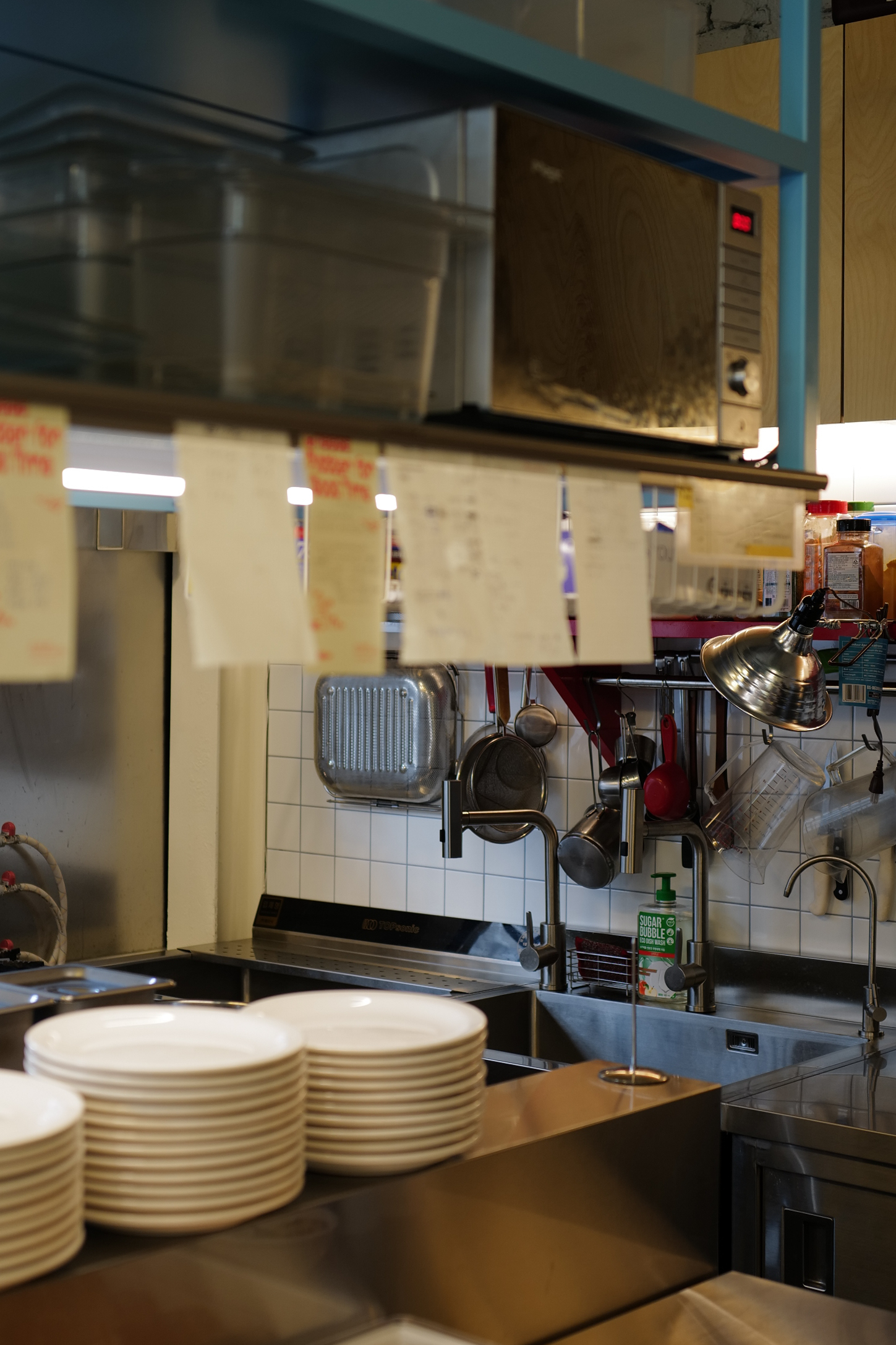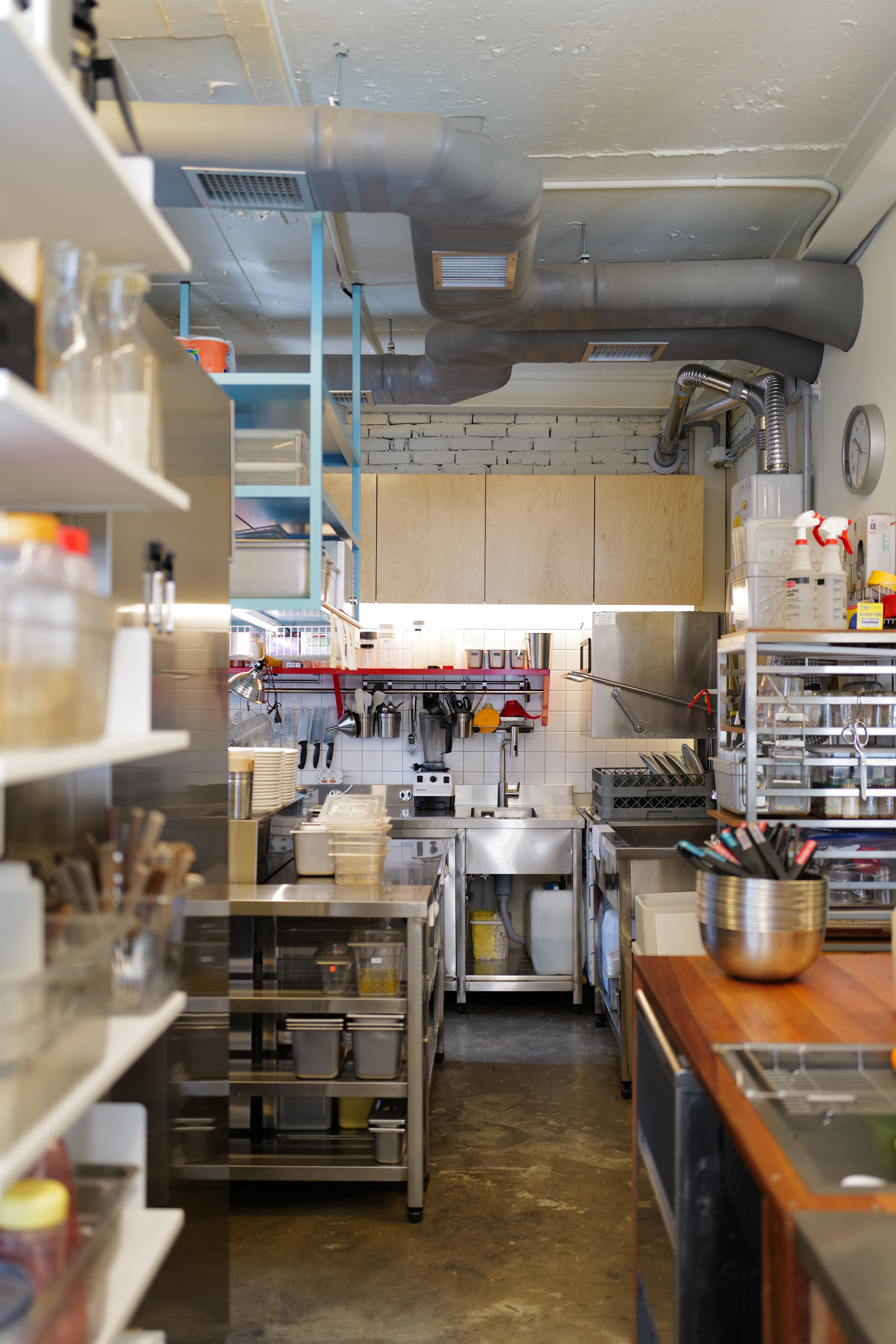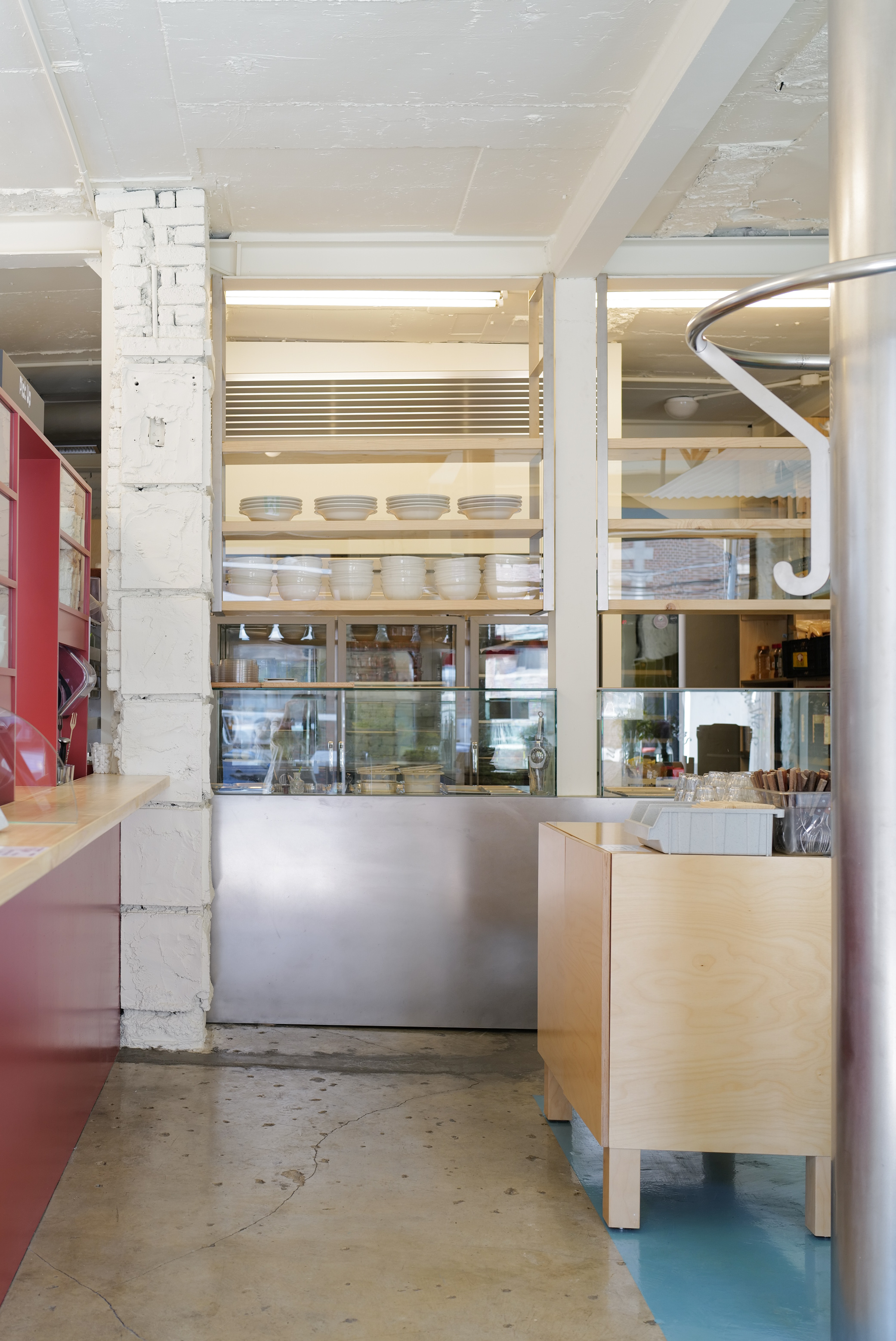 하얀색벽과 오래된 고재나무를 활용한 기존의 매장의 분위기를 사랑하는 손님들이 많았기에 1층은 첫 매장에서 직접 만든 큰 테이블을 그대로 유지하고 짙은 다홍색과 , 레몬색 밝은 색감과 자작나무 가구, 하늘색 바닥 컬러를 추가해 낯설지 않게 경쾌한 느낌을 더했다.