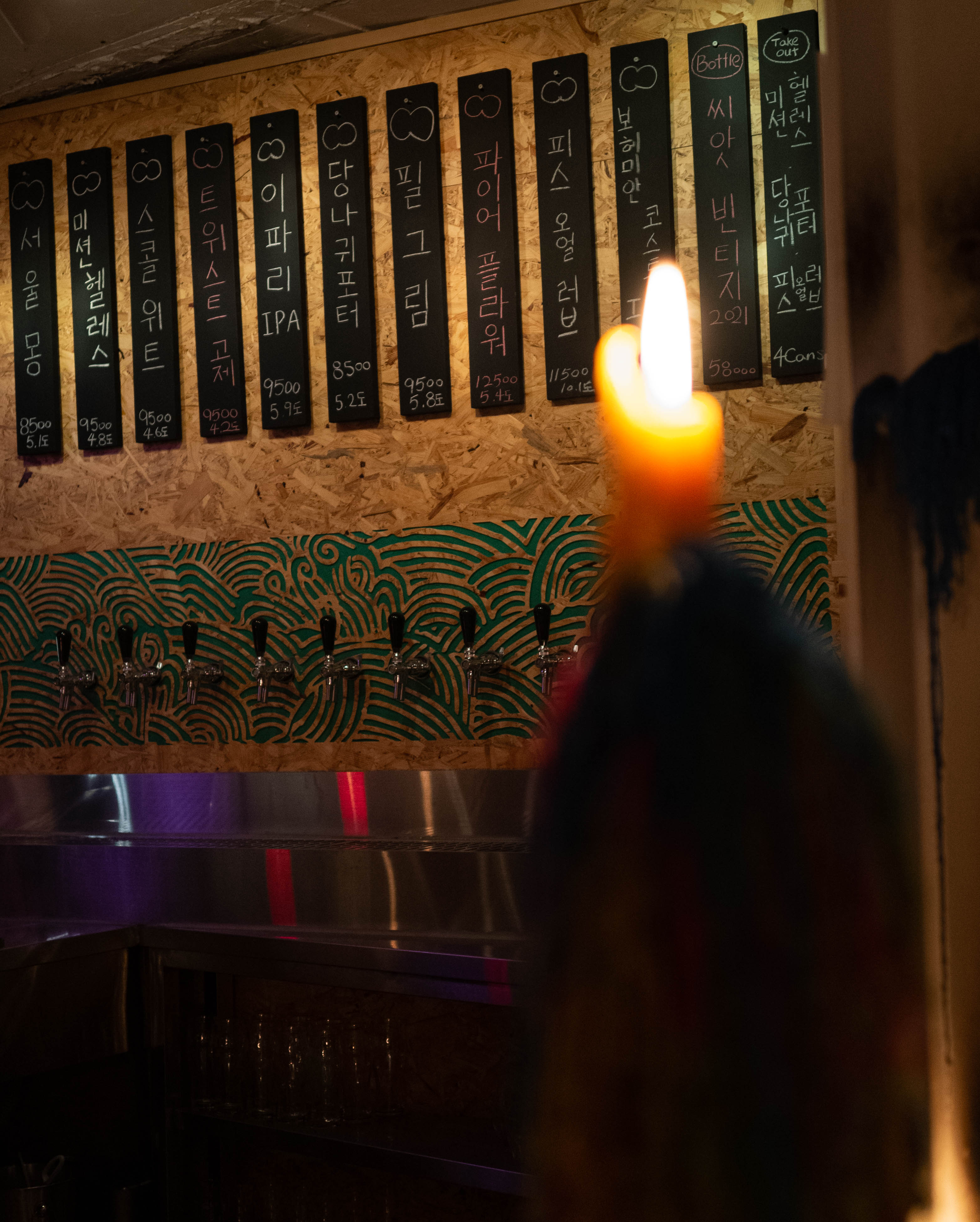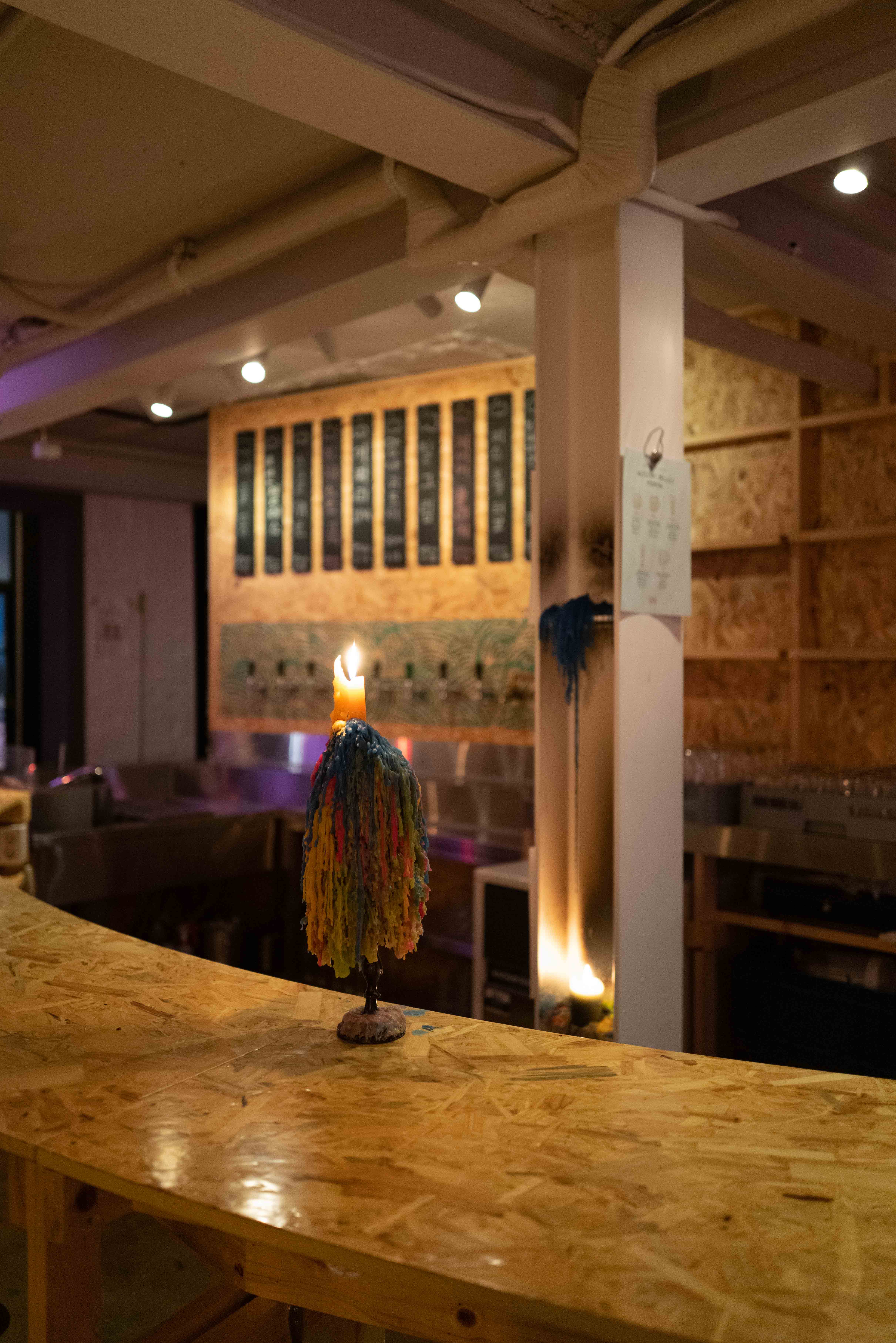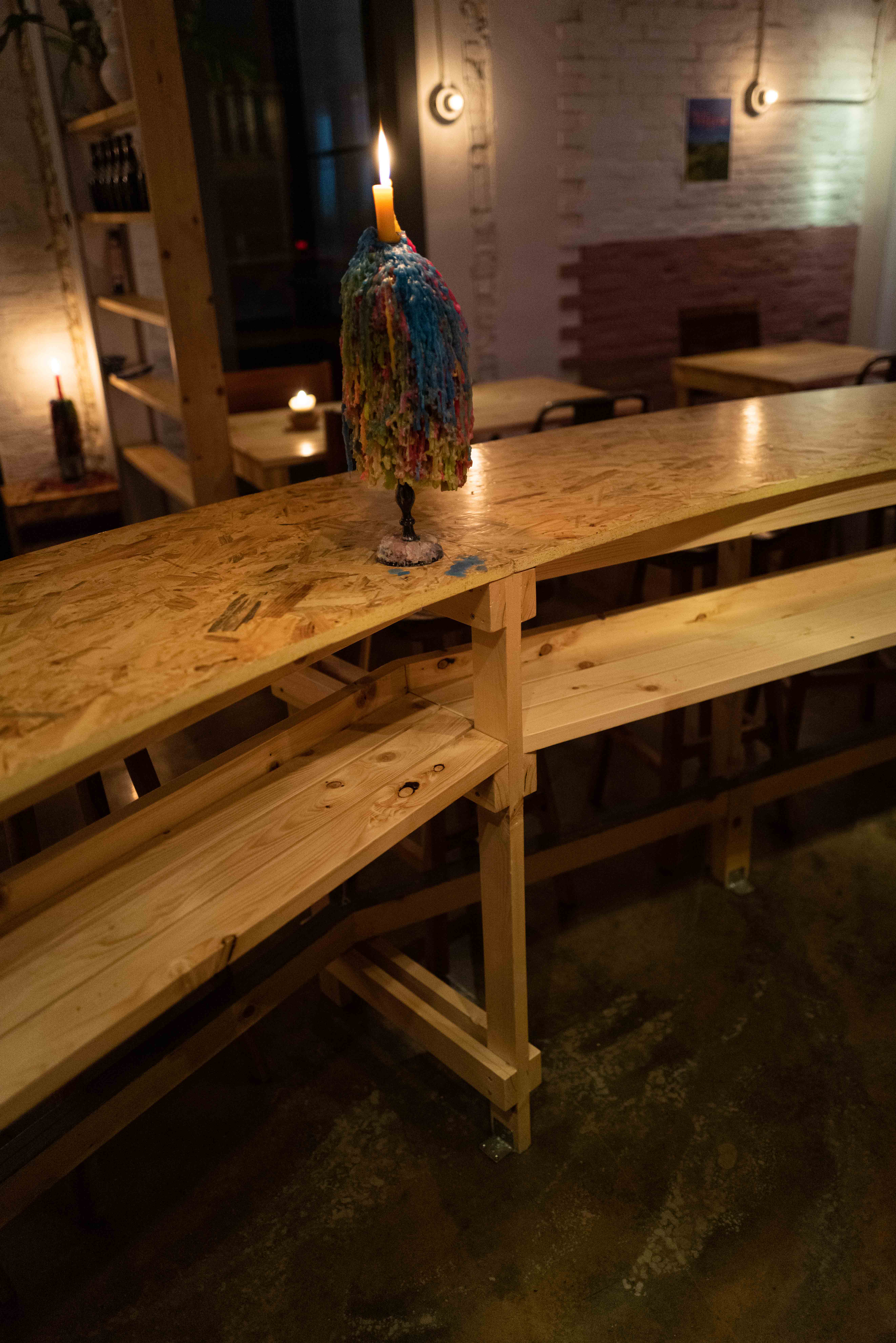 주인장이 남은 구조목을 툭툭 잘라 직접만든 나무 바와 가구에 어딘가 서툰느낌으로 귀여운 컬러가 칠해진 편안한 분위기의 가게 밤이되면 촛불로 불을 밝혀 더욱 신나게 술 마실 수 있는 그런 곳으로 만들어야겠다..!