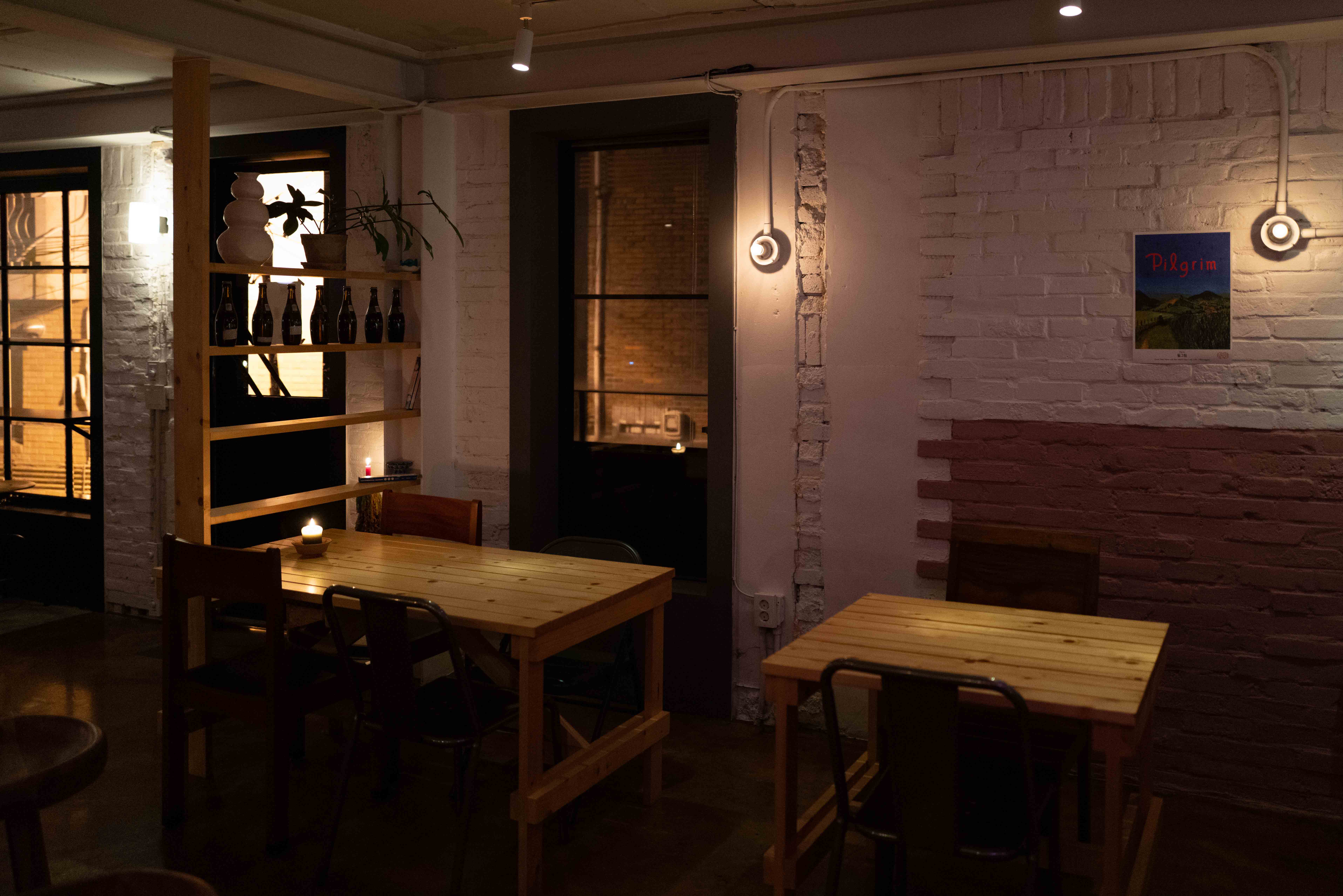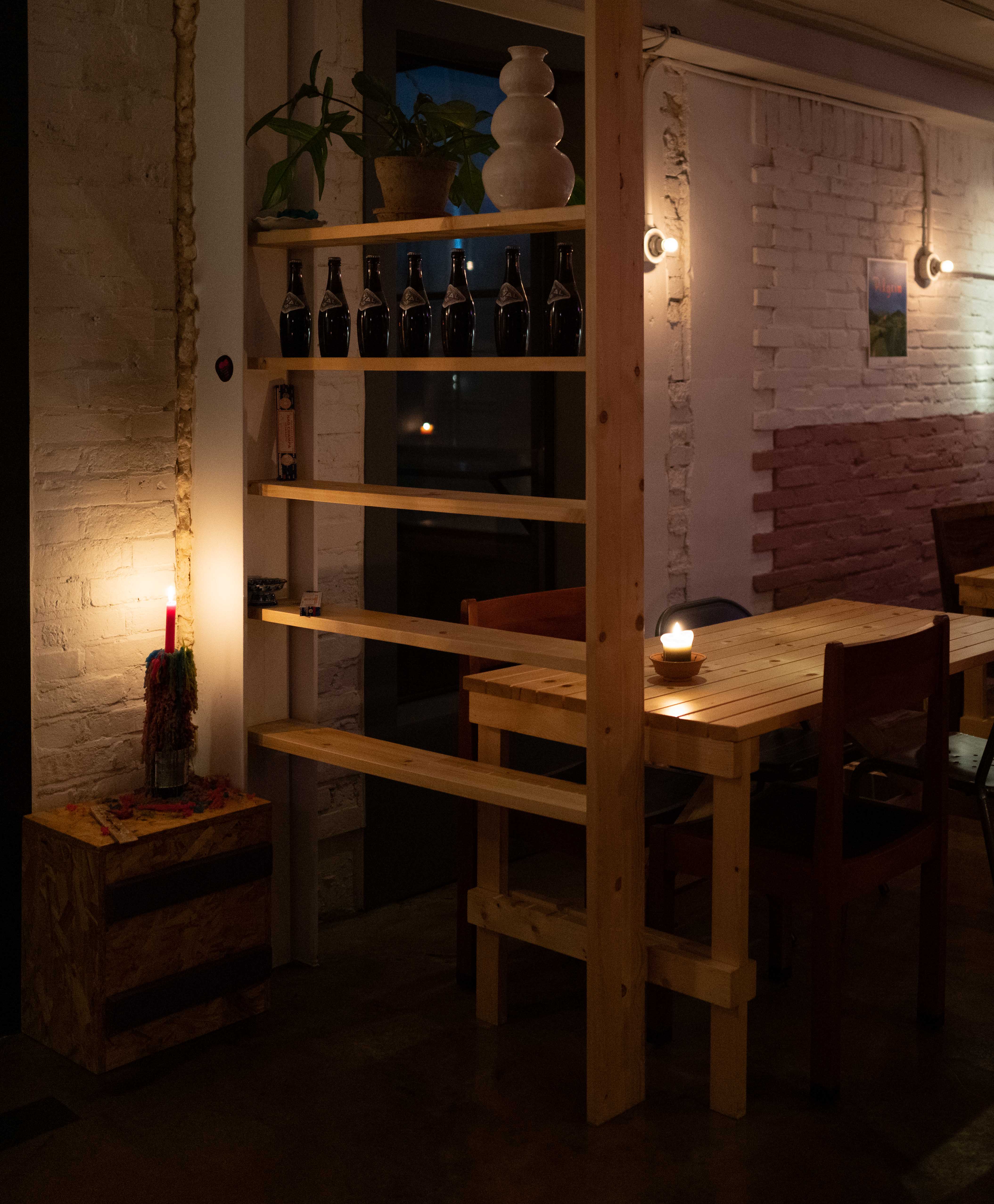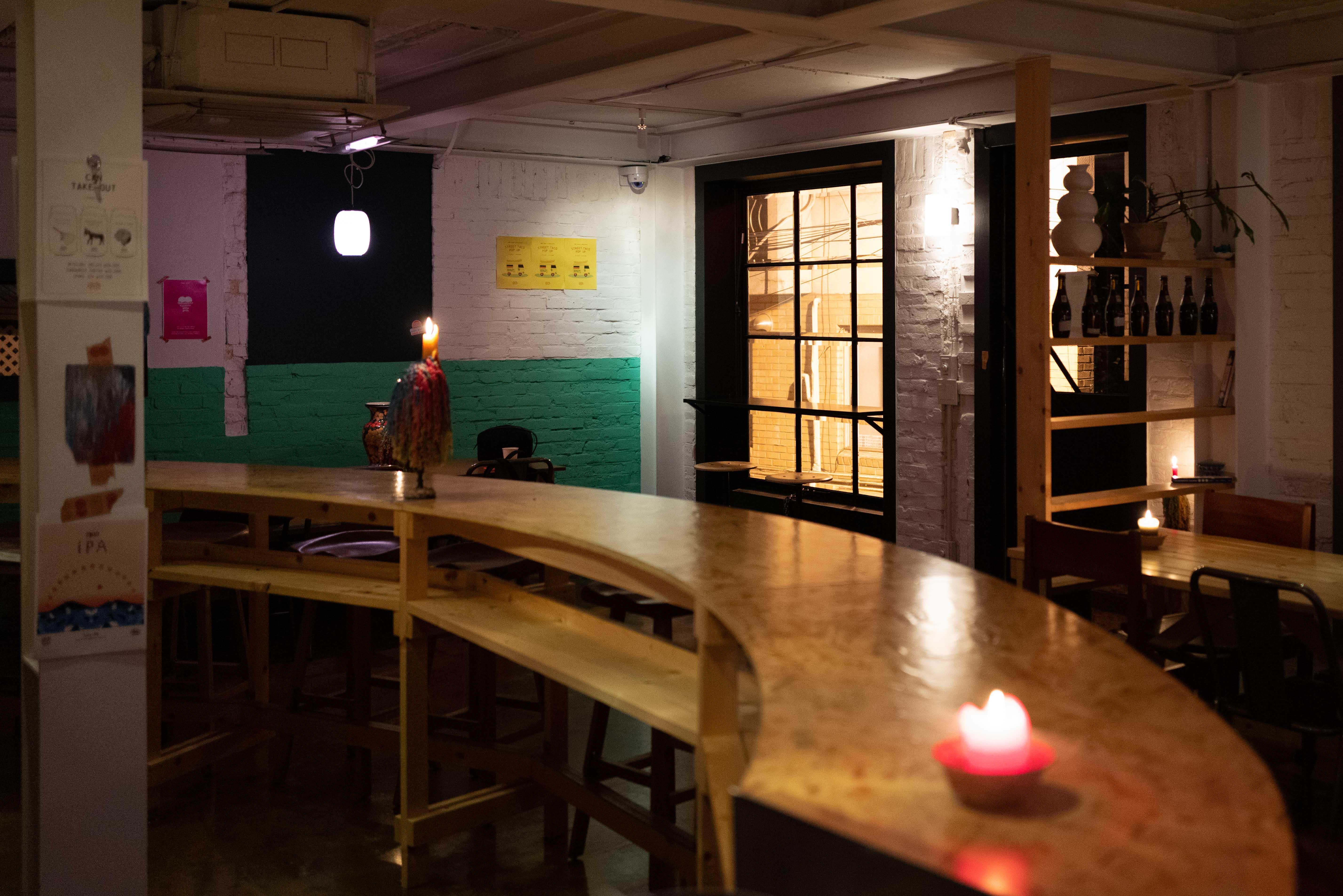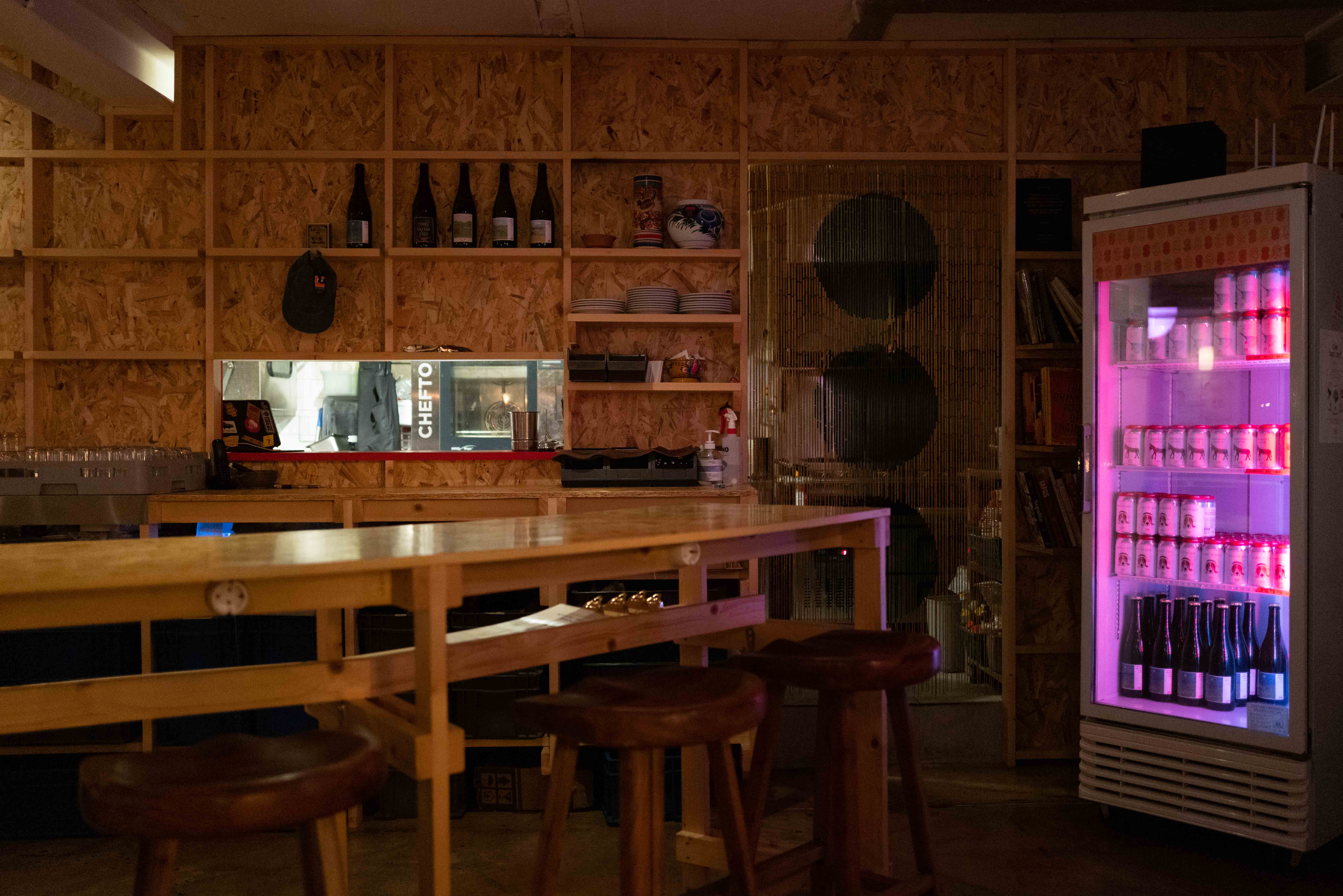 주인장이 남은 구조목을 툭툭 잘라 직접만든 나무 바와 가구에 어딘가 서툰느낌으로 귀여운 컬러가 칠해진 편안한 분위기의 가게 밤이되면 촛불로 불을 밝혀 더욱 신나게 술 마실 수 있는 그런 곳으로 만들어야겠다..!