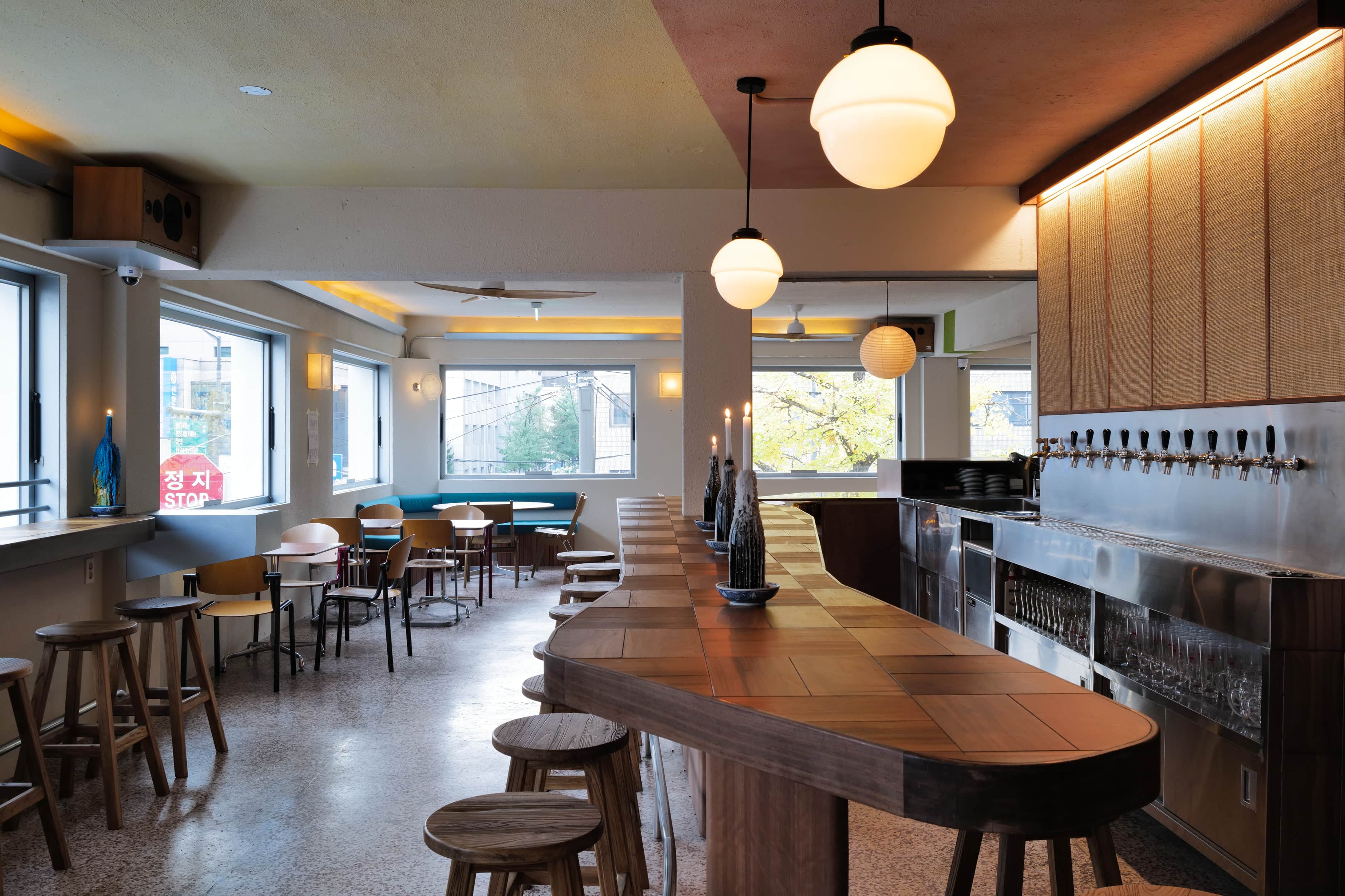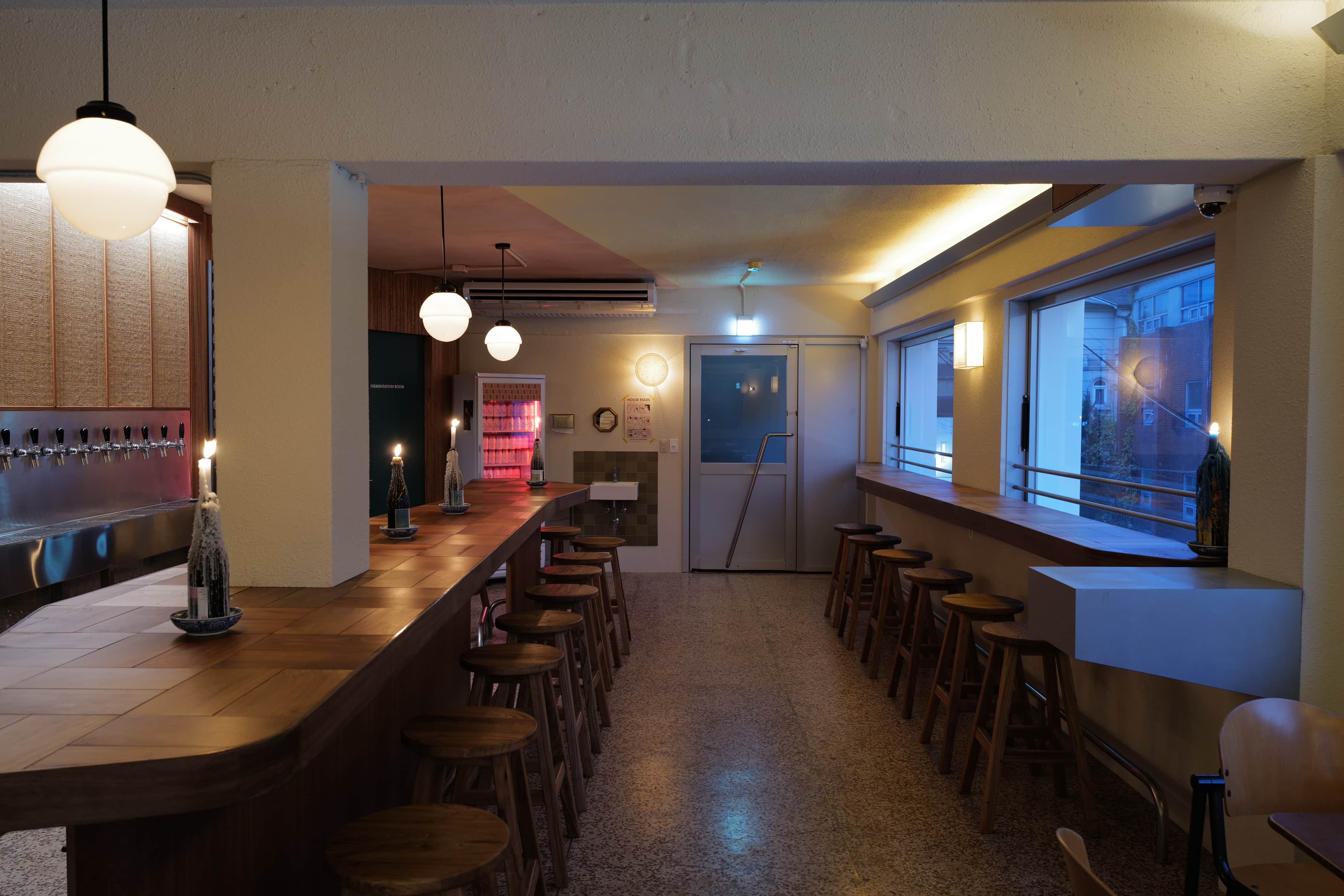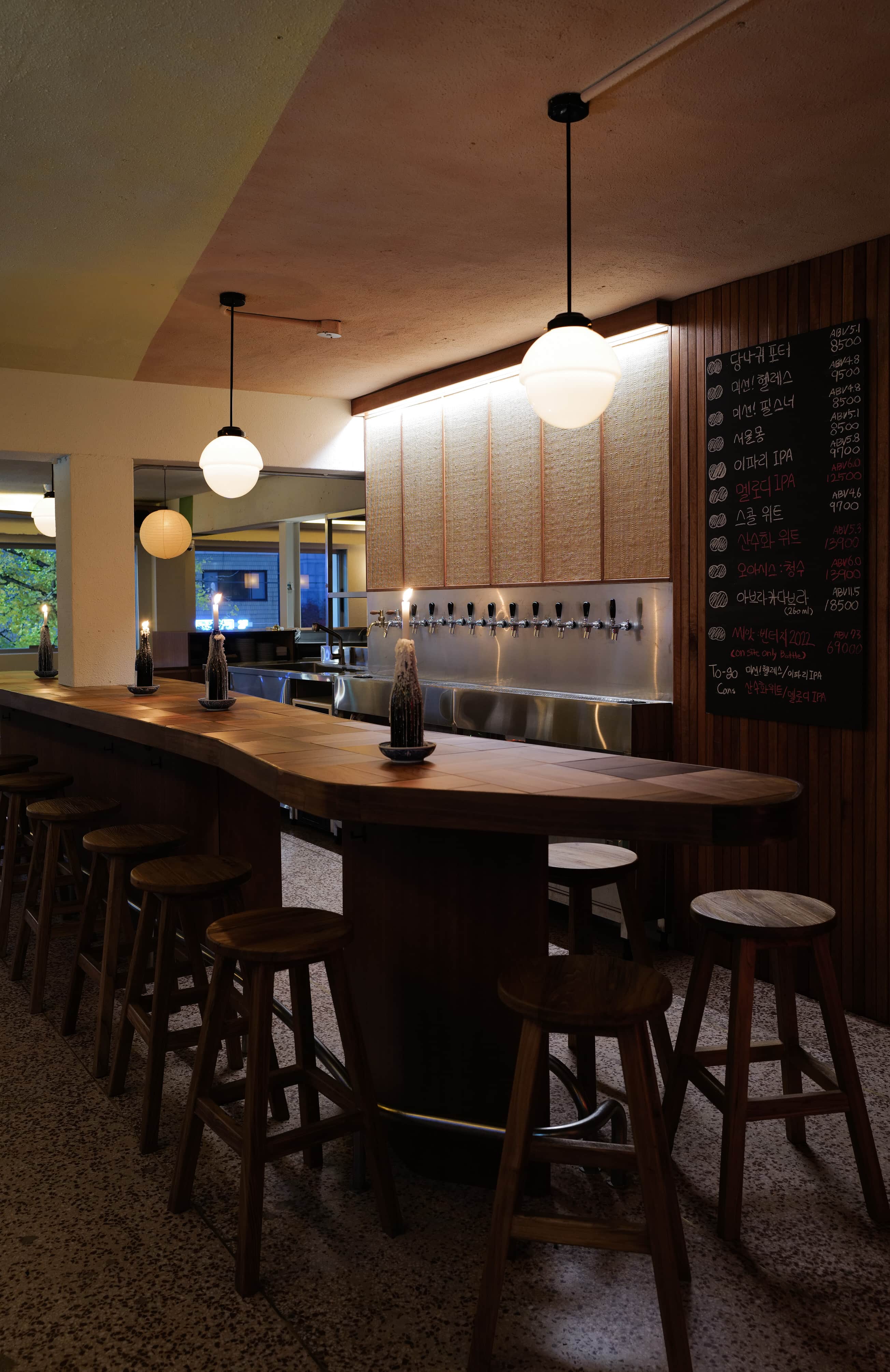 바에서 벌어지는 고객과 비어텐더의 커뮤니케이션을 고려하며, 2명 또는 3~4명의 무리 사람들까지 자유로이 뭉치고 떨어져 앉을 수 있는 바의 형태를 고민했다. 바의 소재는 티크 나무 특유의 따뜻한 분위기와 질감을 포기하고 싶지 않아 원목 중에서도 물에 강한 소재를 택했다.