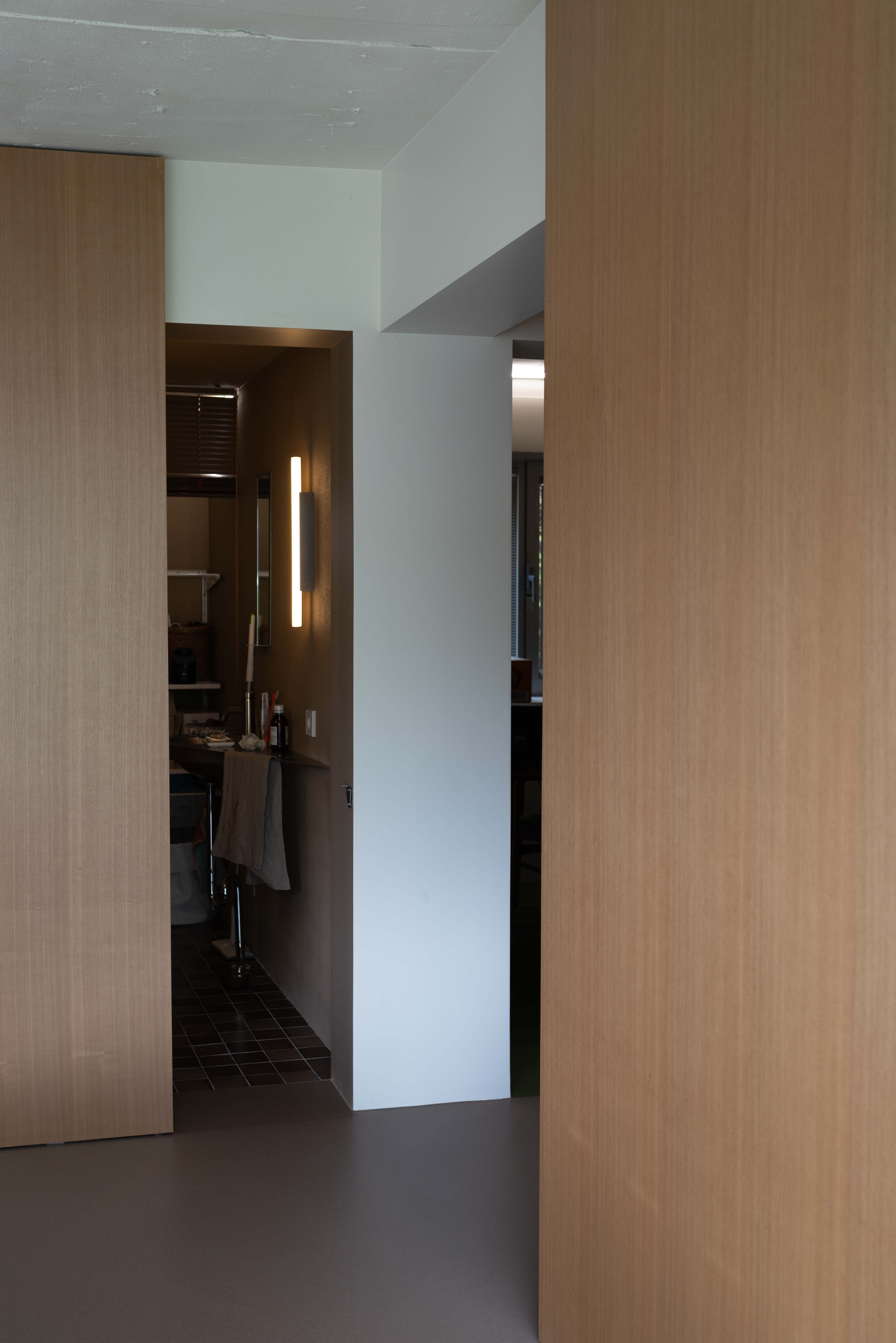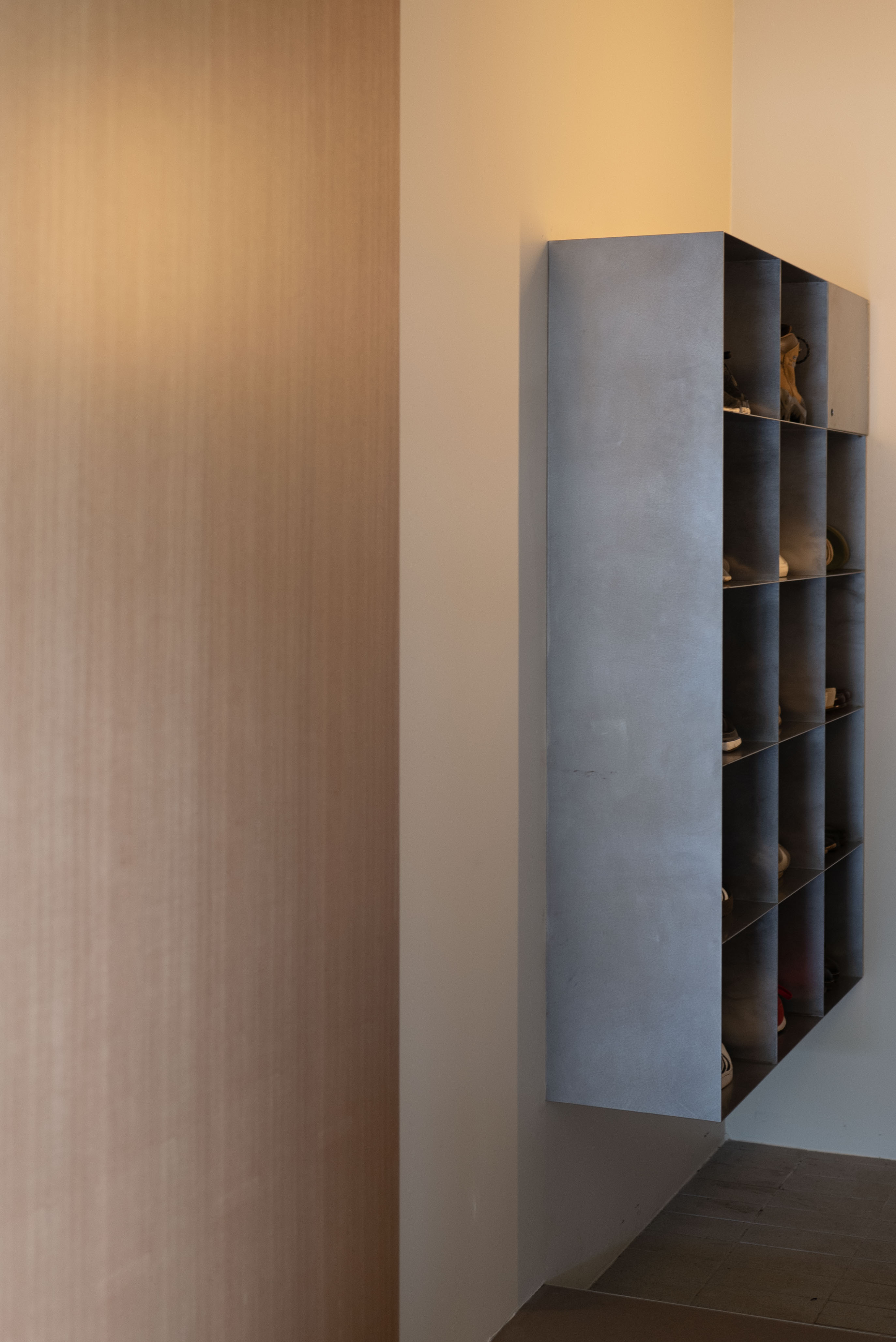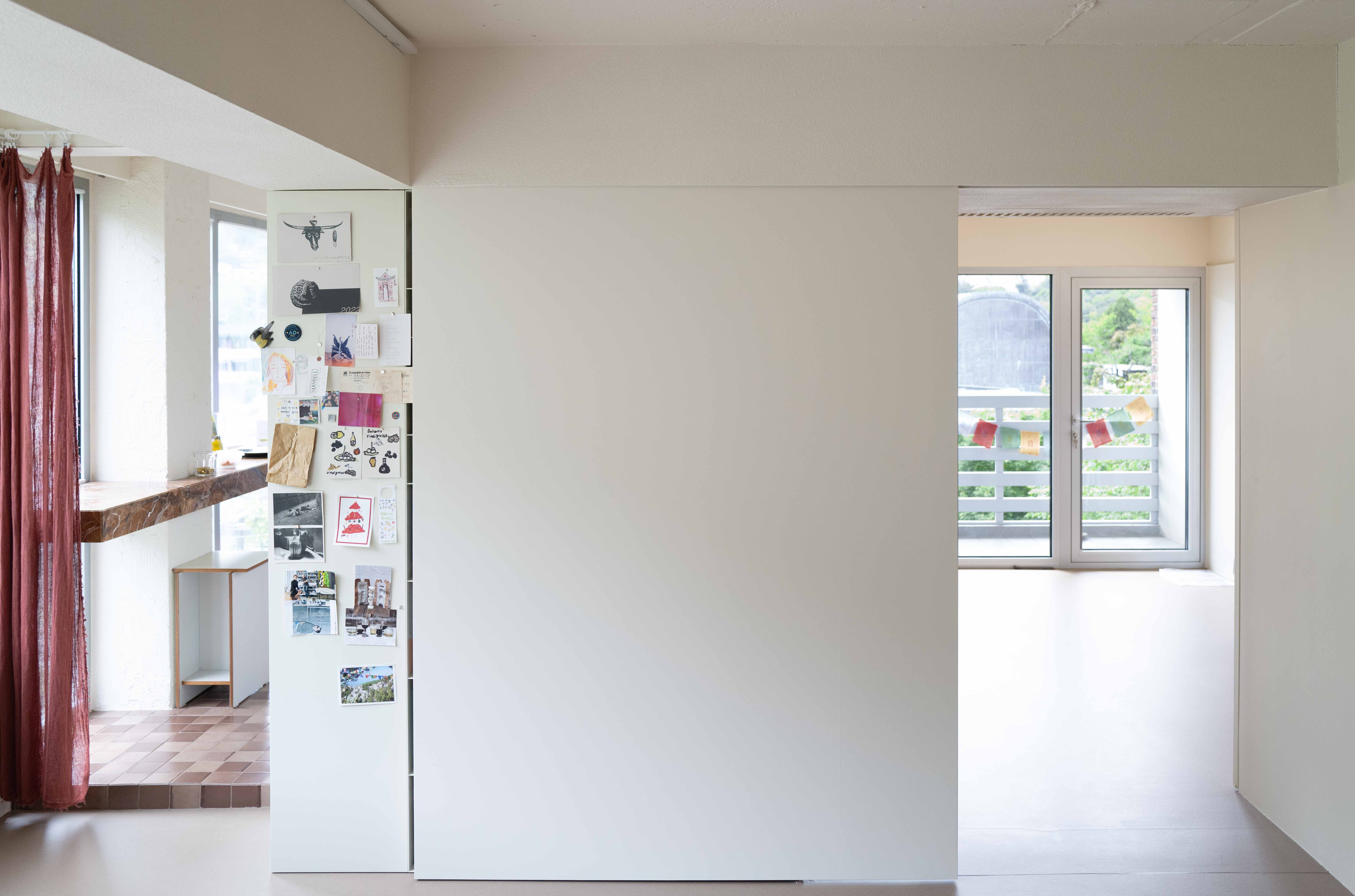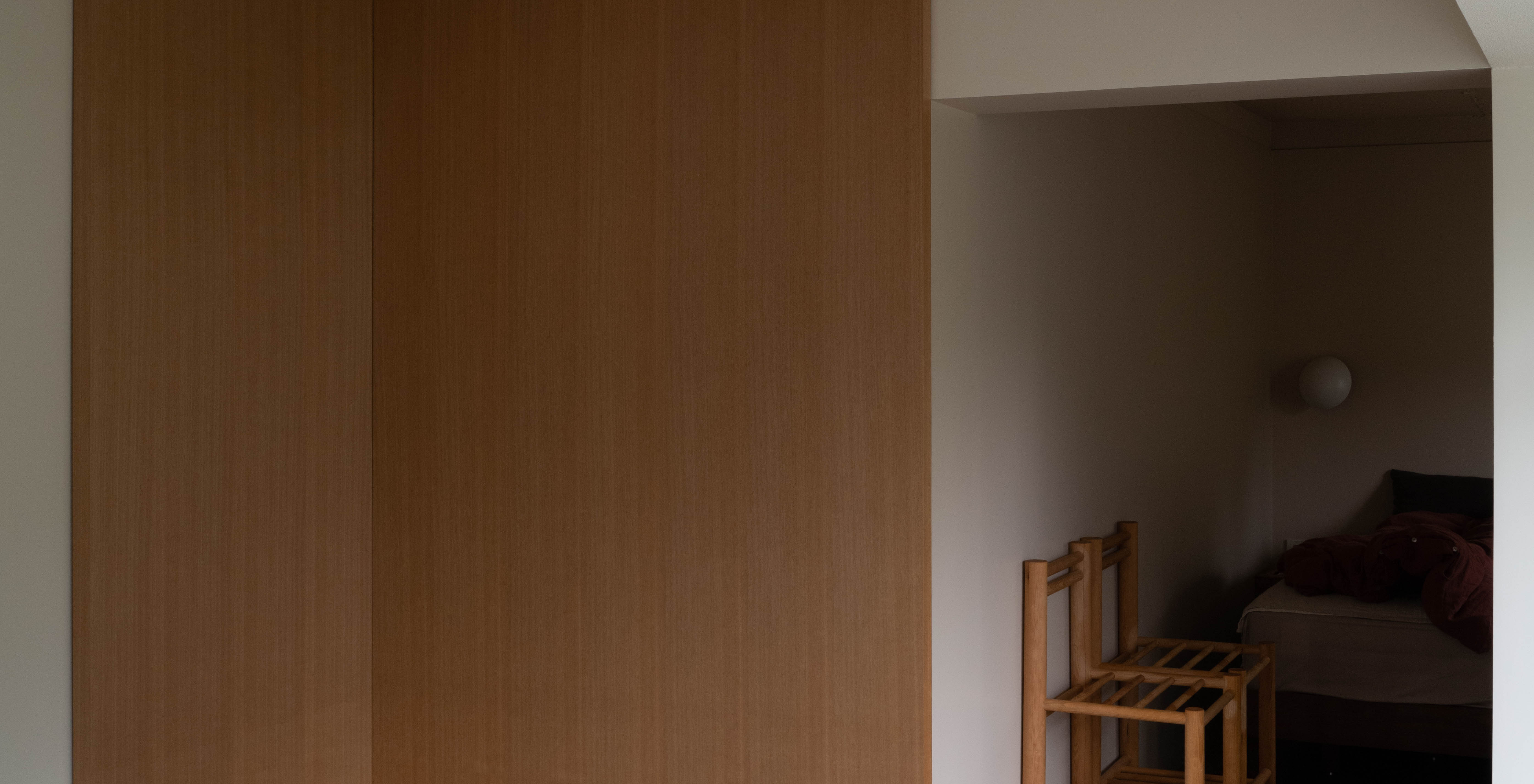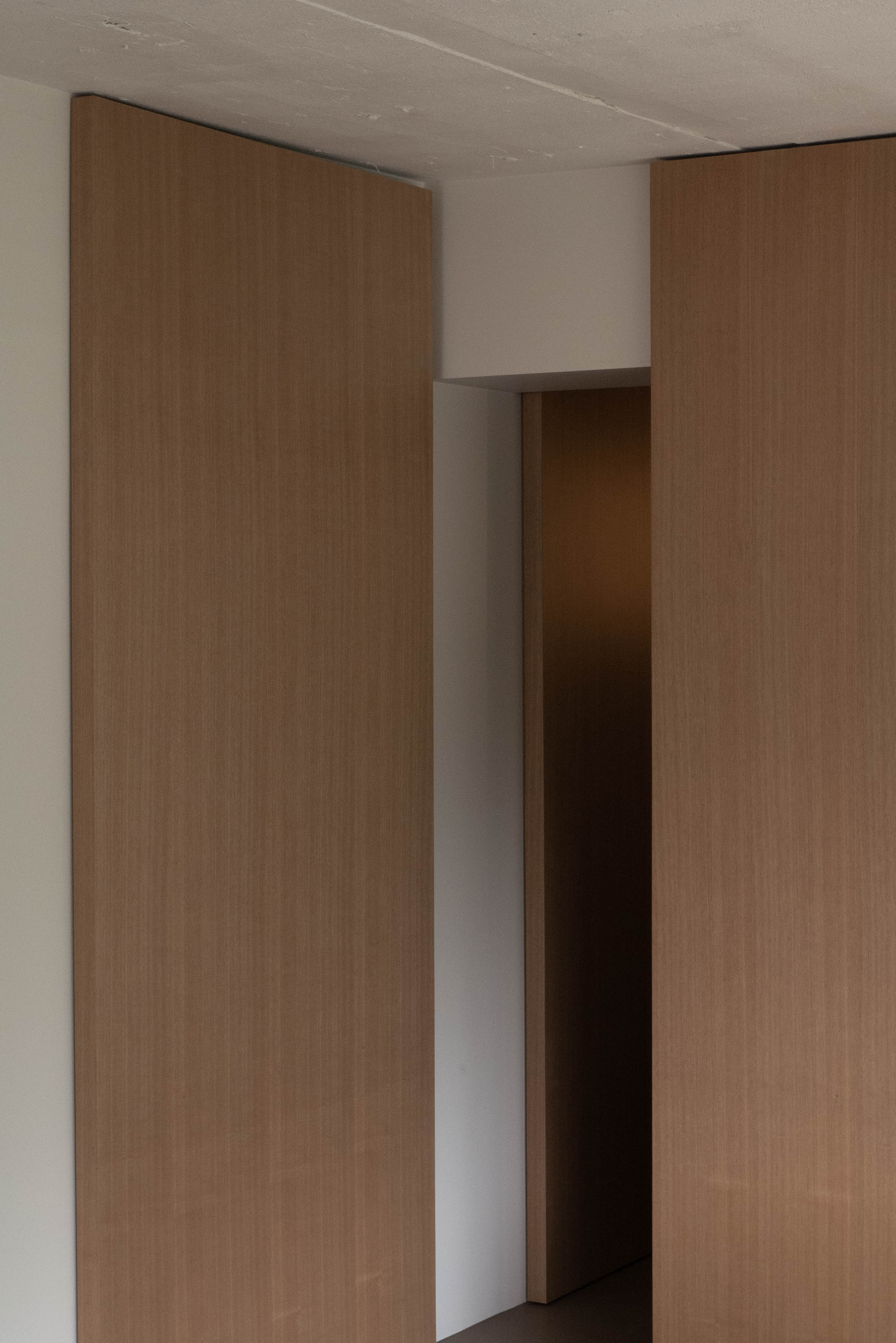 넓은 목재 평면은 벽이자 문으로 공간을 분할하고 합쳐지도록한다.