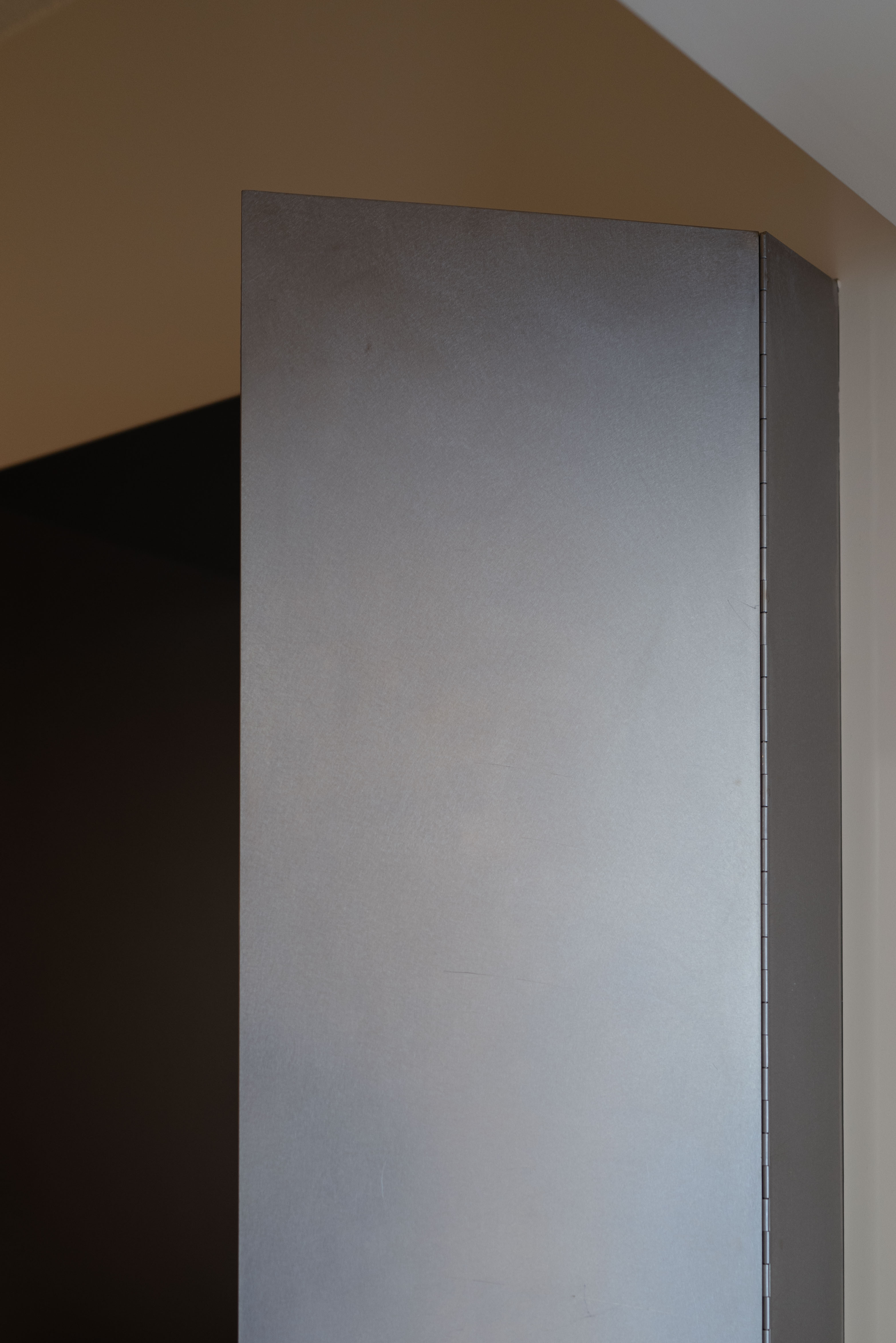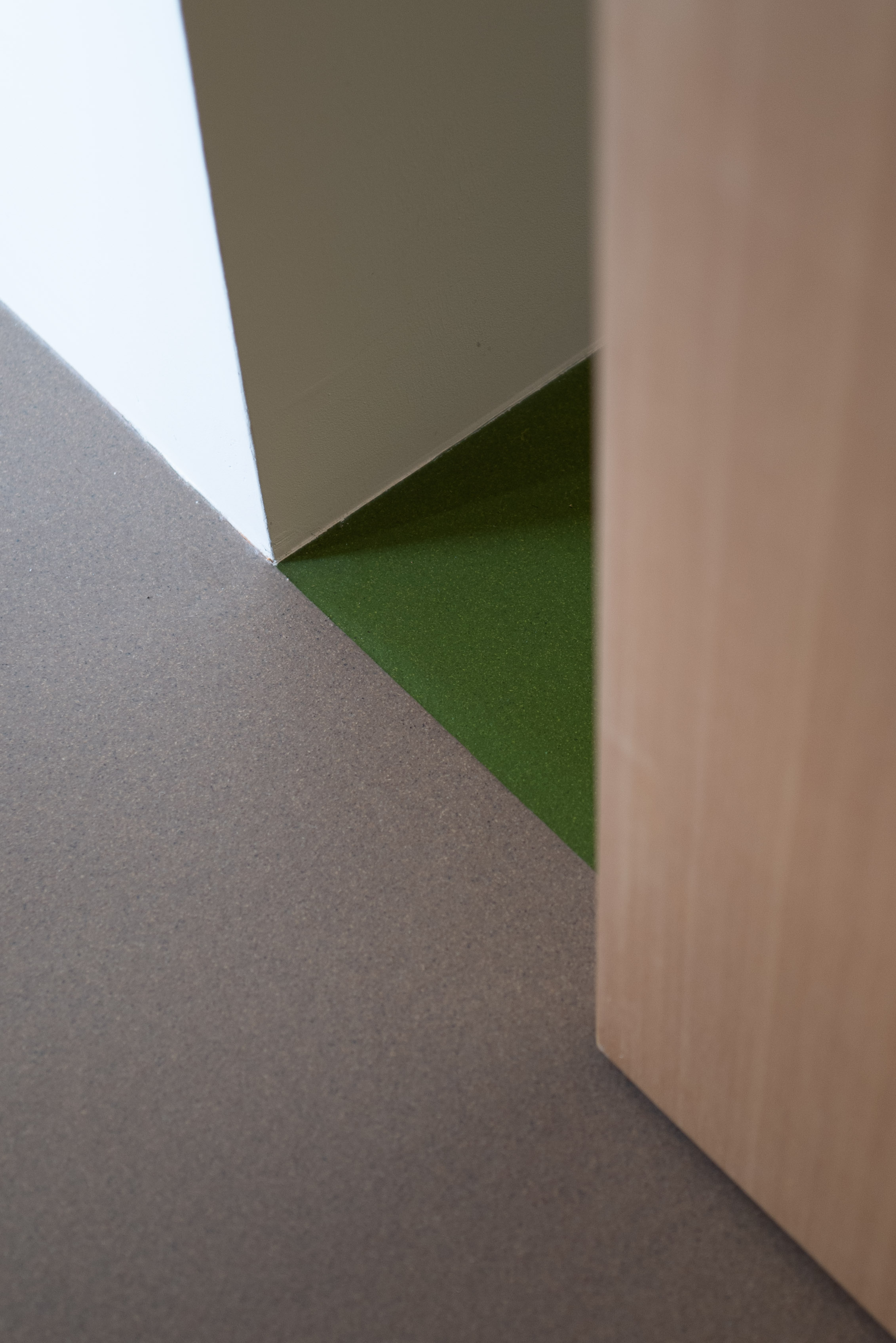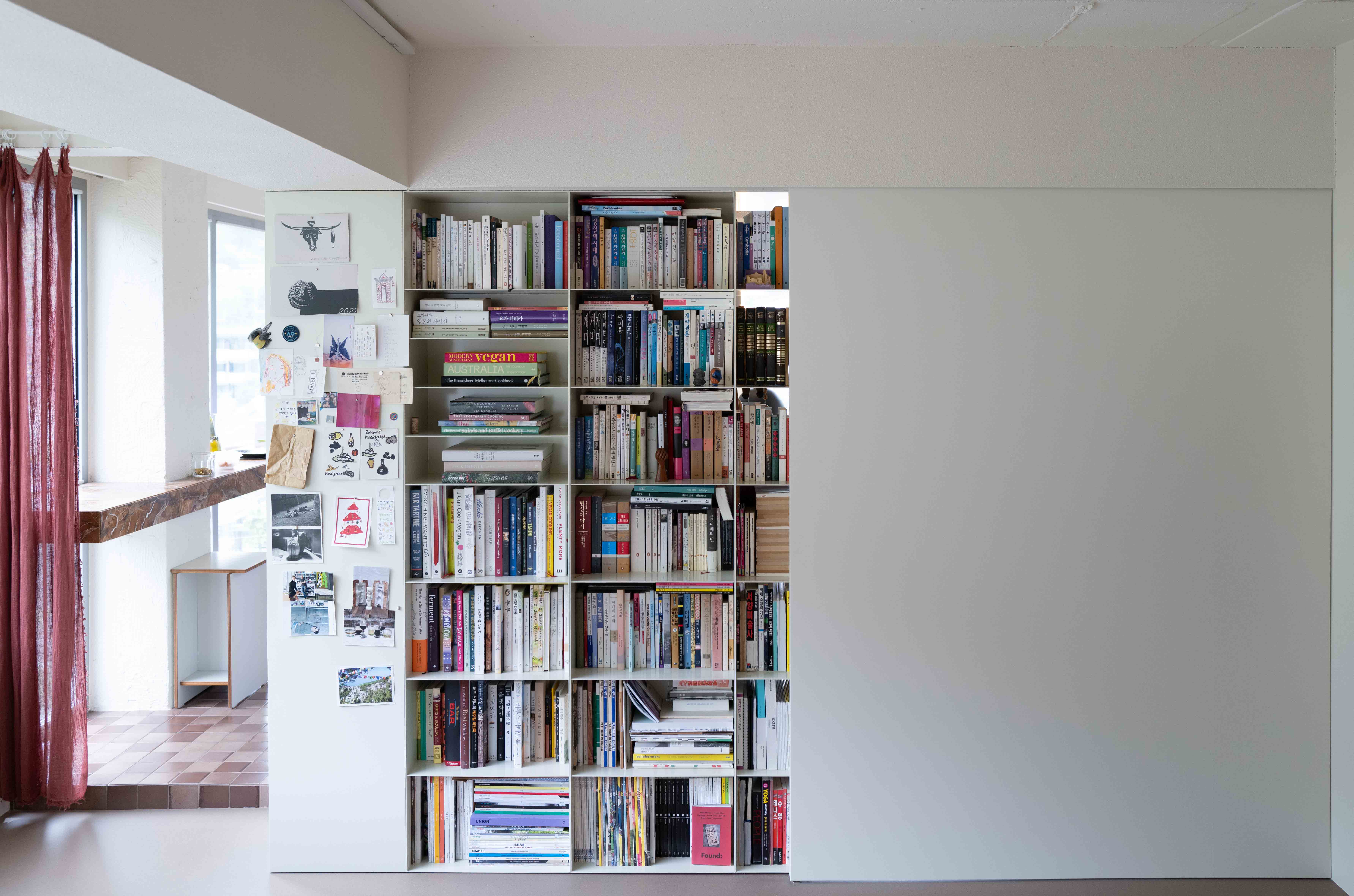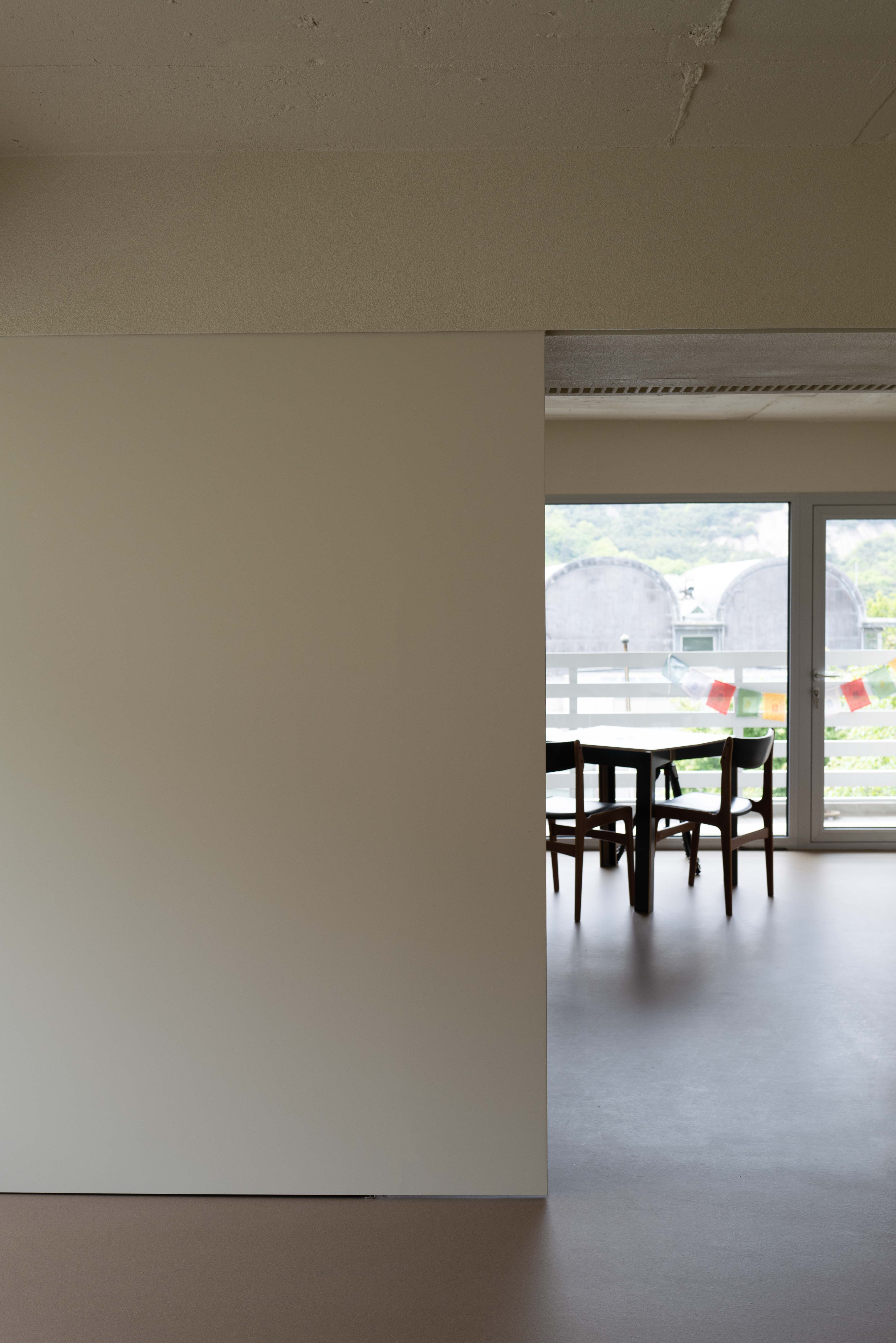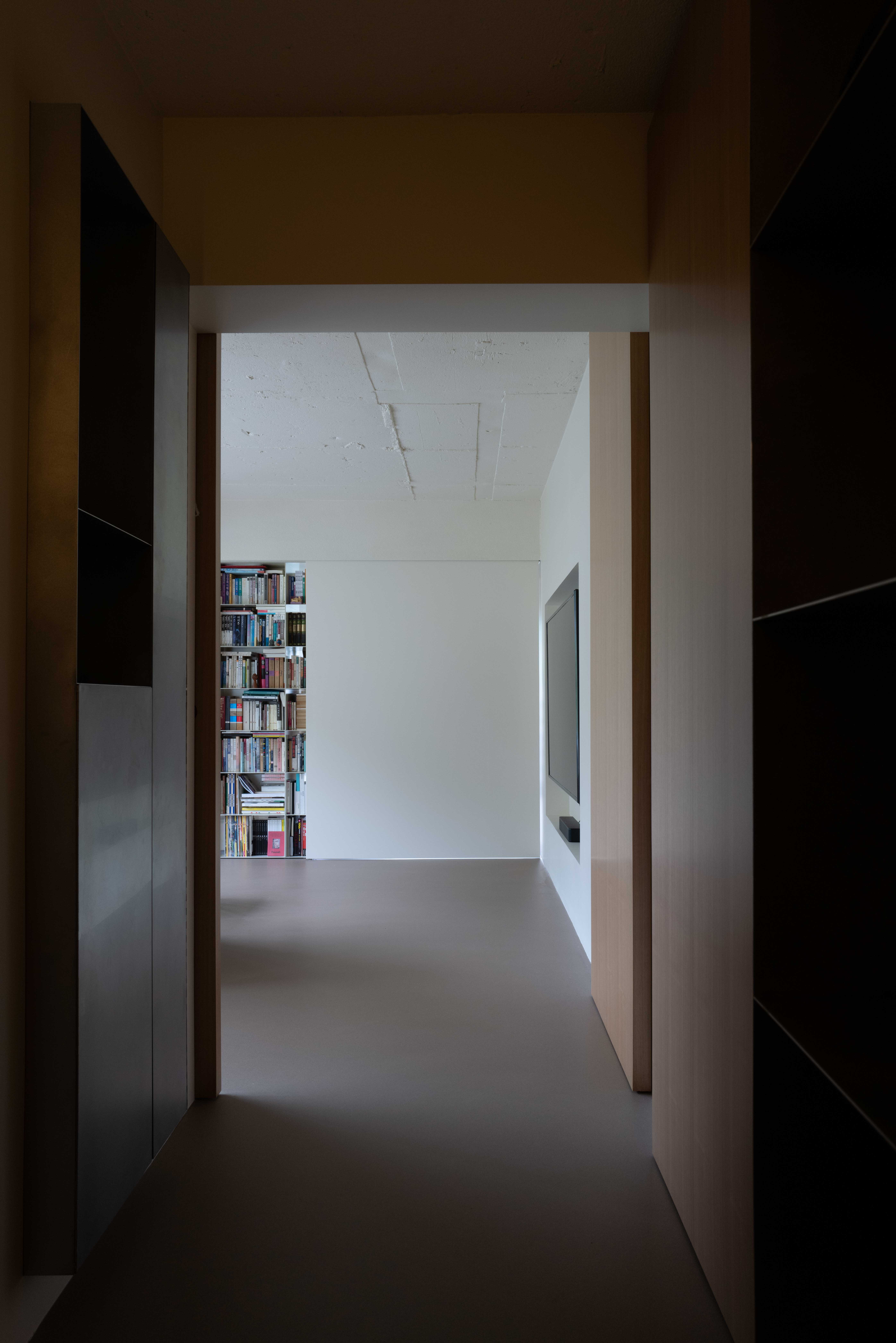 넓은 목재 평면은 벽이자 문으로 공간을 분할하고 합쳐지도록한다.