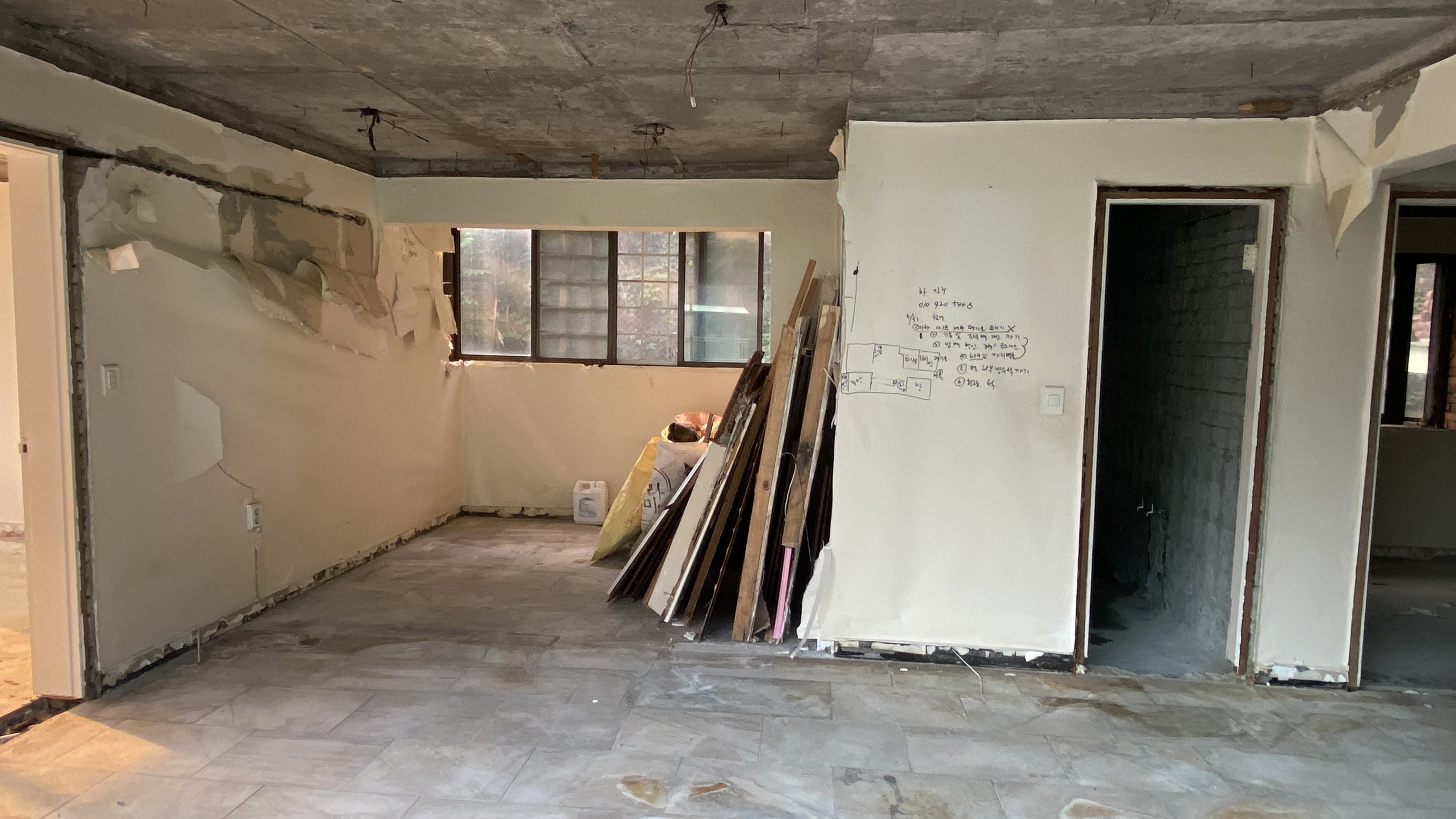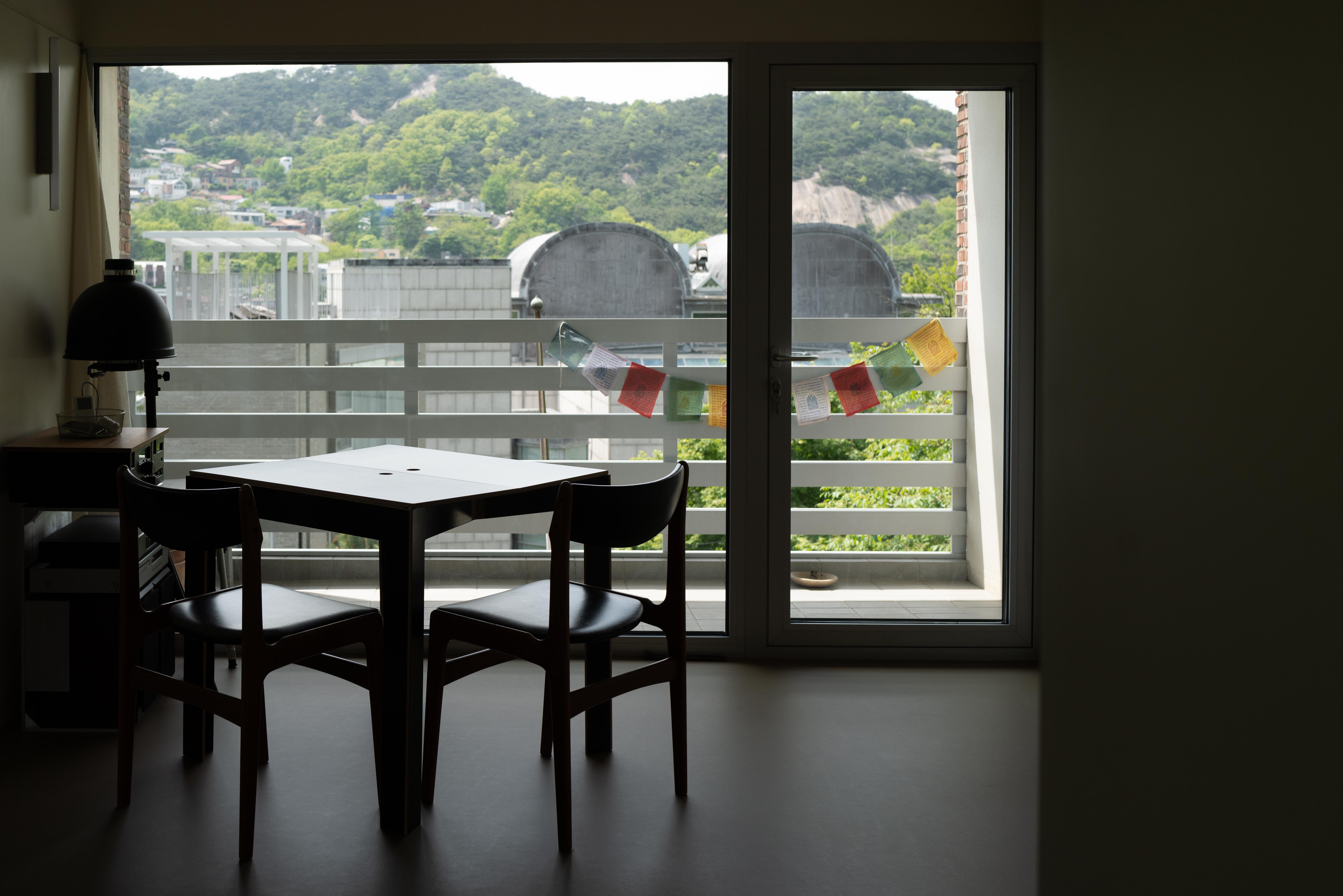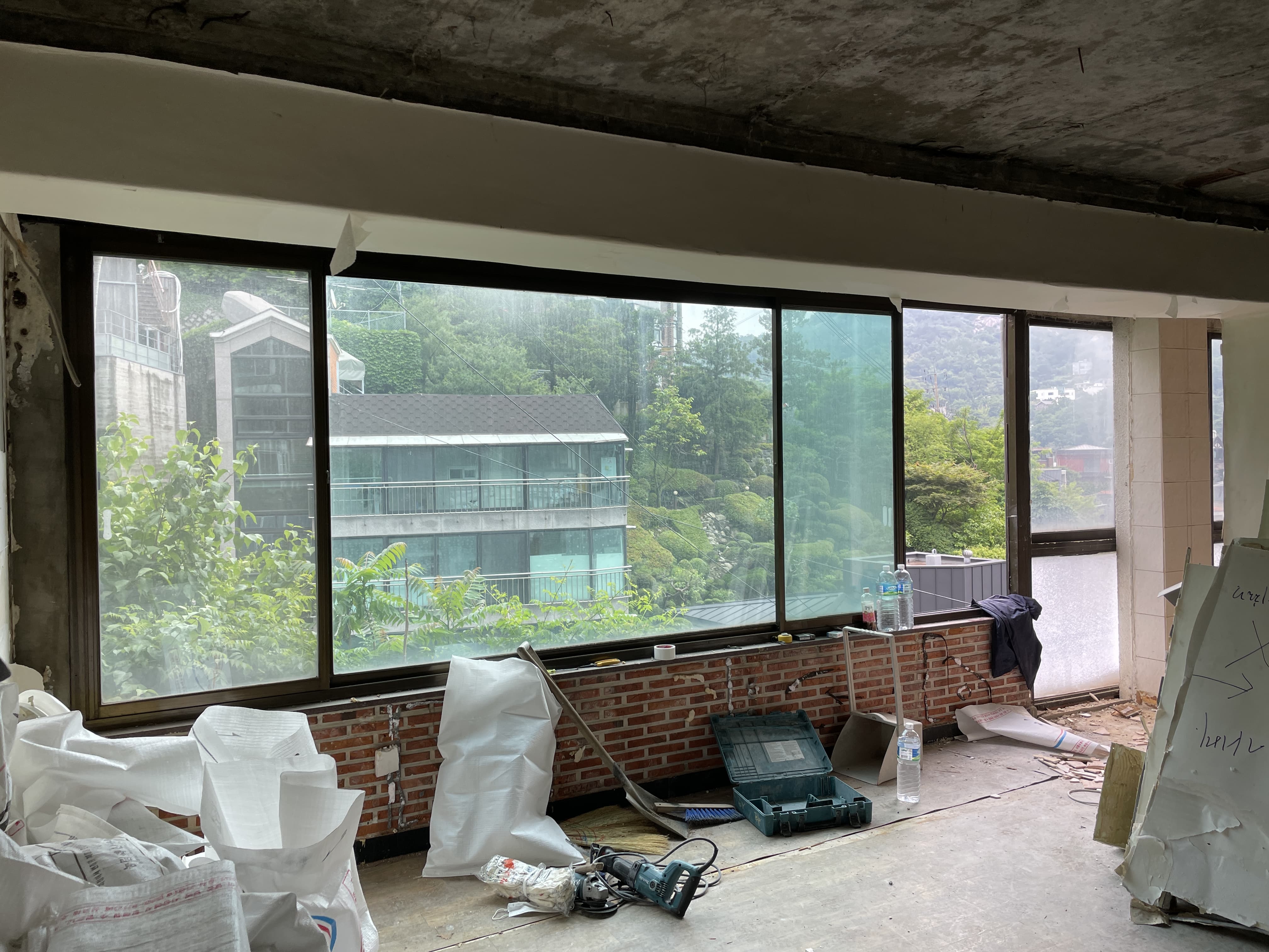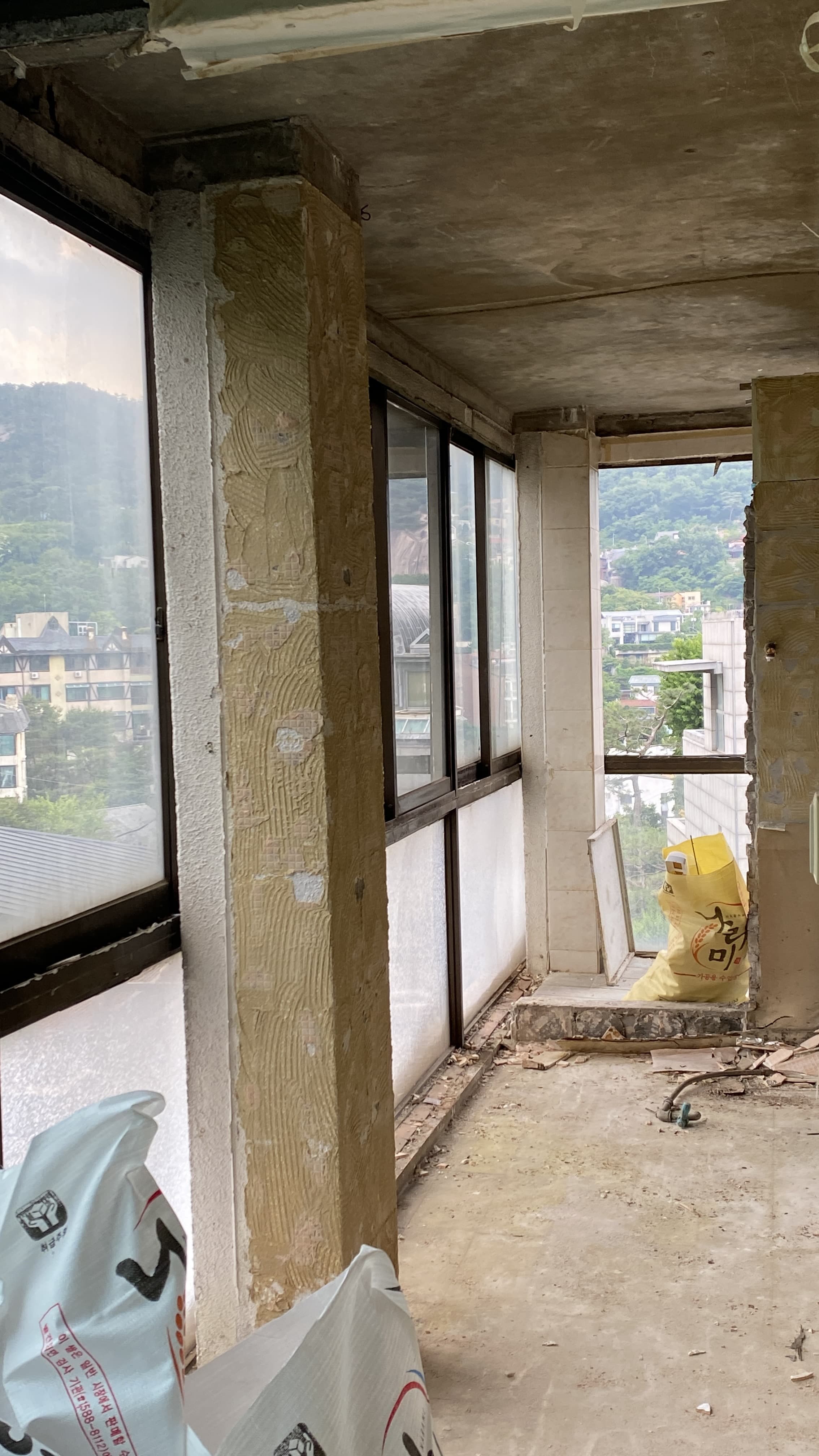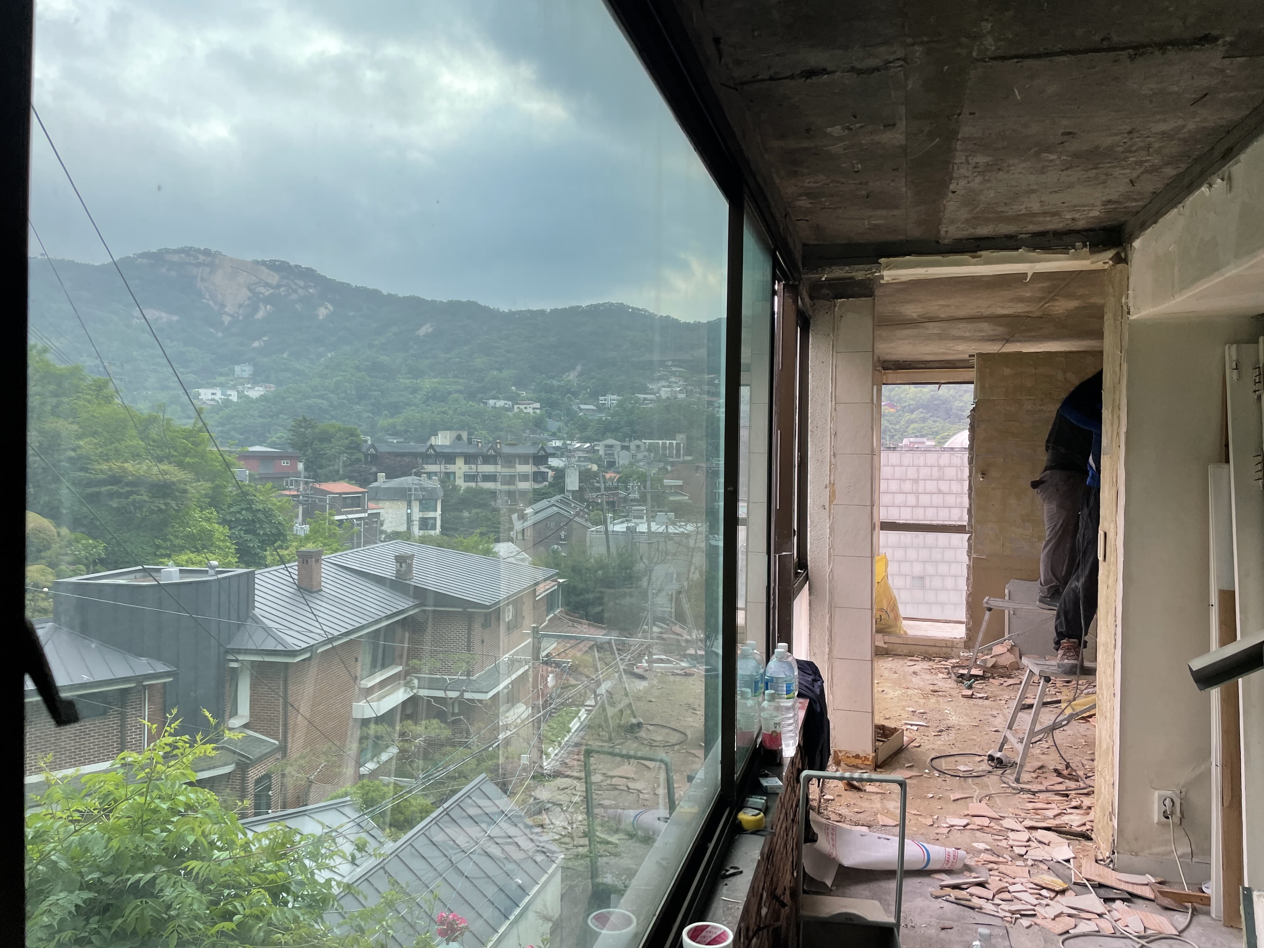 처음 집에 들어섰을때 서향으로 깊게 들어오는 빛과 단열때문에 이전에 살던사람이 인왕산 방향의 창을 합판과 단열재로 어설프게 막아 둔 상태였는데 뜯어보니 가까이 인왕산이 멋지게 보였다. 안에서만 보기에 아까운 풍경이라 그방의 창을 조금 들여서 설치하고 외부 테라스를 만들었다.
