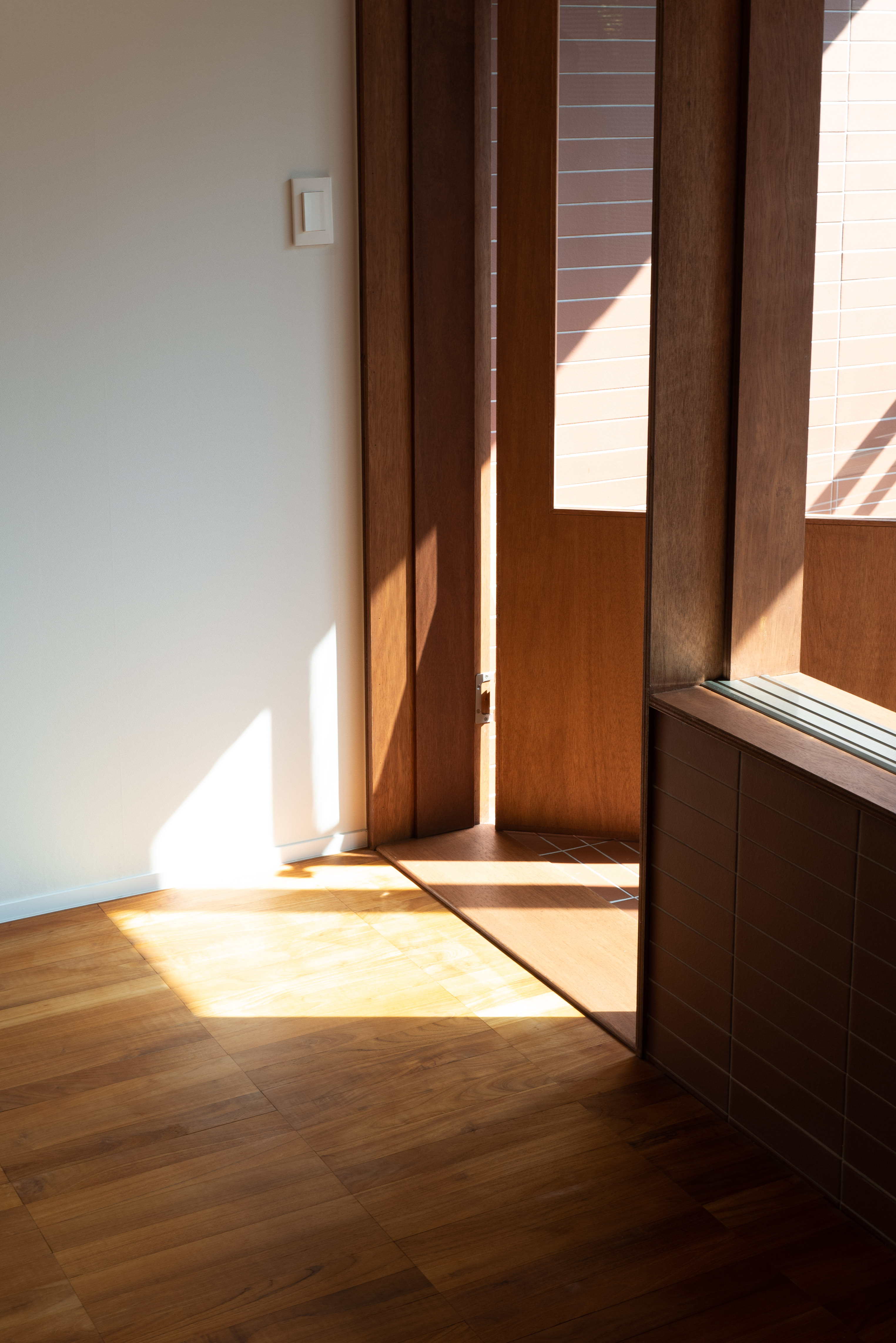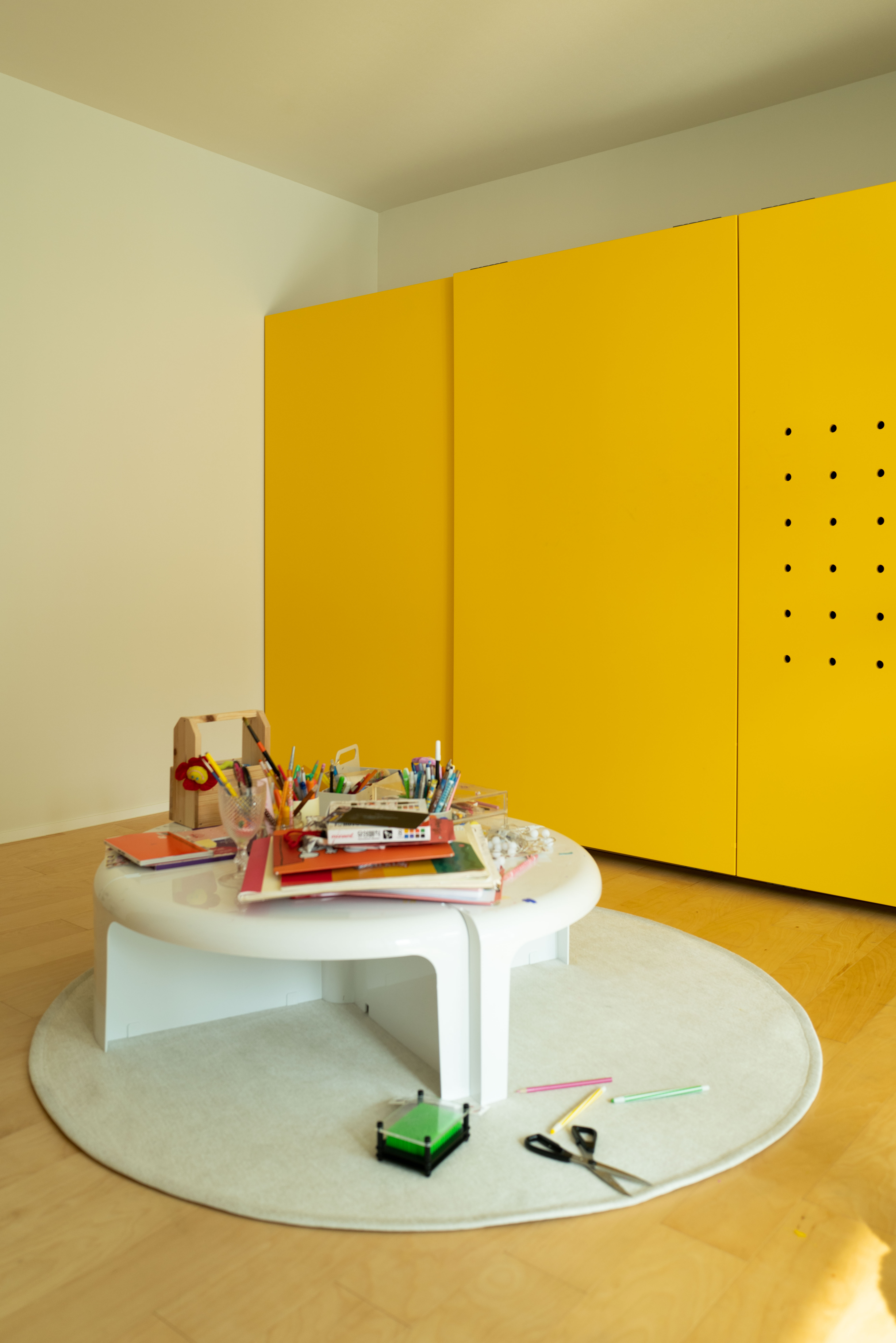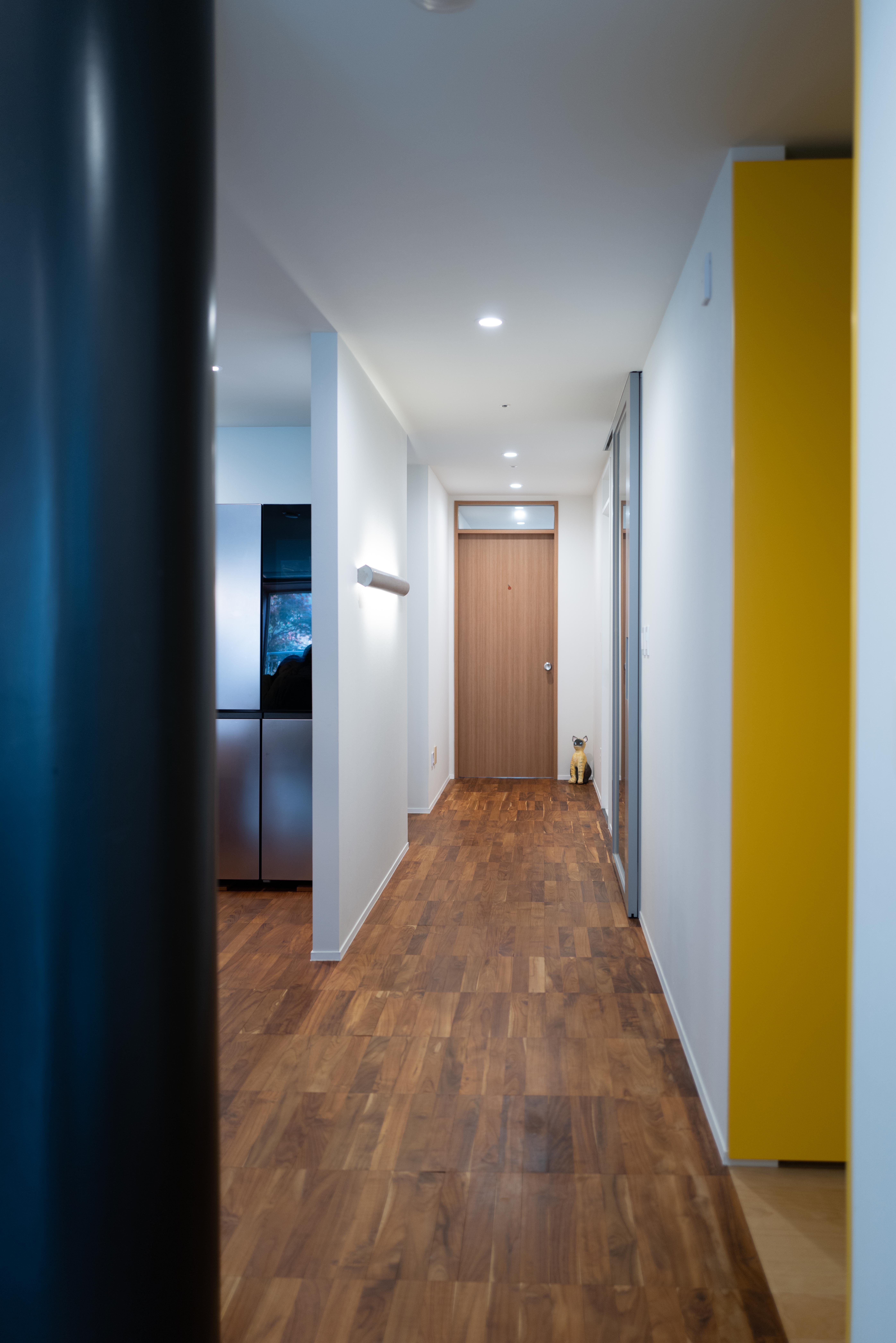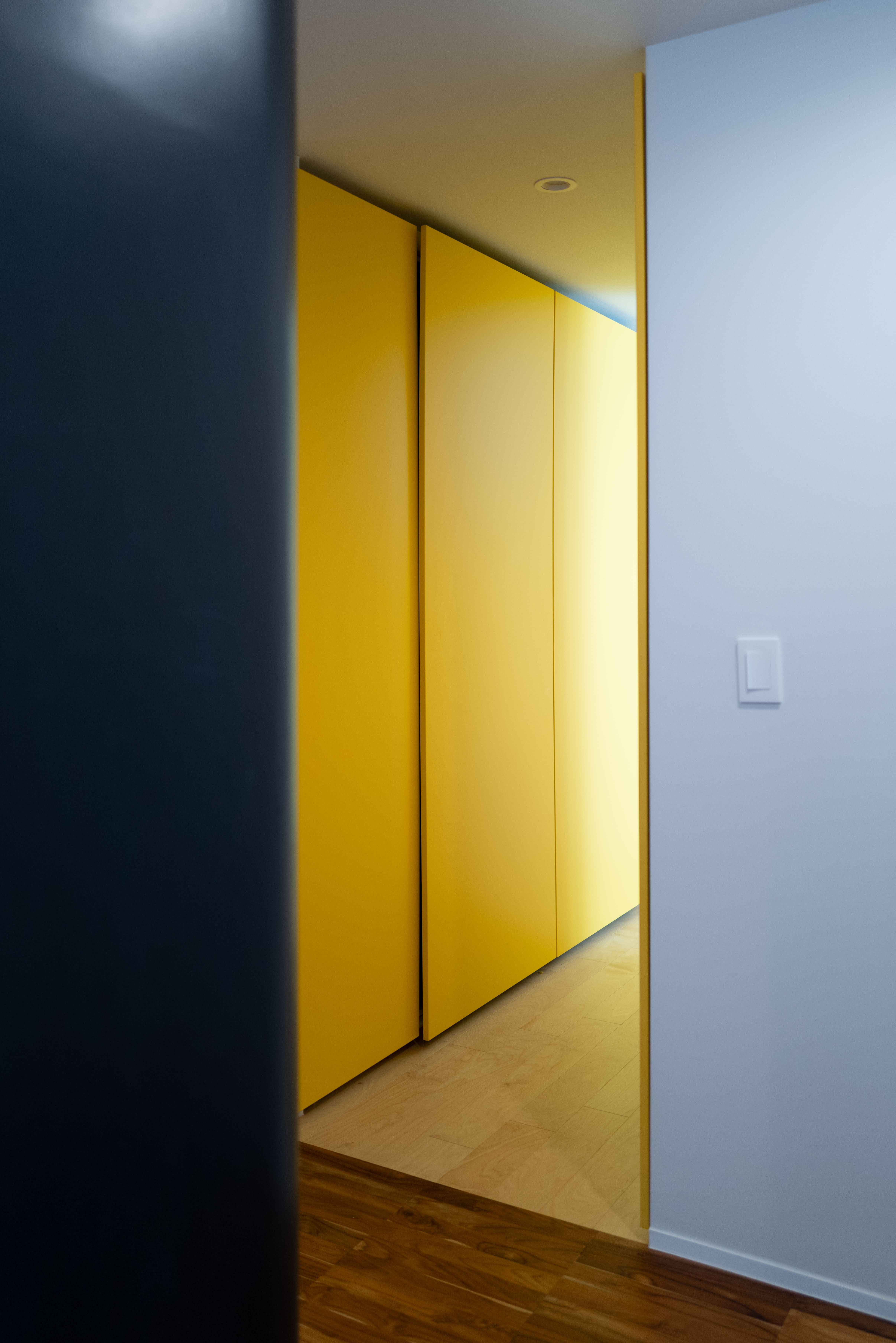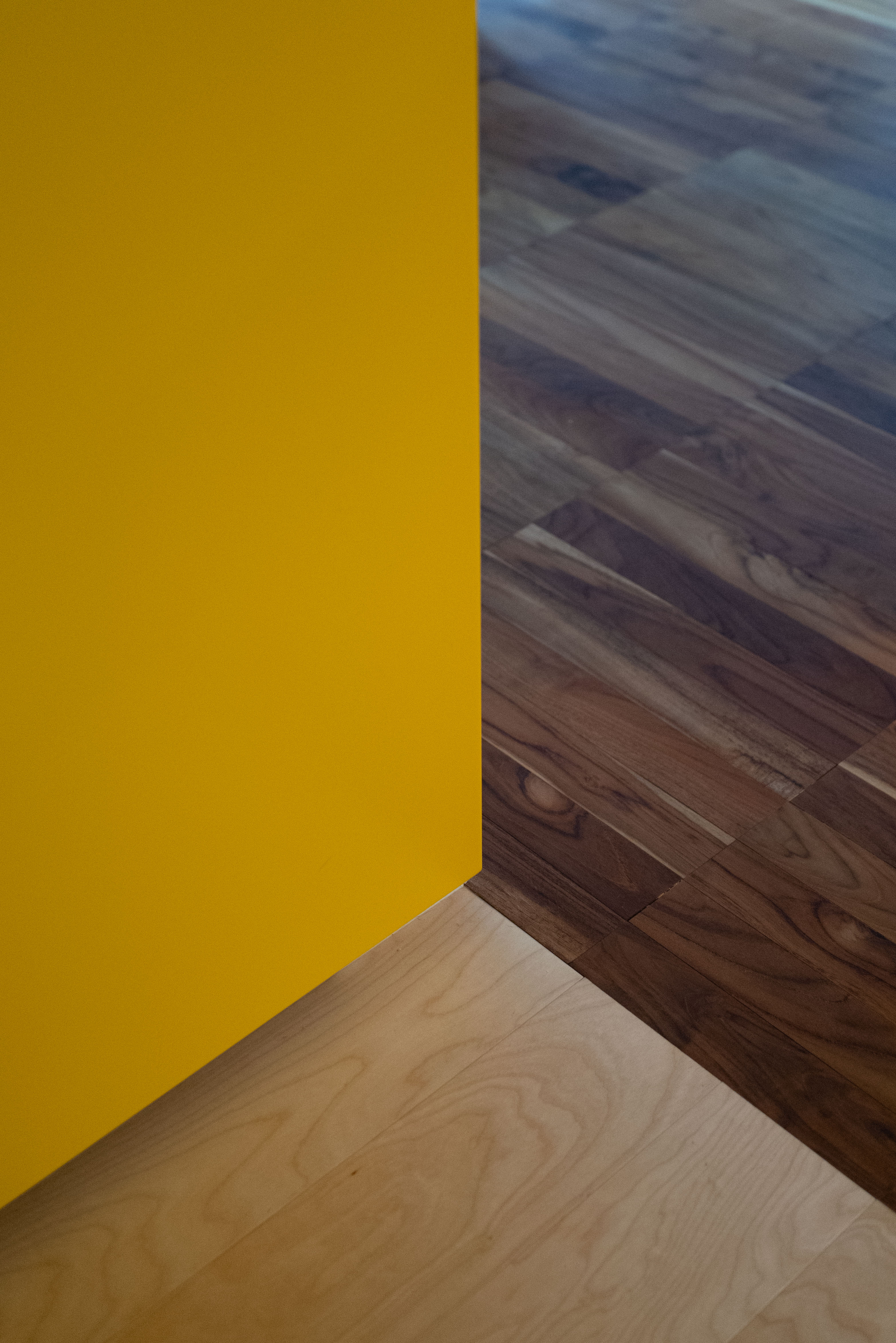 두가지의 대비되는 톤의 공간으로 집 전체적으로 티크원목마루, 붉은빛 라왕 합판 가구와 검은 기둥이 묵직하게 공간을 잡아주고 아이들 공간은 메이플 수종의 마루와 자작나무를 사용한 가구, 기분좋은 노란색을 활용해 밝고 발랄한 색감으로 채웠다.