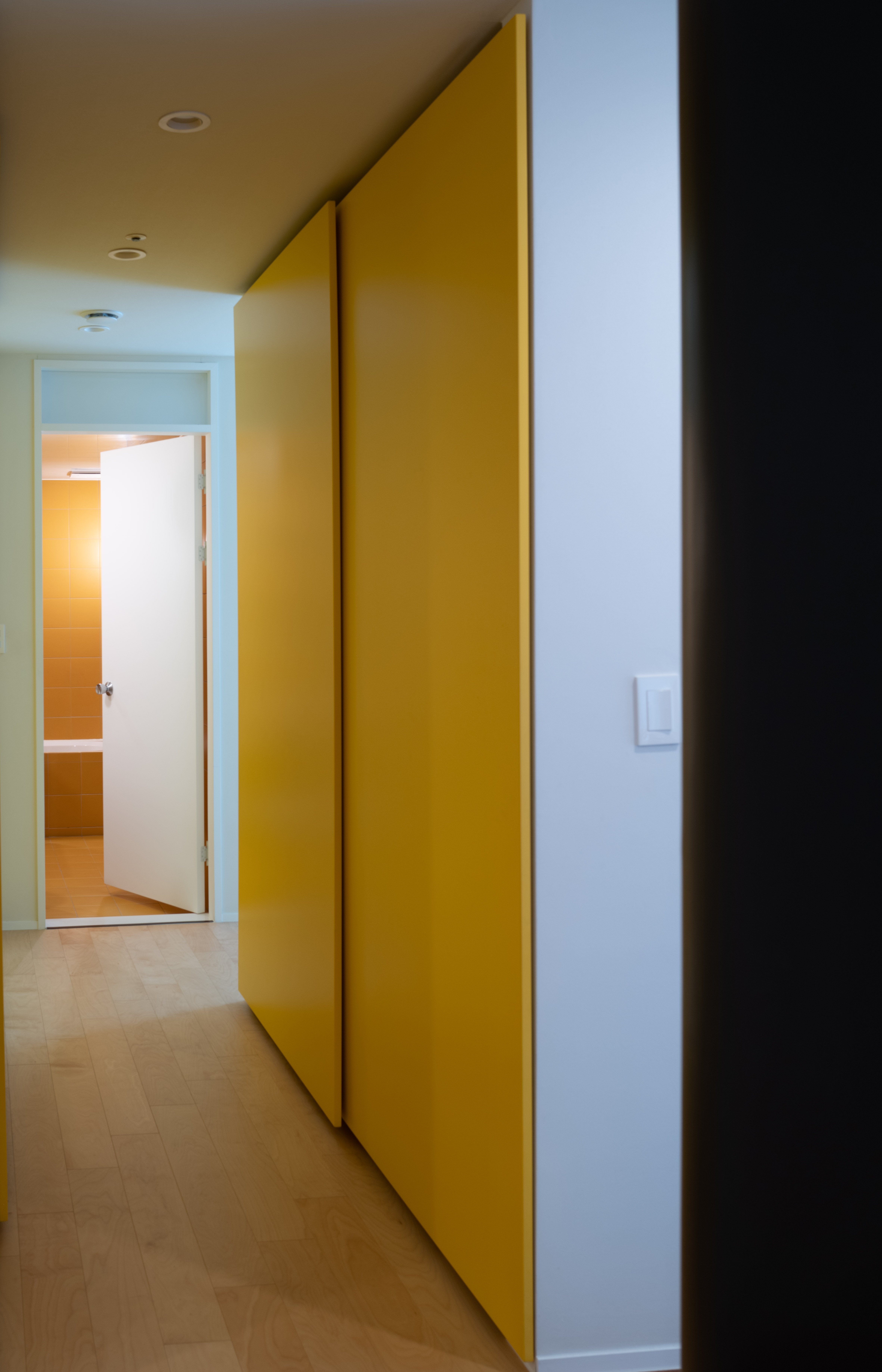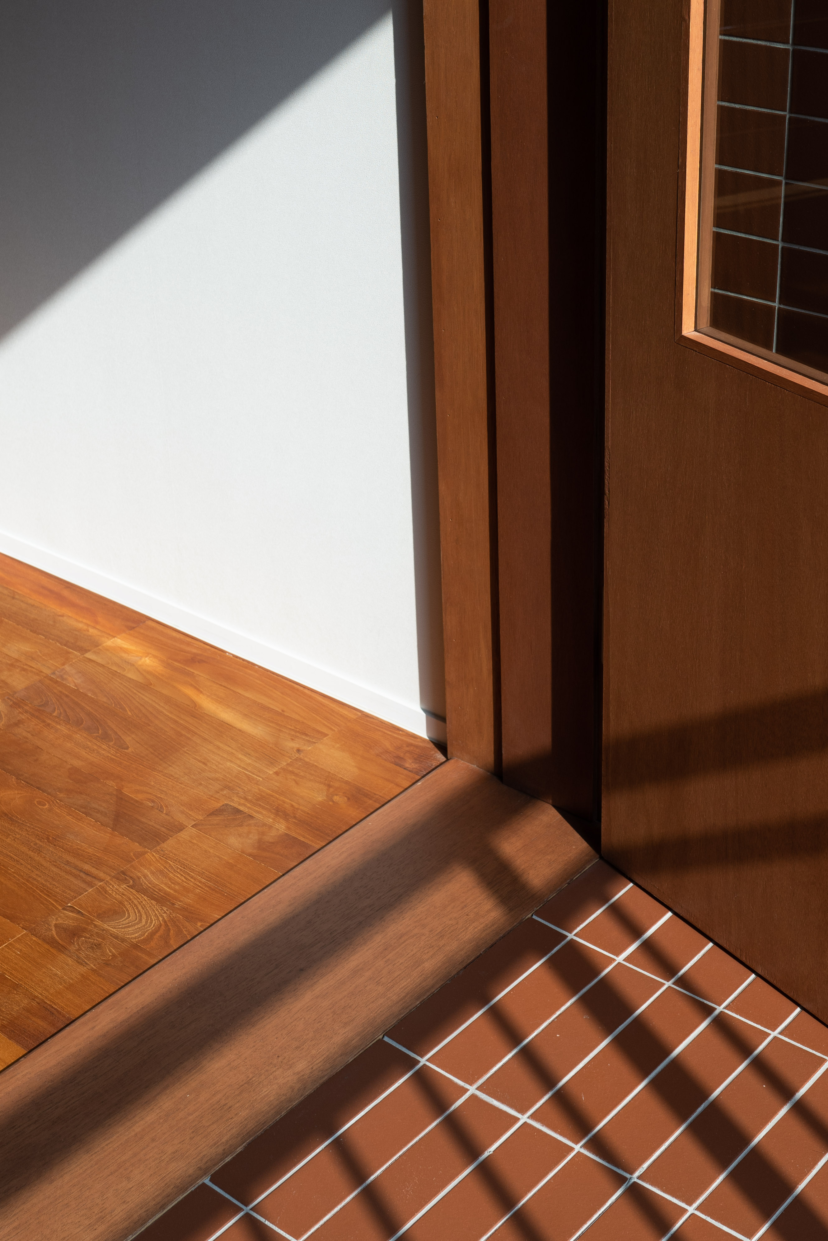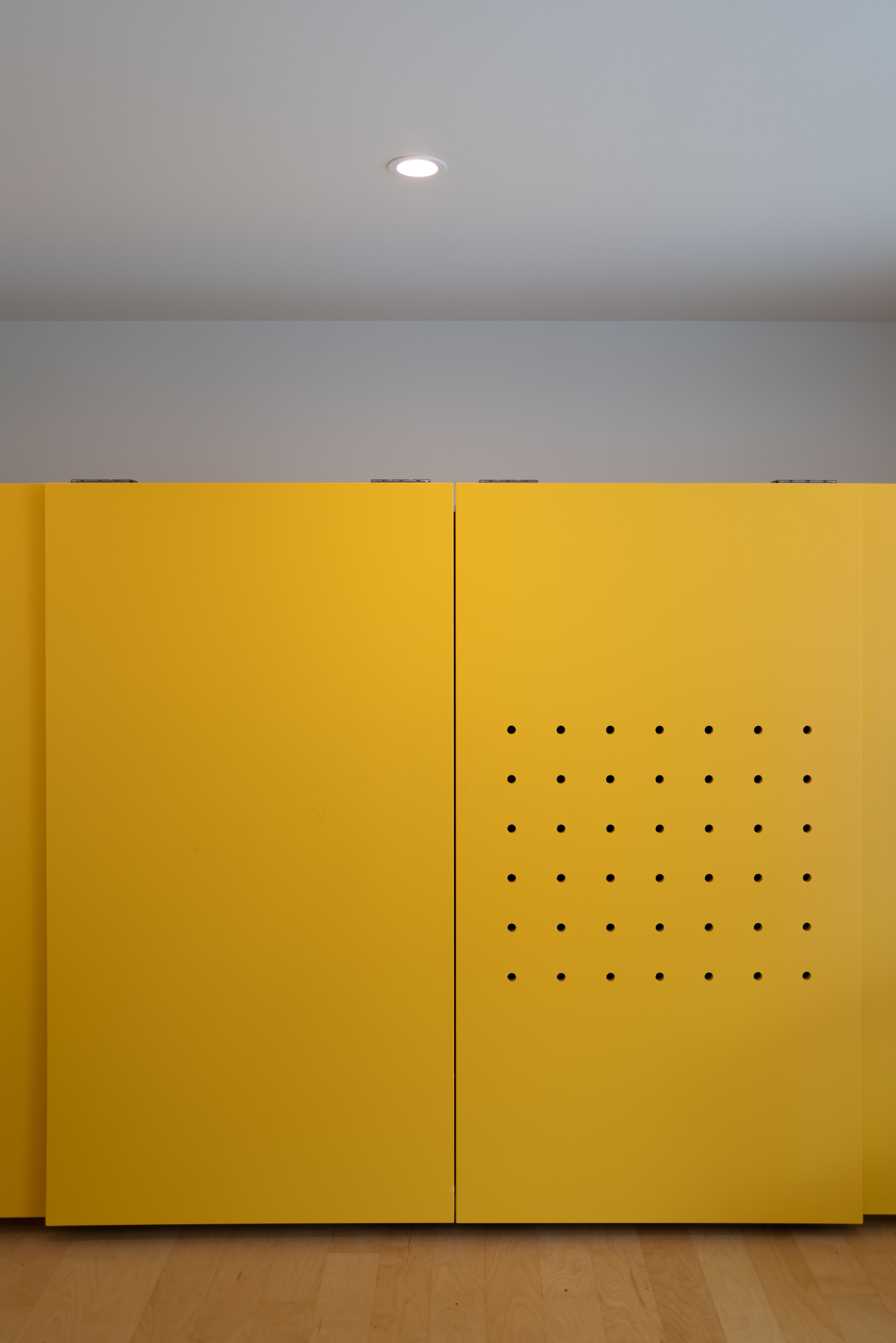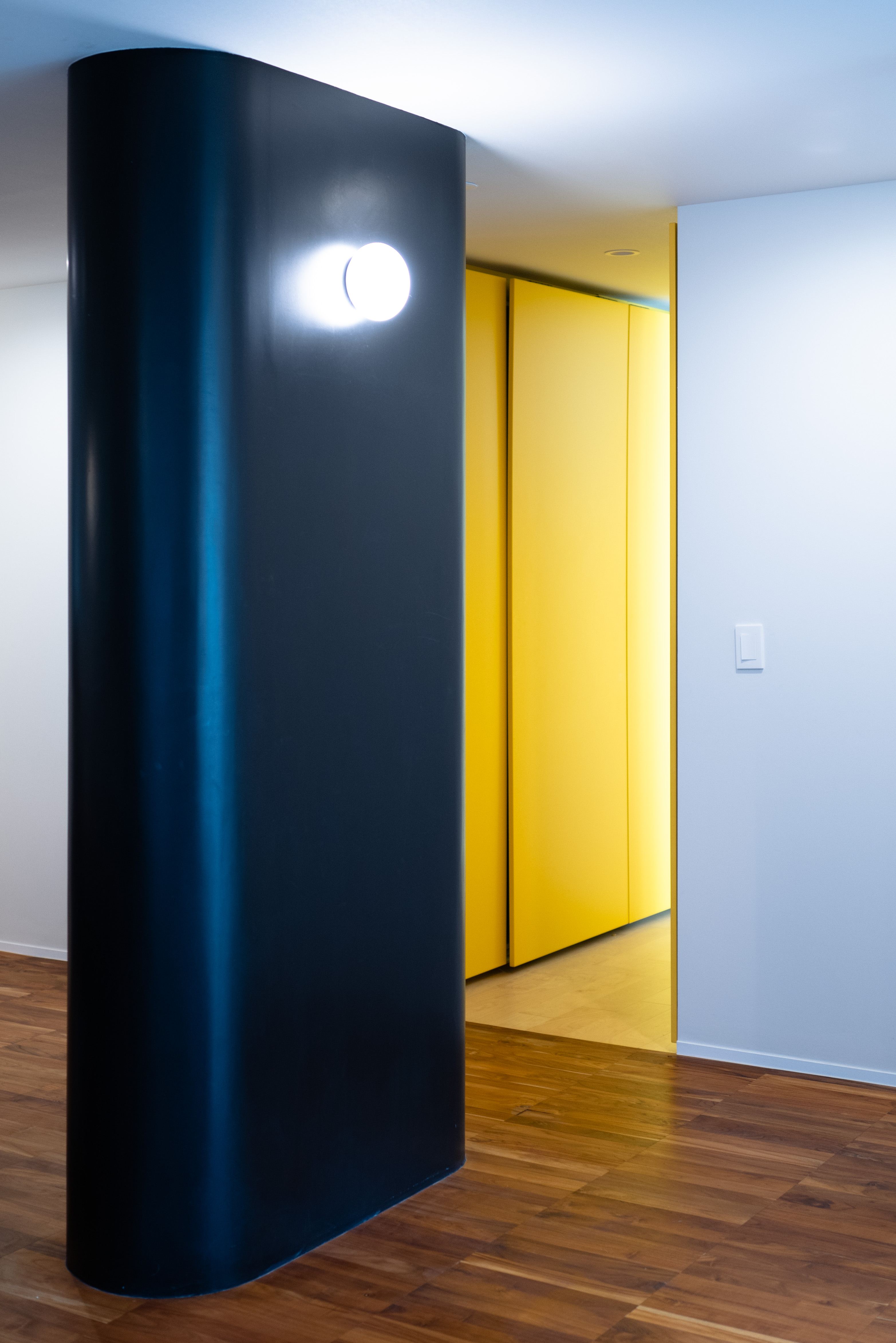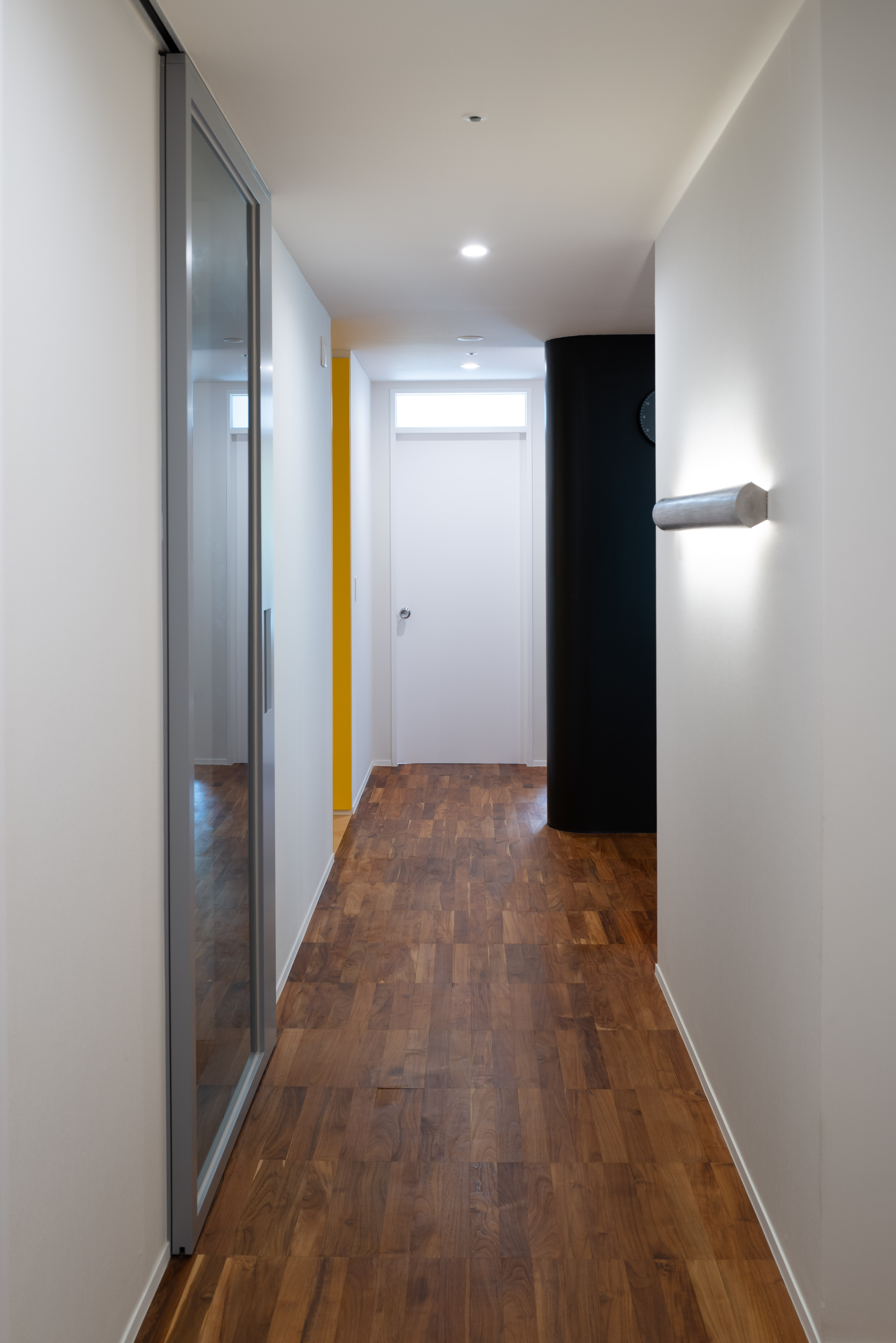 두가지의 대비되는 톤의 공간으로 집 전체적으로 티크원목마루, 붉은빛 라왕 합판 가구와 검은 기둥이 묵직하게 공간을 잡아주고 아이들 공간은 메이플 수종의 마루와 자작나무를 사용한 가구, 기분좋은 노란색을 활용해 밝고 발랄한 색감으로 채웠다.