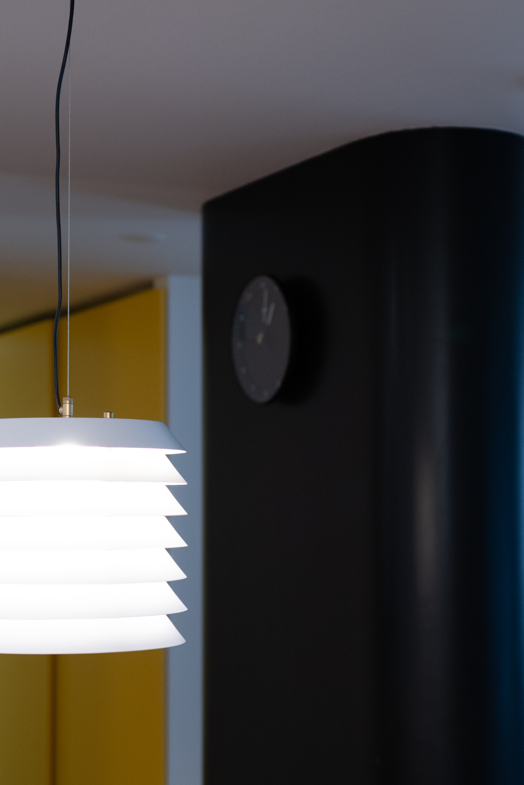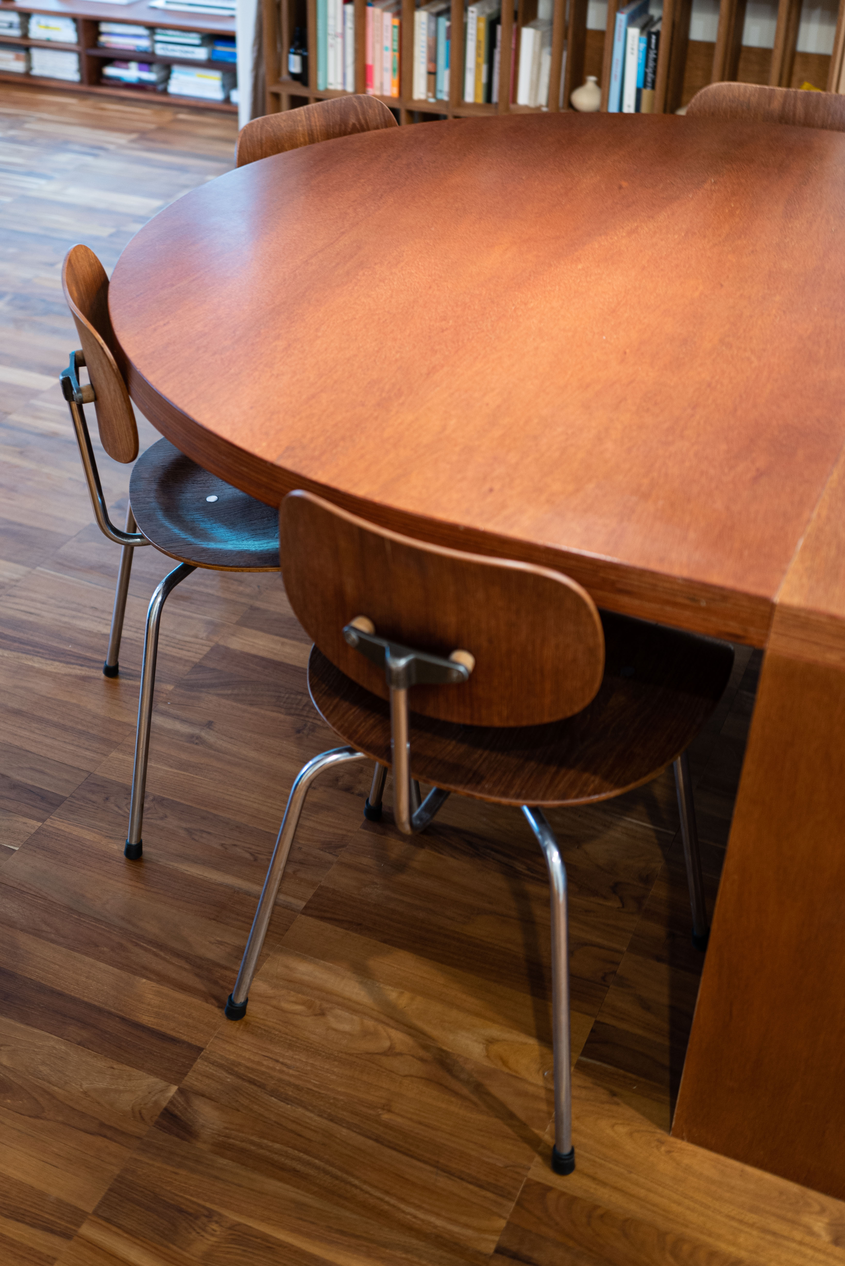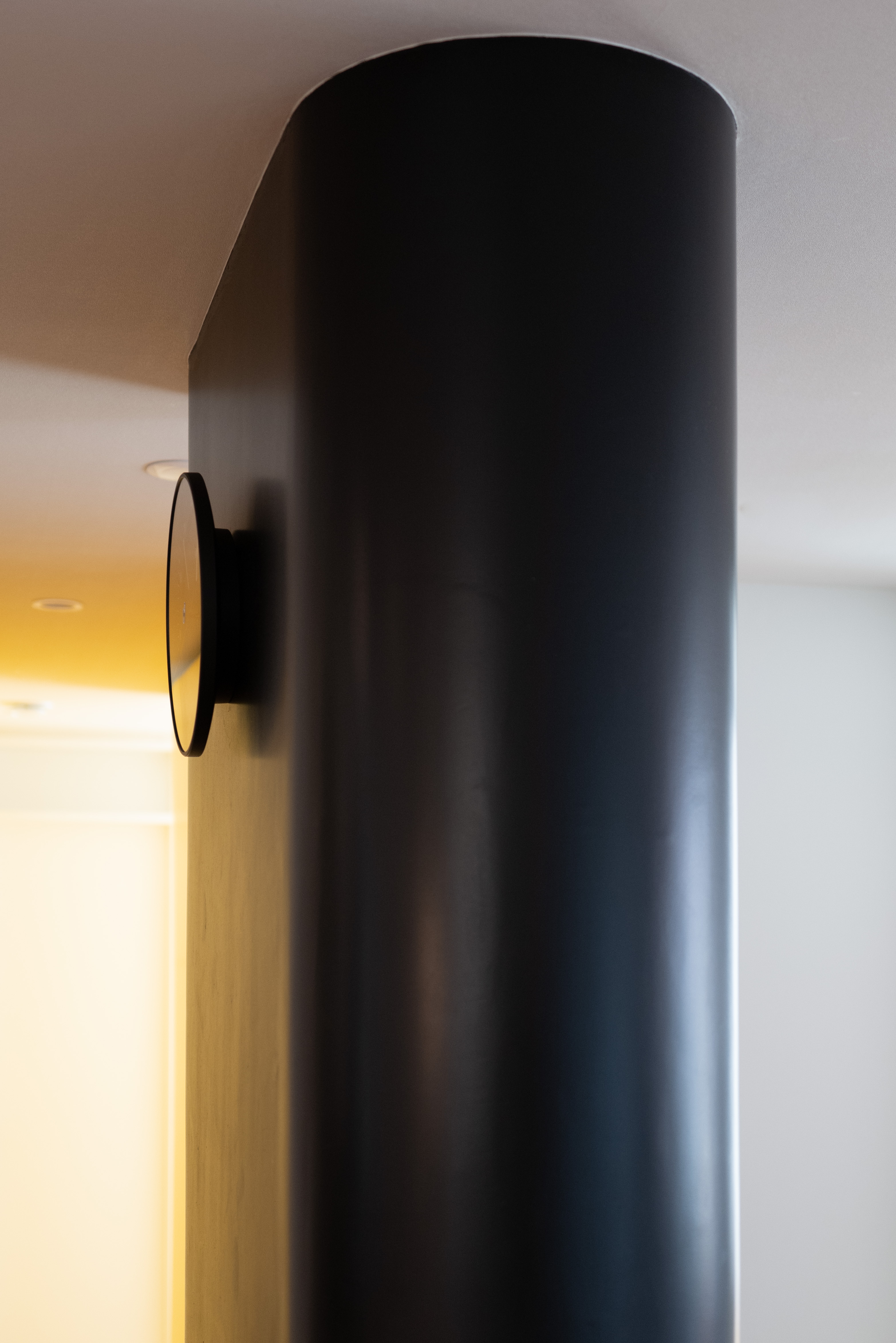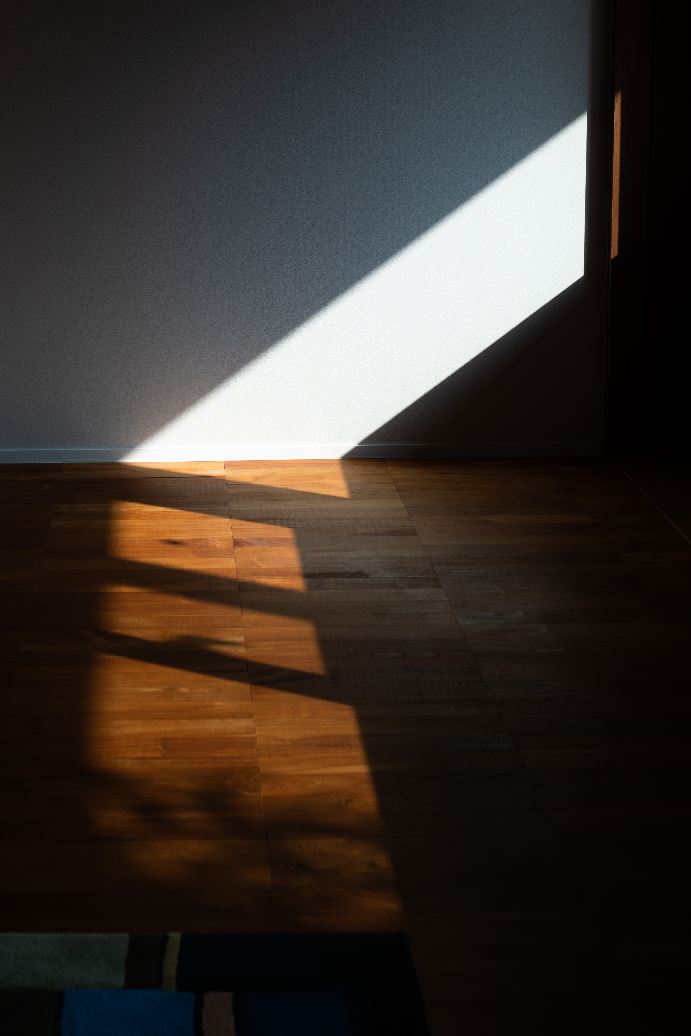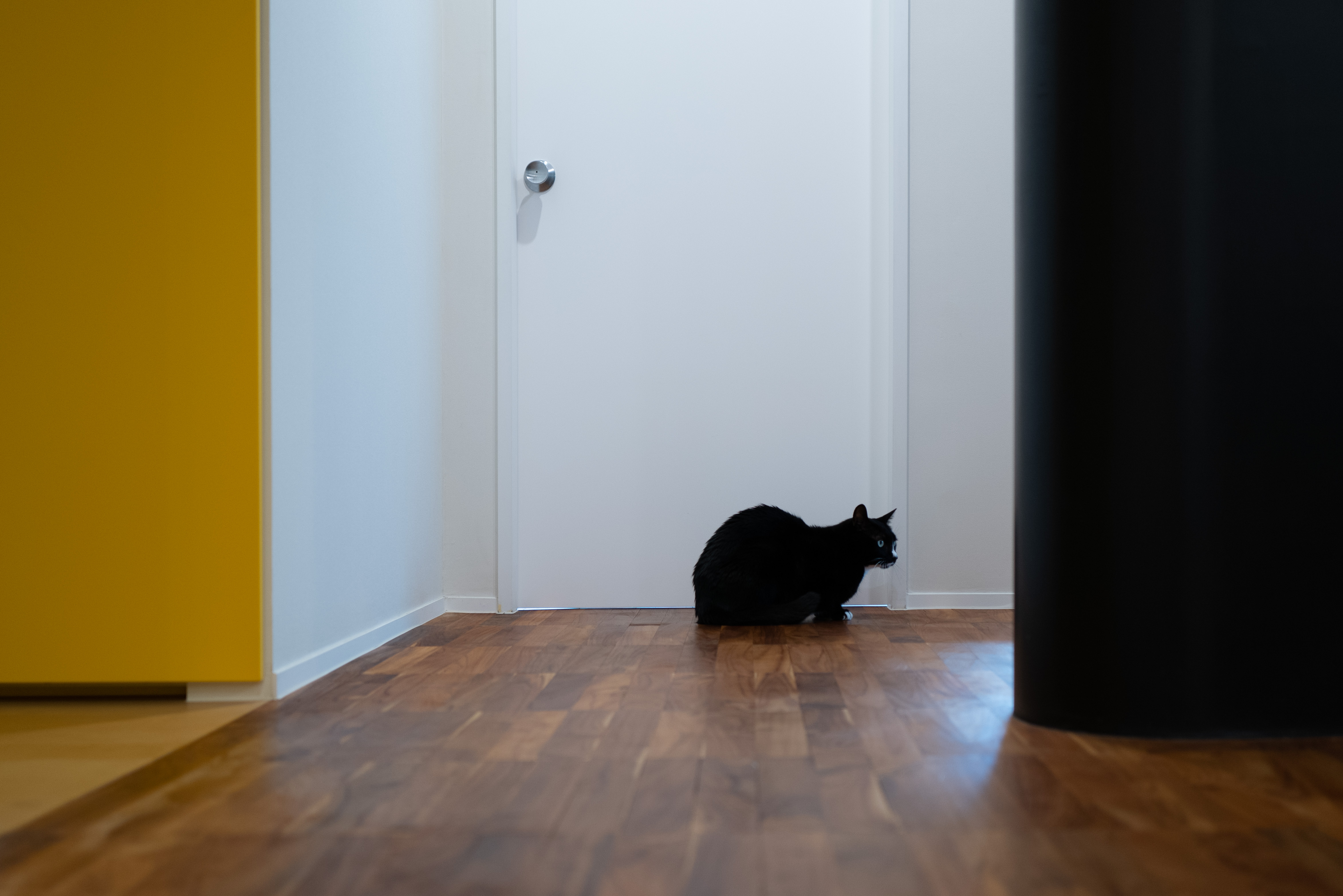 두가지의 대비되는 톤의 공간으로 집 전체적으로 티크원목마루, 붉은빛 라왕 합판 가구와 검은 기둥이 묵직하게 공간을 잡아주고 아이들 공간은 메이플 수종의 마루와 자작나무를 사용한 가구, 기분좋은 노란색을 활용해 밝고 발랄한 색감으로 채웠다.