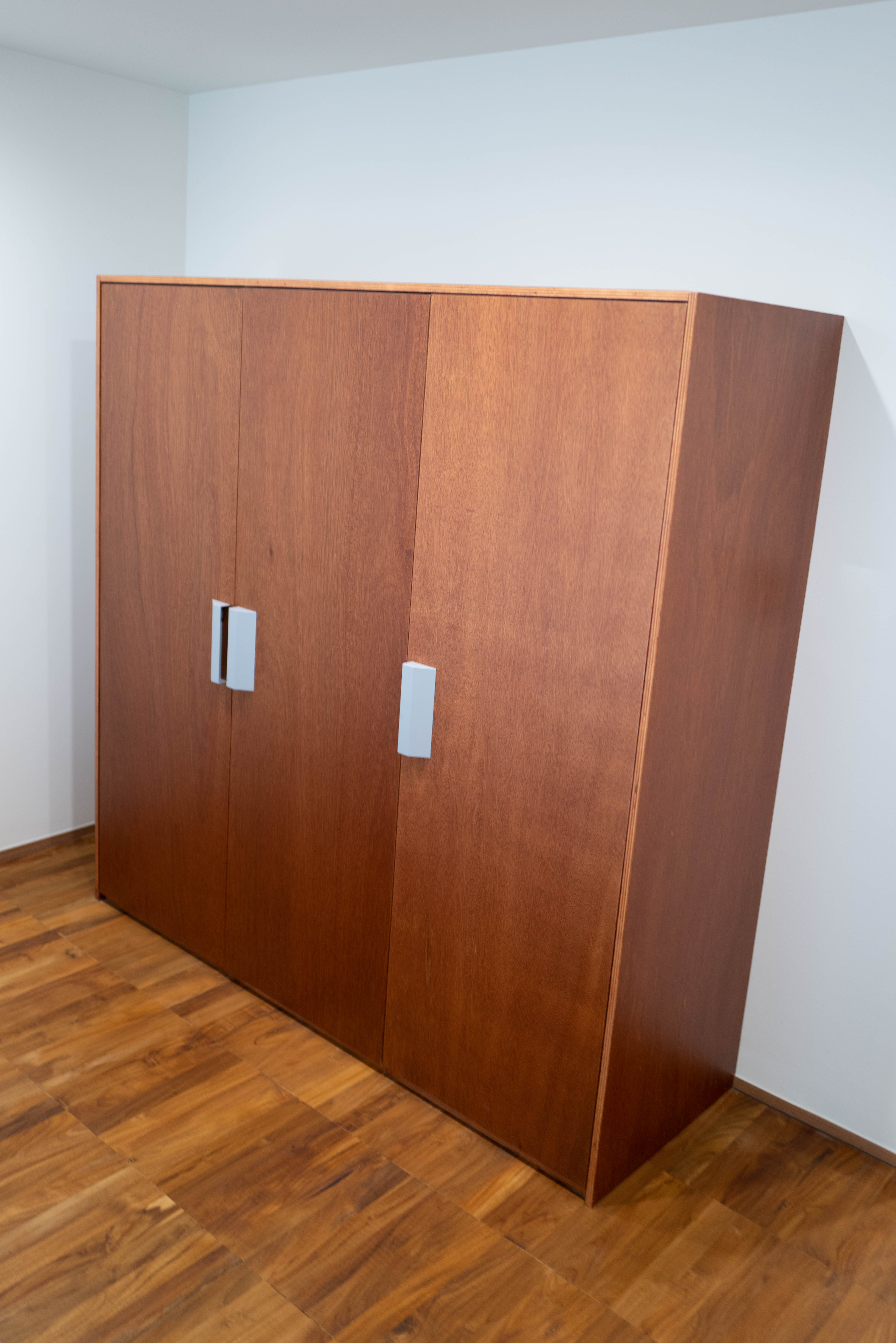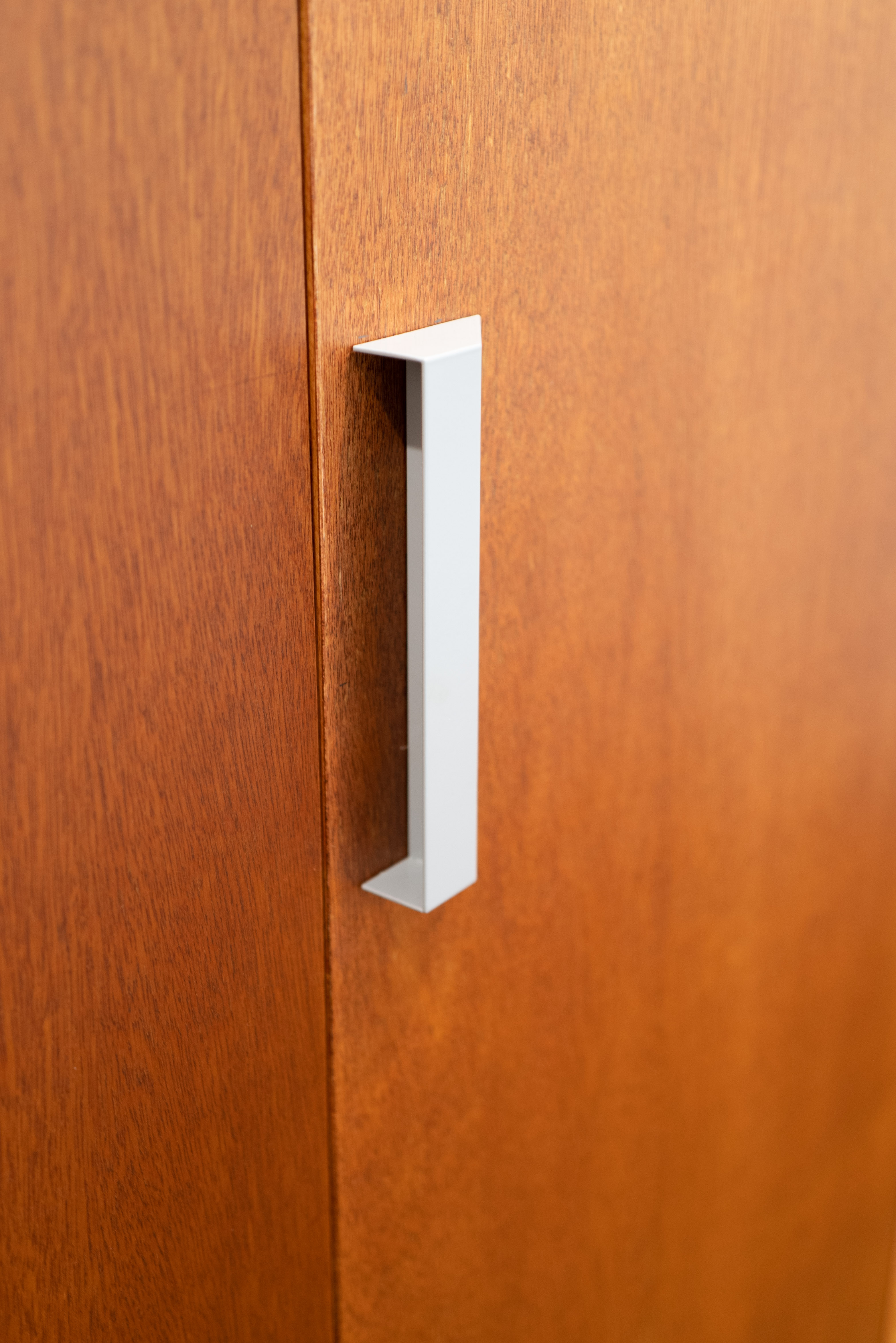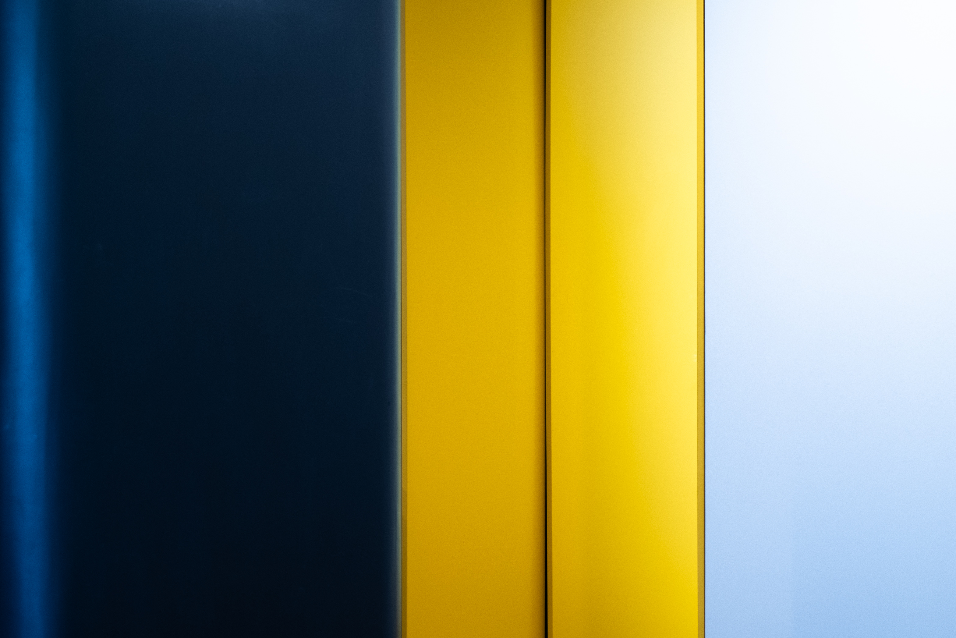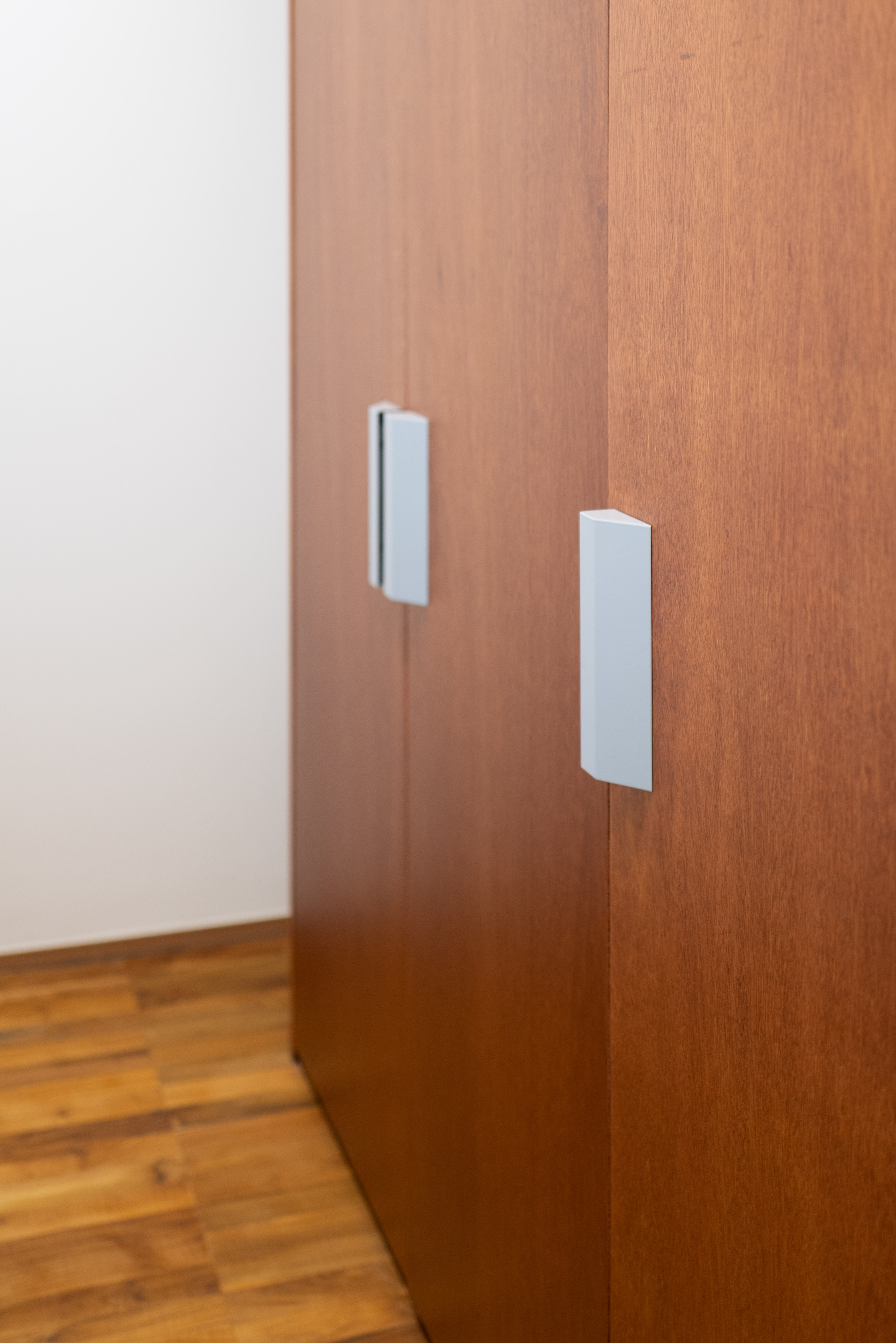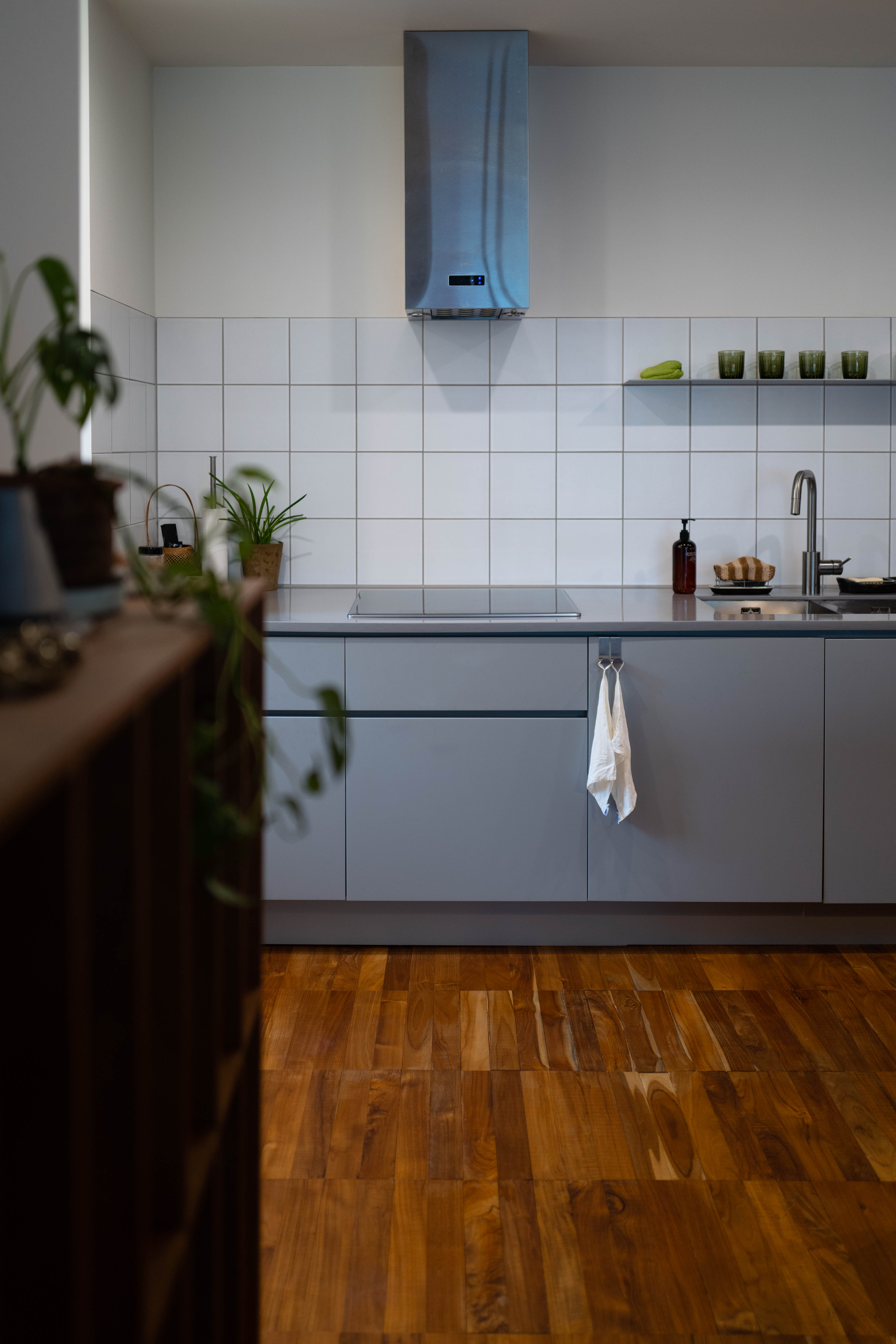 두가지의 대비되는 톤의 공간으로 집 전체적으로 티크원목마루, 붉은빛 라왕 합판 가구와 검은 기둥이 묵직하게 공간을 잡아주고 아이들 공간은 메이플 수종의 마루와 자작나무를 사용한 가구, 기분좋은 노란색을 활용해 밝고 발랄한 색감으로 채웠다.