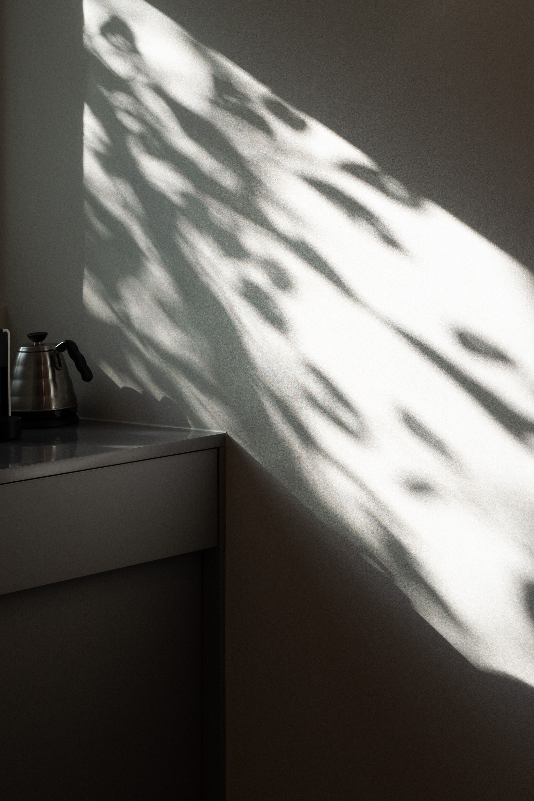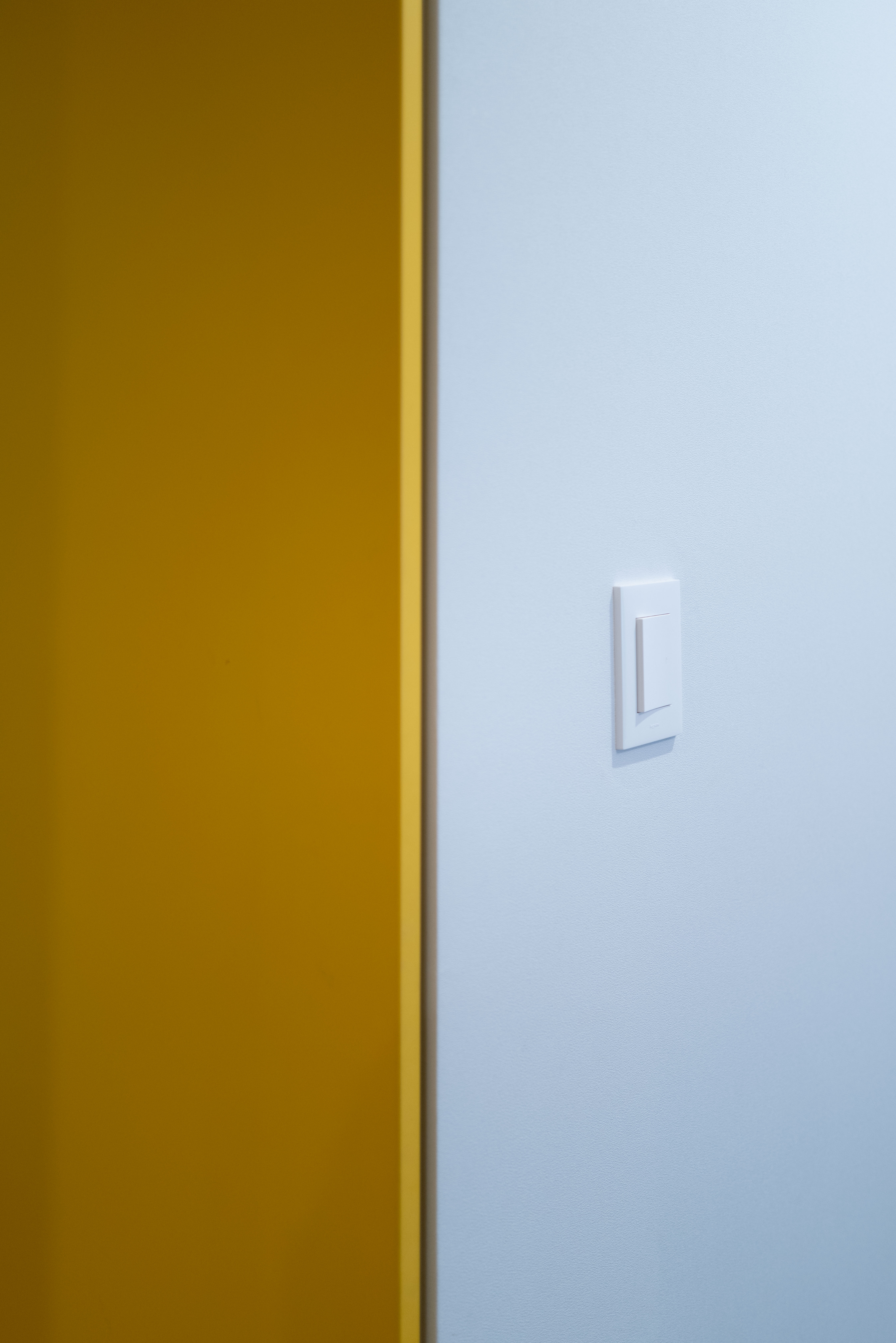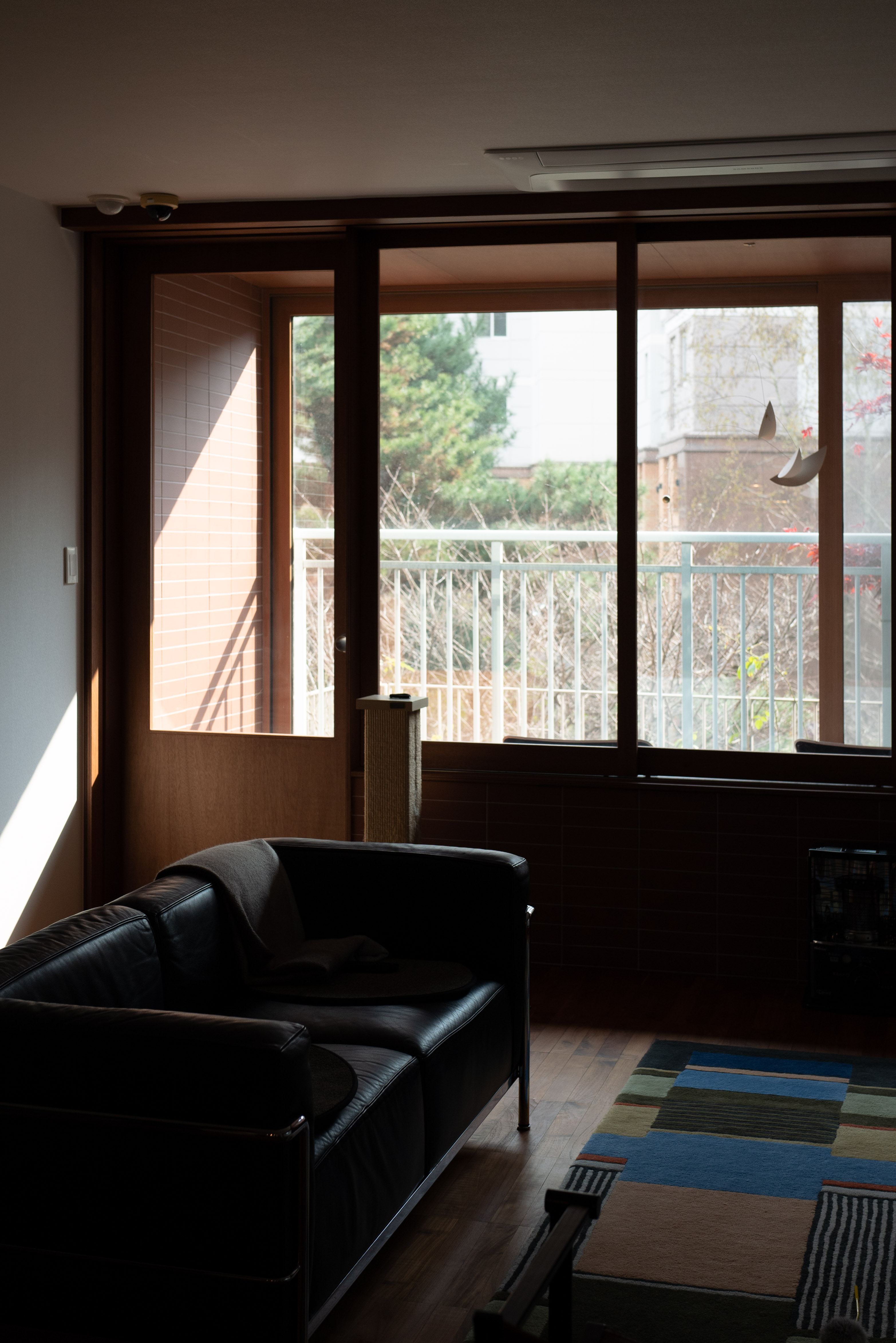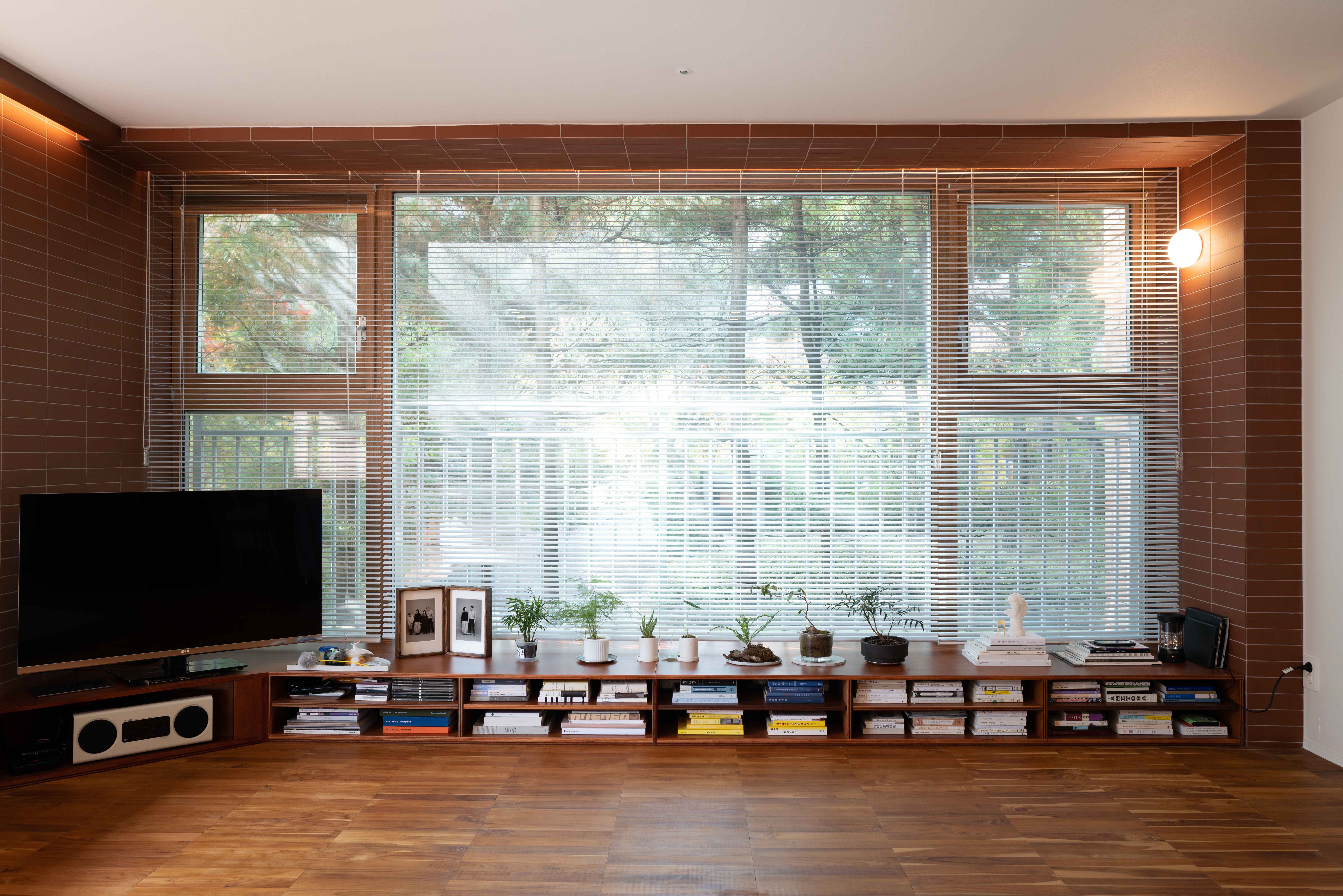 실장님의 소중한 두딸의 별명에서 영감을 얻어 지어진 션샤이하우스라는 이름 그대로 햇살이 가득 들어오는 거실공간이 매력적이다. 1층이라 느낄수있는 창밖의 자연이 마치 아파트가 아닌 주택에 사는듯한 기분을 전해준다. 다양한 색과 소재가 쓰였지만 매스로 읽힐 수 있도록 디테일을 정리했다.