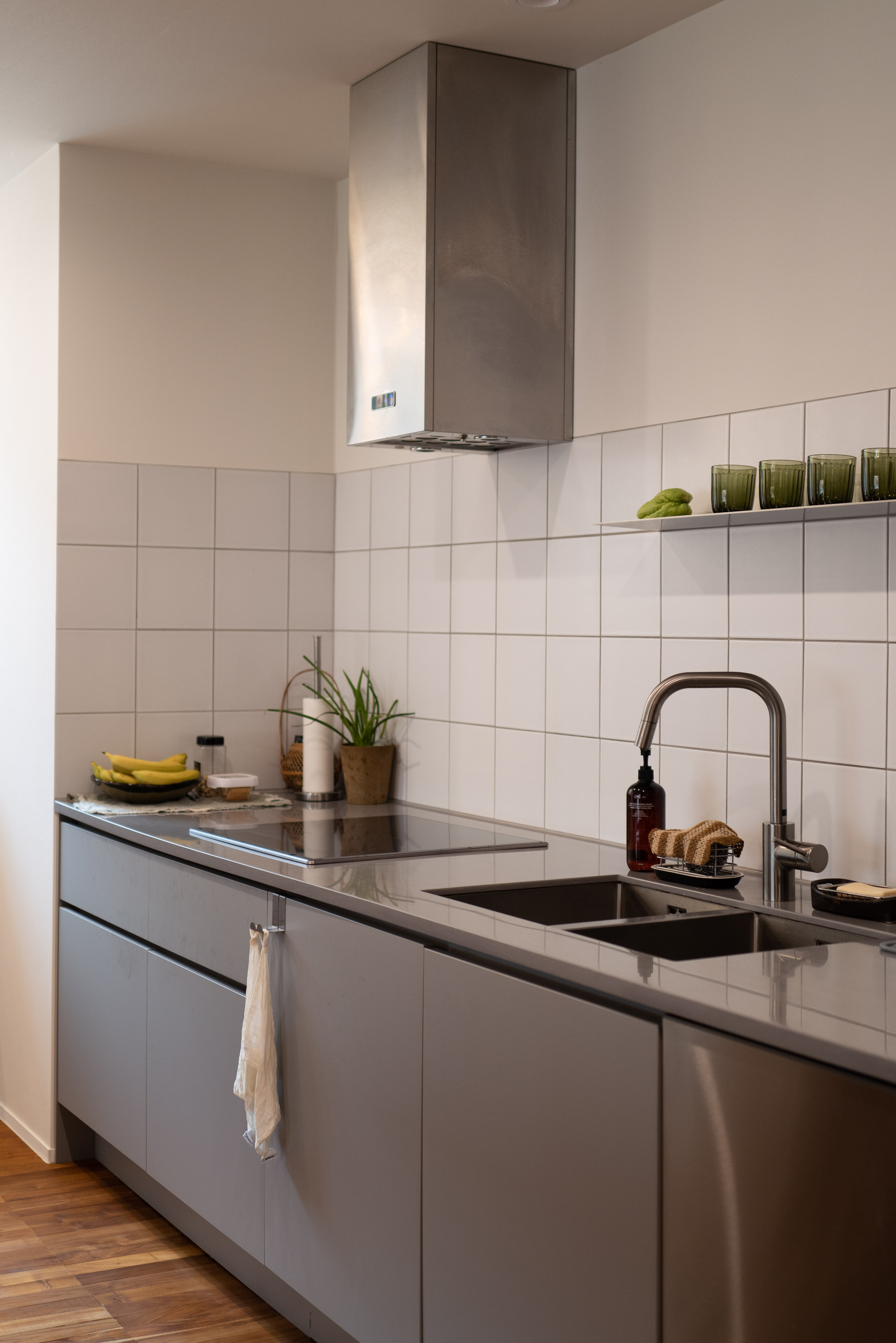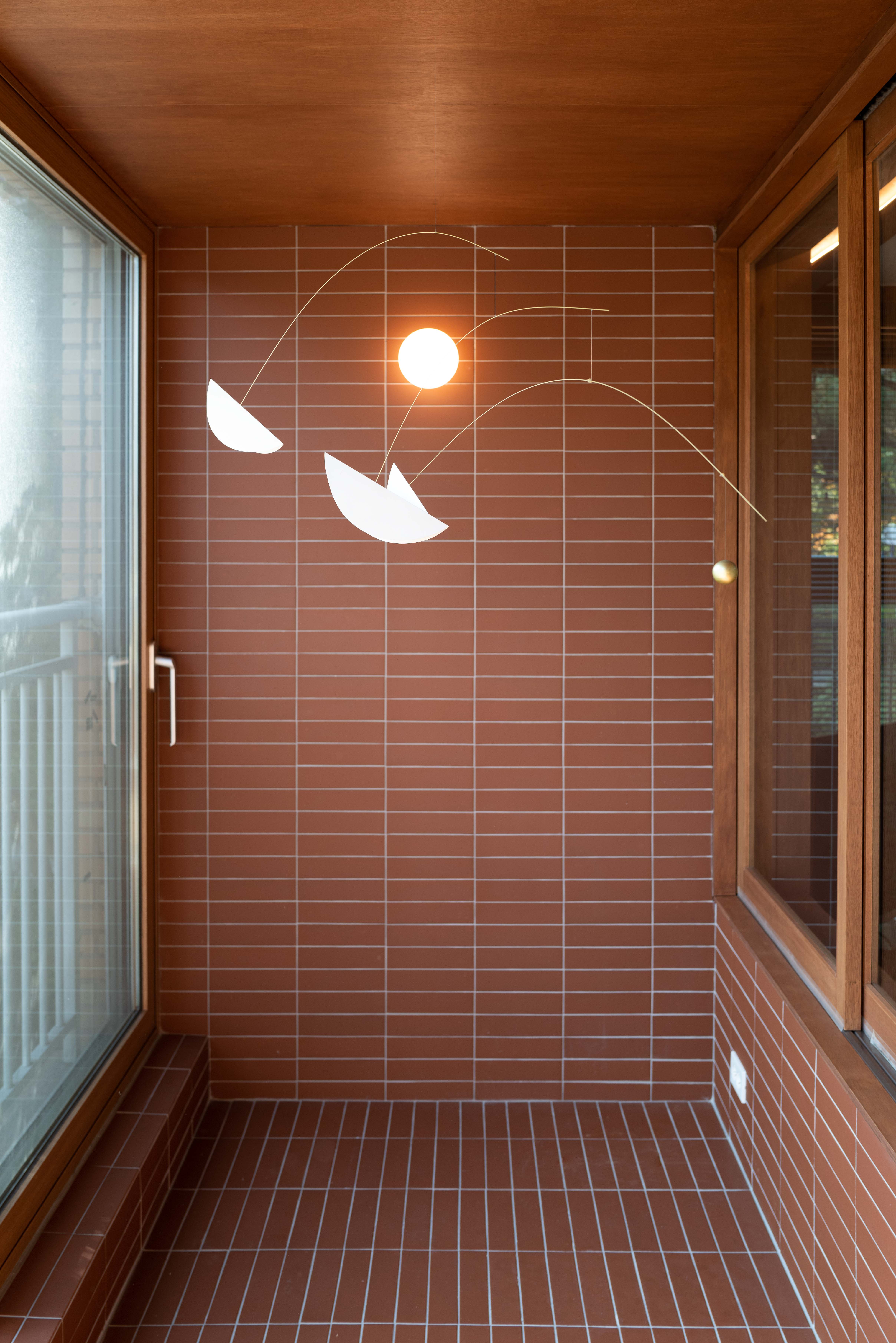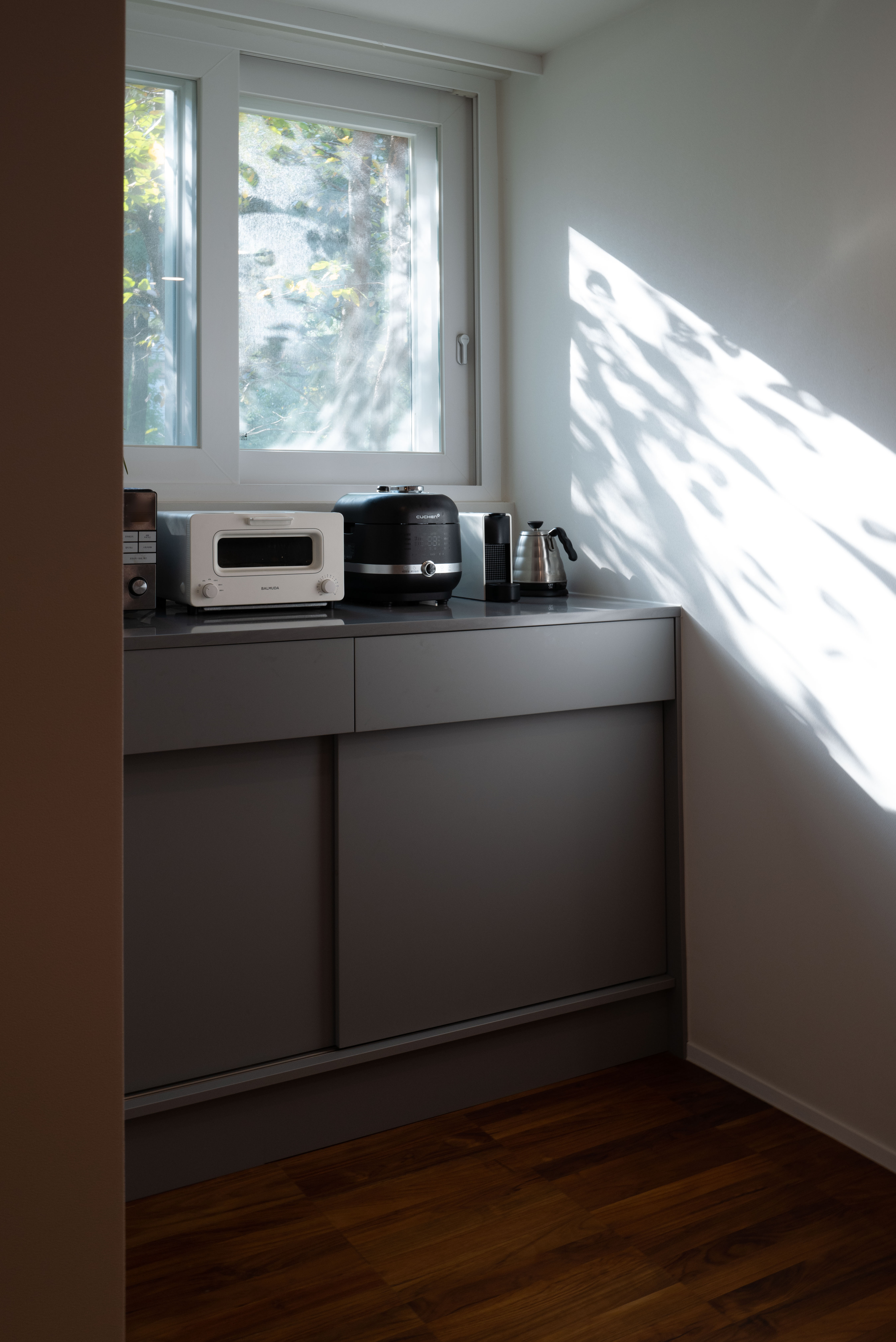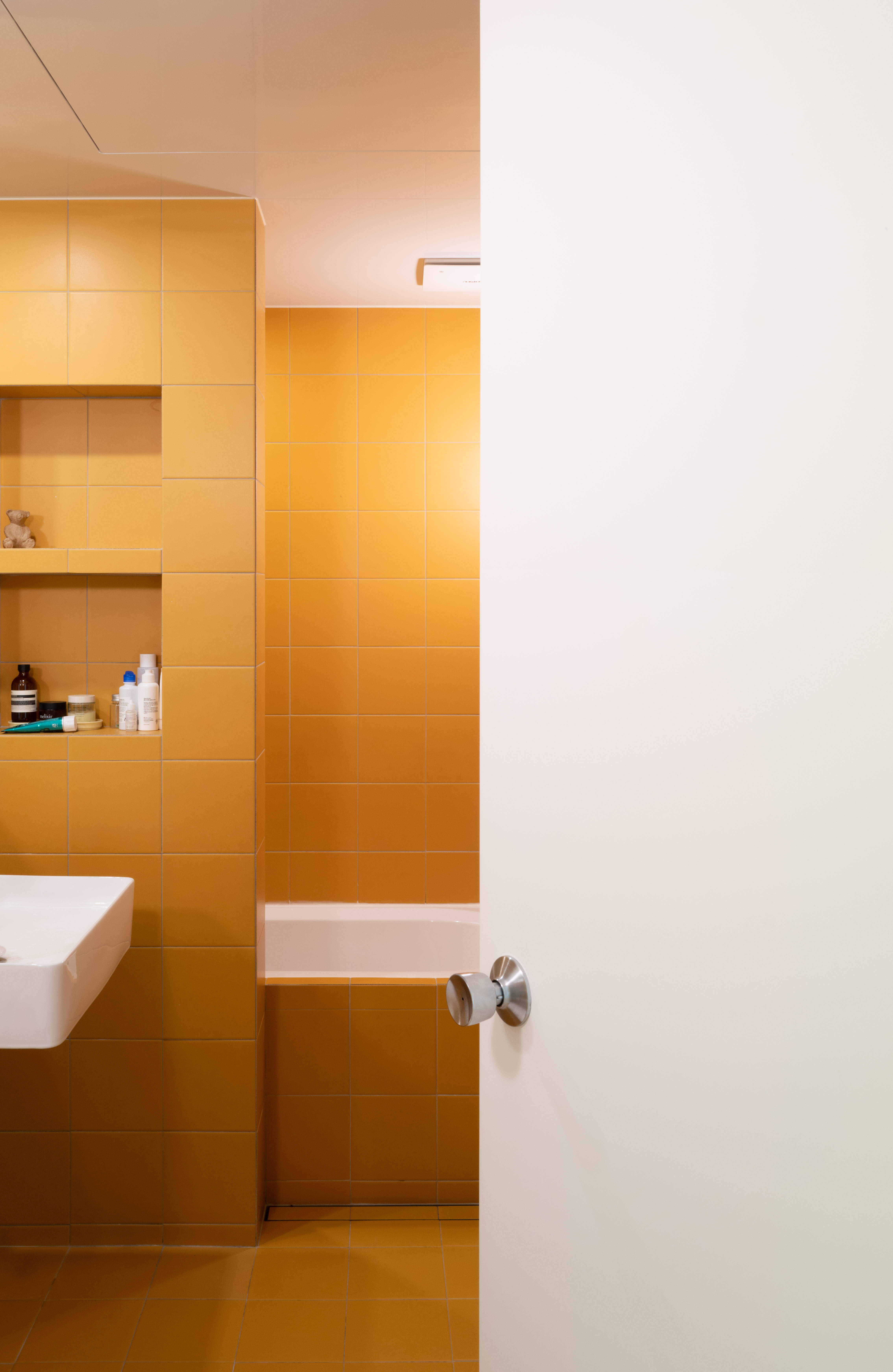 실장님의 소중한 두딸의 별명에서 영감을 얻어 지어진 션샤이하우스라는 이름 그대로 햇살이 가득 들어오는 거실공간이 매력적이다. 1층이라 느낄수있는 창밖의 자연이 마치 아파트가 아닌 주택에 사는듯한 기분을 전해준다. 다양한 색과 소재가 쓰였지만 매스로 읽힐 수 있도록 디테일을 정리했다.